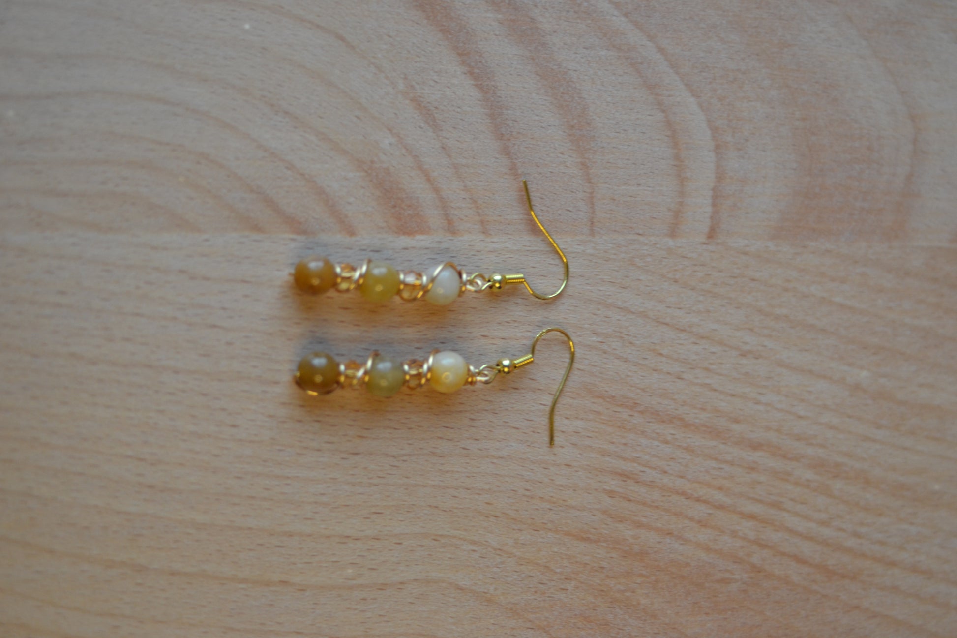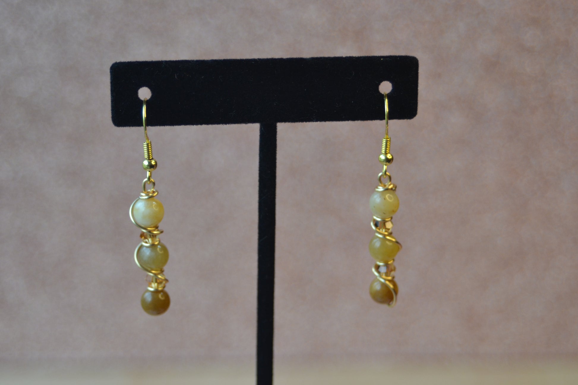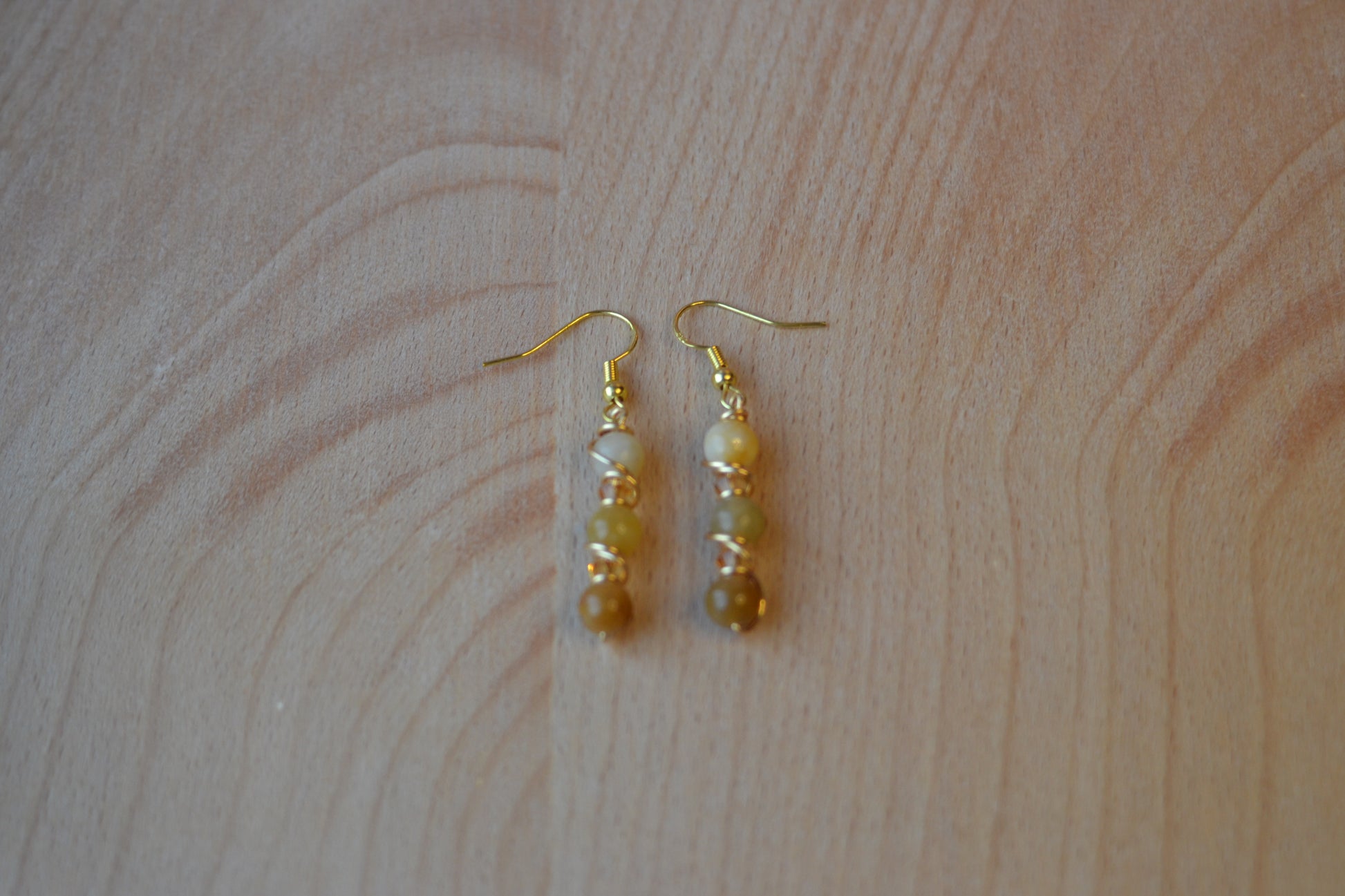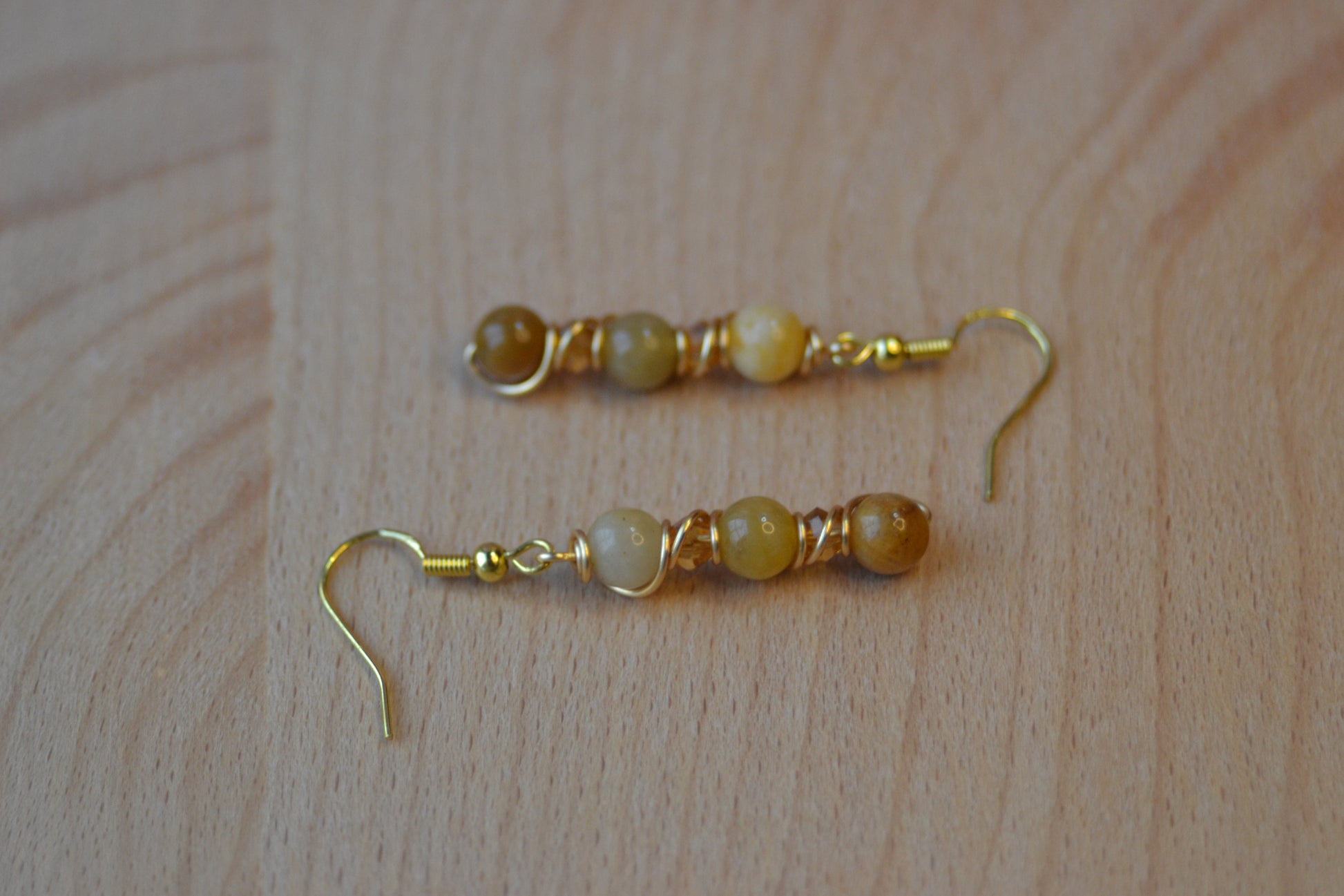 Awaken your inner glow with Amber Bloom—a striking pair of 3-tier earrings featuring yellow jade beads that deepen in shade from top to bottom, each tier glowing with golden light. Wrapped in gold-plated copper wire and finished with gold-plated sterling silver hooks, these 2.5-inch earrings are adorned with rich amber-colored crystal spacers for added warmth and sparkle. Lightweight yet bold, they're a celebration of joy, abundance, and transformation.