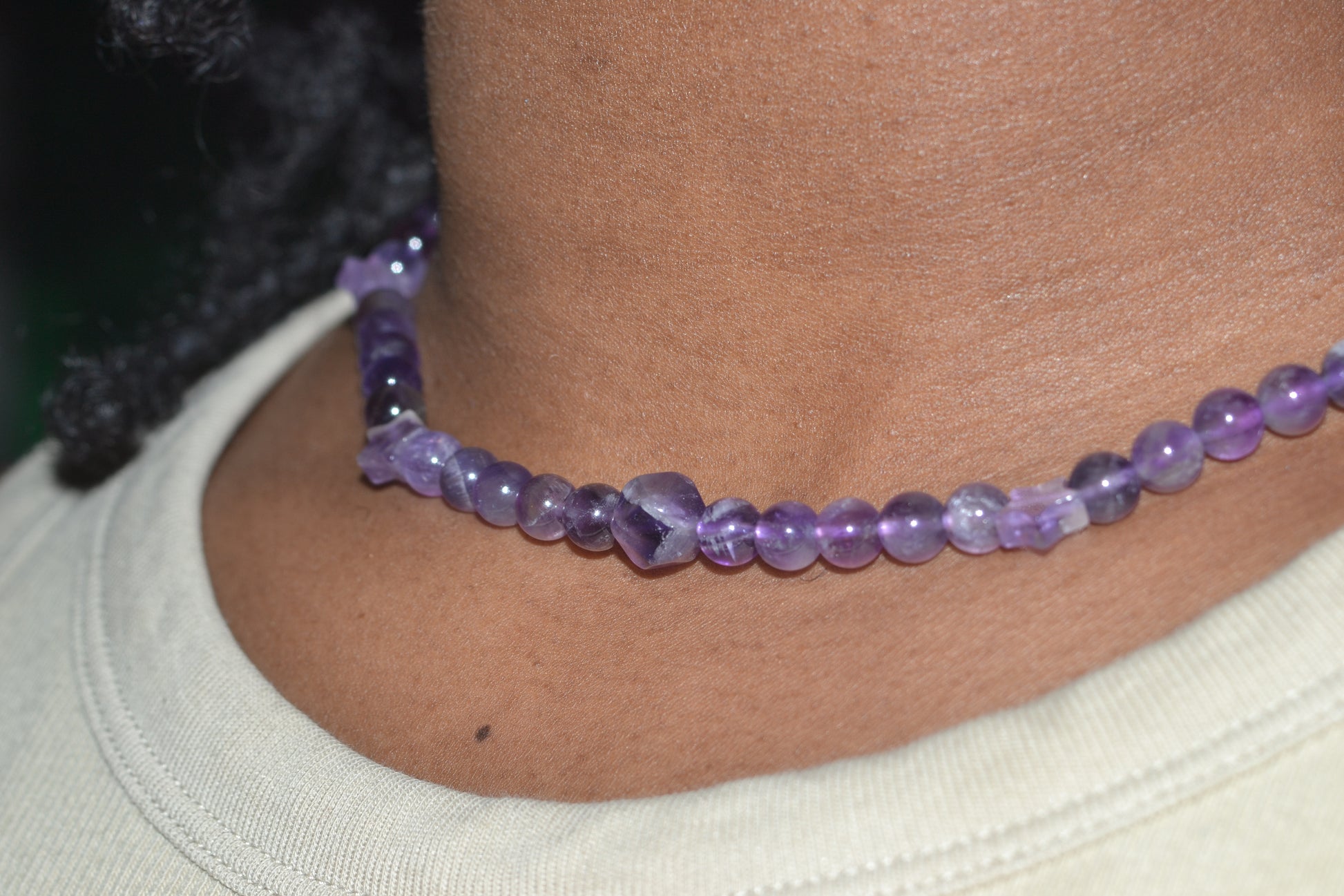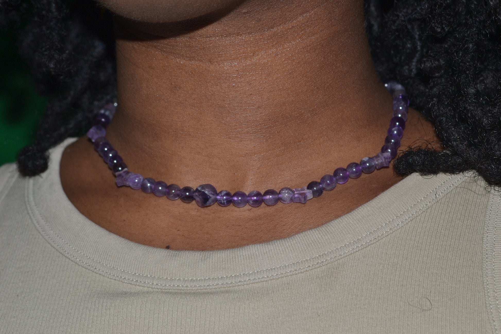 Tune into your inner stillness and cosmic intuition with our Celestial Calm set, handcrafted from high-grade amethyst in both classic and star-cut forms. The 15-inch choker features smooth 4mm round amethyst beads accented by four delicate amethyst star beads and a single 8mm faceted centerpiece—resting right at the throat.