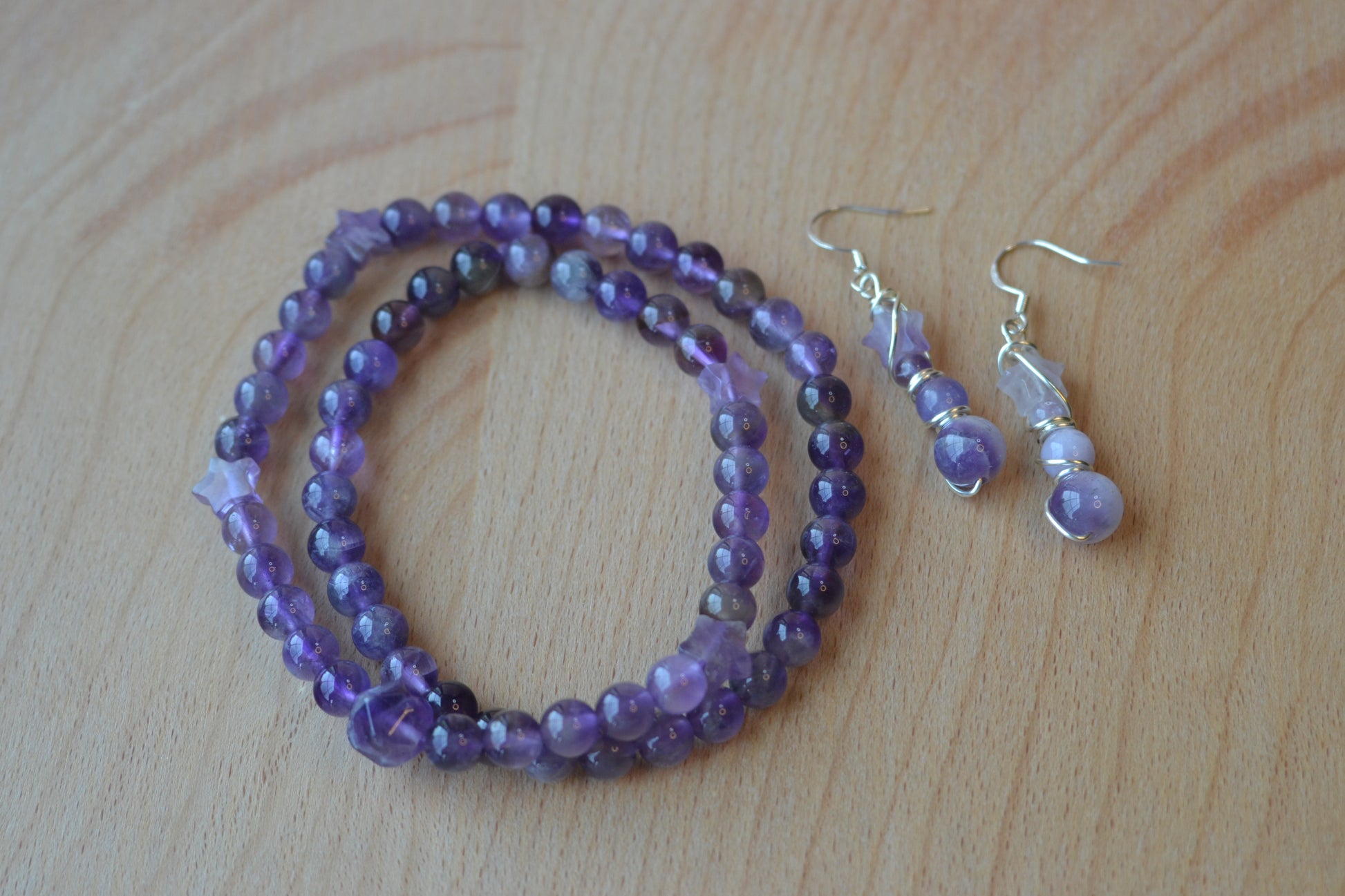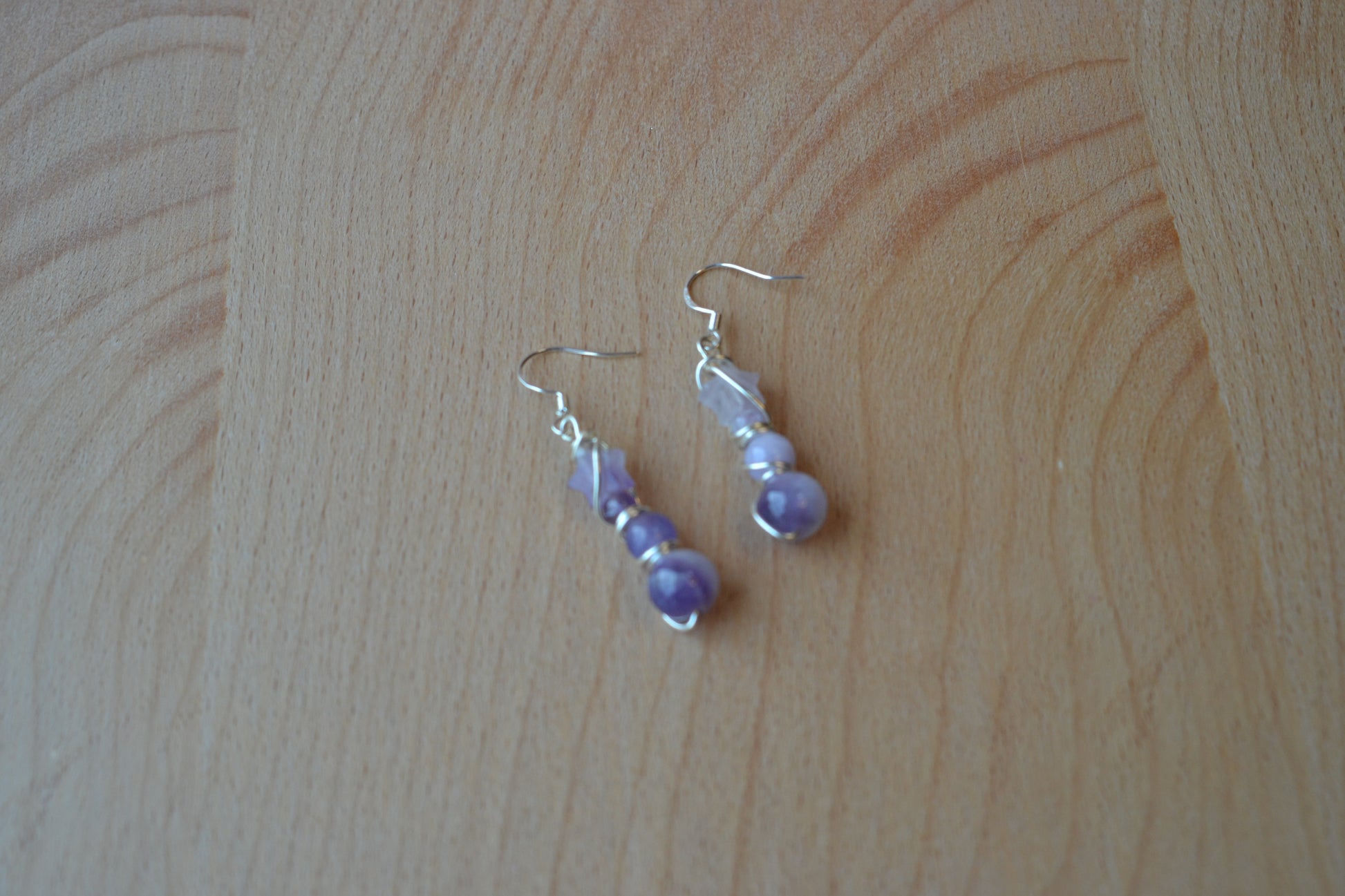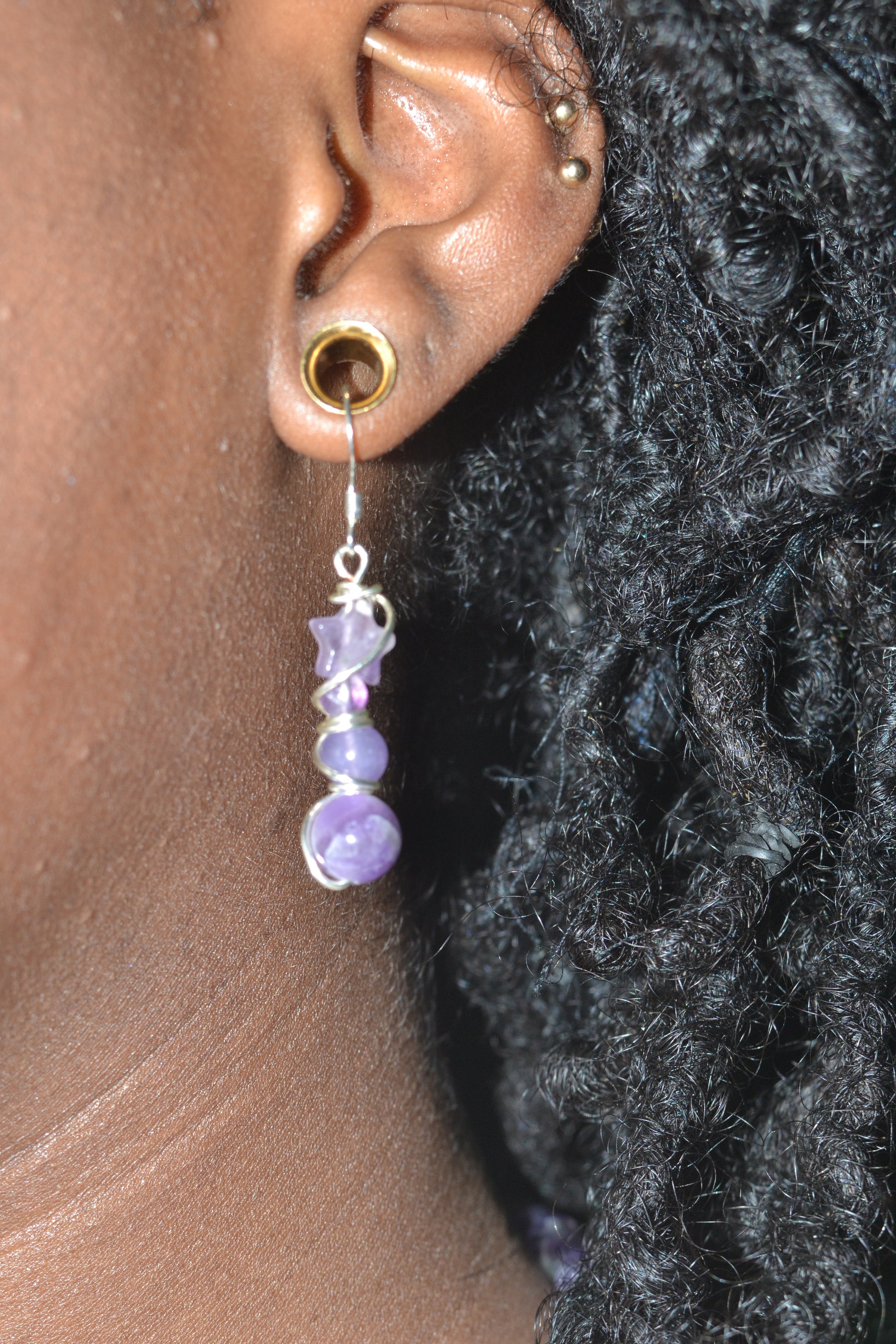 Earrings: 4-tiered amethyst dangles (6mm, 4mm, 2mm, star bead)