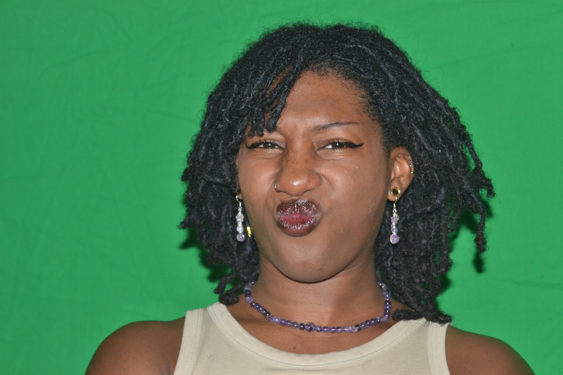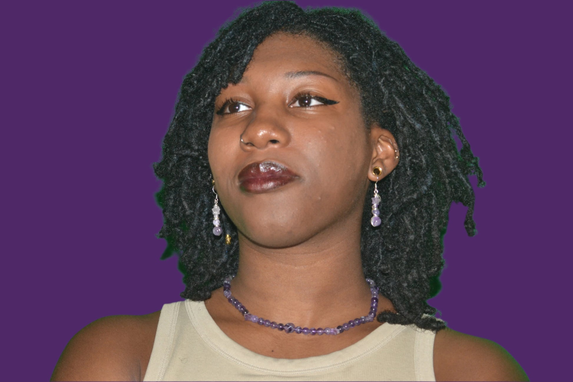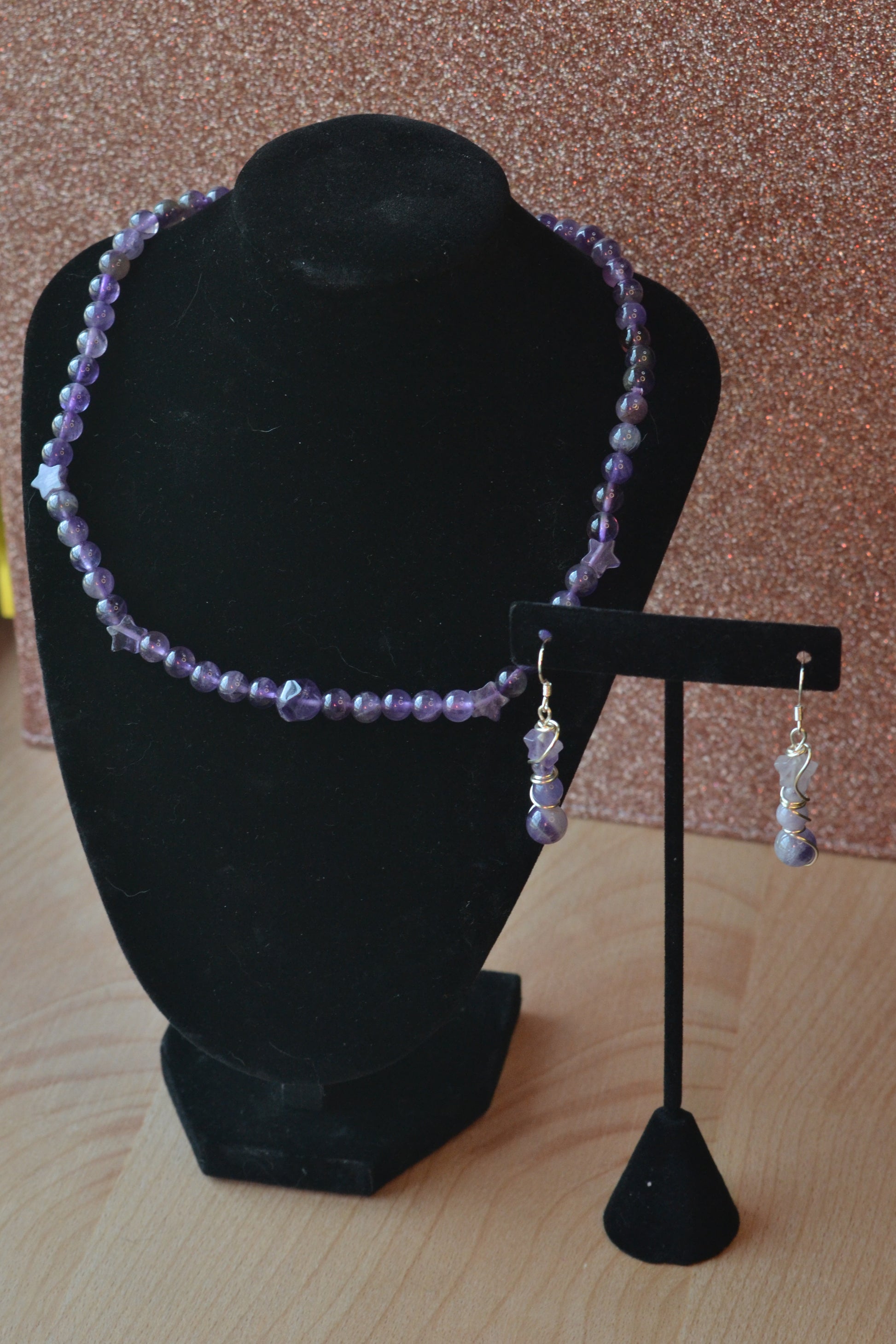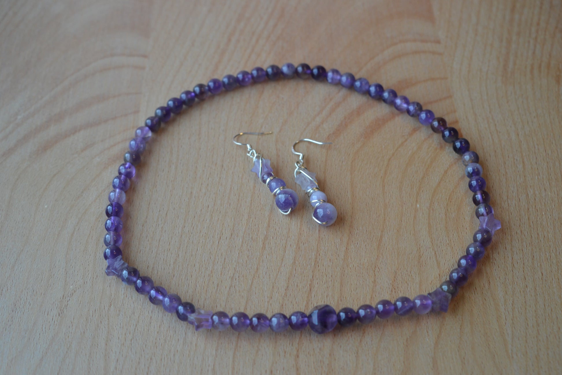 Earrings: 4-tiered amethyst dangles (6mm, 4mm, 2mm, star bead)