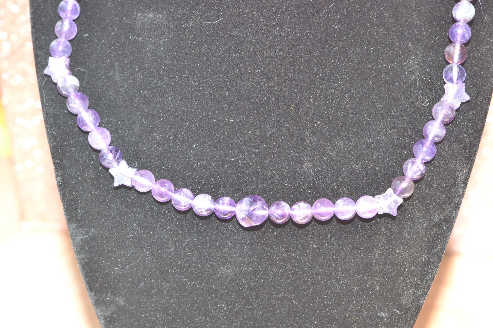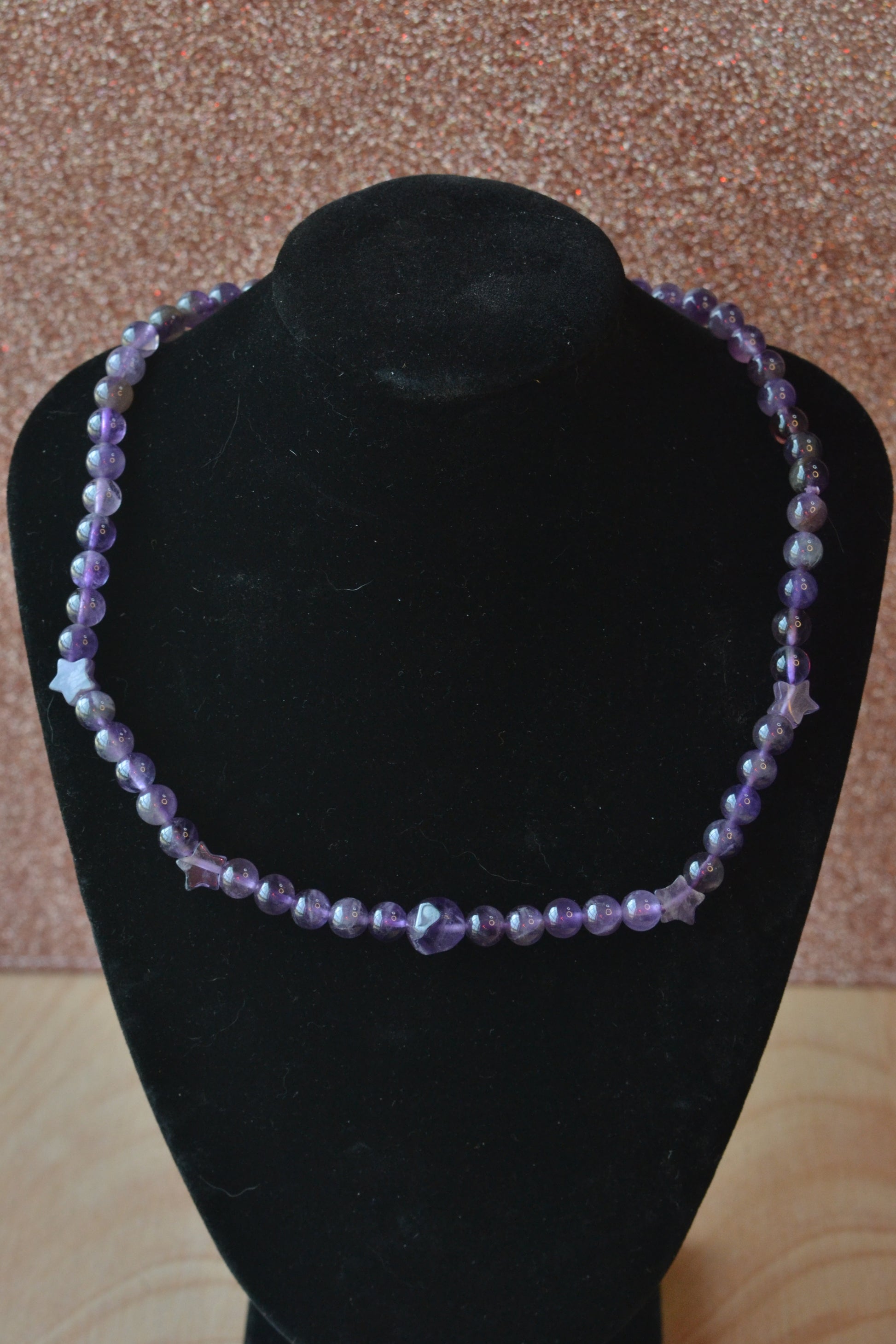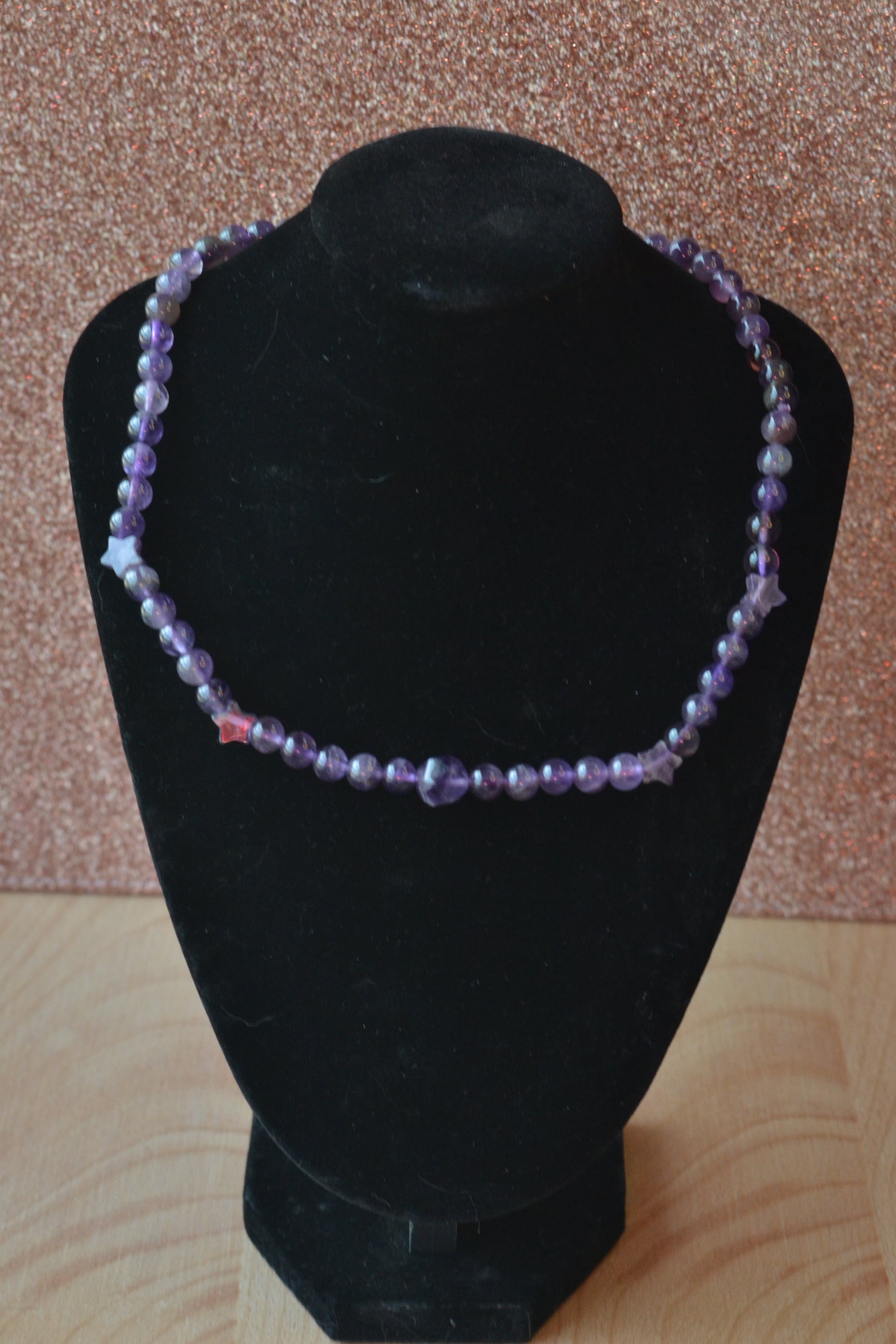 15-inch amethyst choker with 4mm round beads, 4 star-cut beads, and 8mm faceted centerpiece