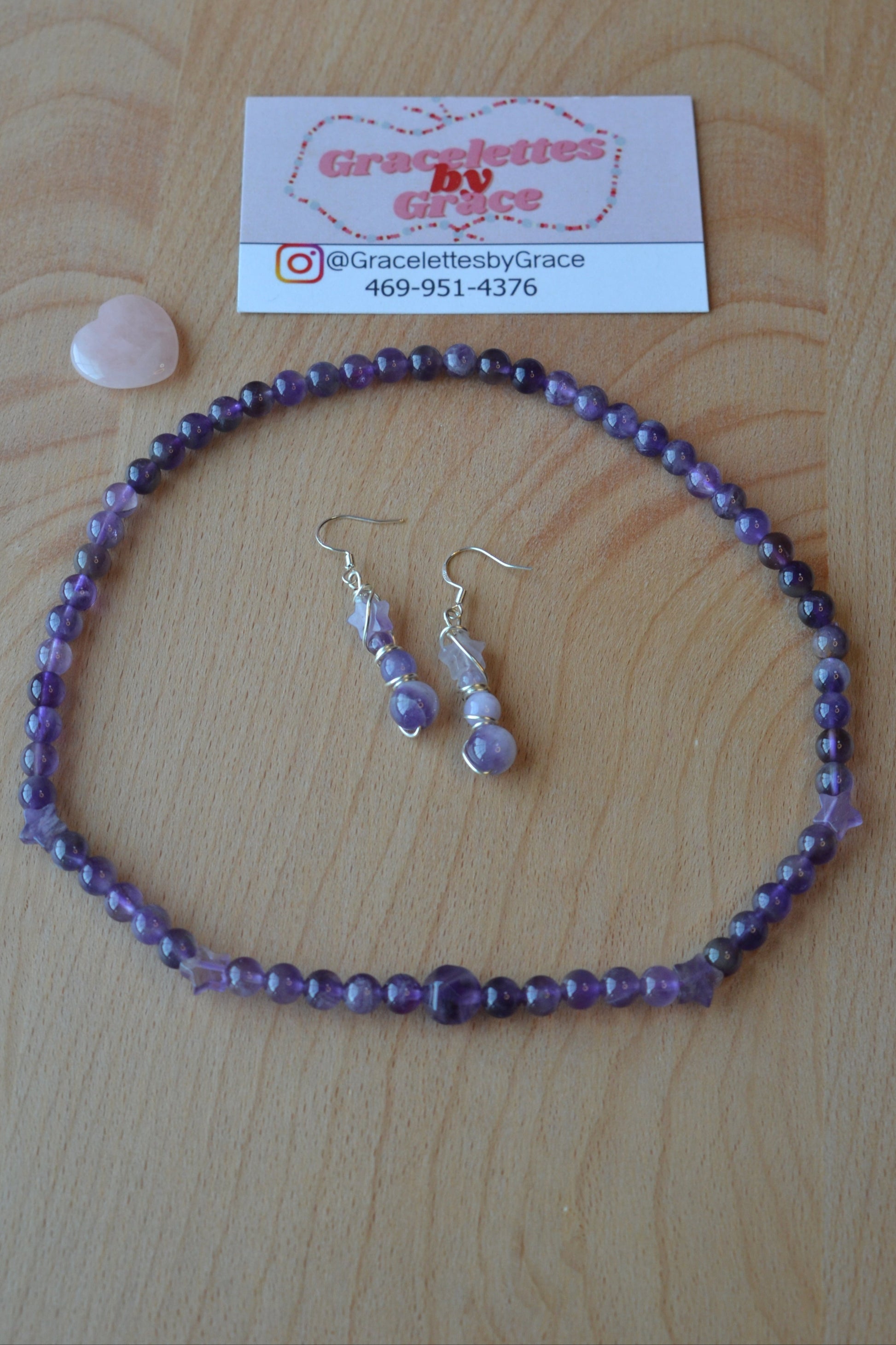 The matching earrings are a 1.75-inch silver-wrapped cascade of four amethyst tiers: a 6mm base, 4mm middle, 2mm accent, and a shimmering star at the crown. Hung on hypoallergenic 925 sterling silver hooks, they sway gently like falling stardust—bringing balance, beauty, and energetic clarity to your look.
