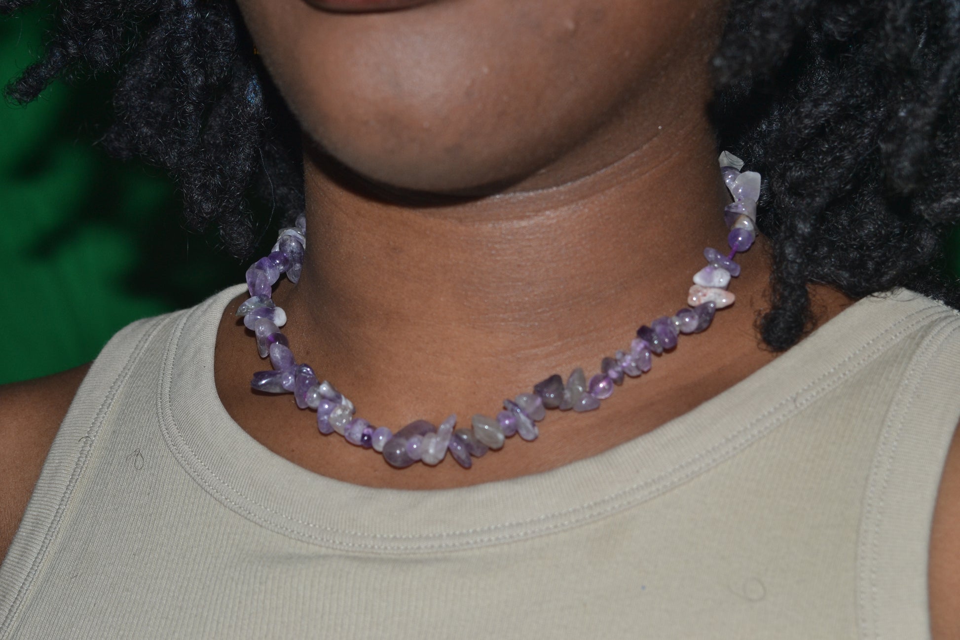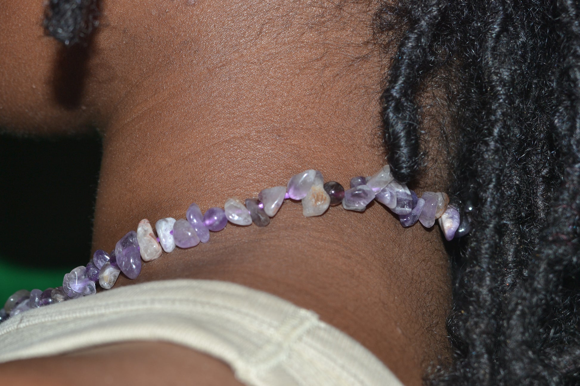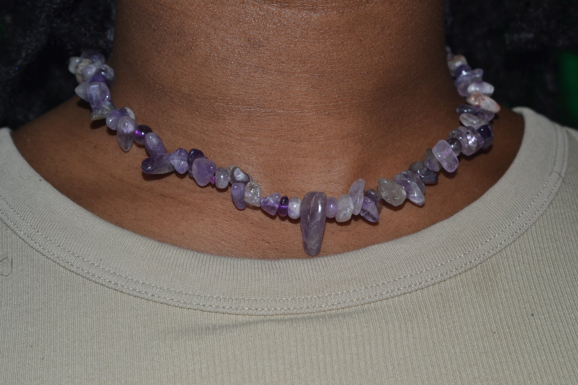 Step into your power with our Raw Radiance choker, handcrafted from bold, natural amethyst chip beads and anchored by a striking 1-inch center crystal. This 15-inch piece sits high on the collarbonesโmaking it perfect for layering or standing alone as a statement of spiritual strength and divine presence. Every angle reflects the raw beauty and intuitive magic of amethyst, encouraging calm, clarity, and deep connection to your higher self.