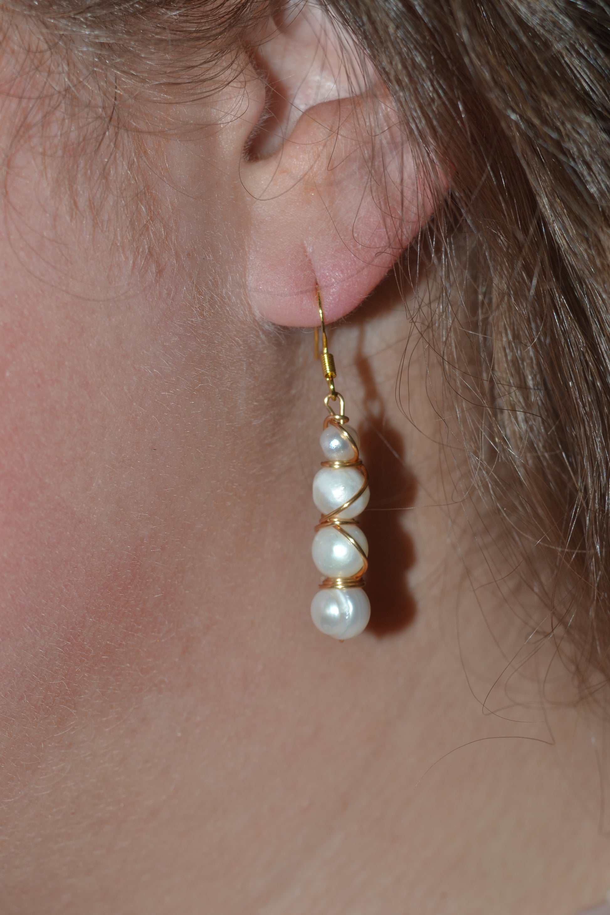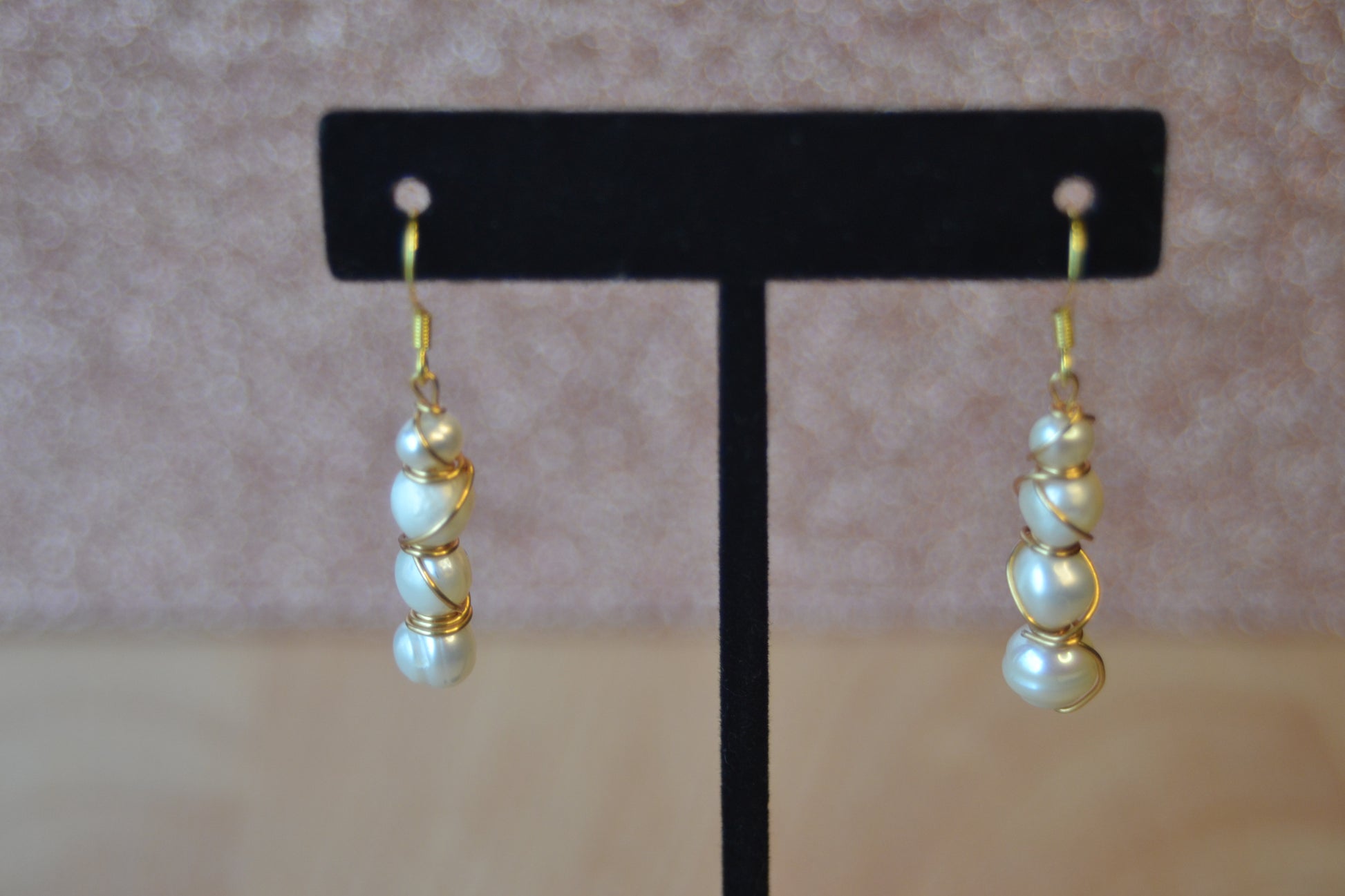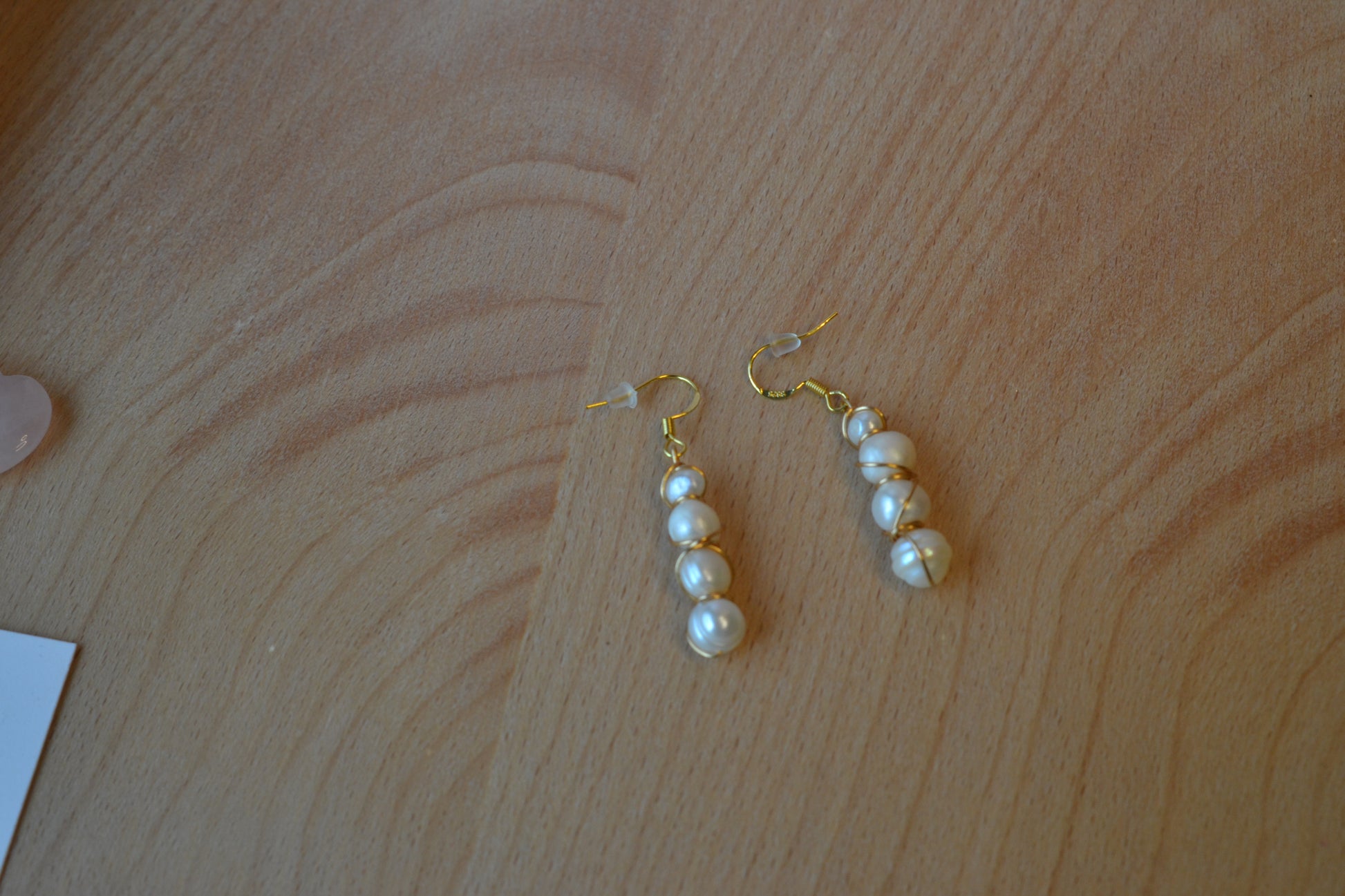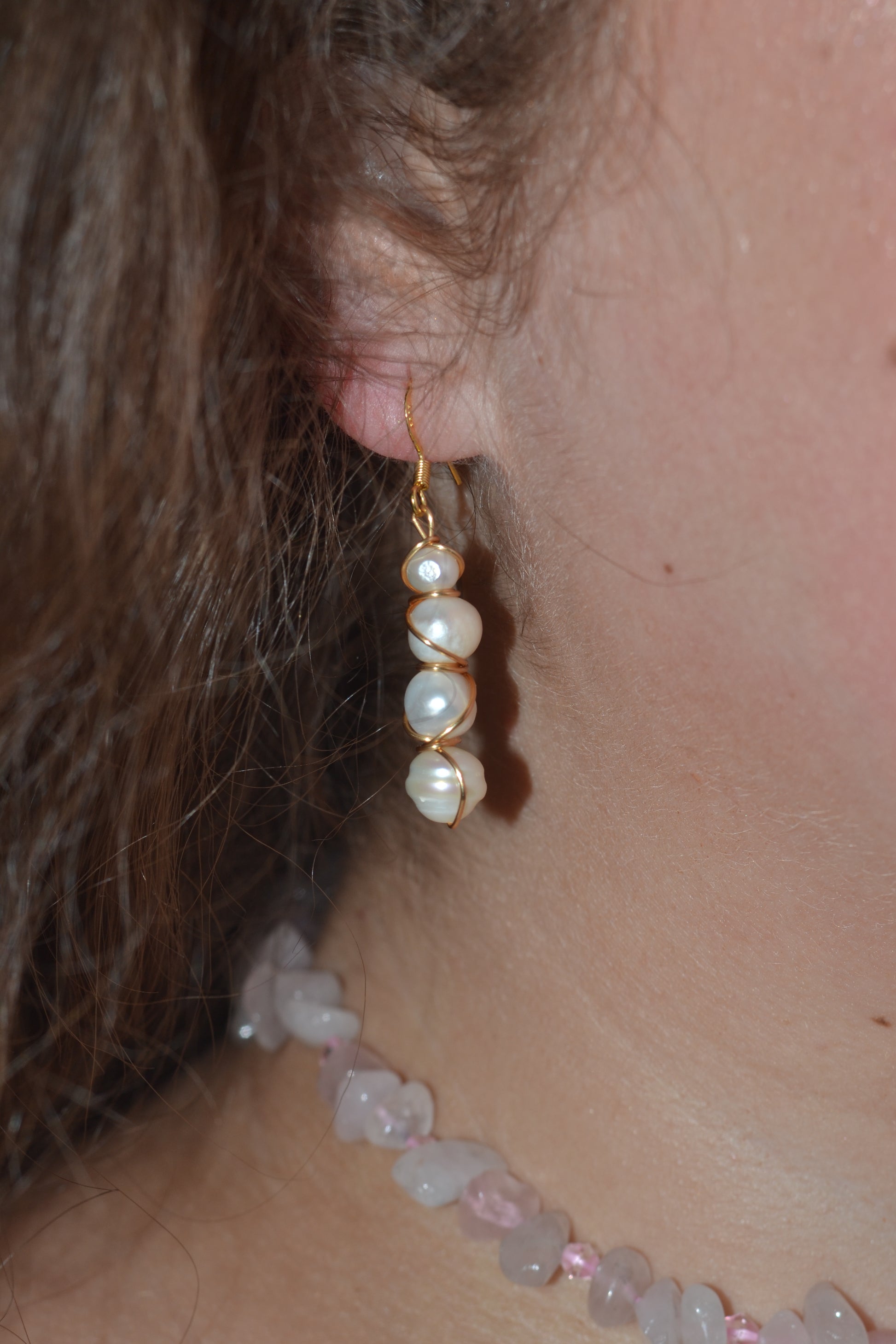 These handmade earrings feature four tiers of luminous freshwater pearls, stacked and wrapped delicately in gold wire for a graceful cascading effect. Suspended from 14k gold-plated sterling silver hooks, this design blends classic beauty with a modern handcrafted touch.