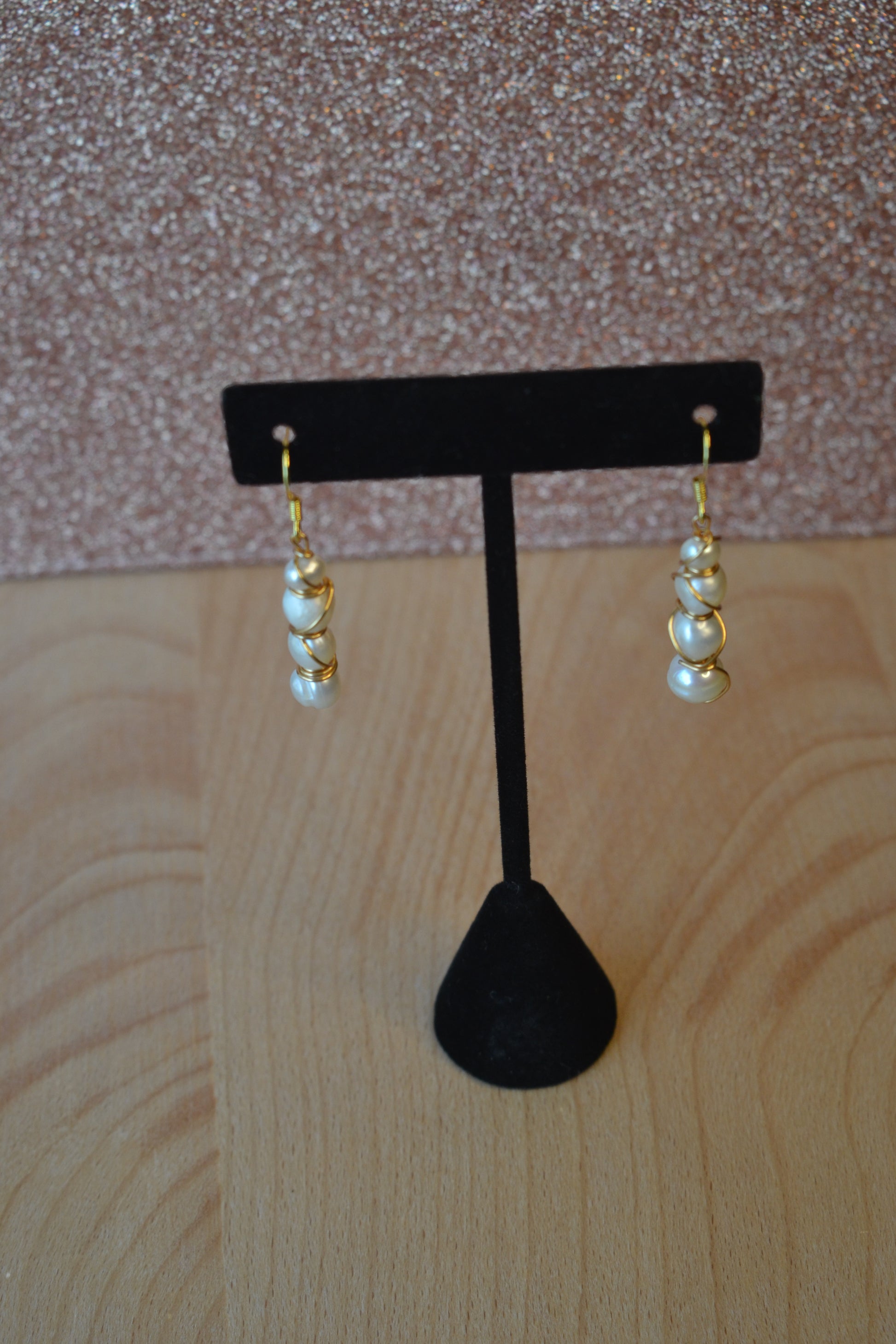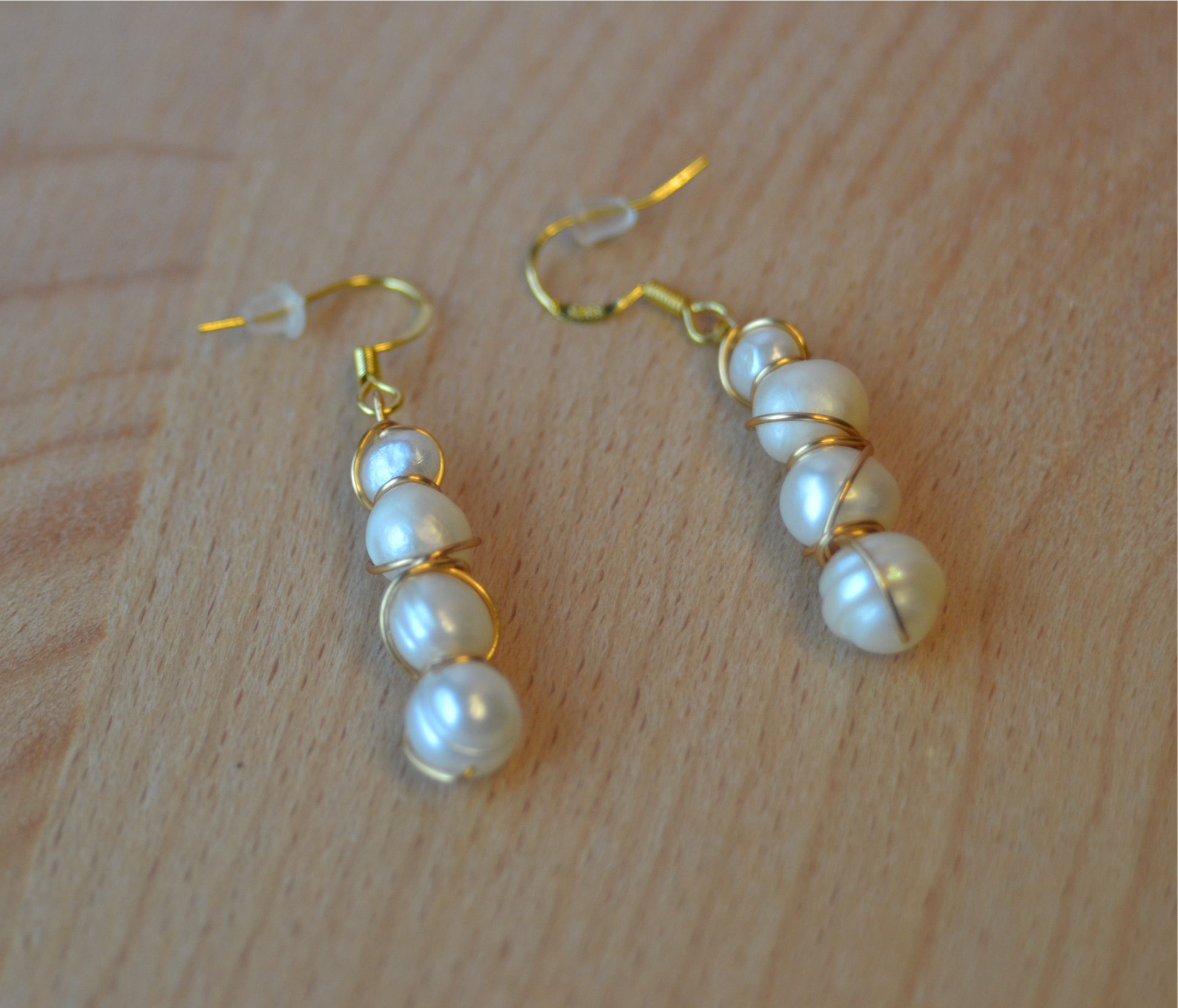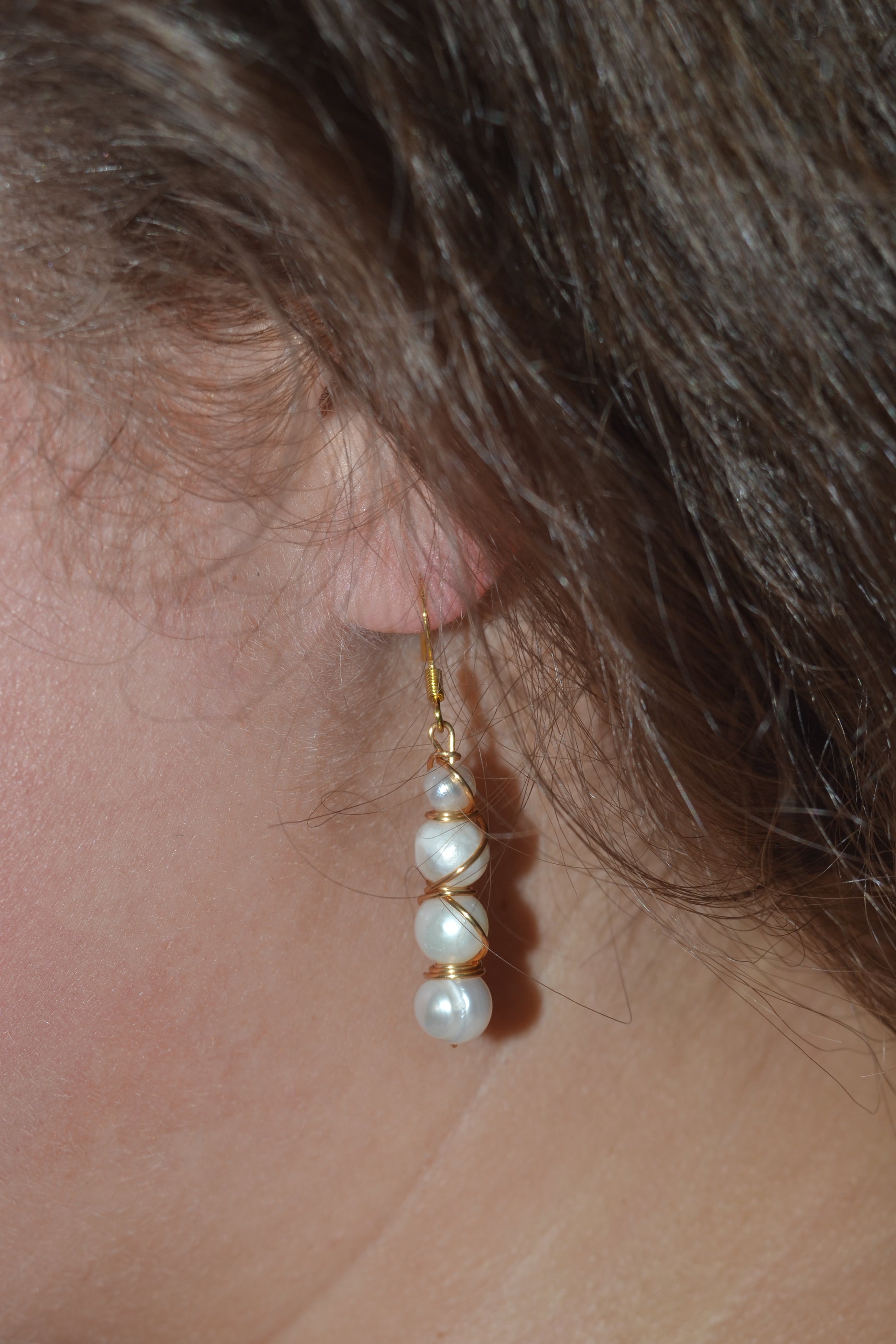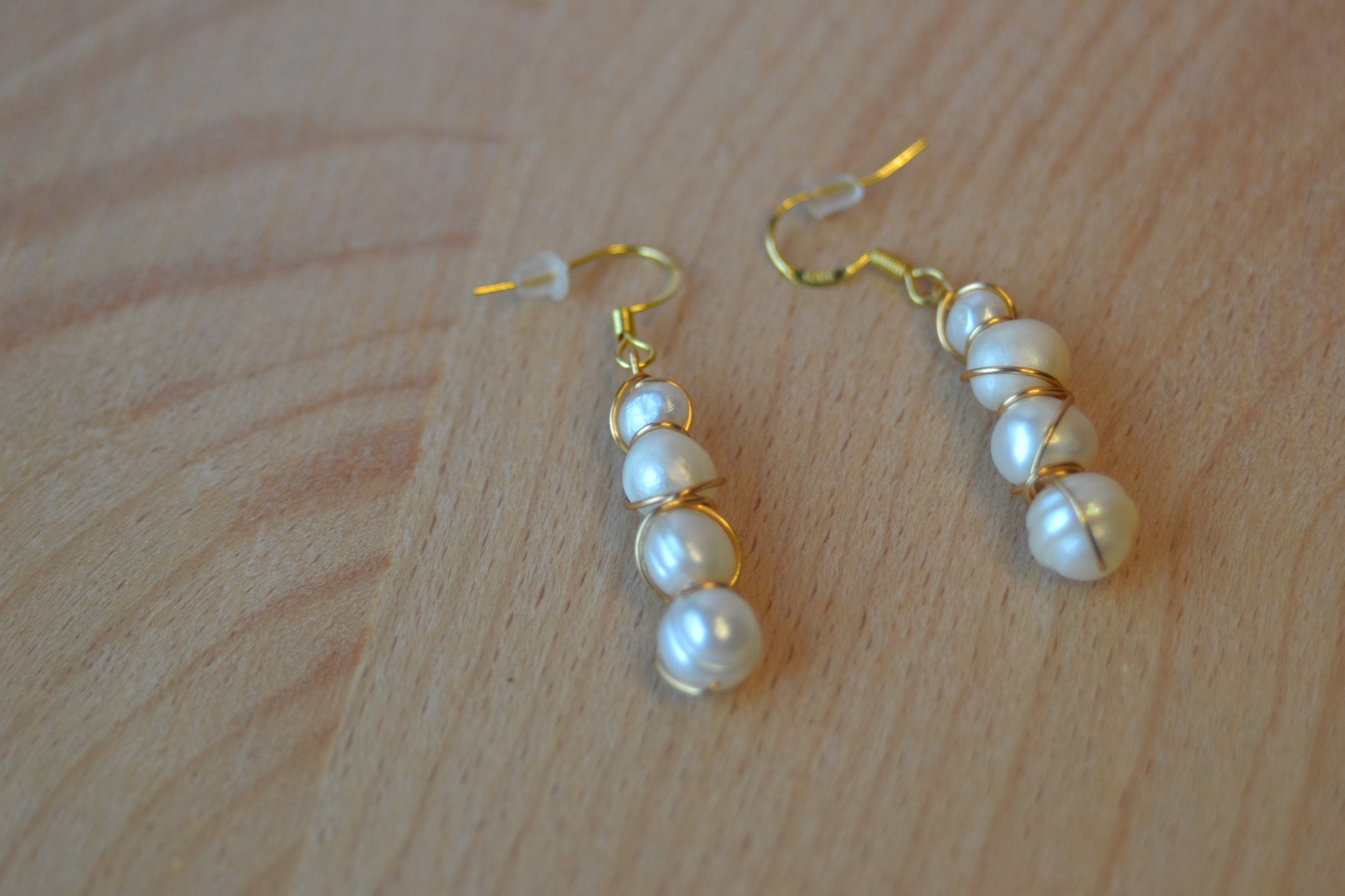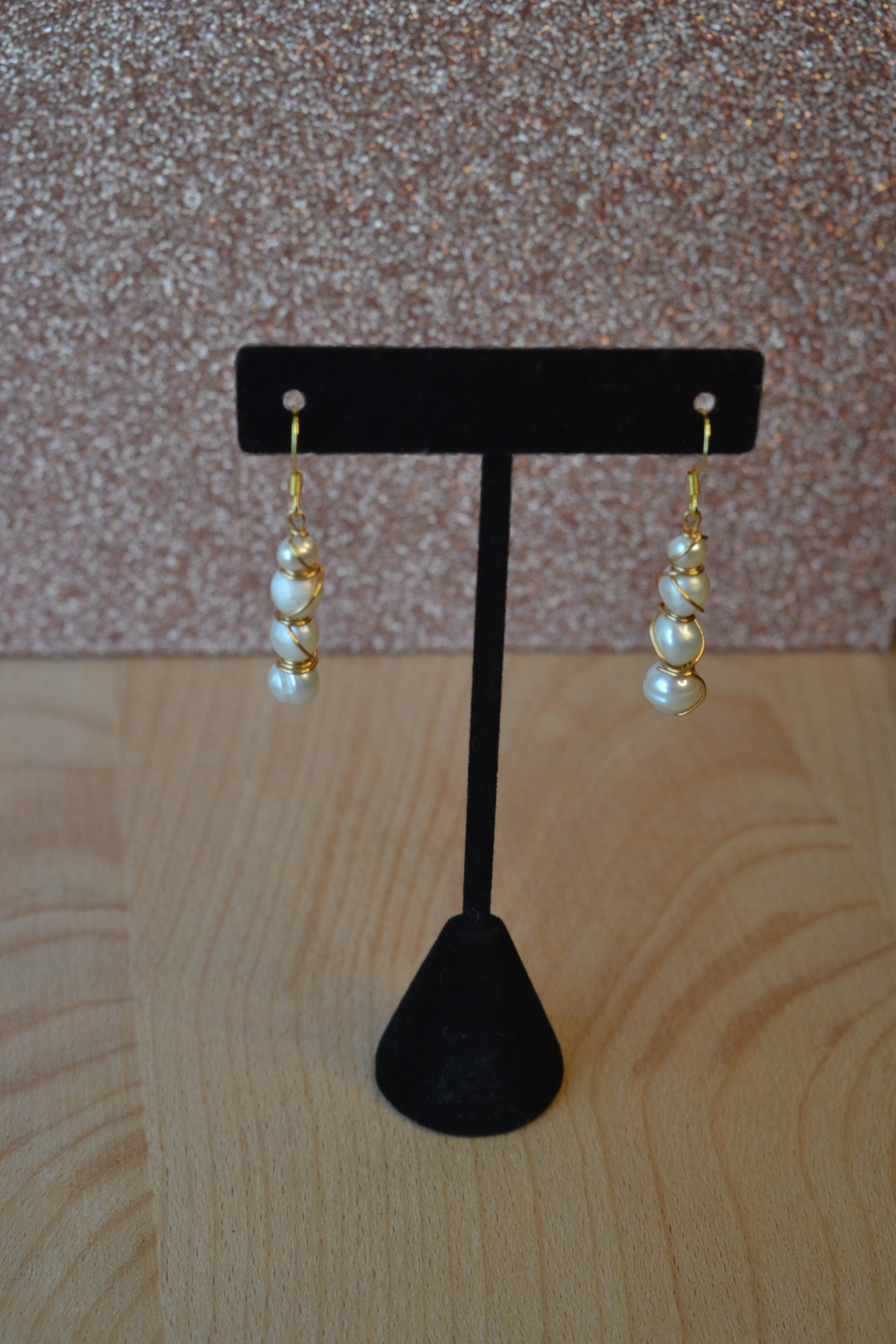 These handmade earrings feature four tiers of luminous freshwater pearls, stacked and wrapped delicately in gold wire for a graceful cascading effect. Suspended from 14k gold-plated sterling silver hooks, this design blends classic beauty with a modern handcrafted touch.