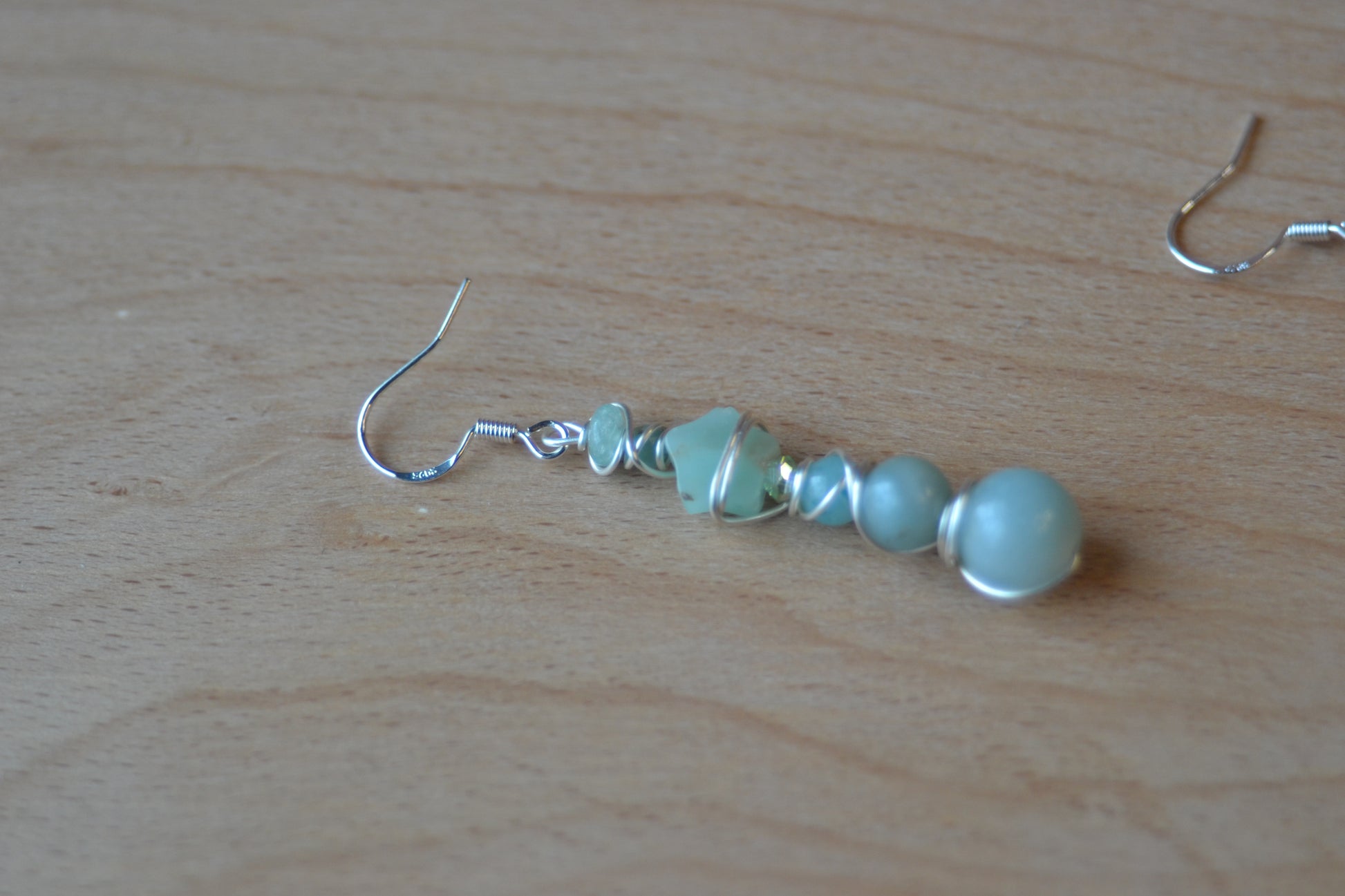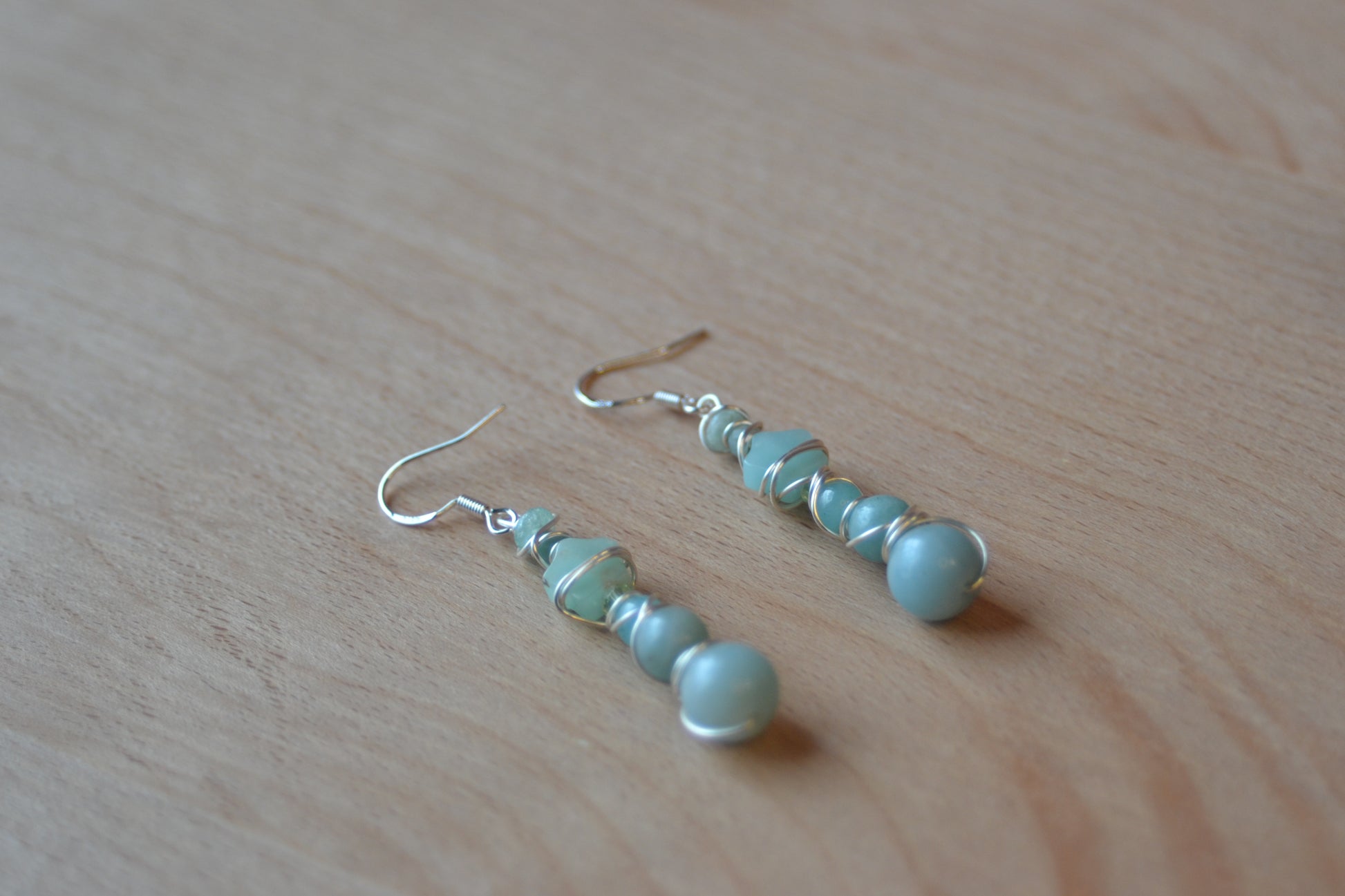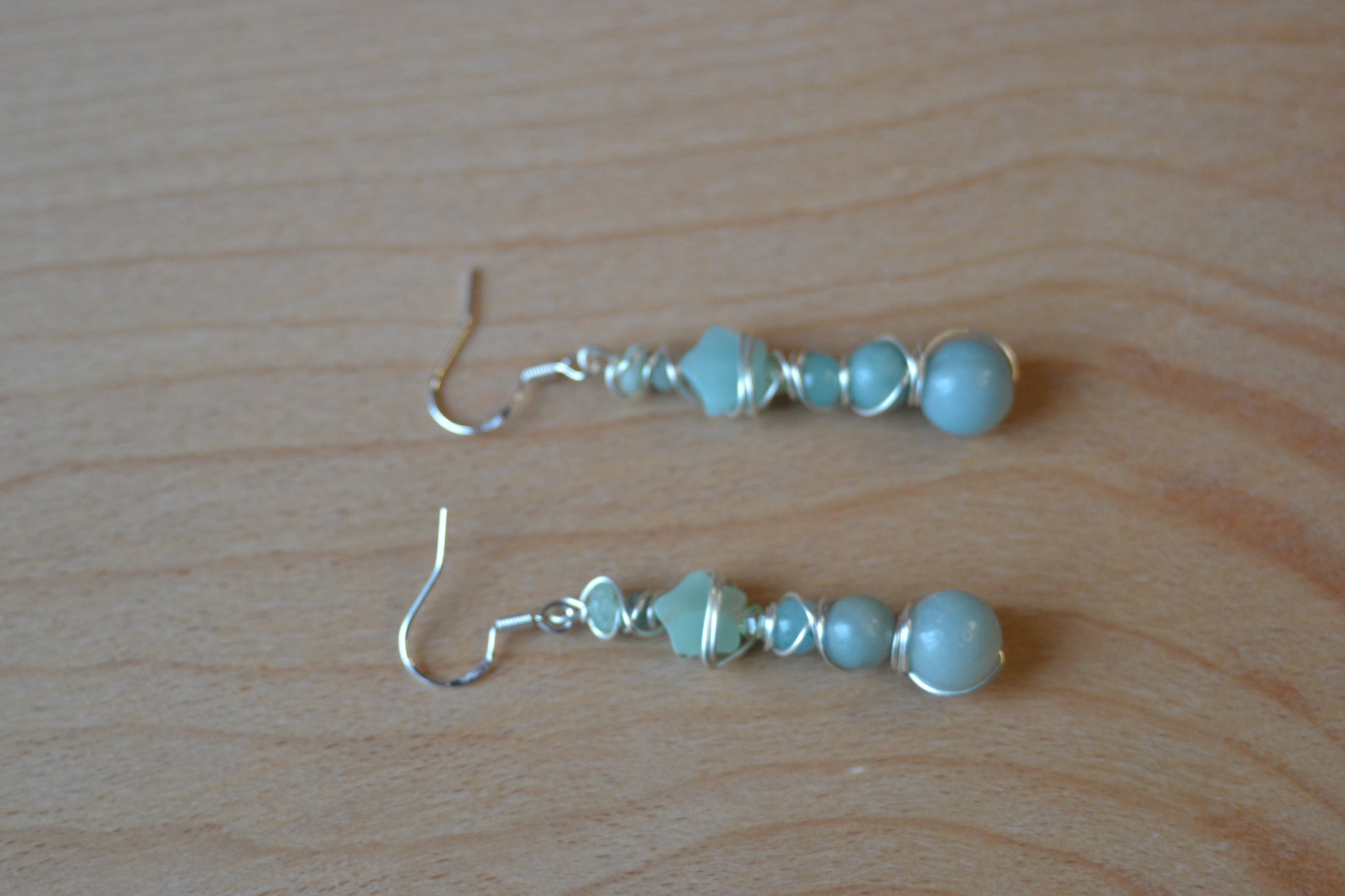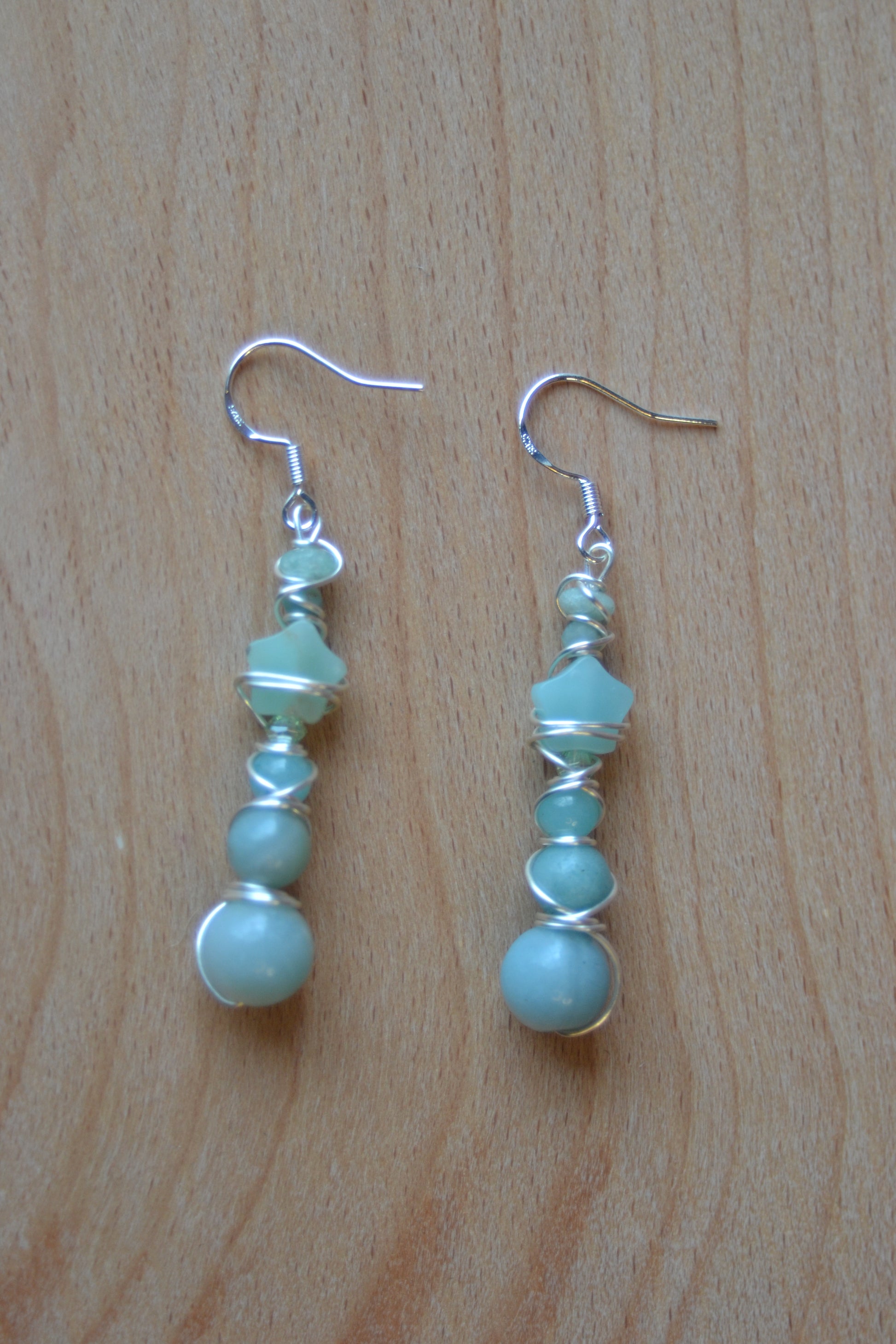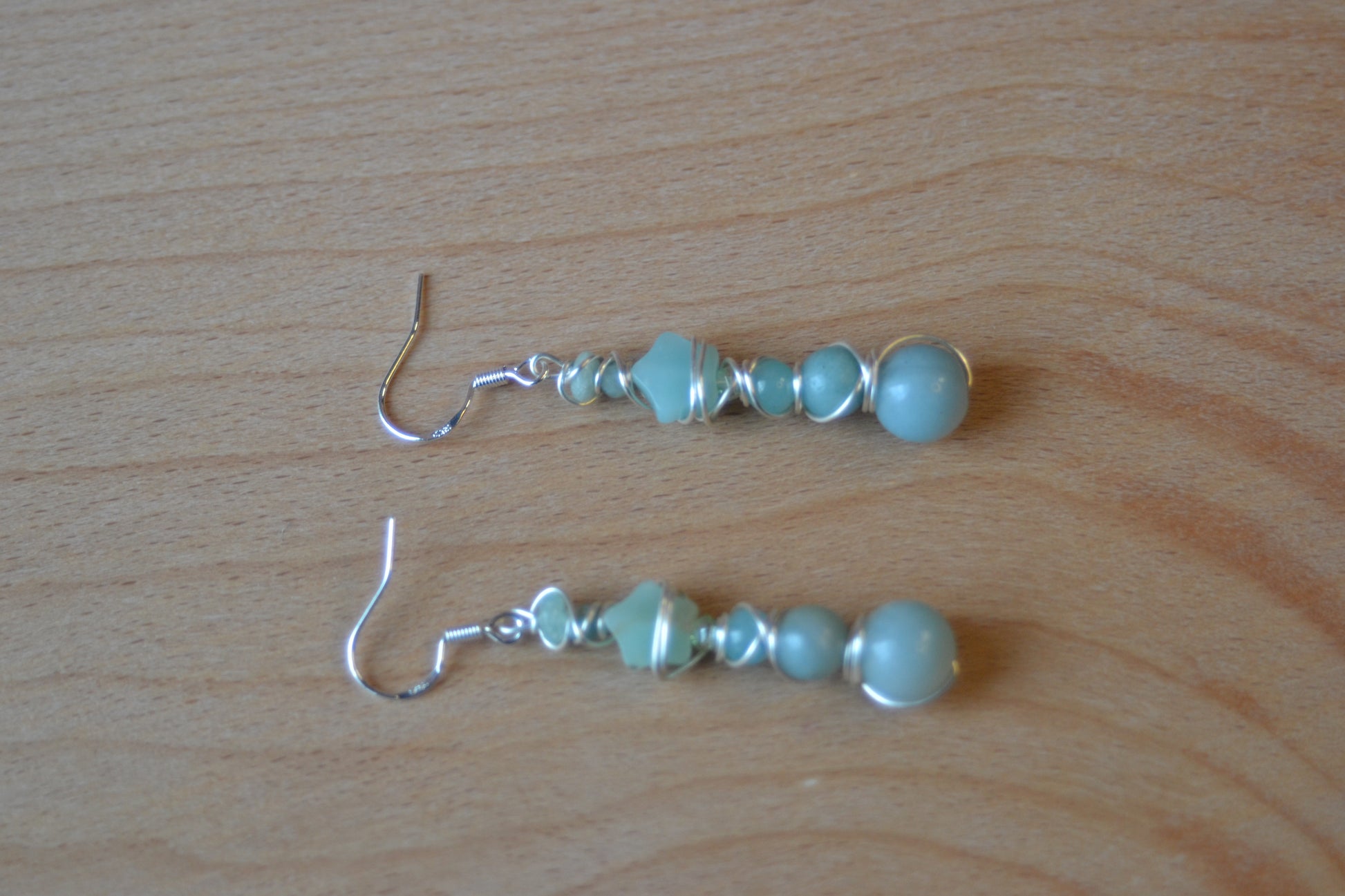 Delicate yet radiant, these Amazonite and crystal star earrings capture the magic of light and serenity. Each earring features 6 soft green Amazonite beads paired with a sparkling faceted green crystal and accented by a single star-shaped Amazonite stone. Double wire wrapped in silver-plated copper and finished with 925 sterling silver hooks, they bring a graceful balance of strength and elegance.