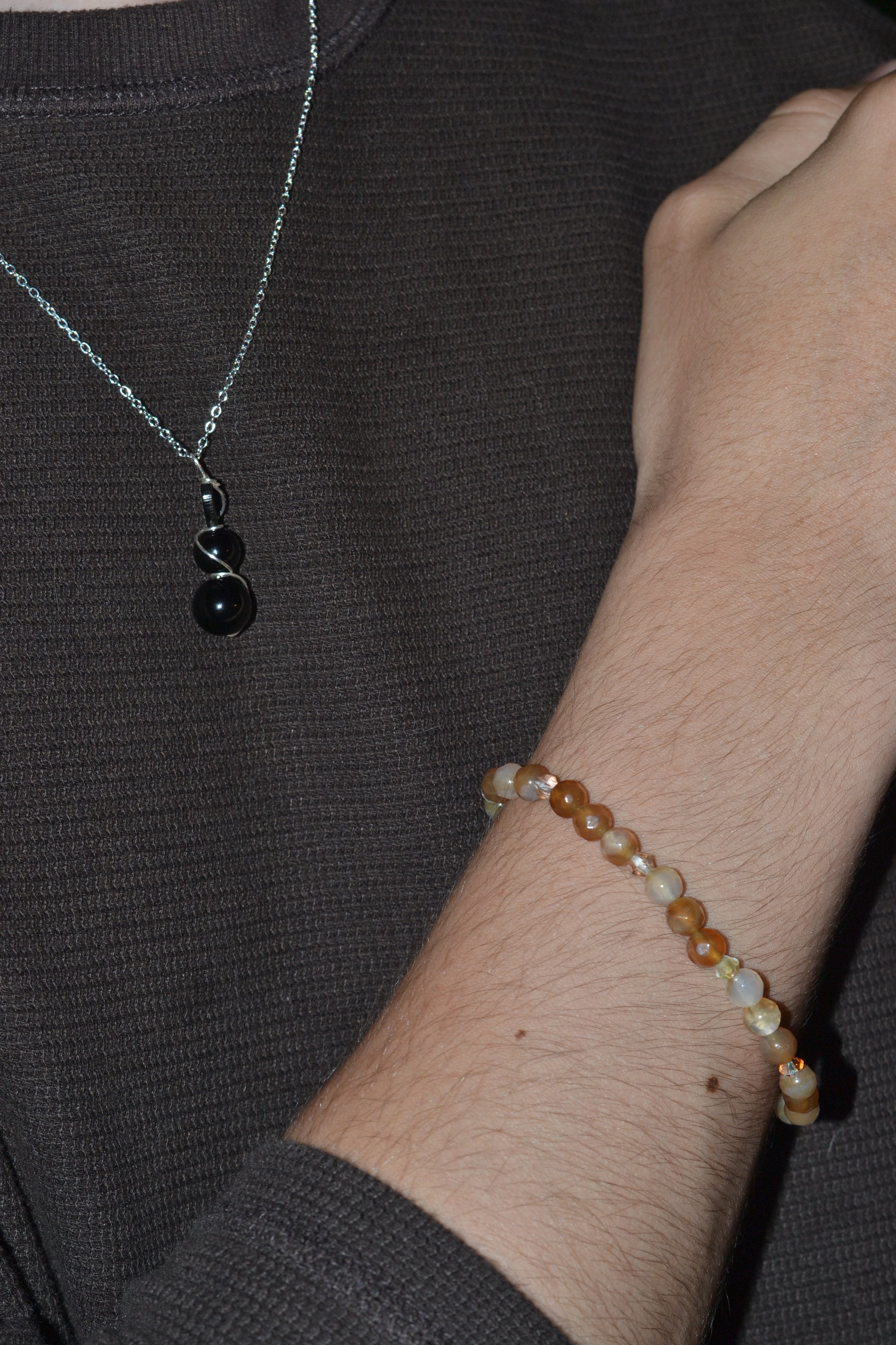 Black Onyx is a grounding stone of inner strength and energetic protection, while Black Mother of Pearl connects to intuition and emotional depth. Together, they offer a wearable shield — elegant enough for daily wear, potent enough for spiritual grounding and focus.