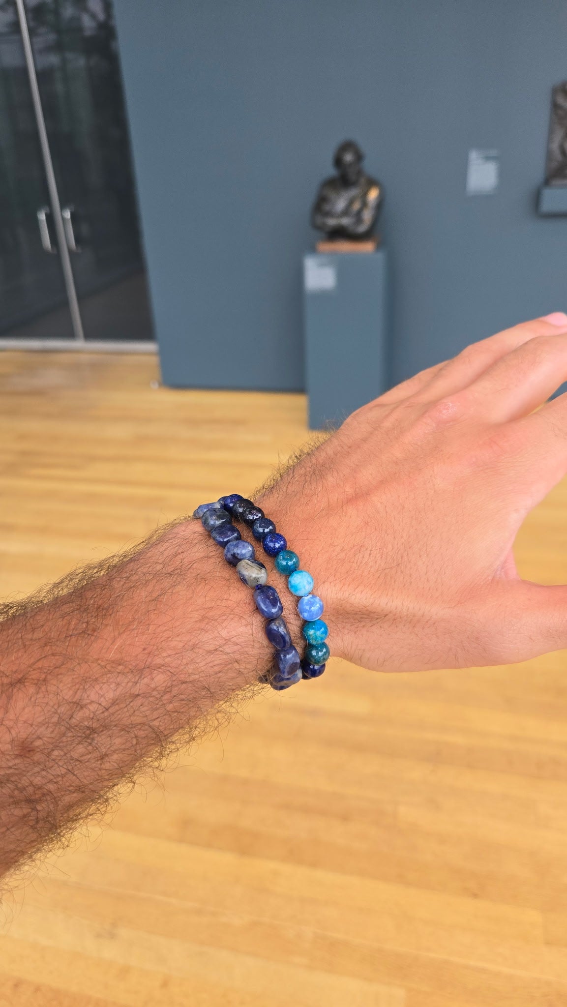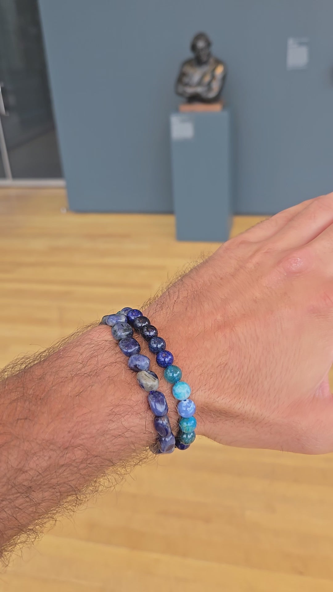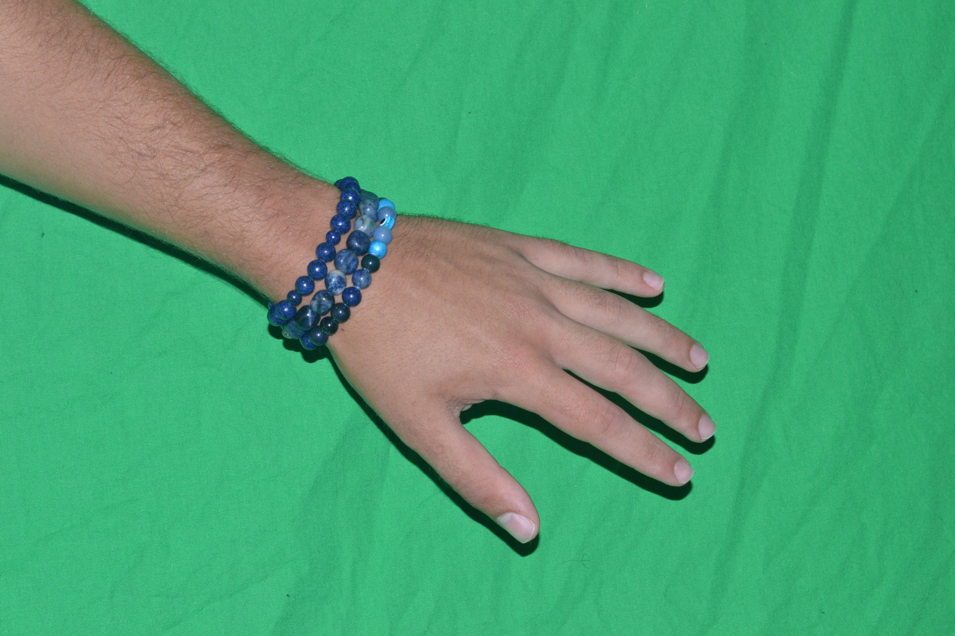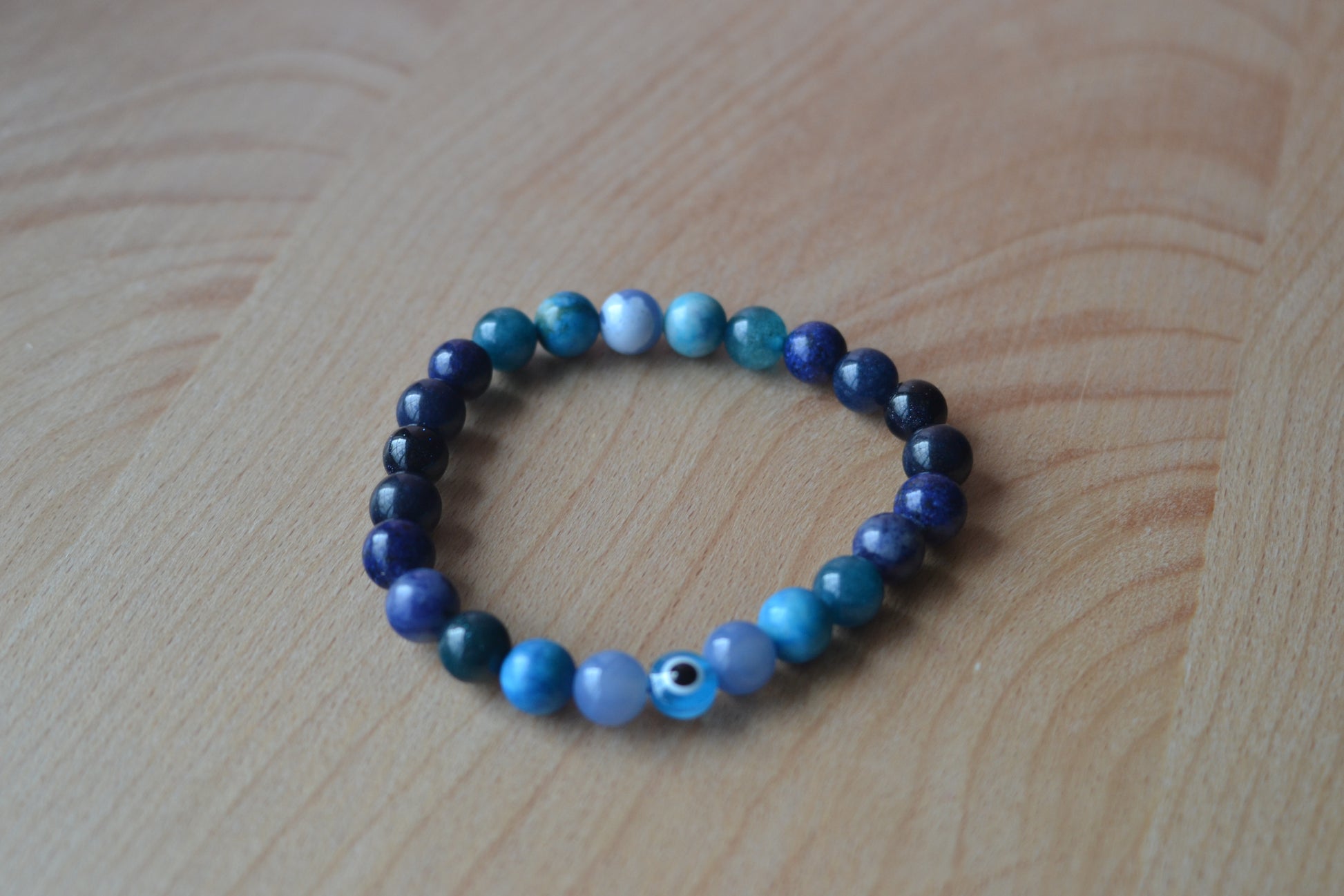This handcrafted bracelet is a powerful blend of 6mm blue gemstones and a central evil eye bead for protection and intuitive clarity. Featuring Blue Lace Agate, Sodalite, Jasper, Midnight Goldstone, Lapis Lazuli, Sapphire, and Aquamarine, this bracelet holds the energy of ocean depths, inner knowing, and calm confidence.