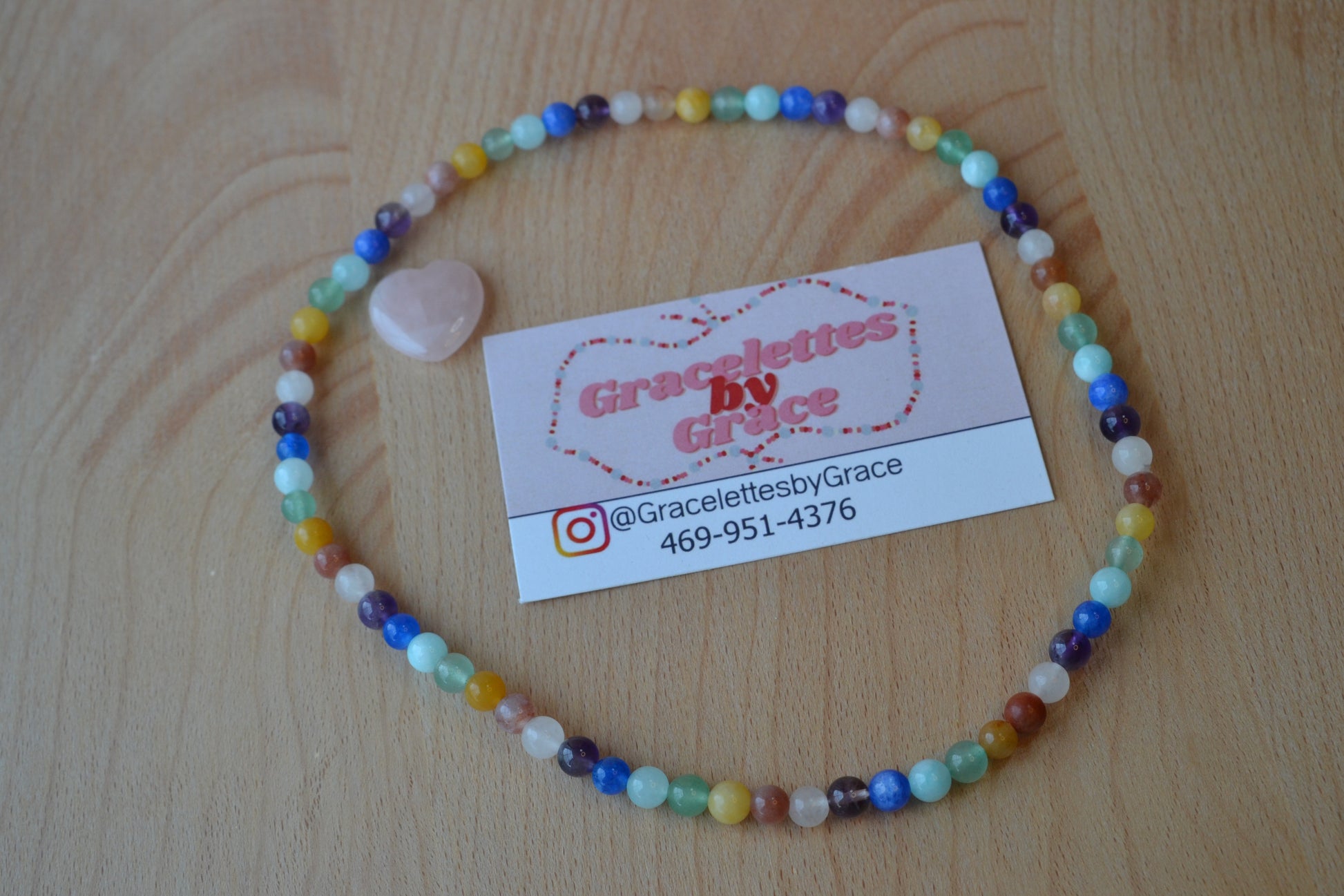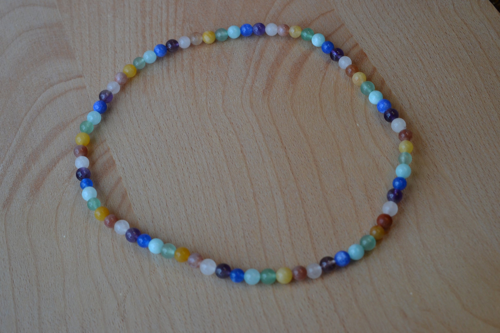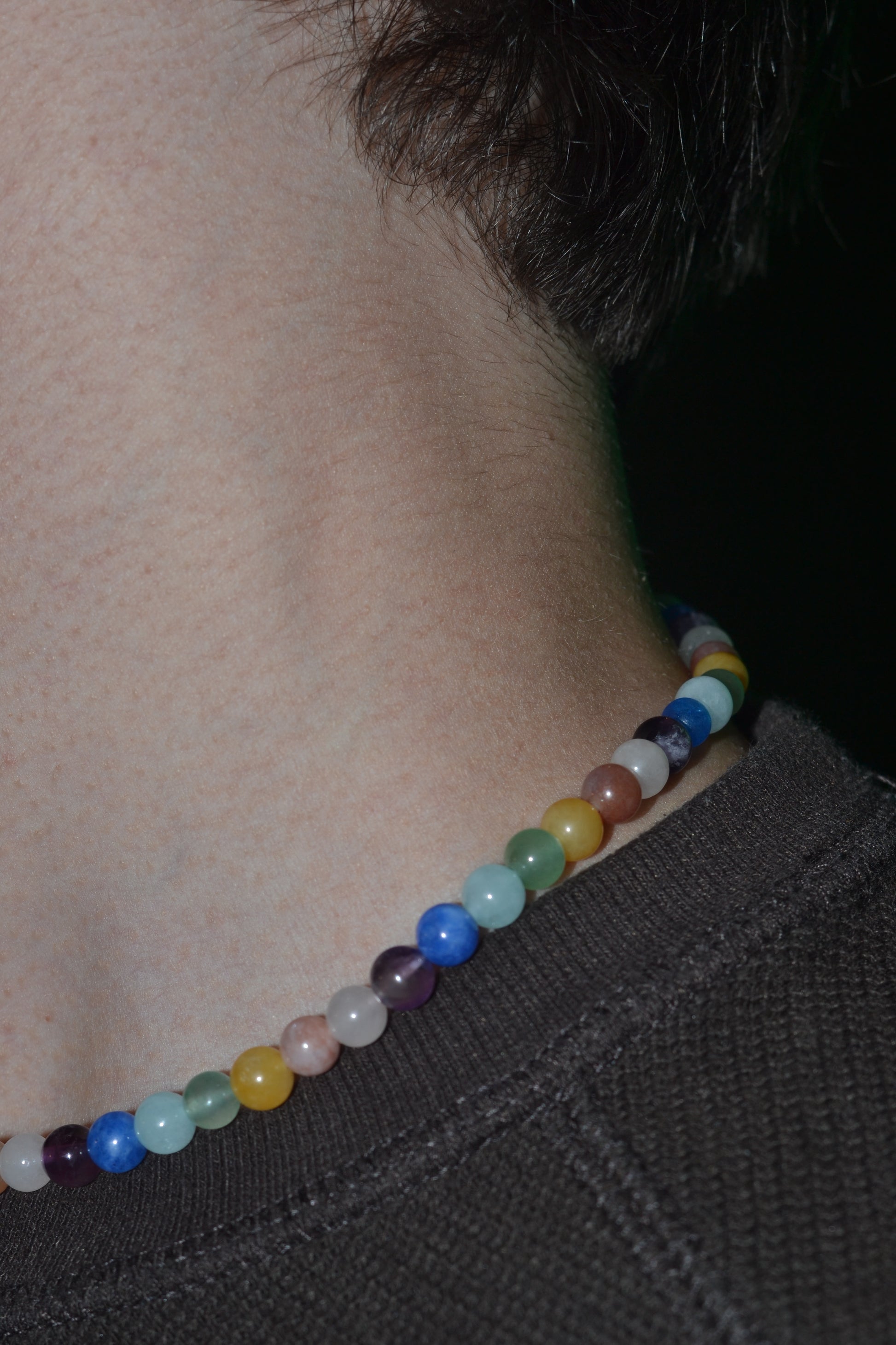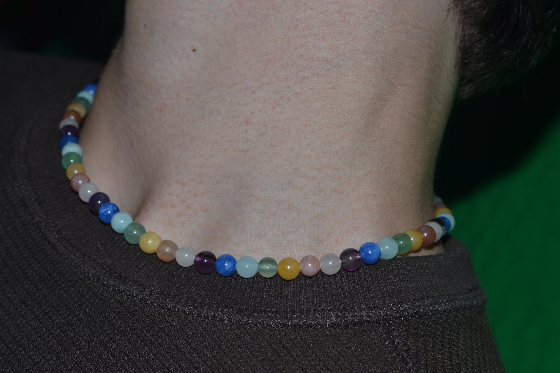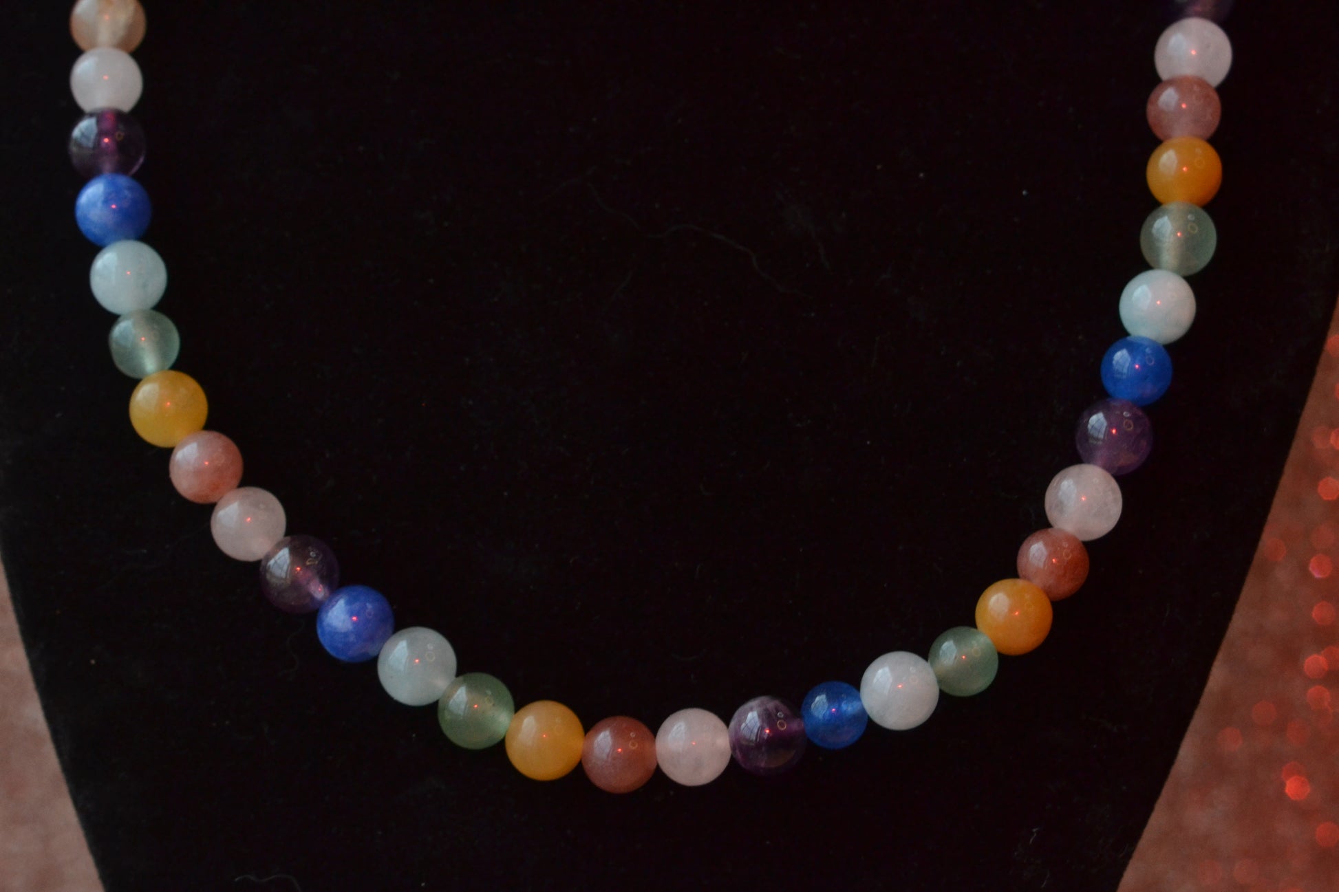 This soft and radiant 16-inch rainbow choker is made with smooth 4mm natural gemstone beads, creating a subtle gradient of healing energy across the chakras. Featuring Rose Quartz, Fire Agate, Yellow Jade, Green Aventurine, Aquamarine, Druzy Jasper, and Amethyst, this piece is perfect for daily wear, layering, or as a meaningful gift for someone walking their healing path.