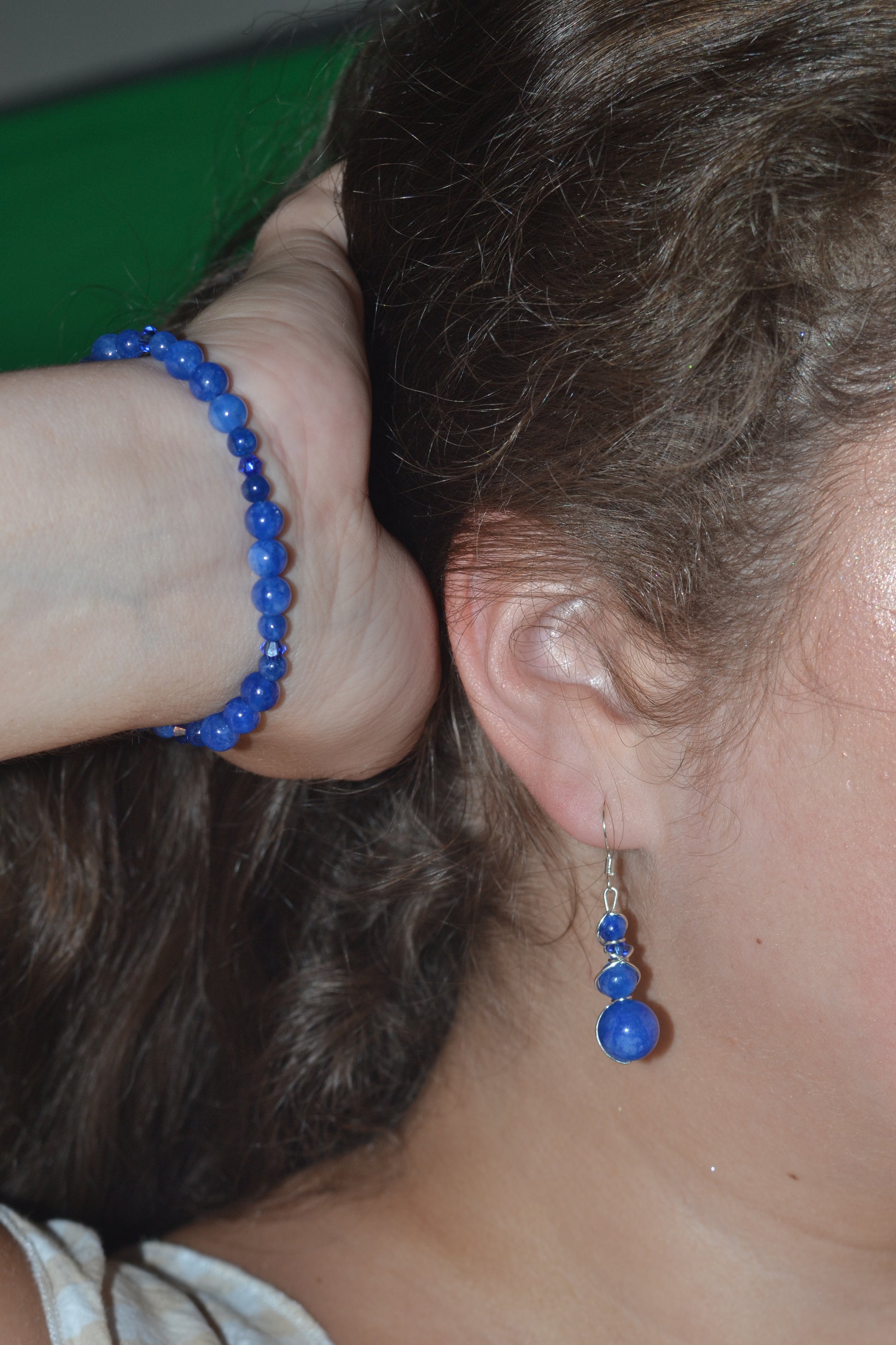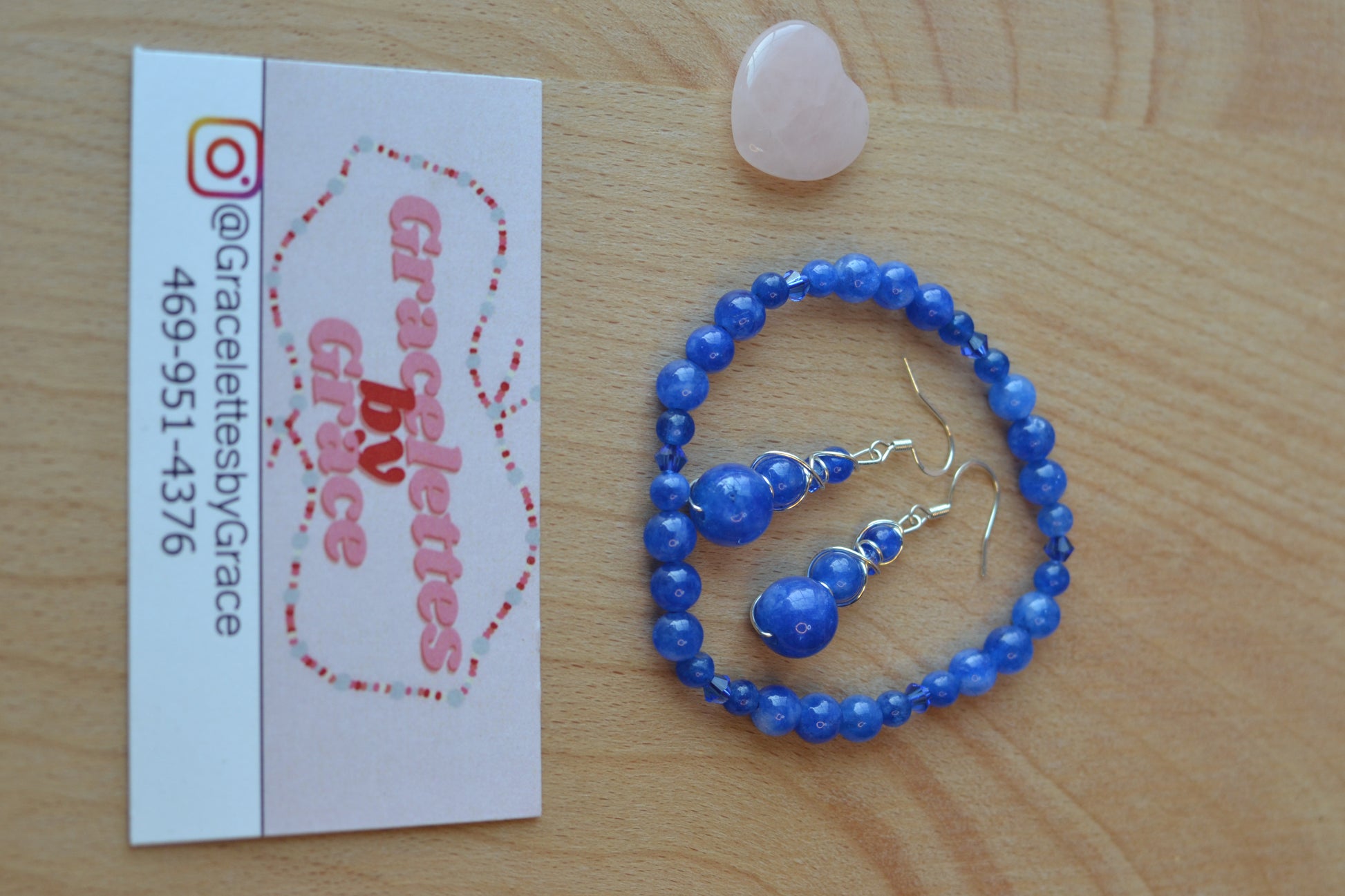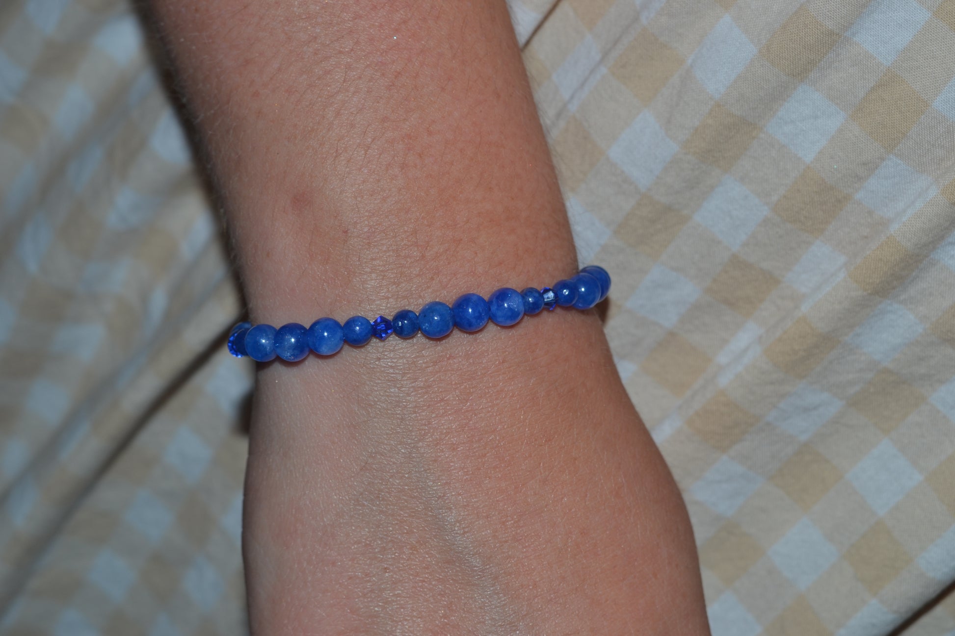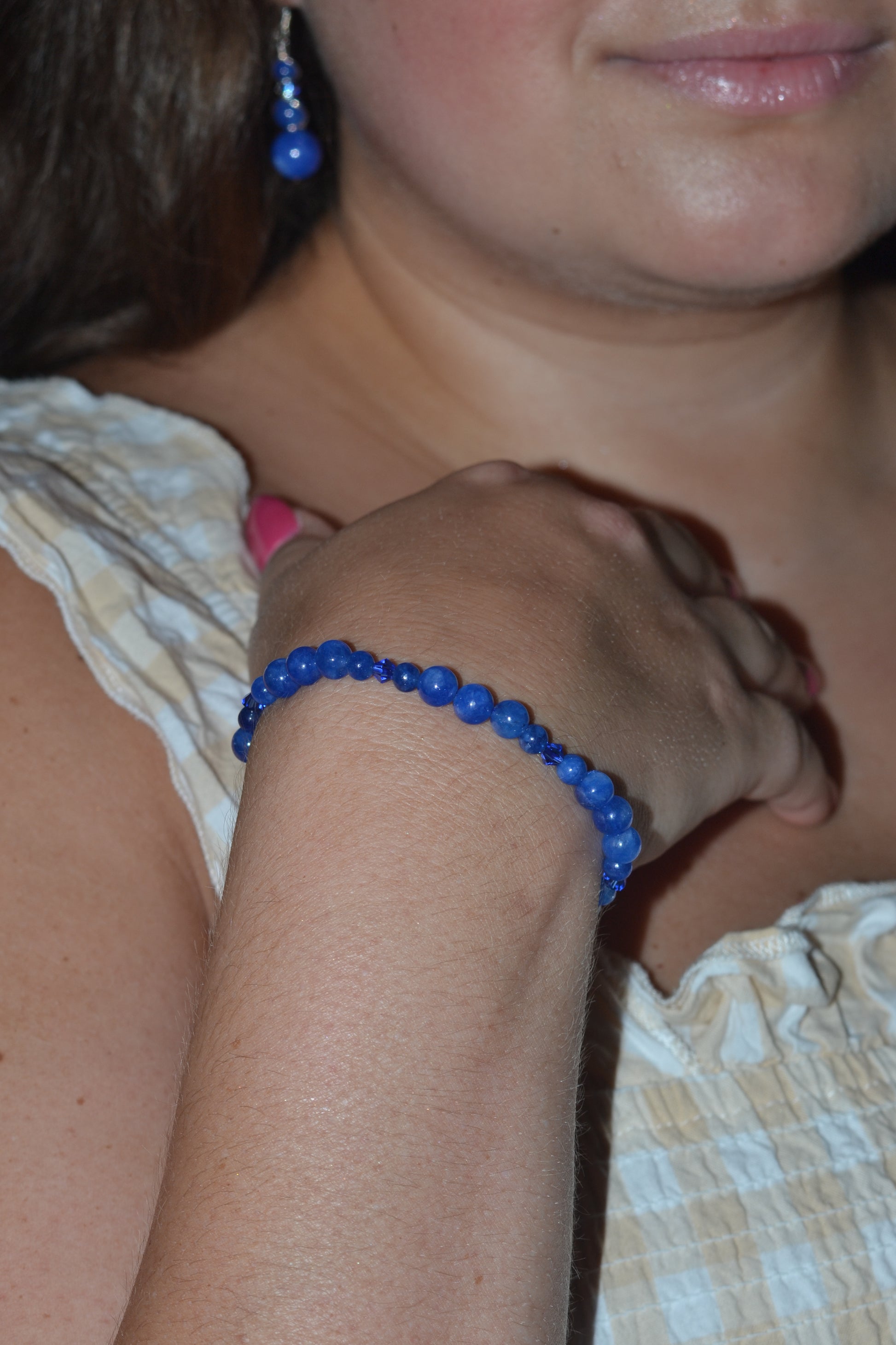 The matching bracelet is made with 4mm and 2mm blue jasper beads, spaced with subtle blue crystal accents, making it lightweight, stackable, and energetically aligned.