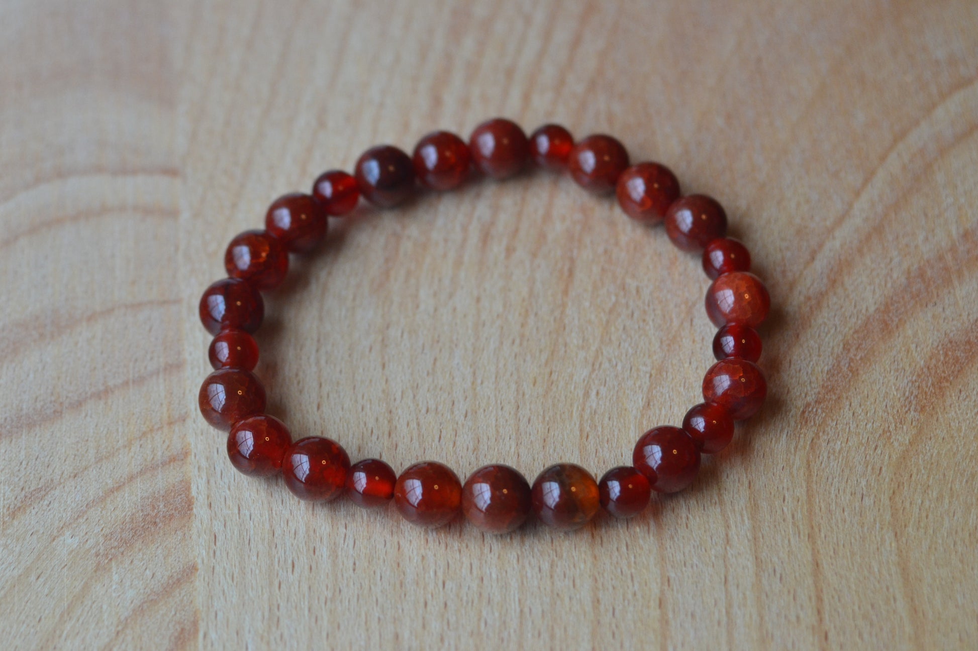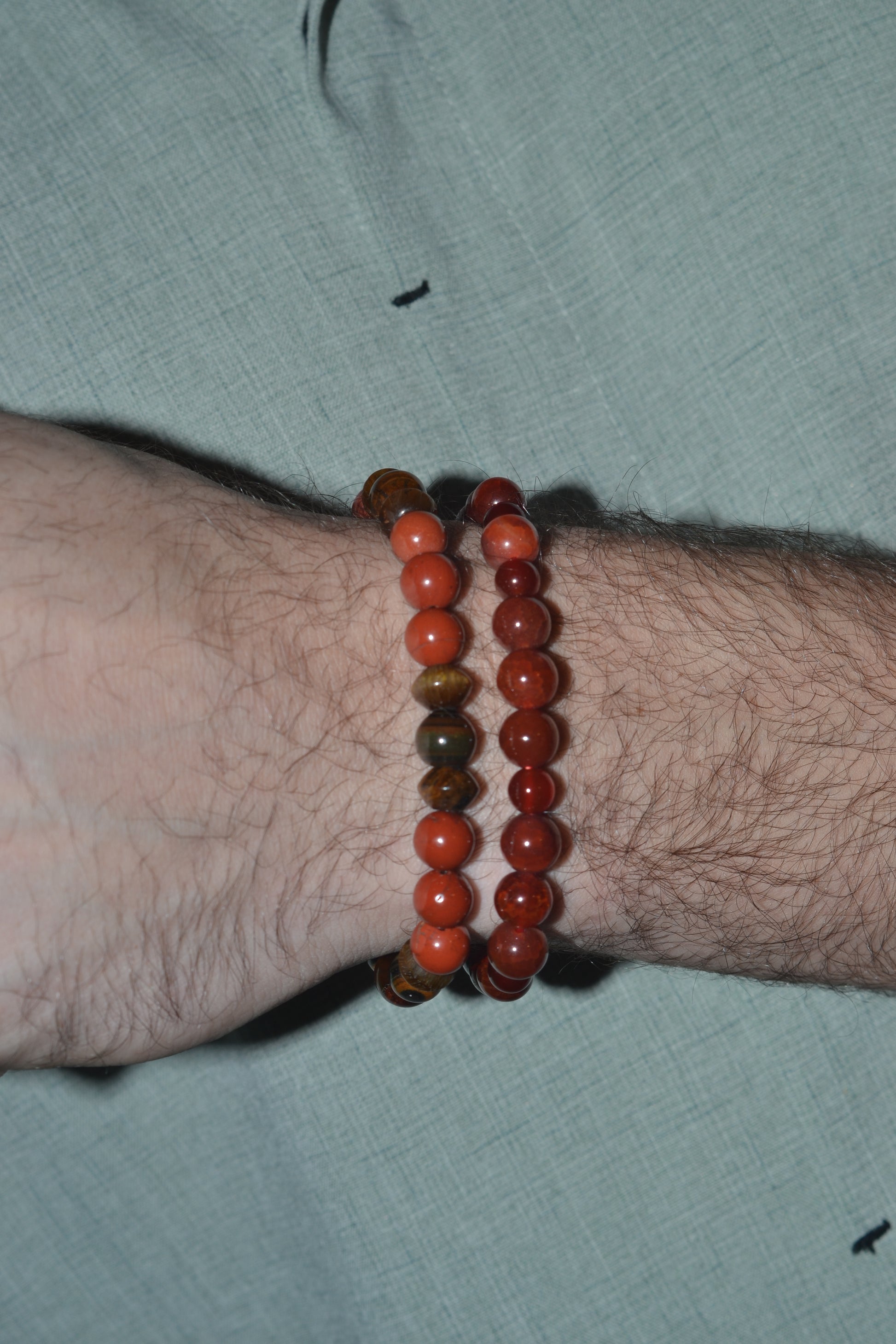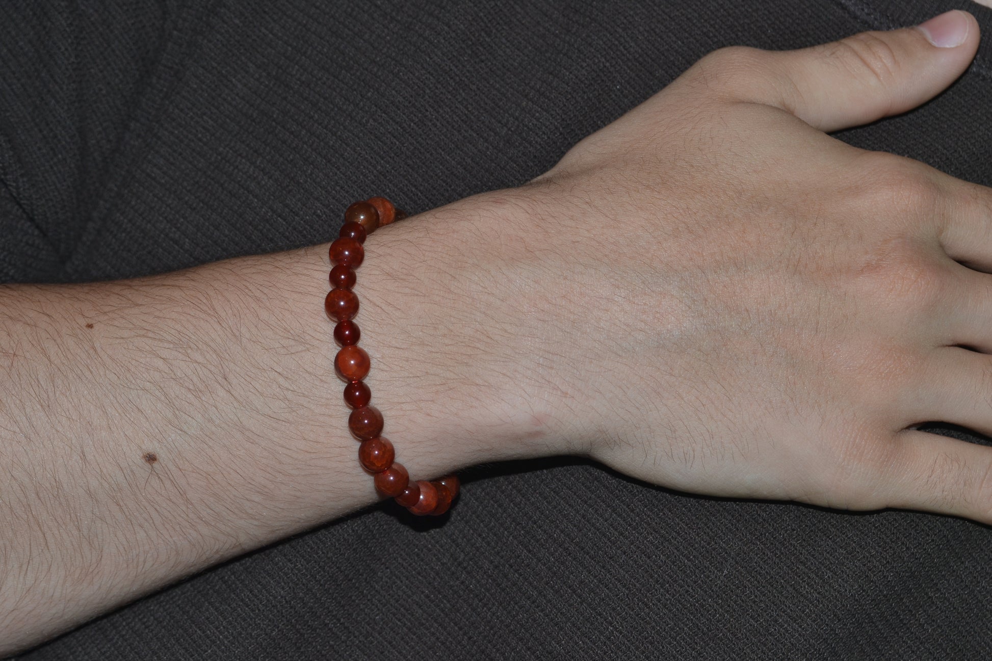 Harness the protective power of fire agate combined with the energizing vitality of carnelian in this handcrafted bracelet designed for grounded masculine strength.