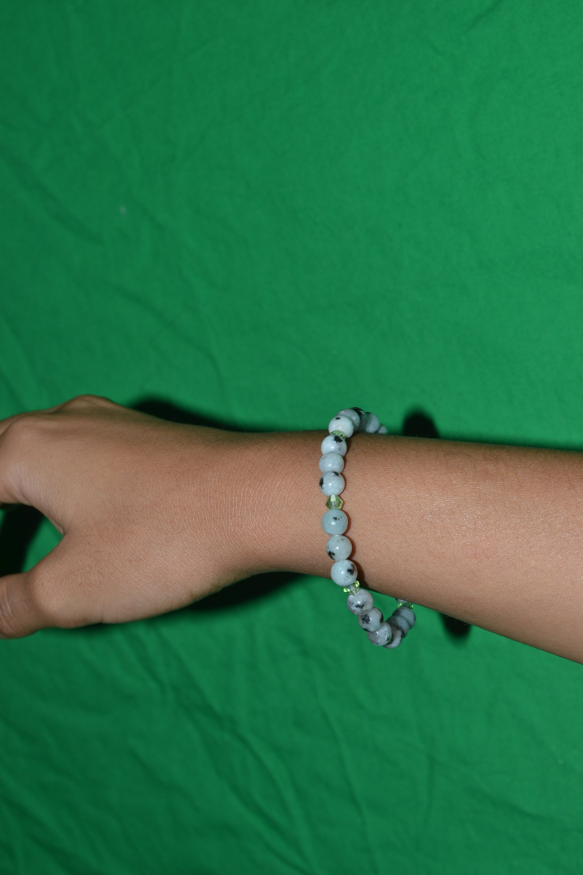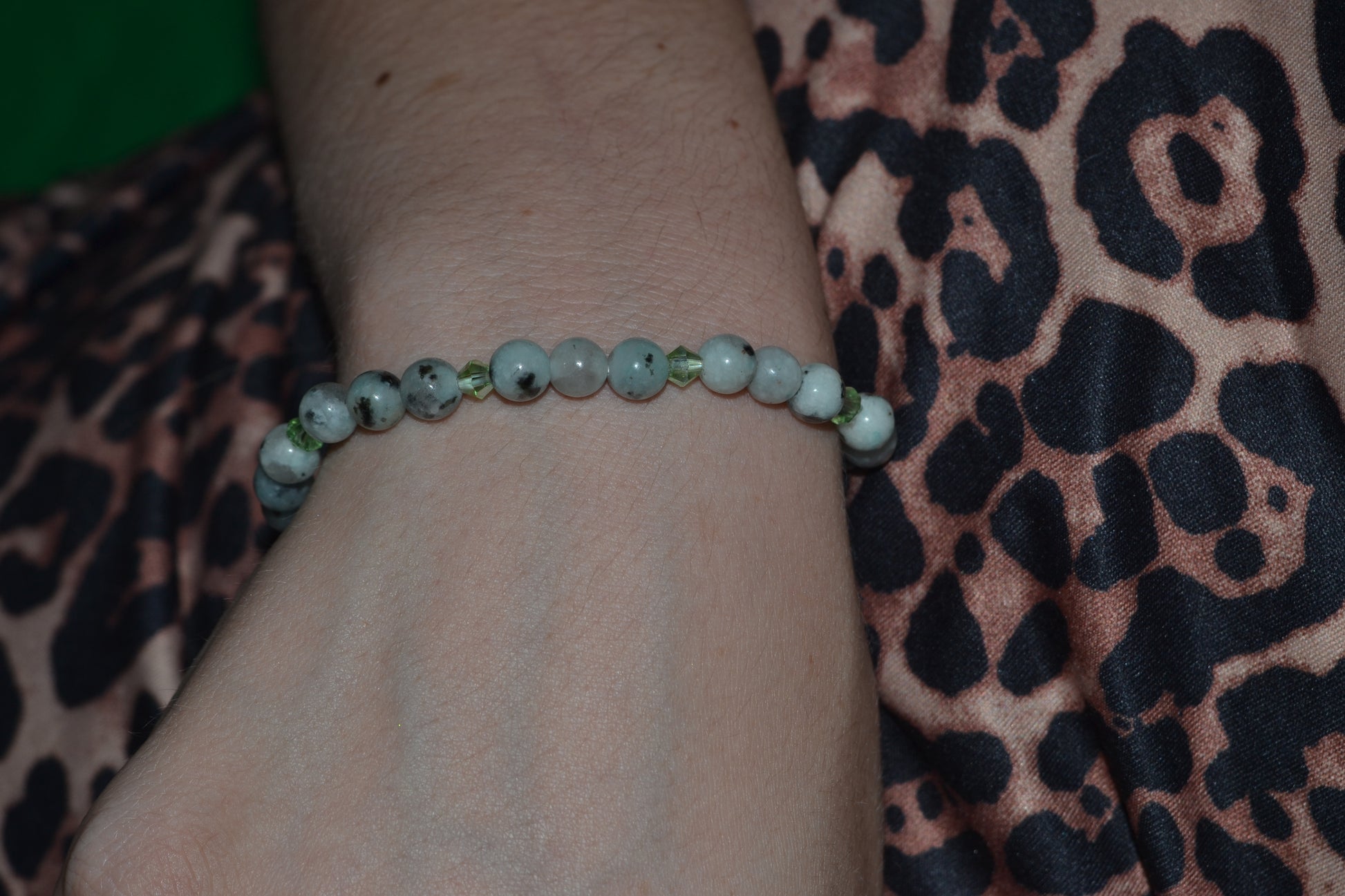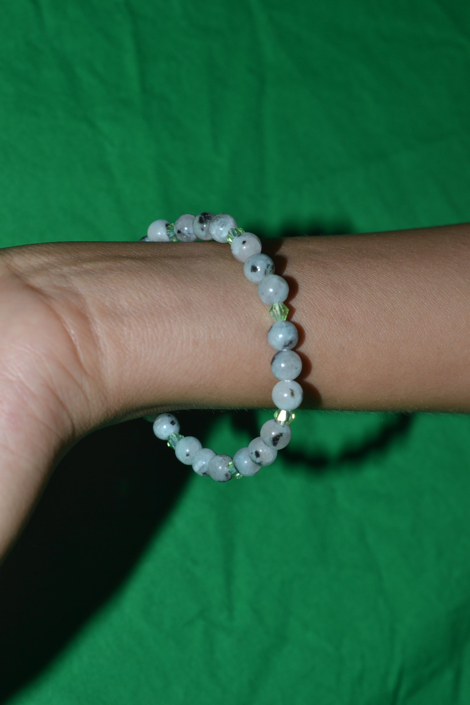 This handmade bracelet features tiny 4mm sesame jasper beads paired with sparkling light green faceted crystals, creating a subtle yet elegant harmony of earth and light. The natural patterns of sesame jasper bring grounding and nurturing energy, while the faceted crystals add a gentle shimmer that catches the eye.