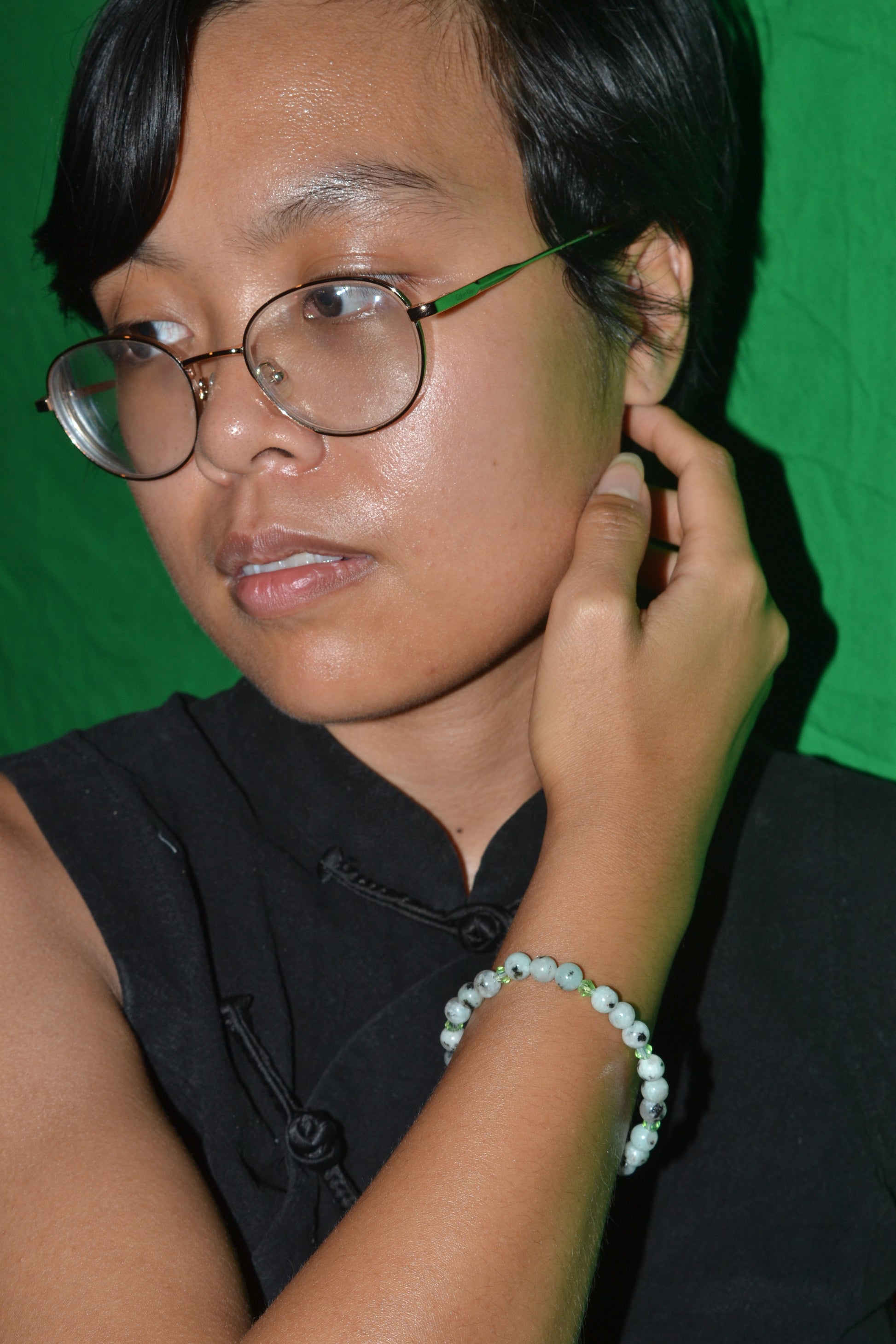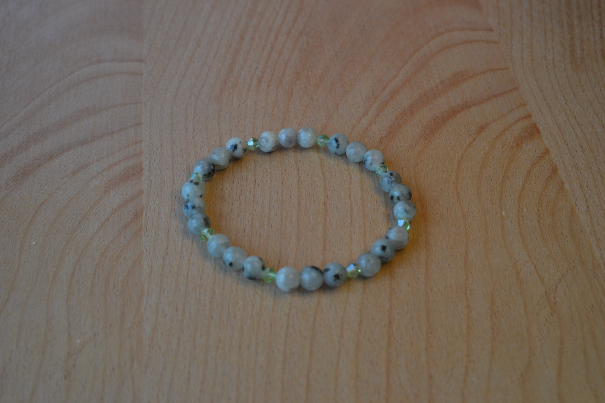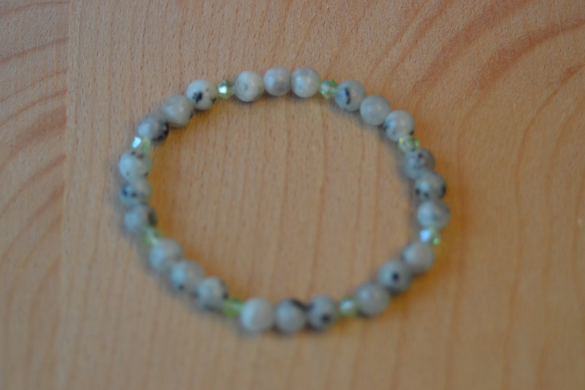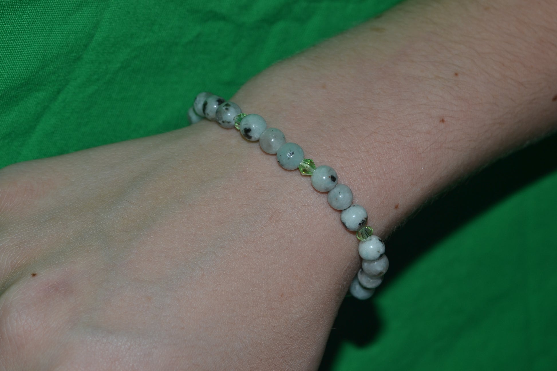 This handmade bracelet features tiny 4mm sesame jasper beads paired with sparkling light green faceted crystals, creating a subtle yet elegant harmony of earth and light. The natural patterns of sesame jasper bring grounding and nurturing energy, while the faceted crystals add a gentle shimmer that catches the eye.