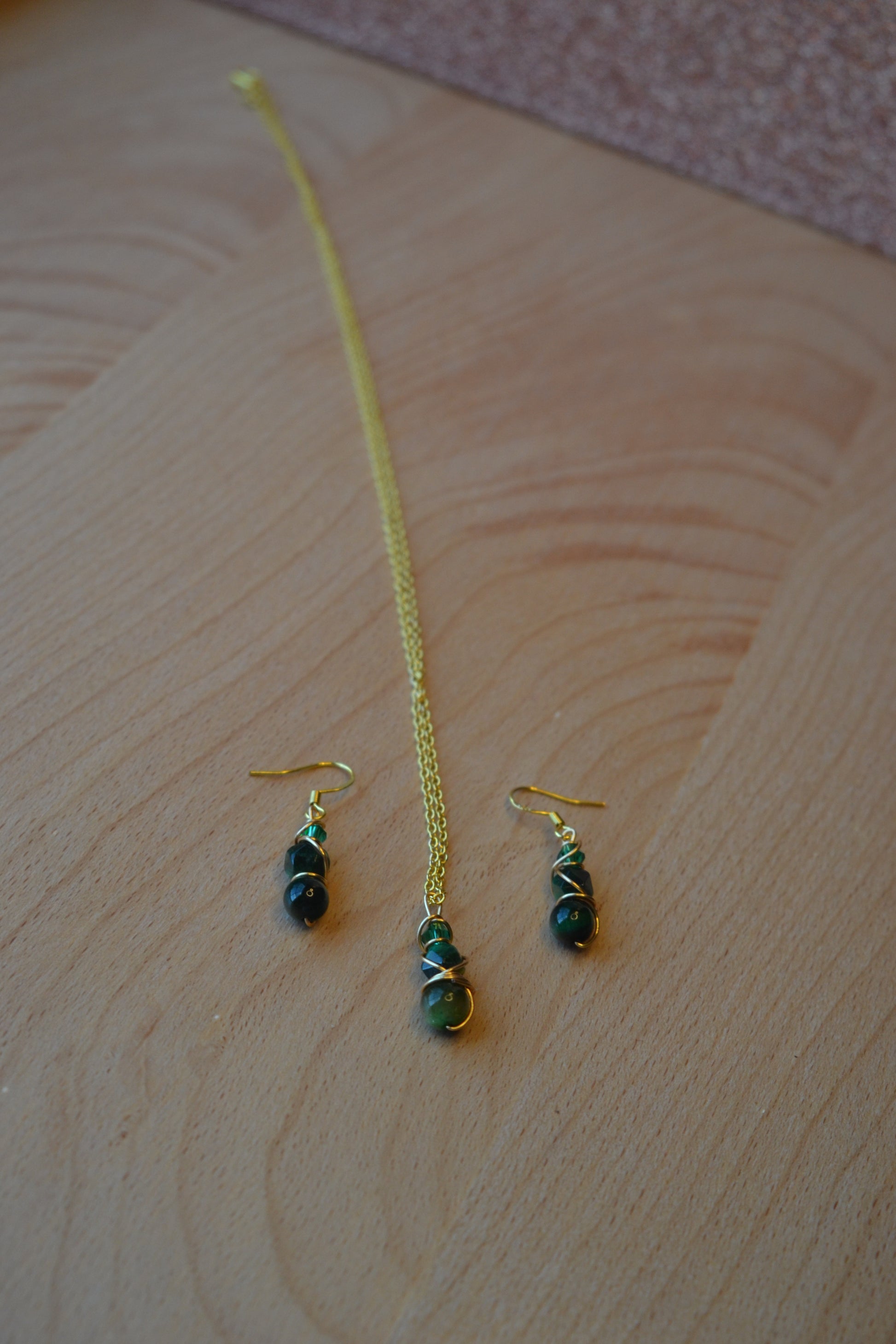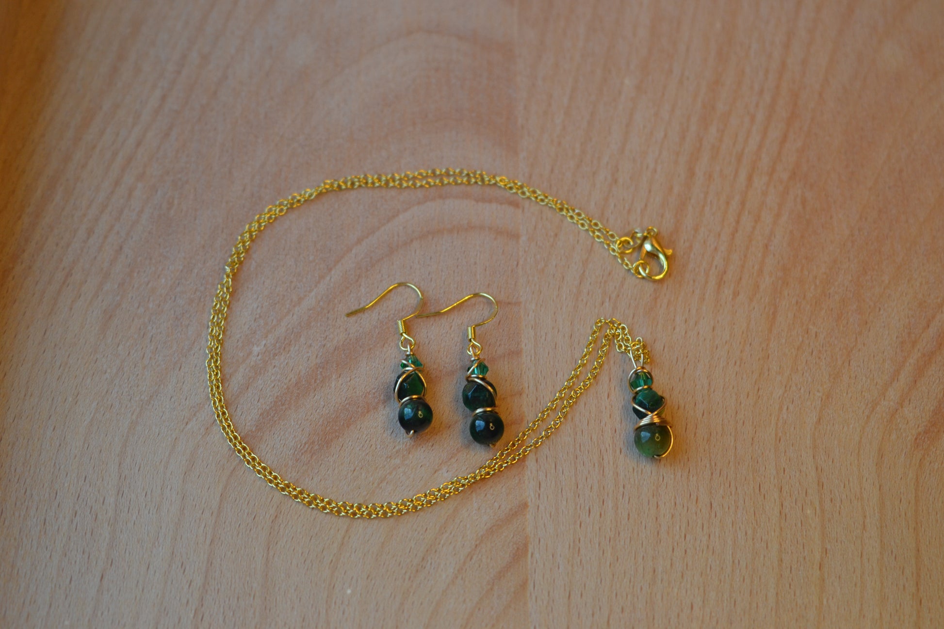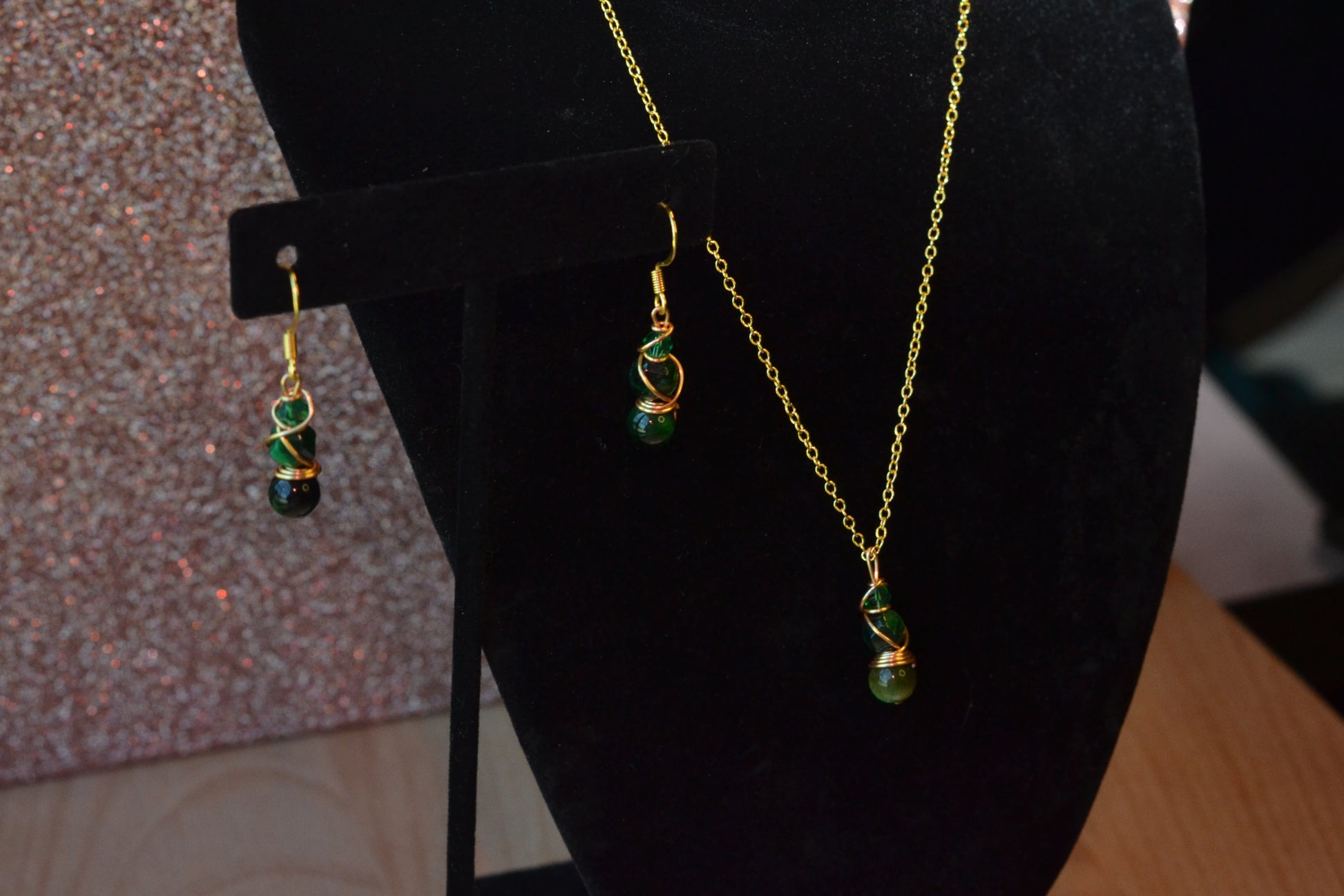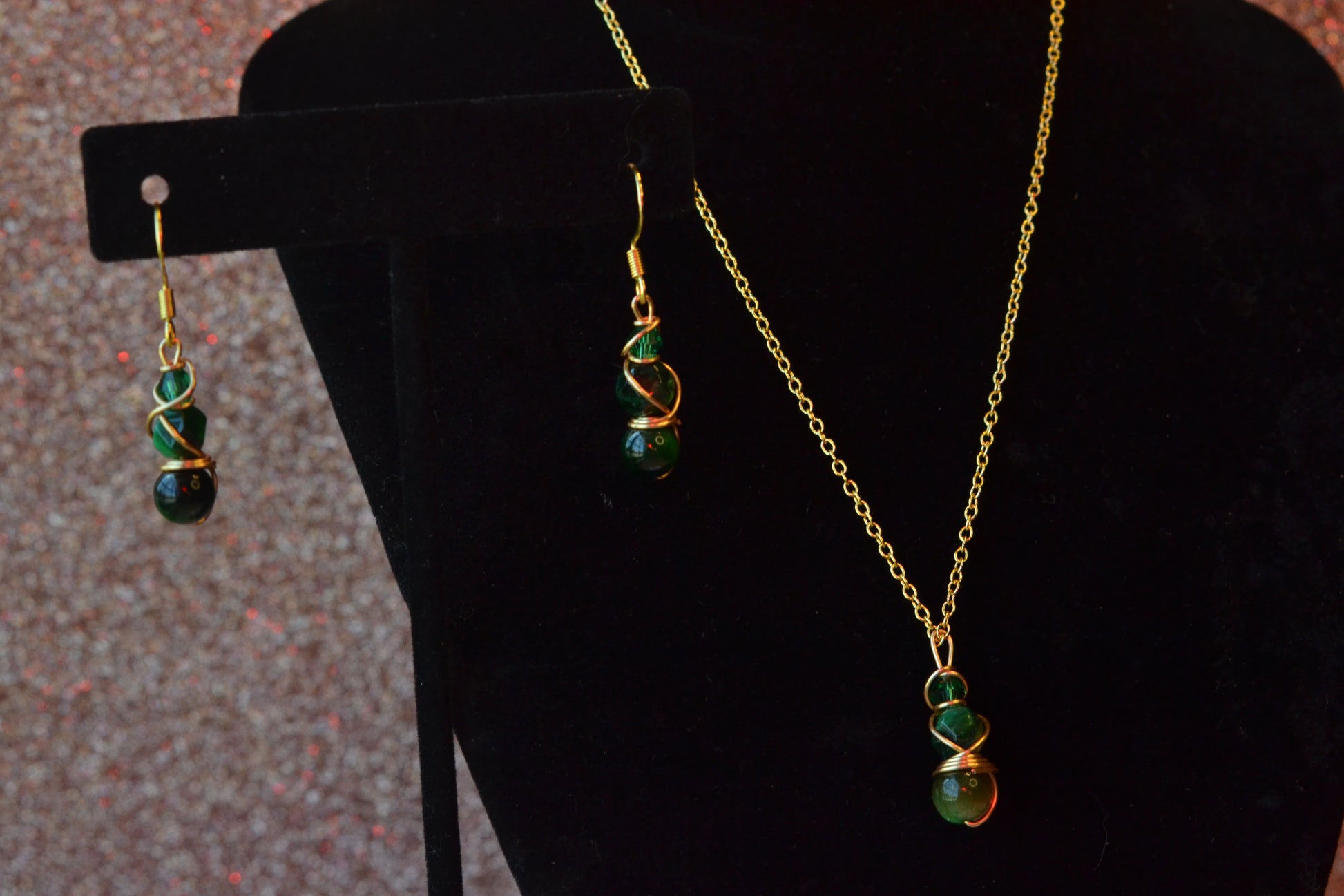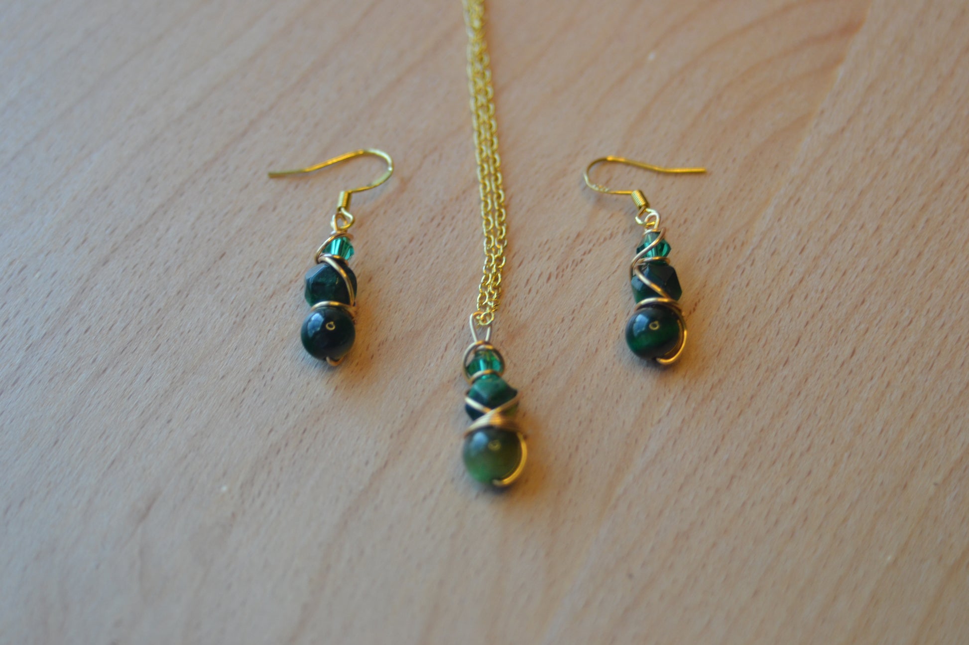 This striking handmade jewelry set features a 20-inch gold-plated 925 sterling silver chain with a 1-inch, 3-tiered green Tiger’s Eye pendant, wire-wrapped in gold-plated copper and topped with a sparkling green faceted crystal. The matching 1.5-inch earrings echo the pendant with a double wire-wrap design and are finished with gold-plated 925 sterling silver hooks for a luxe and radiant look.