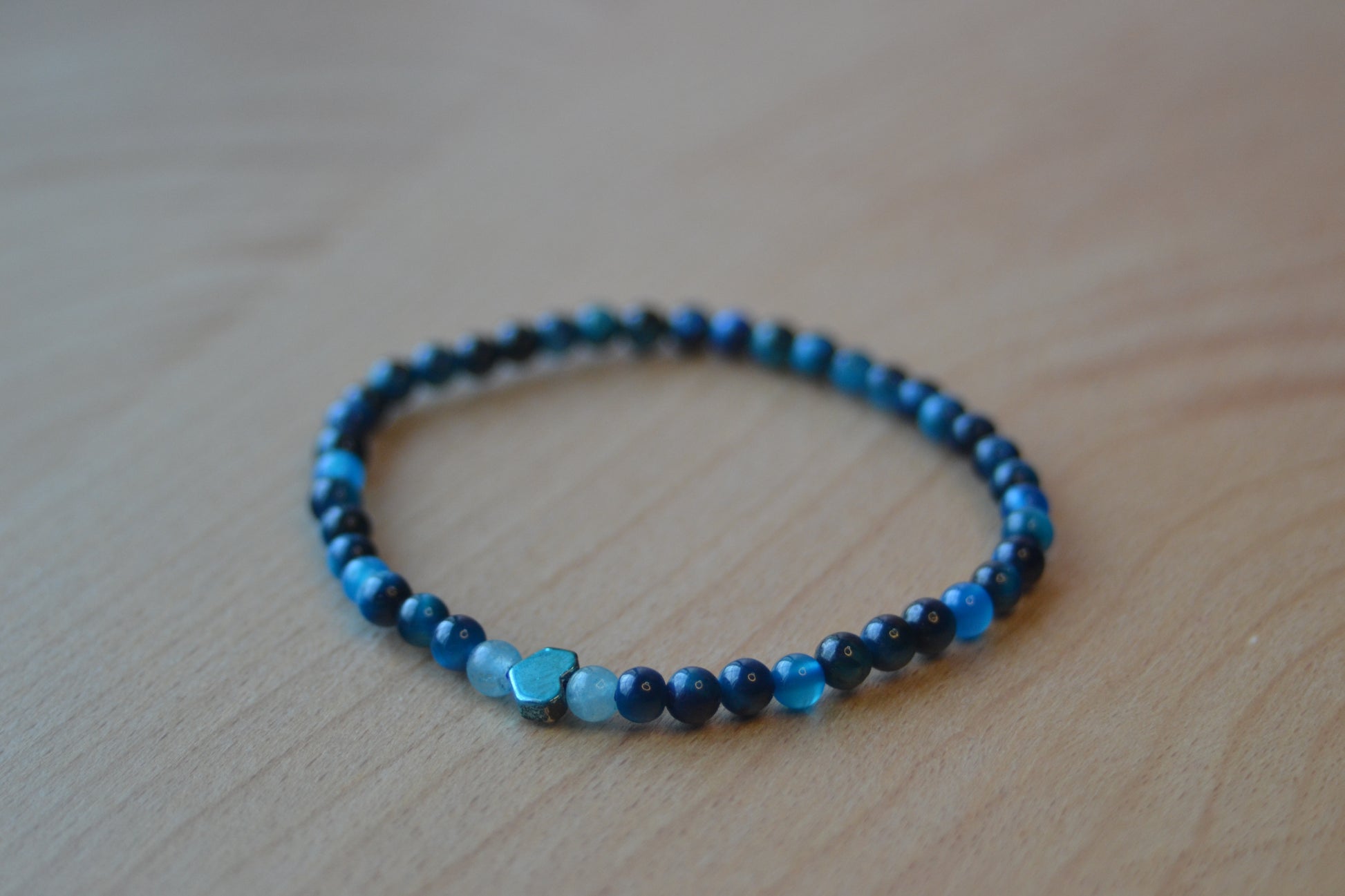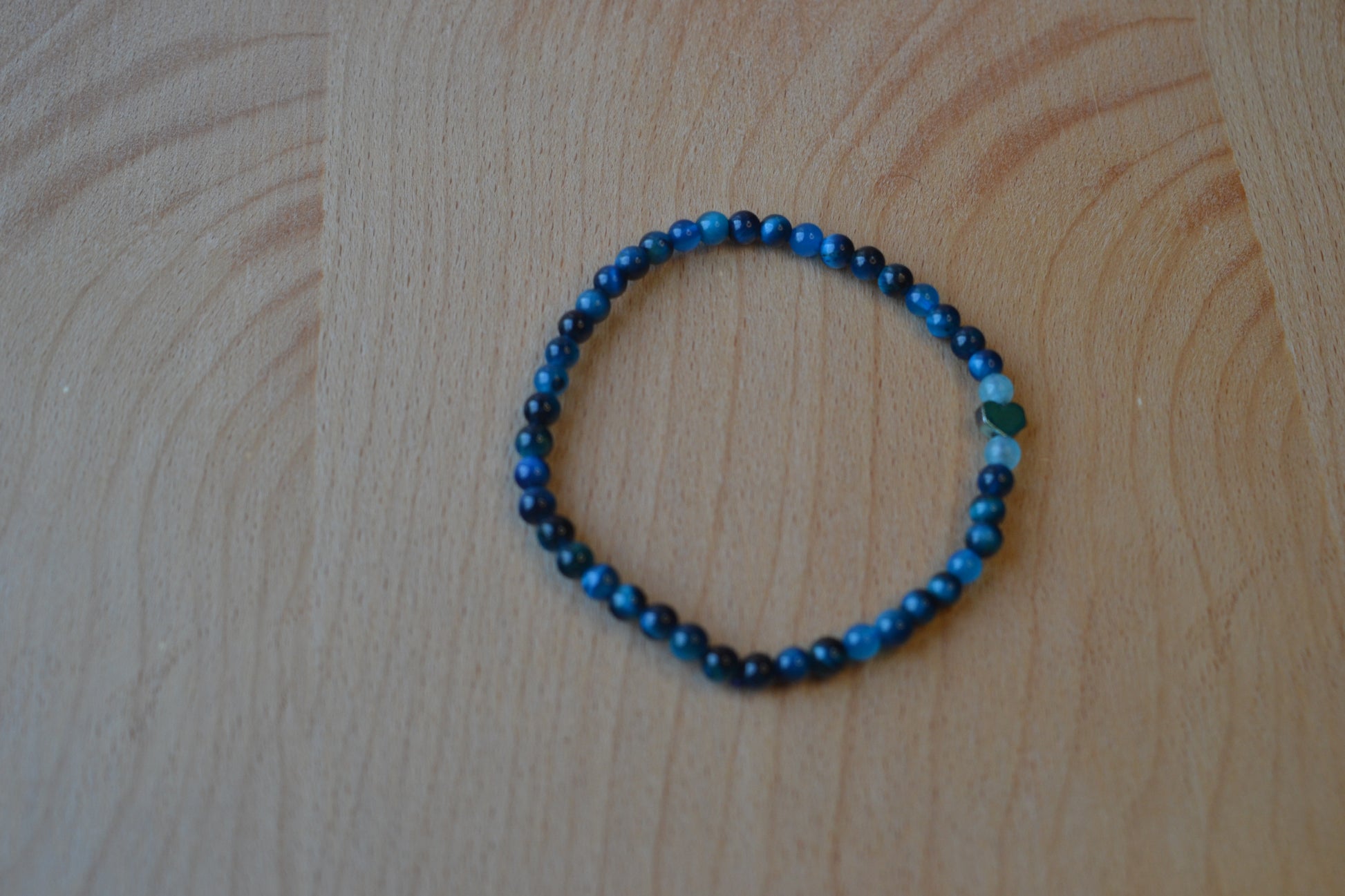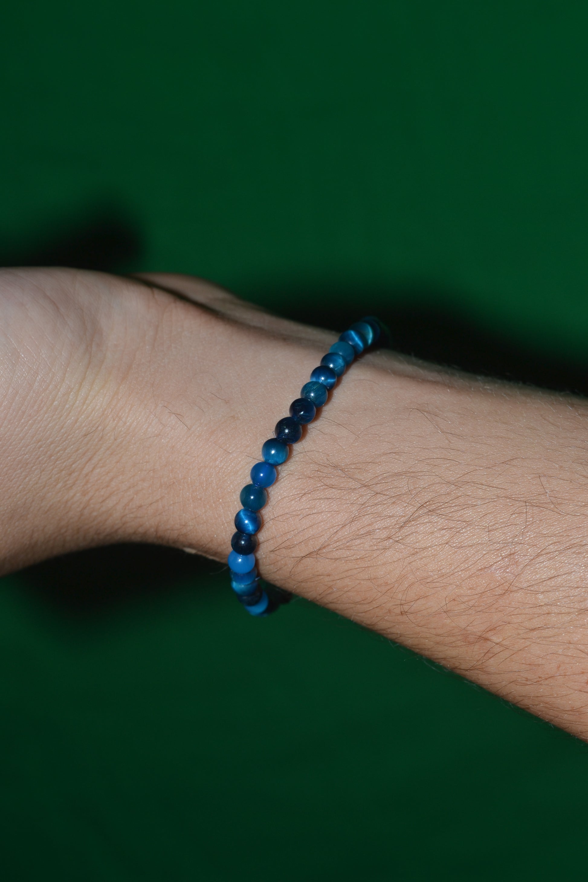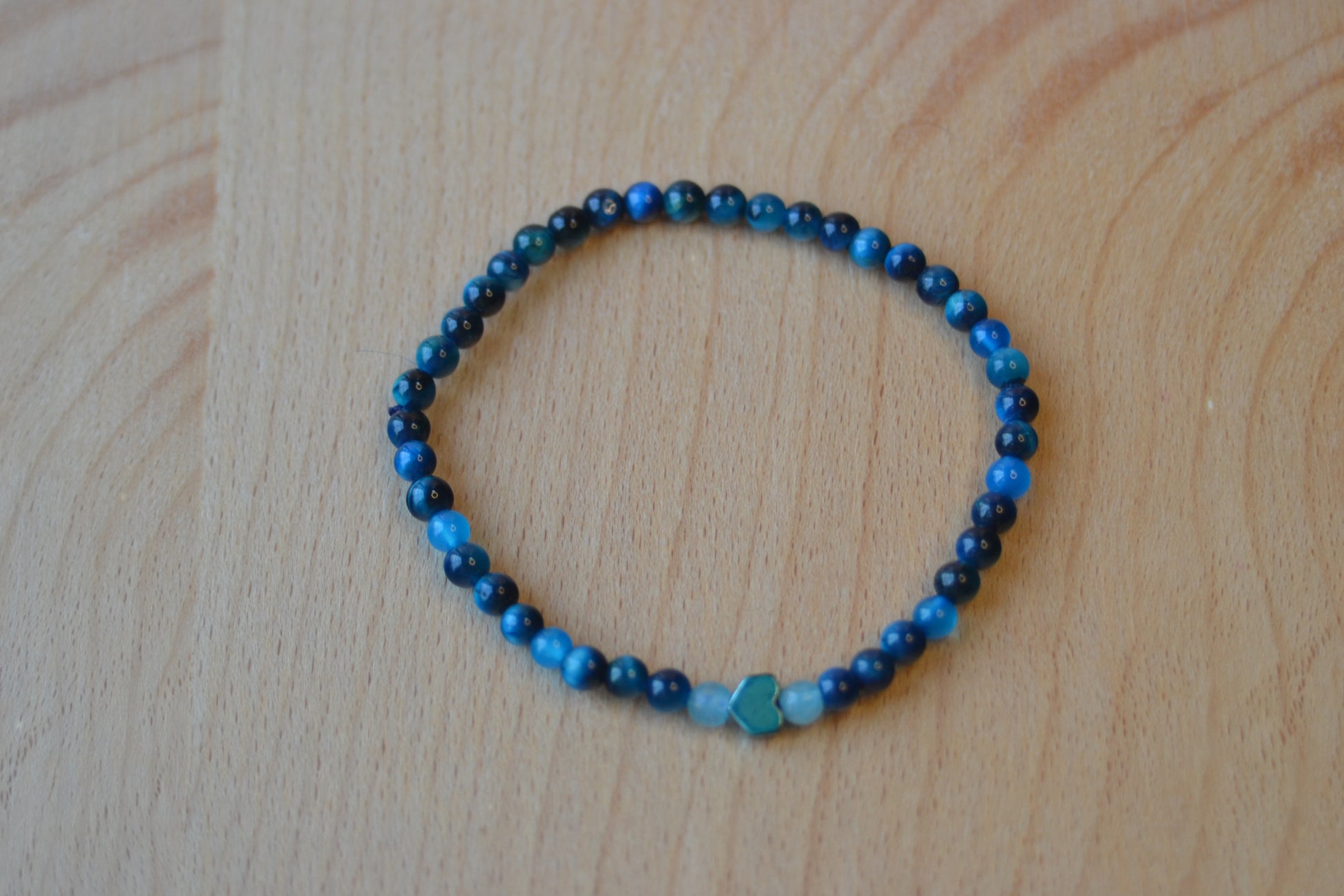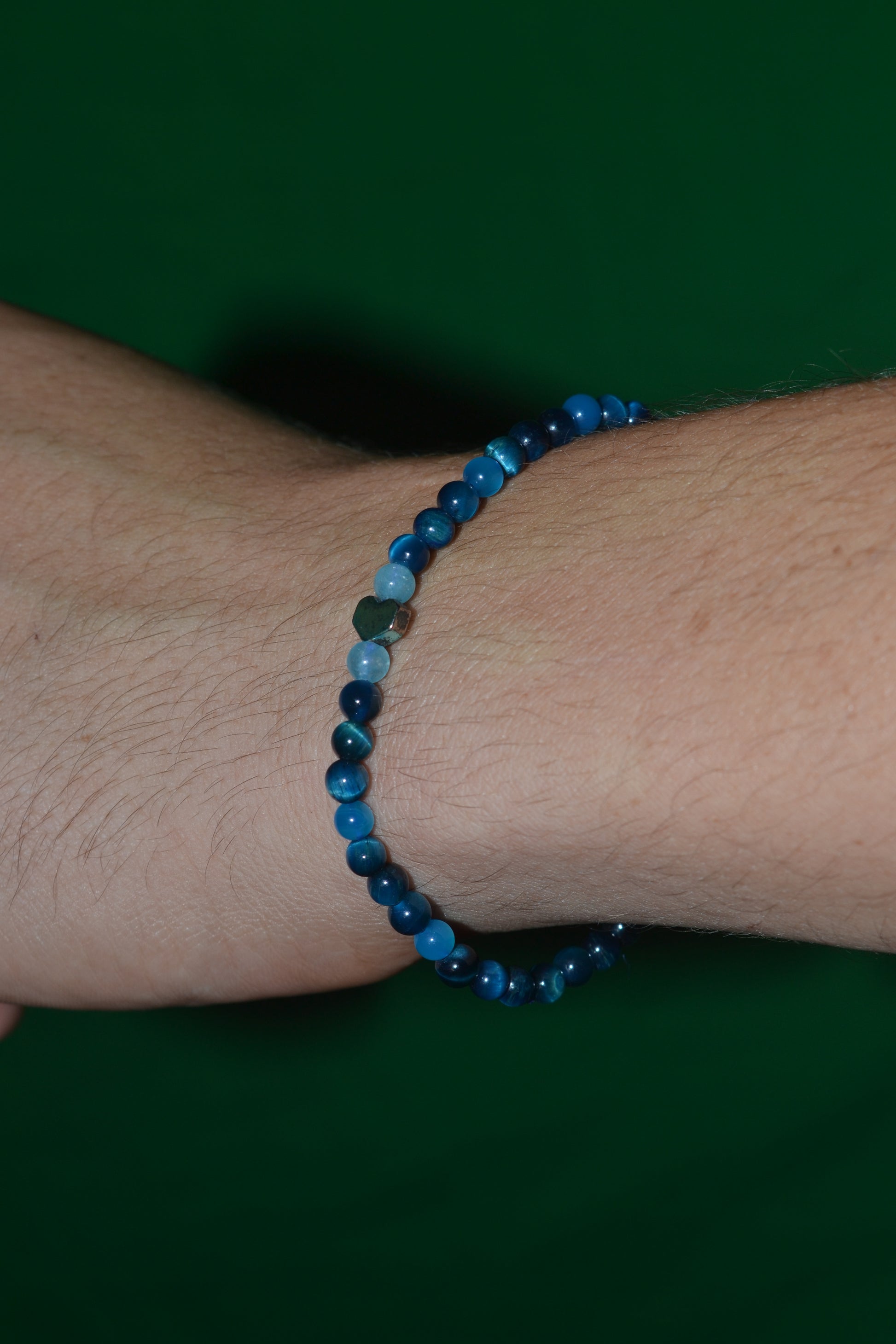This sleek, minimalist bracelet features 2mm Blue Tiger’s Eye beads, known for their calm strength and protective energy. At the center sits a striking blue hematite heart, flanked by two gentle aquamarine beads, symbolizing balance between fierce focus and emotional flow.