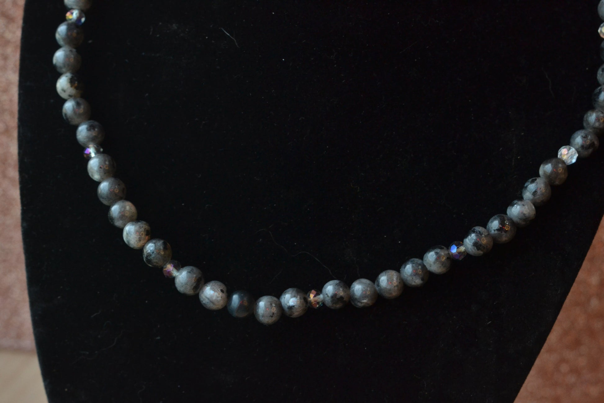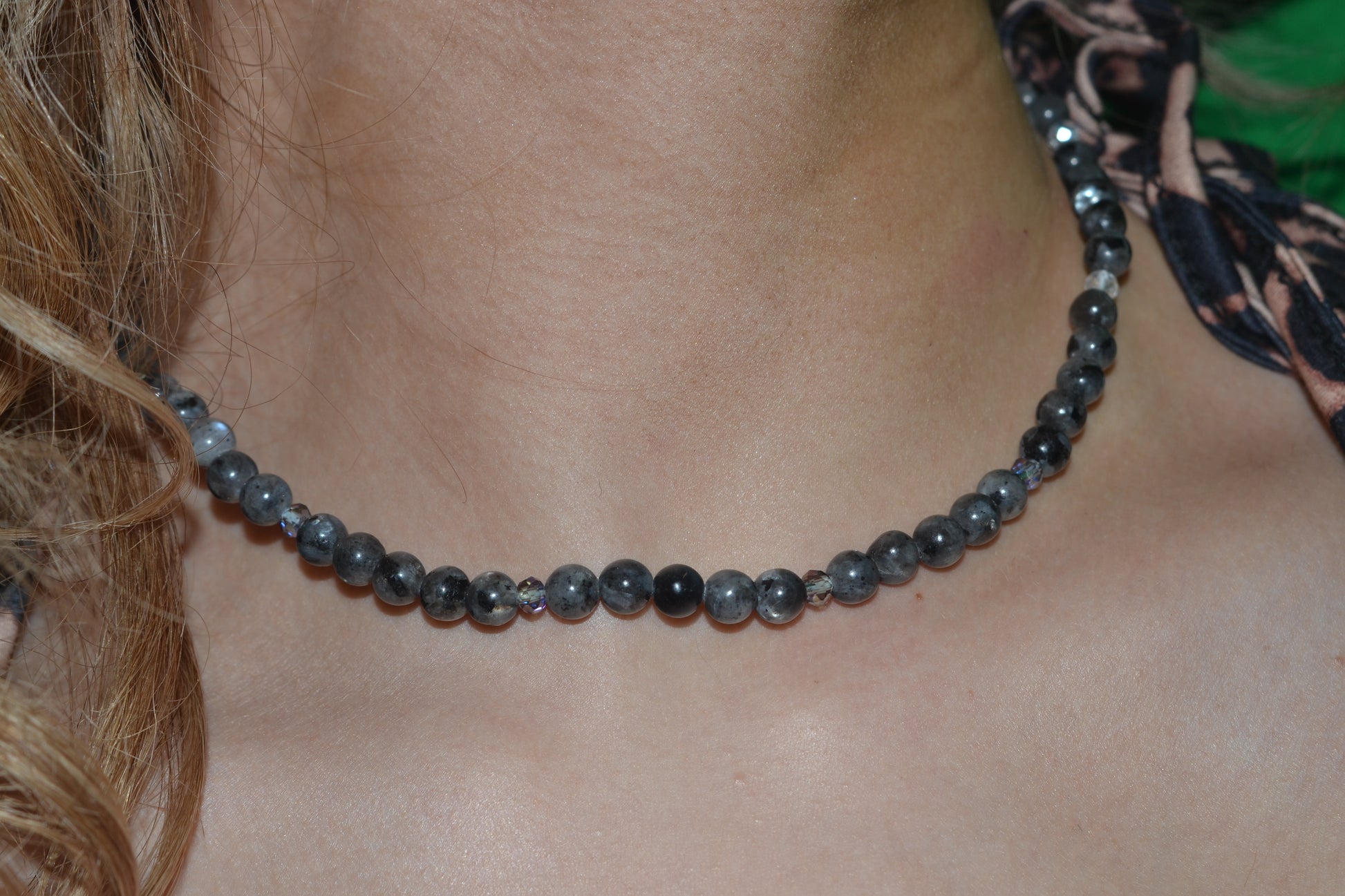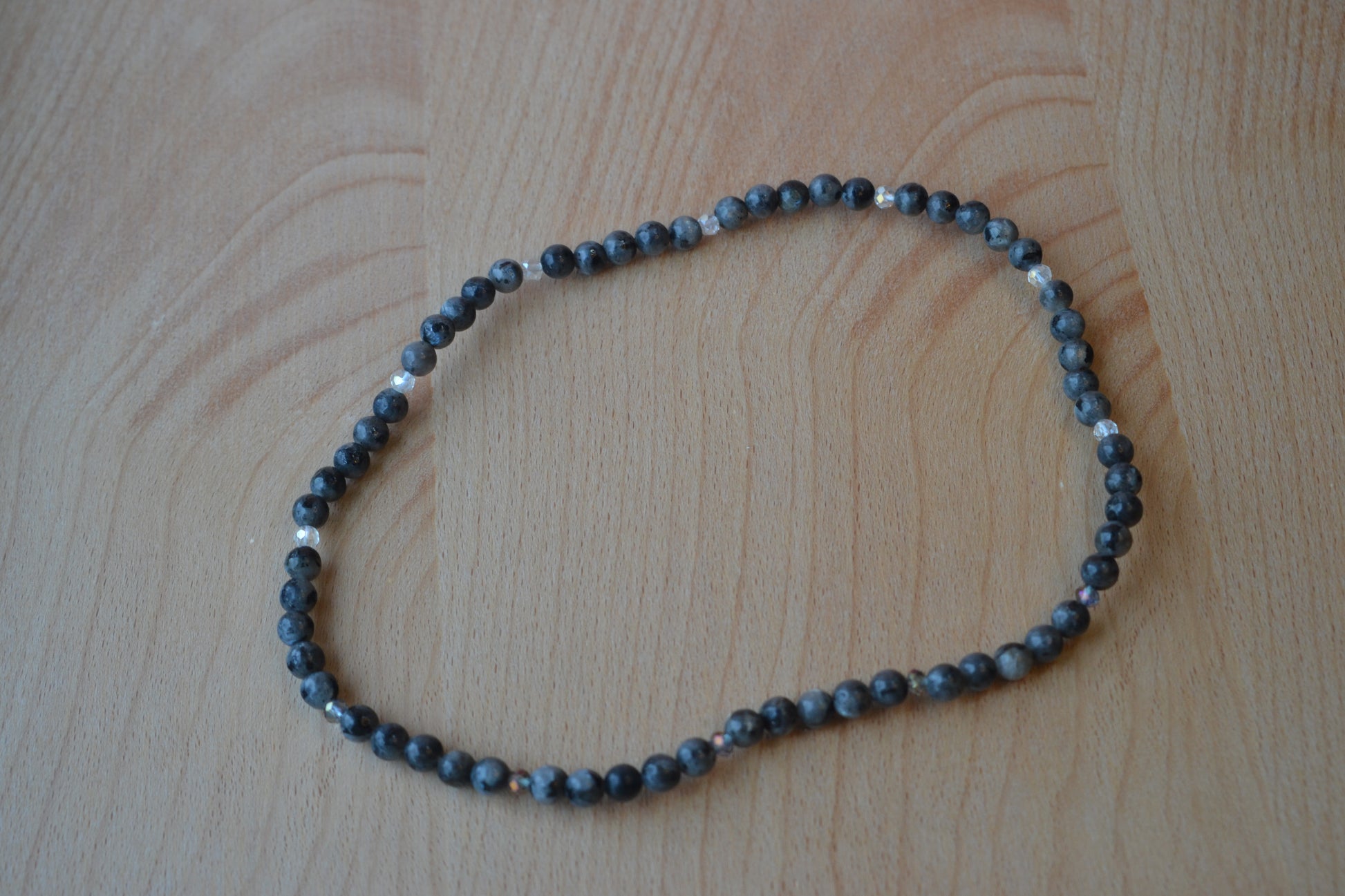 This elegant and mystic 16-inch choker is crafted with sleek 4mm grey labradorite beads, known for their flashes of rainbow fire and deep intuitive energy. Accented with radiant rainbow and clear crystal spacers, this piece dances subtly in the light — a perfect companion for tuning into your intuition while remaining grounded and clear.