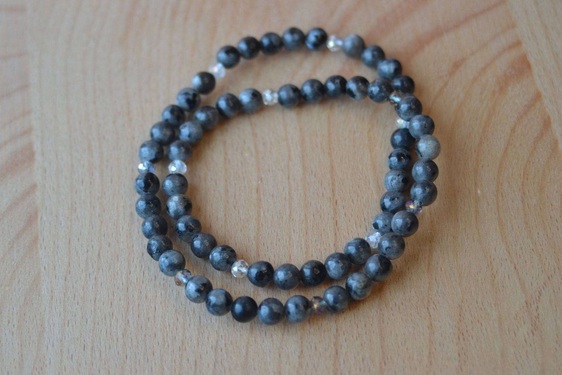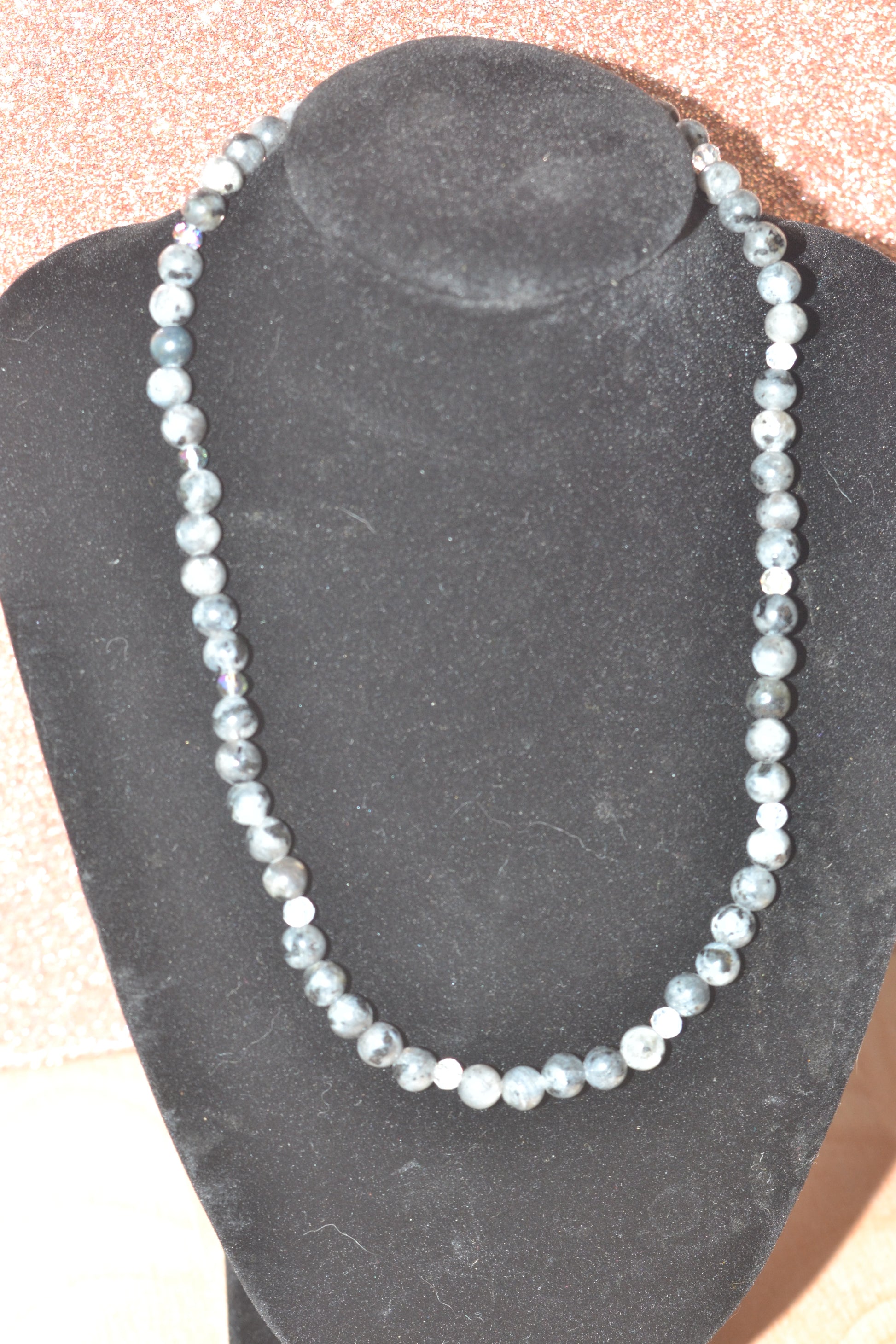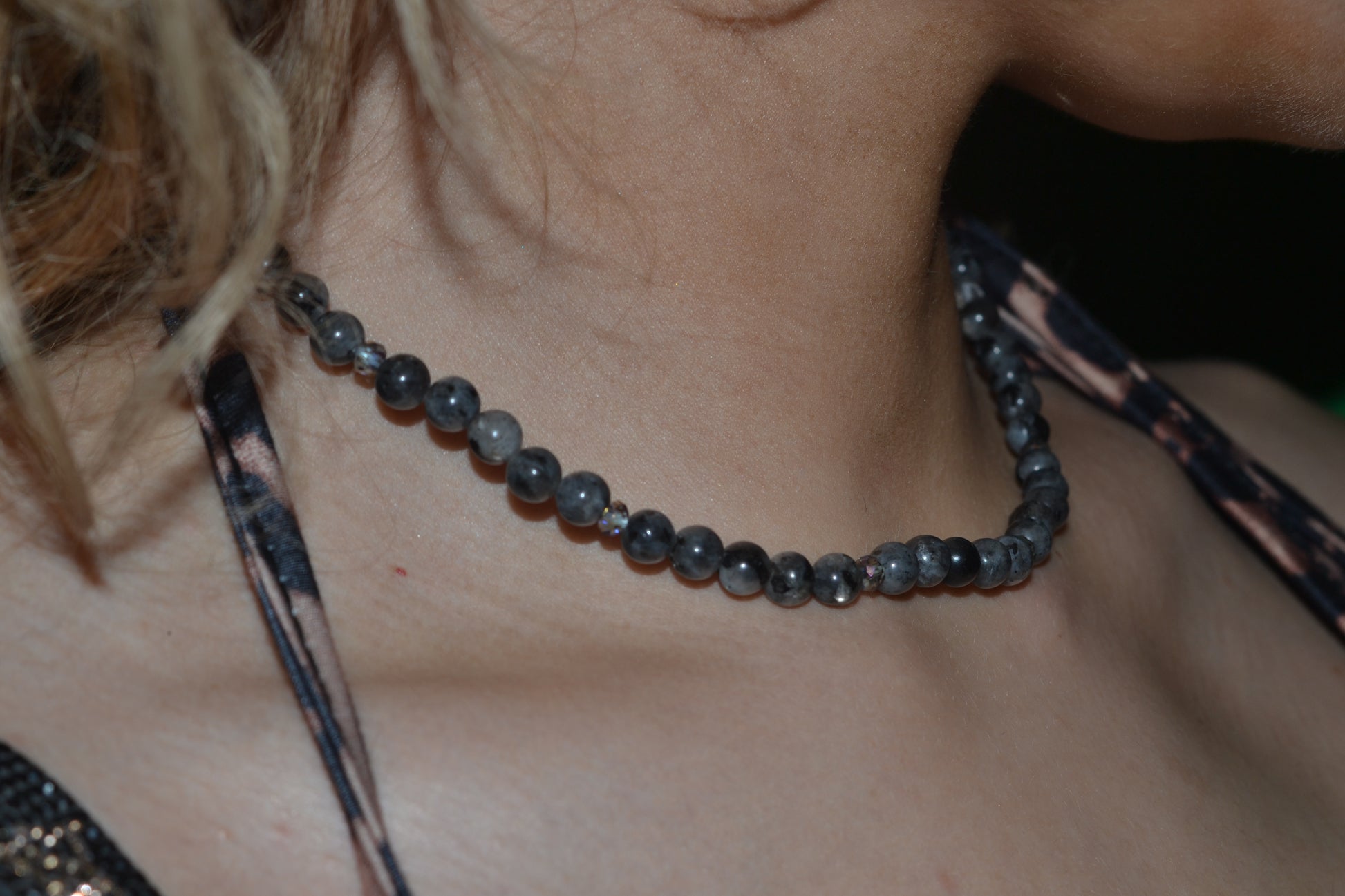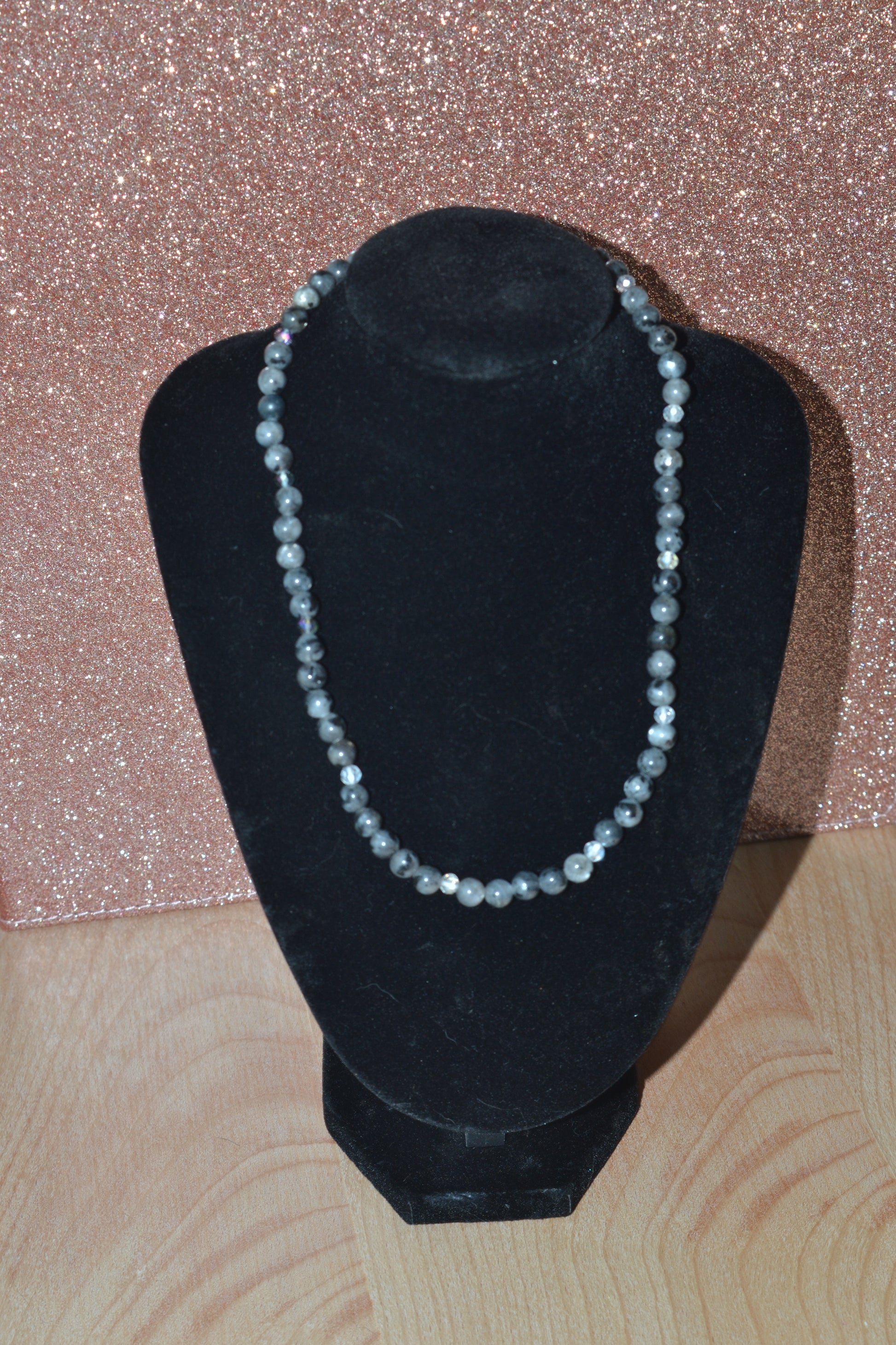 This elegant and mystic 16-inch choker is crafted with sleek 4mm grey labradorite beads, known for their flashes of rainbow fire and deep intuitive energy. Accented with radiant rainbow and clear crystal spacers, this piece dances subtly in the light — a perfect companion for tuning into your intuition while remaining grounded and clear.