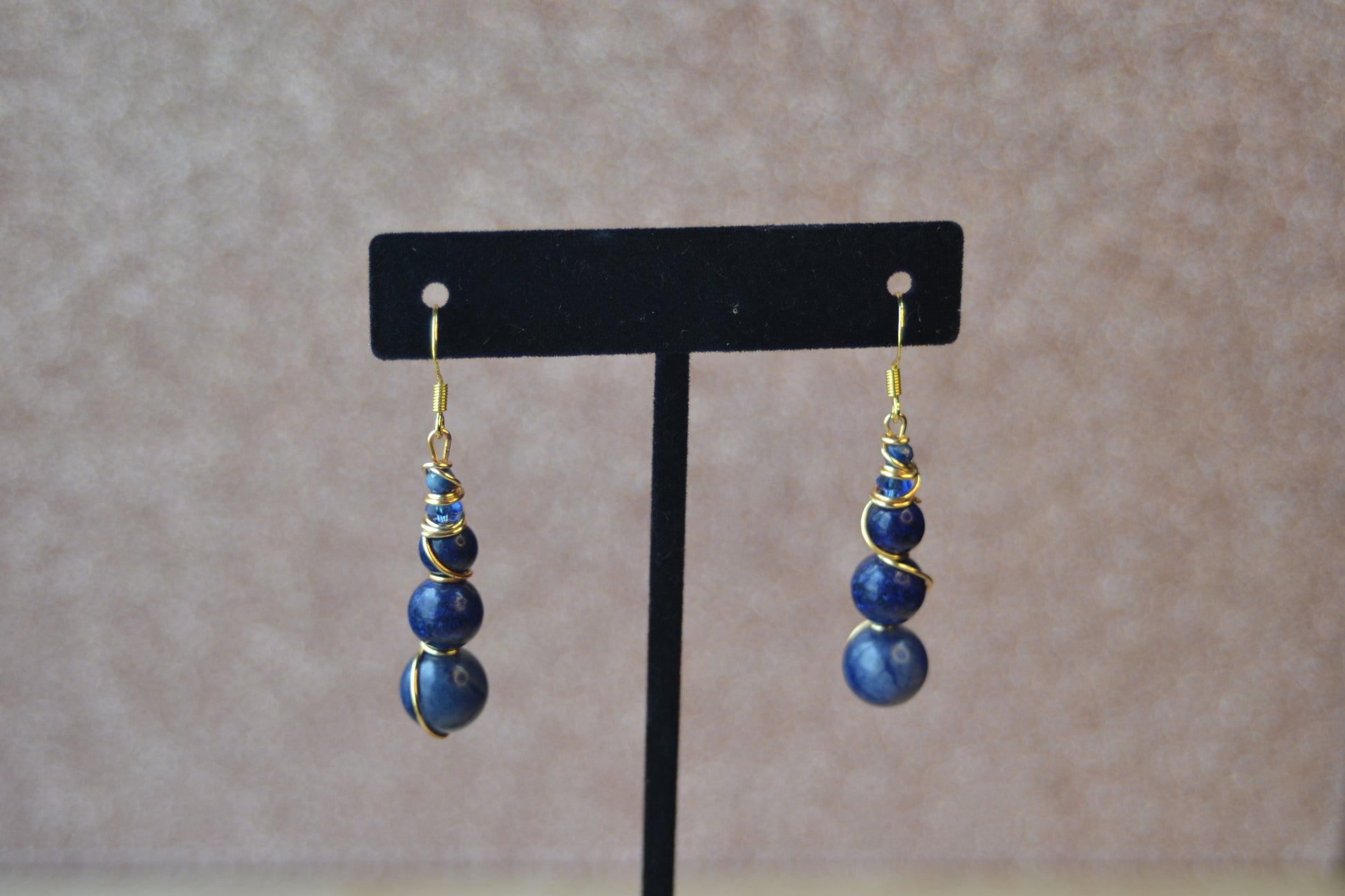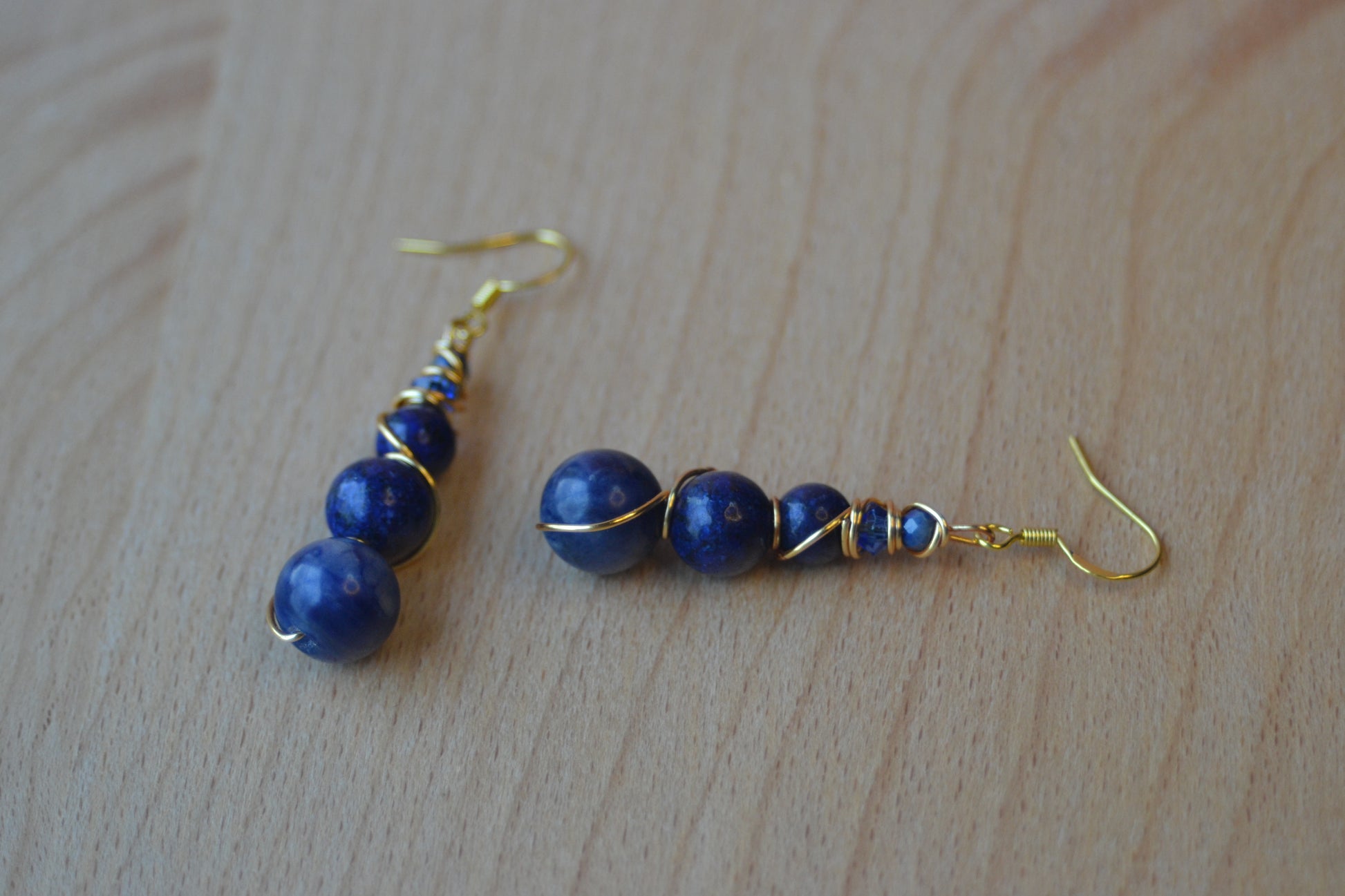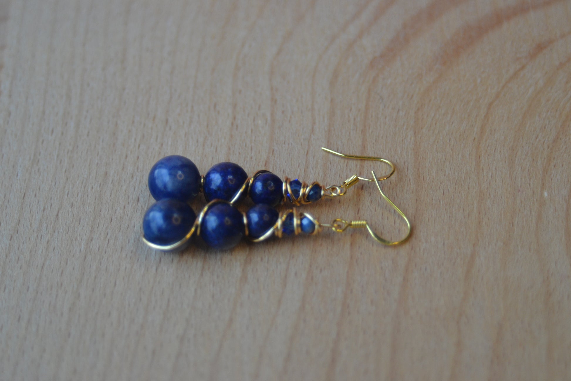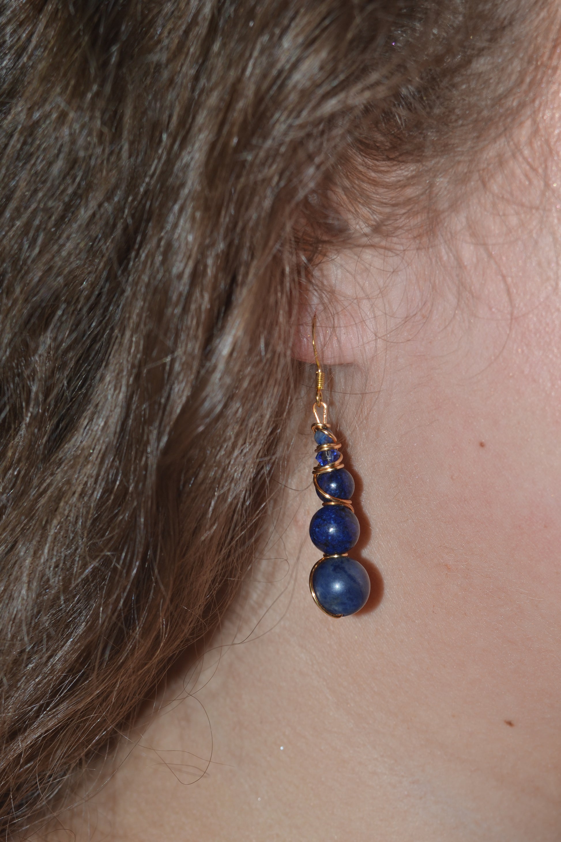 Step into your truth with this handcrafted lapis lazuli bracelet and earring set, designed to empower your voice and intuition. The bracelet is made with 6mm and 4mm lapis beads, offering a bold yet elegant statement on the wrist. The matching 2-inch earrings feature five delicate tiers of rich blue lapis, wrapped in gold-plated silver wire and finished with gold-plated sterling silver hooks for comfort and luxury.