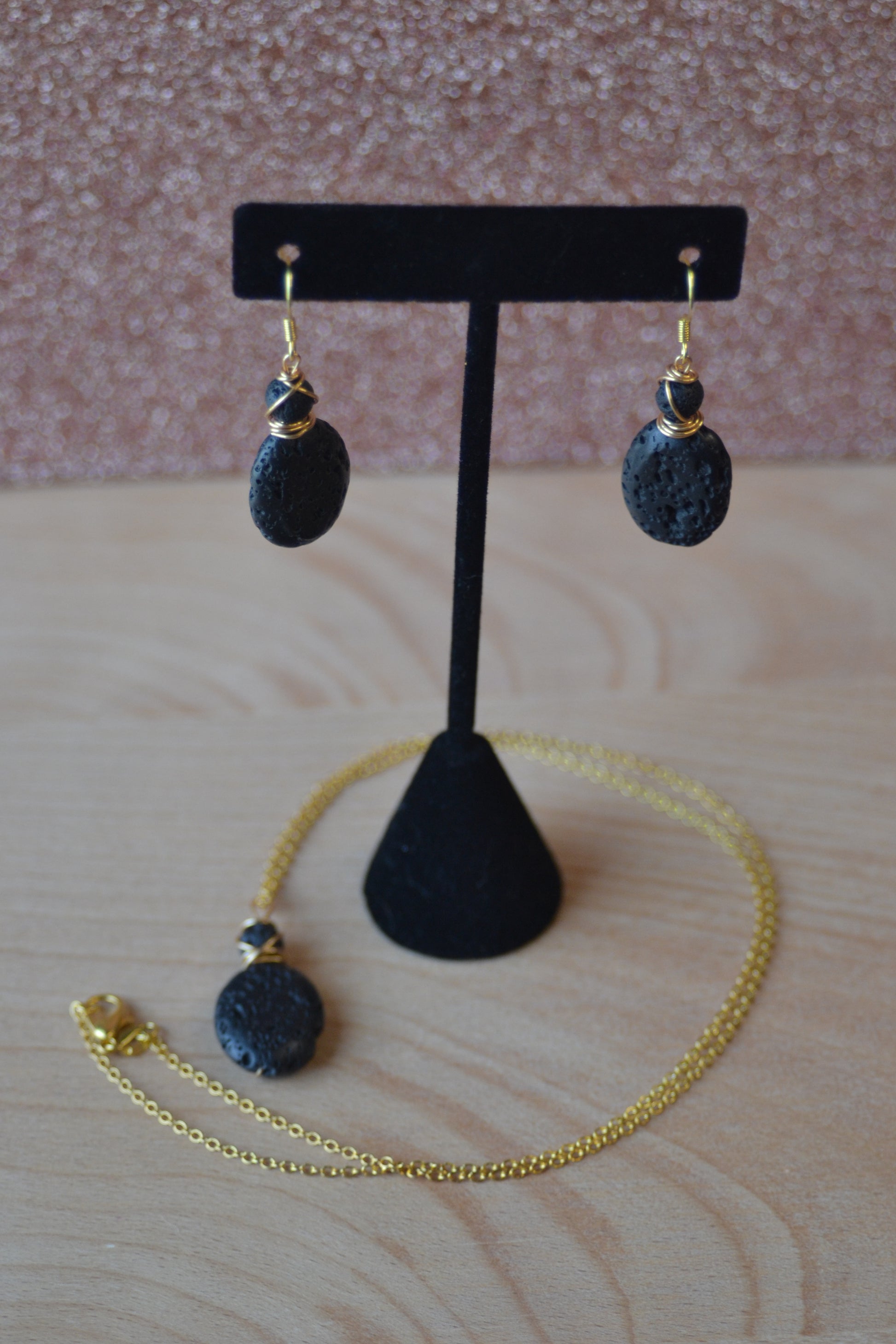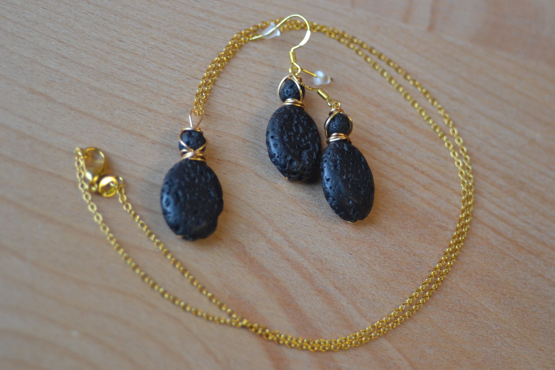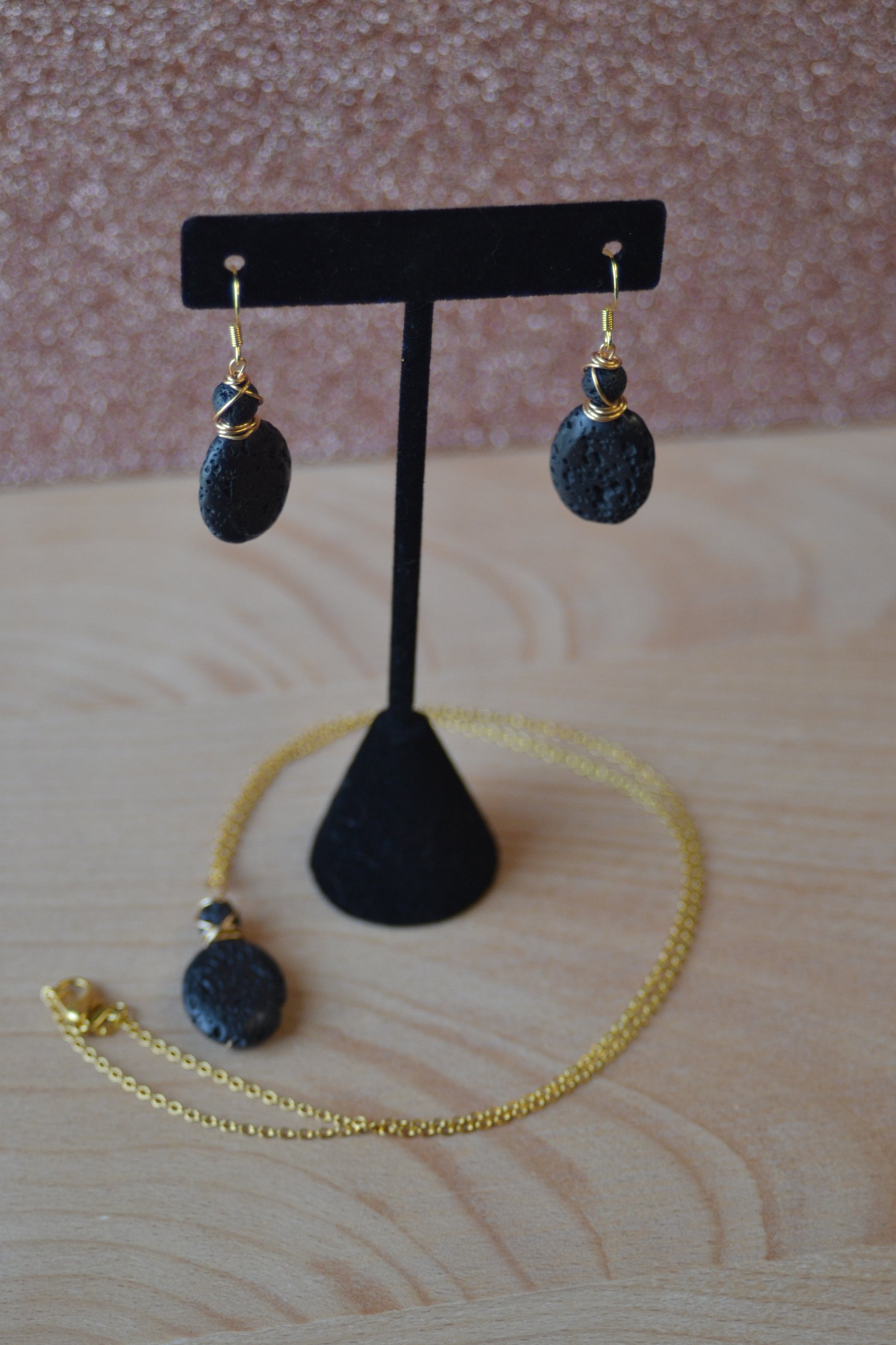 Raw power meets timeless elegance in this lava stone and gold set. The 20-inch gold-plated sterling silver chain necklace features an oval 1-inch black lava stone pendant, radiating natural strength and grounding energy. Matching earrings mirror the design with two tiers — a 6mm lava stone above a bold oval bead — double wire wrapped in gold-plated copper and finished with gold-plated sterling silver hooks. At 2 inches long, they bring a perfect balance of statement and sophistication.