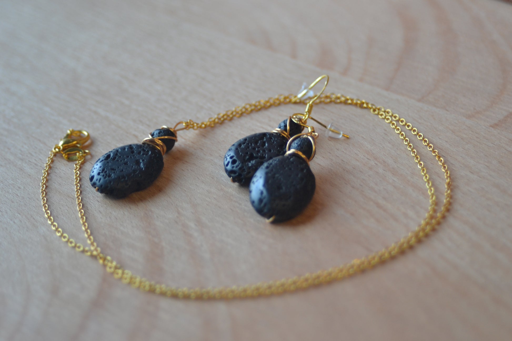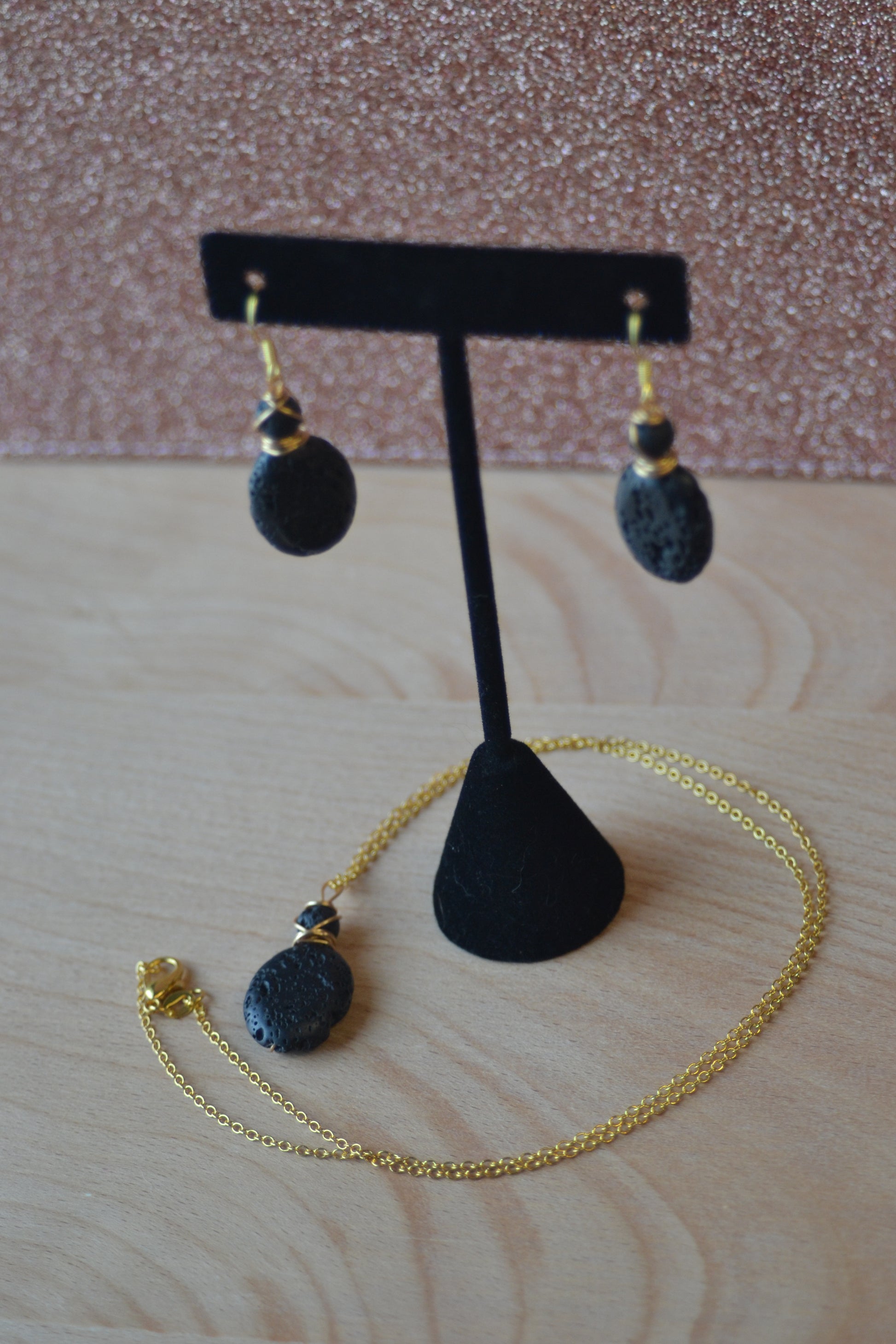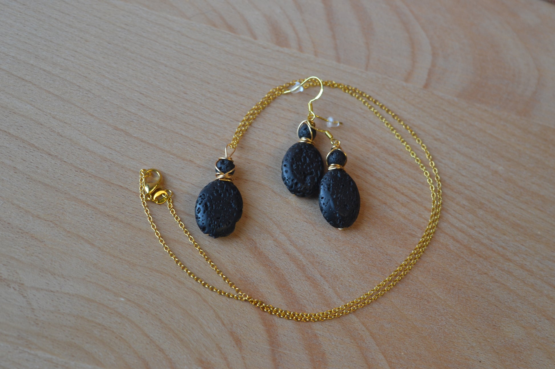 Raw power meets timeless elegance in this lava stone and gold set. The 20-inch gold-plated sterling silver chain necklace features an oval 1-inch black lava stone pendant, radiating natural strength and grounding energy. Matching earrings mirror the design with two tiers — a 6mm lava stone above a bold oval bead — double wire wrapped in gold-plated copper and finished with gold-plated sterling silver hooks. At 2 inches long, they bring a perfect balance of statement and sophistication.