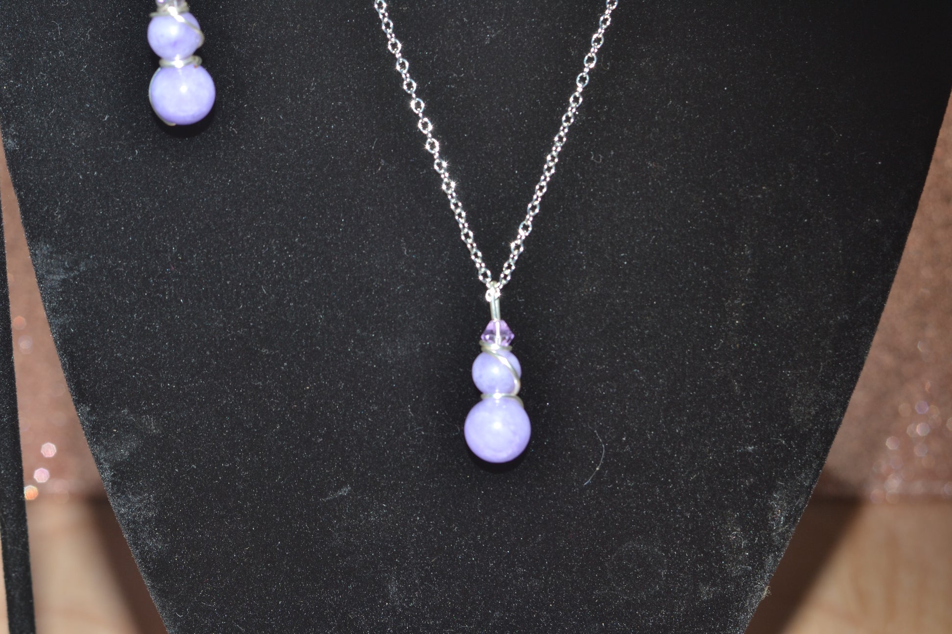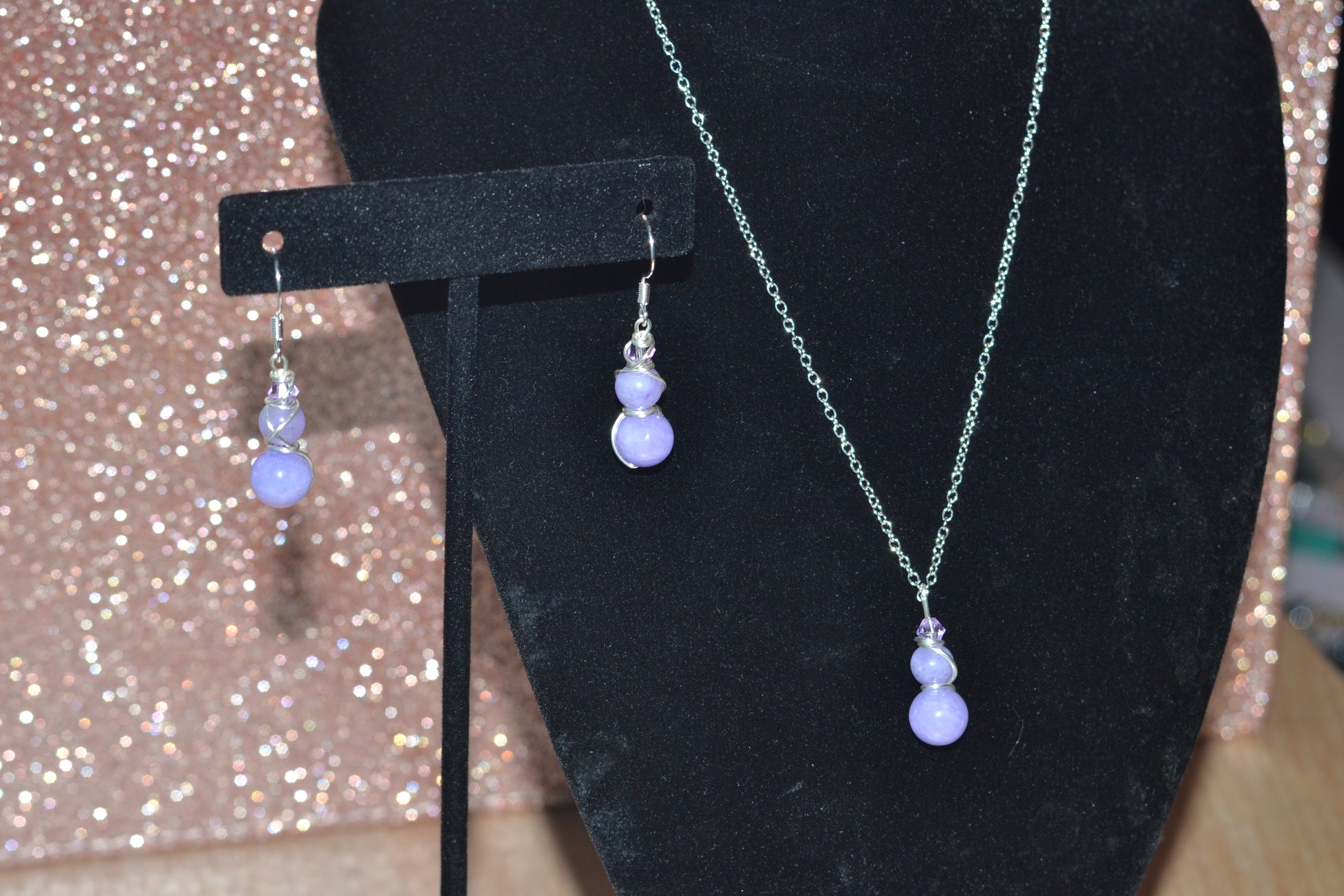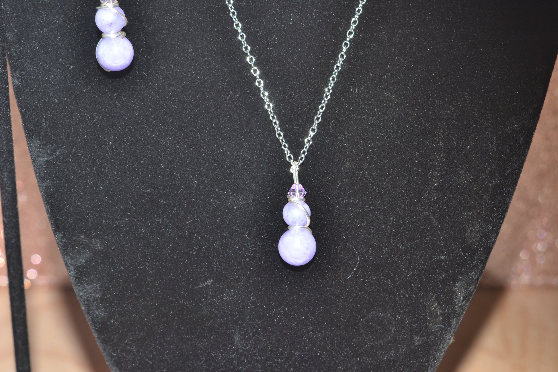 This soft, luminous jewelry set features a 20-inch 925 sterling silver chain with a 1-inch, 3-tiered lavender quartz pendant, wire-wrapped in silver. The matching 1.5-inch earrings are double wire-wrapped for added texture and intention, suspended from 925 sterling silver hooks.