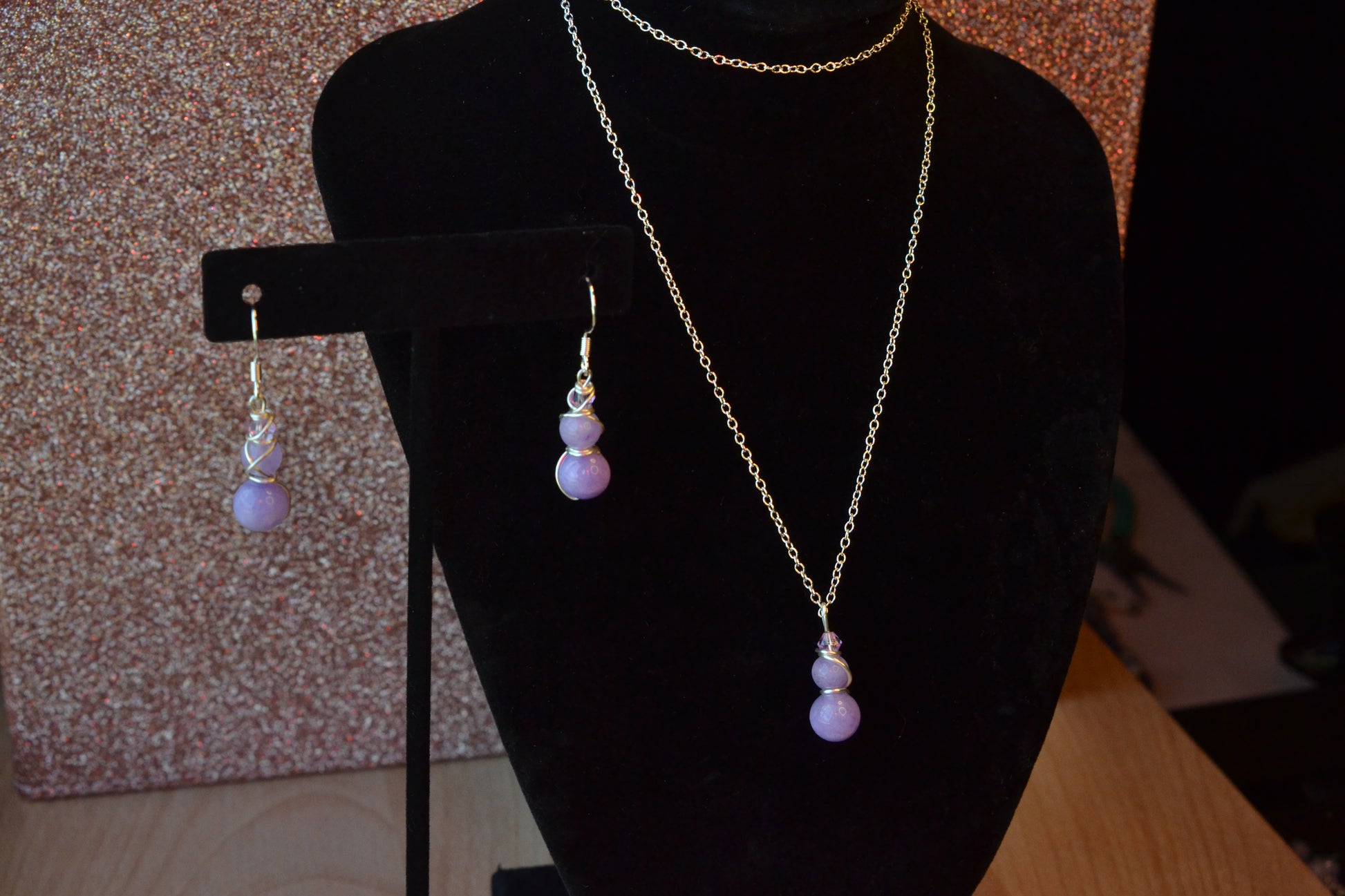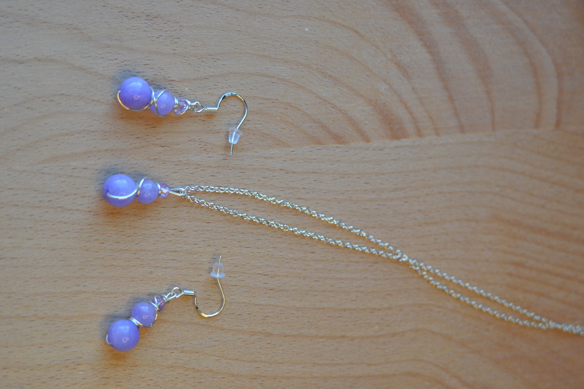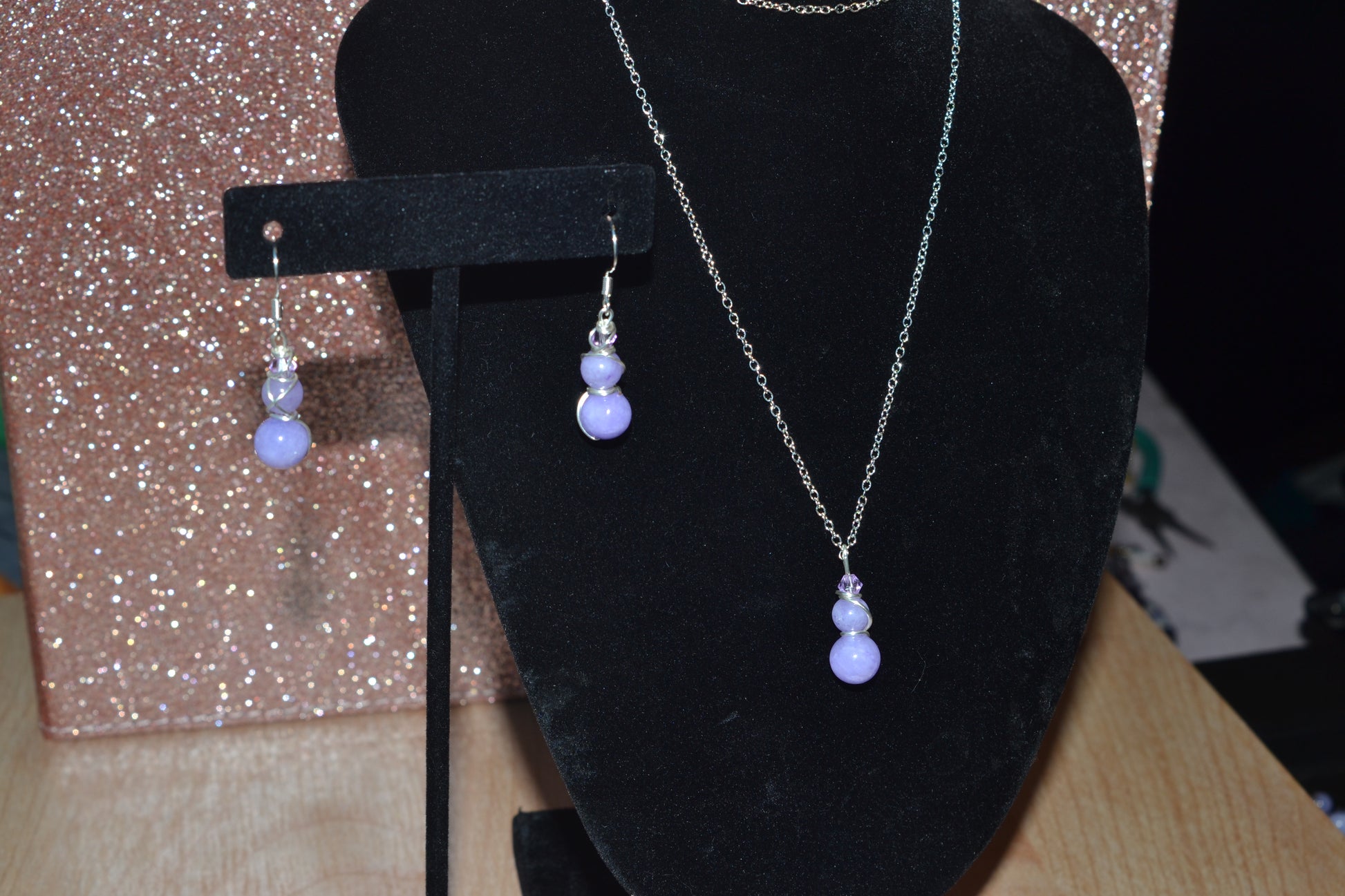 This soft, luminous jewelry set features a 20-inch 925 sterling silver chain with a 1-inch, 3-tiered lavender quartz pendant, wire-wrapped in silver. The matching 1.5-inch earrings are double wire-wrapped for added texture and intention, suspended from 925 sterling silver hooks.