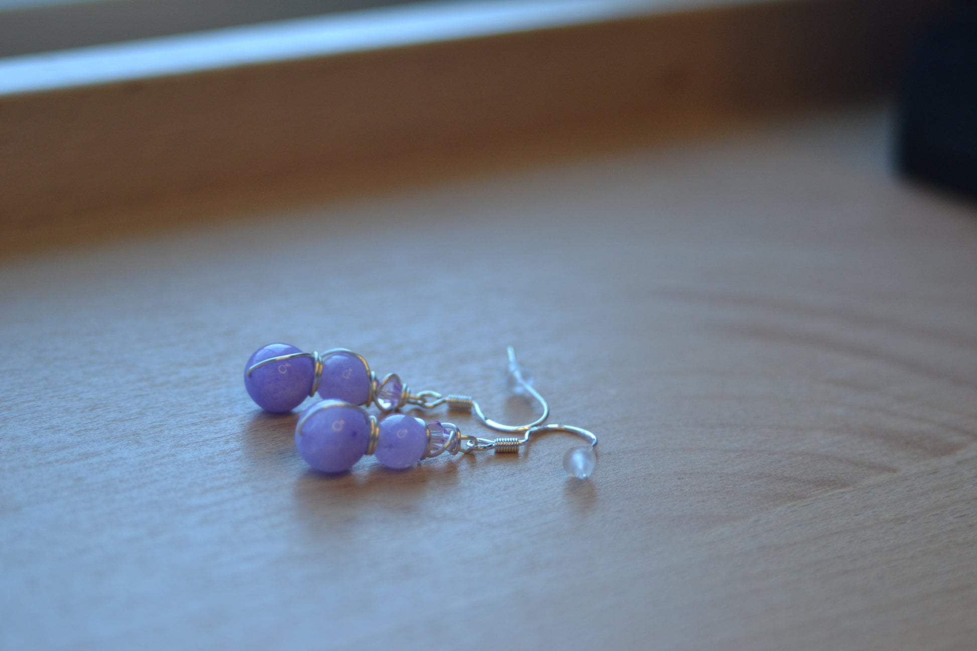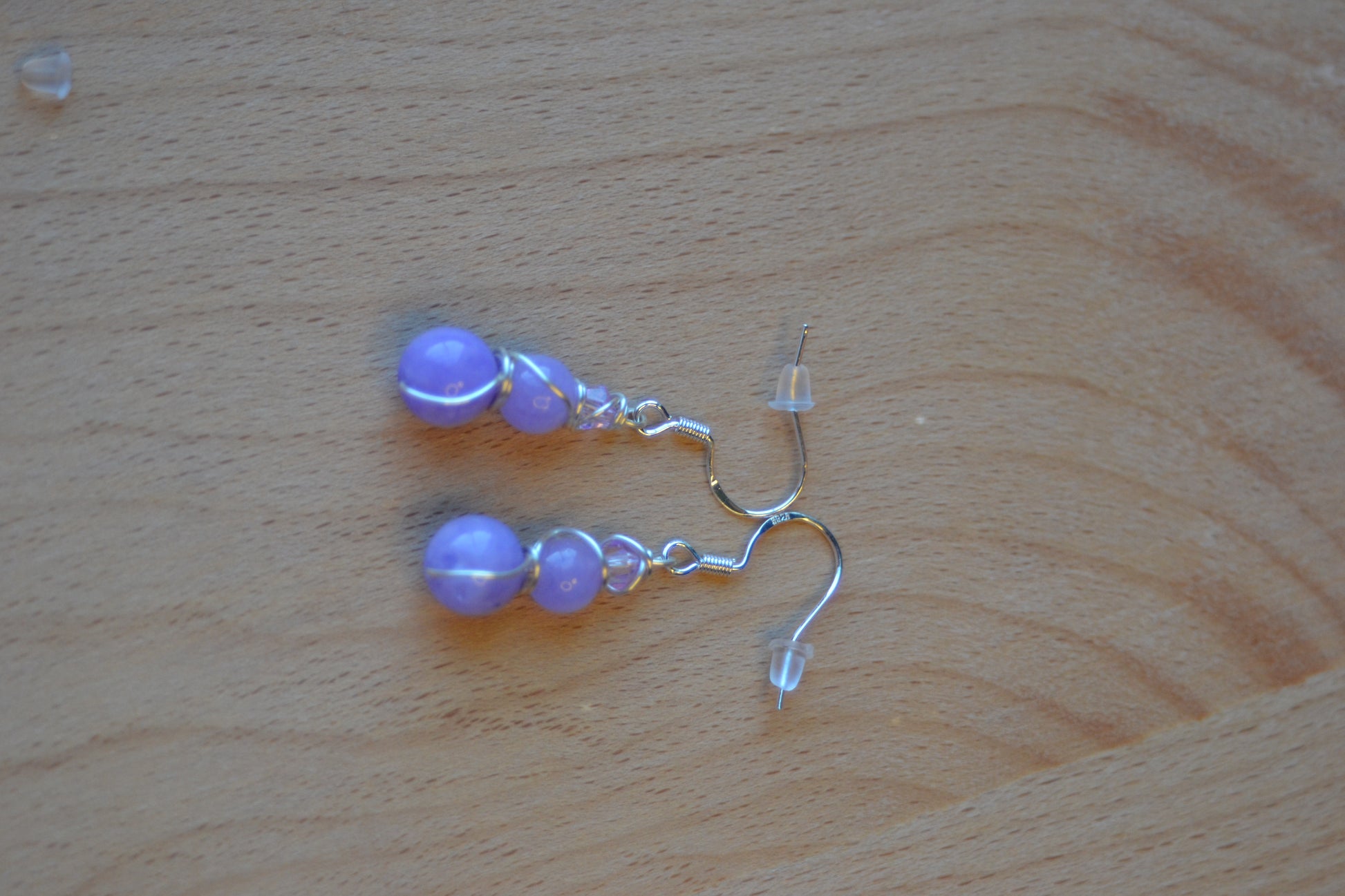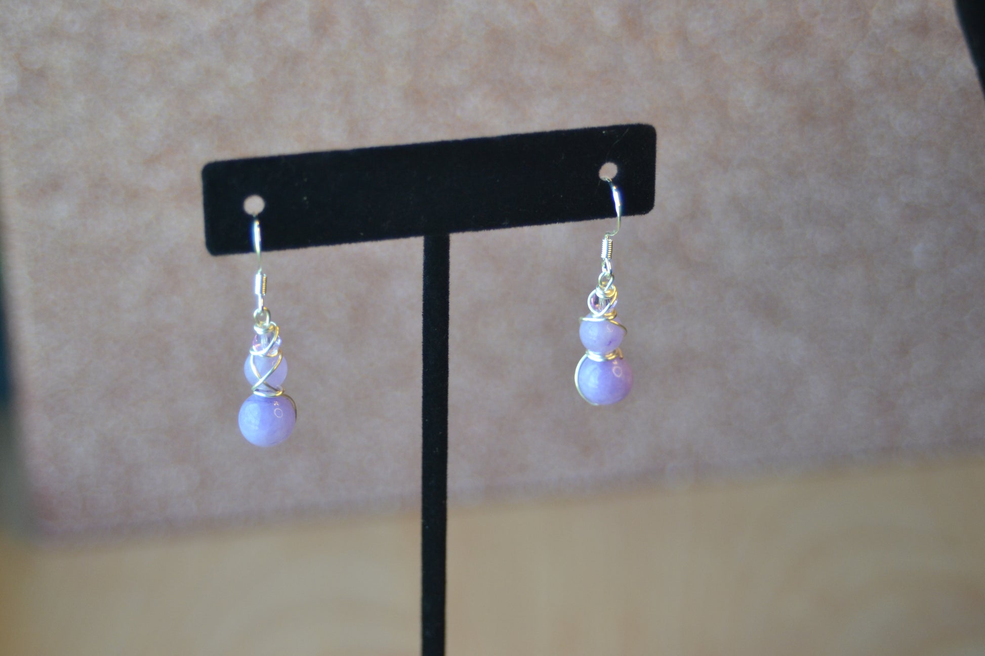 • Earrings: 1.5", double wire-wrapped lavender quartz, 925 sterling silver hooks