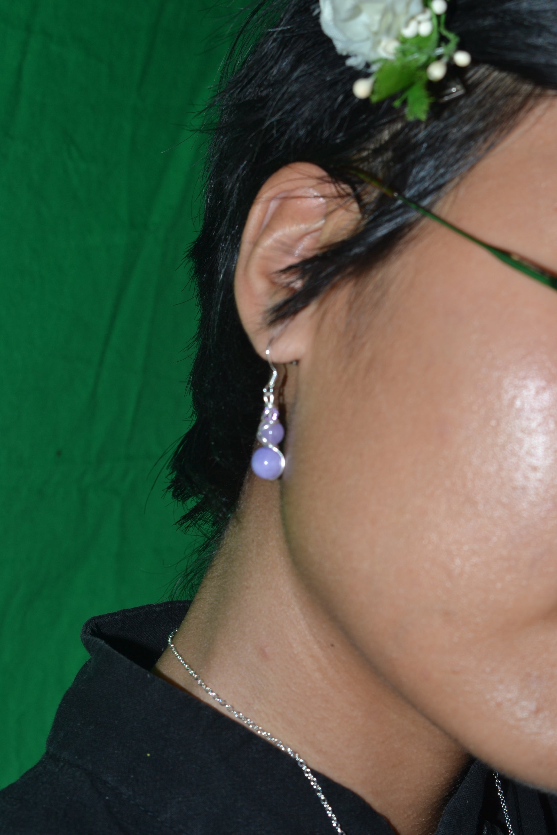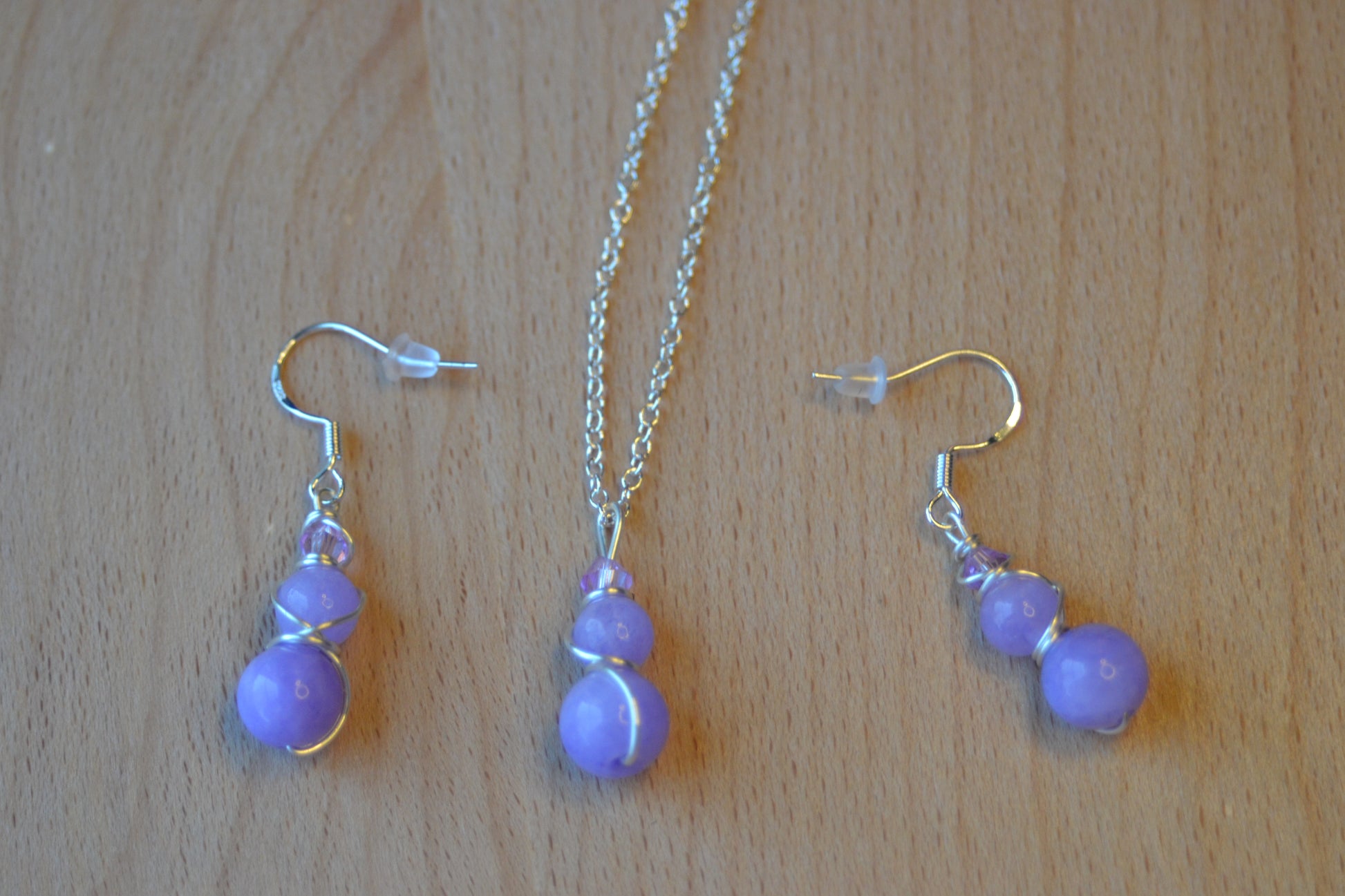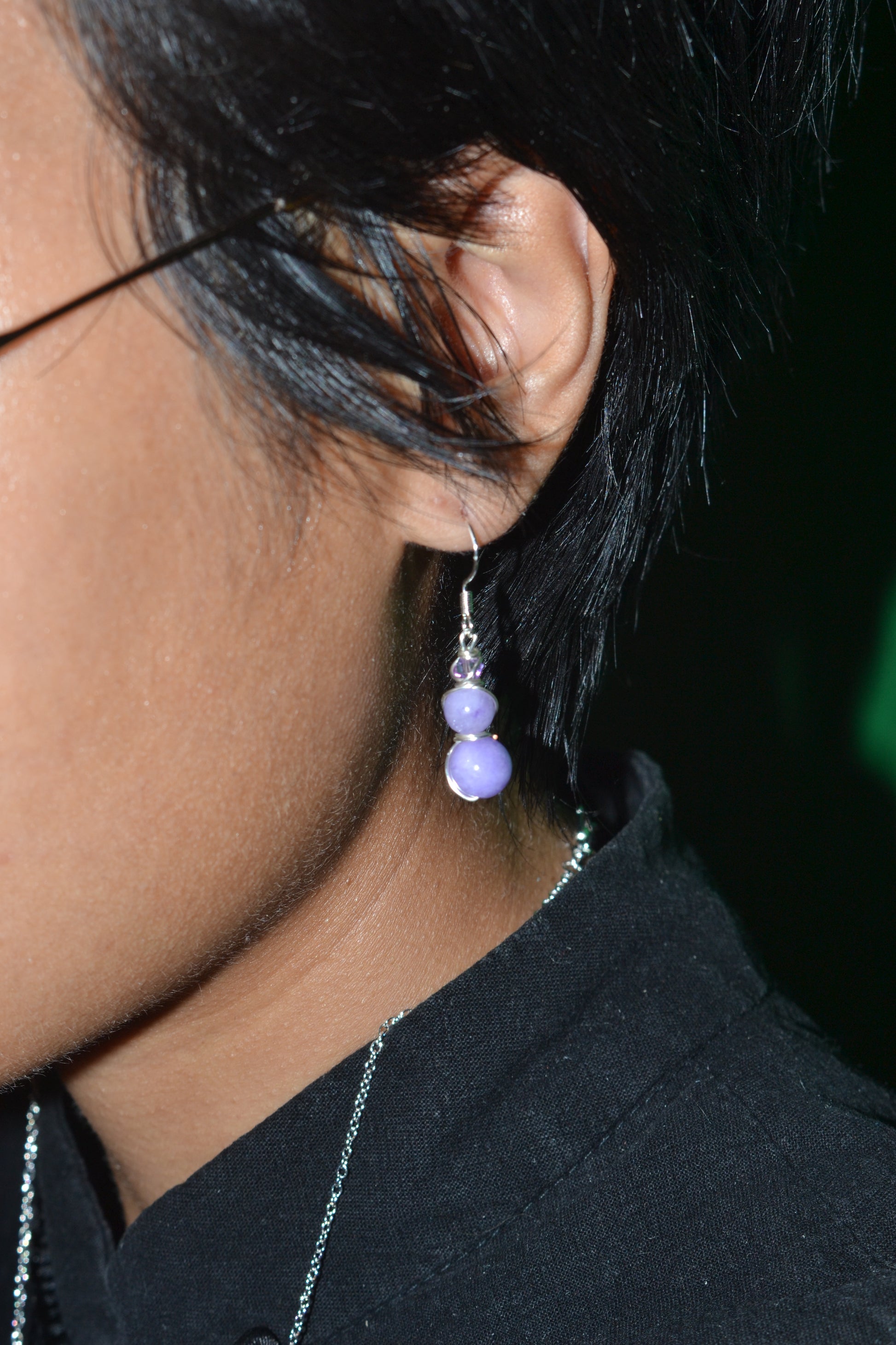 • Earrings: 1.5", double wire-wrapped lavender quartz, 925 sterling silver hooks