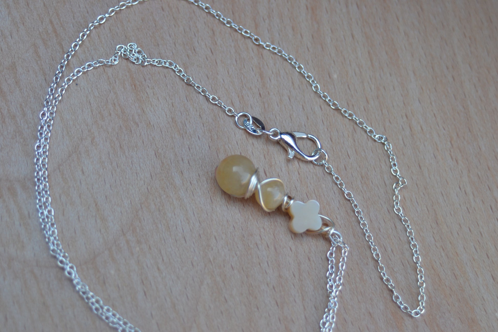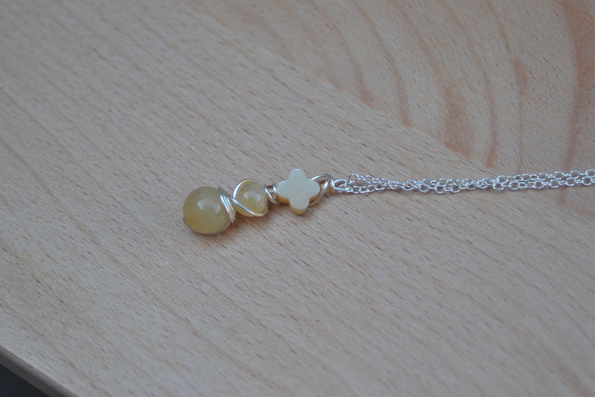 Bring warmth, positivity, and a touch of luck with this five-tier necklace. Strung on a 20-inch sterling silver chain, the pendant is double wire wrapped in silver-plated copper for durability and elegance. The tiers flow in a harmonious sequence: a 2mm Citrine, a Mother of Pearl clover, another 2mm Citrine, a 6mm Yellow Agate, and finally, an 8mm Yellow Agate.
