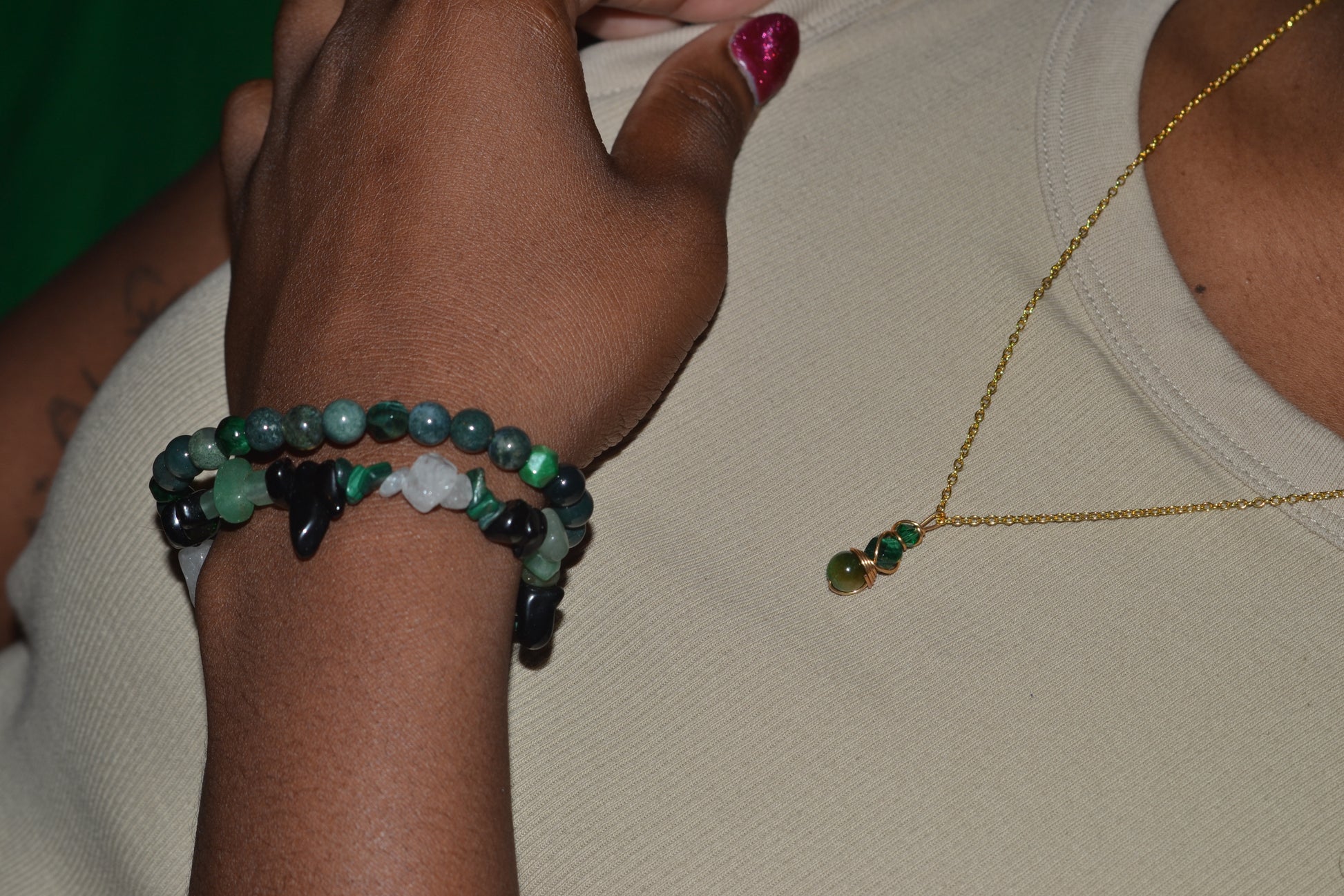 This handcrafted bracelet blends powerful stones known for masculine energy and balance. Featuring black onyx for protection and strength, clear quartz for clarity and amplification, malachite for transformation, and aventurine for growth and vitality, this piece is designed to support confidence and resilience.