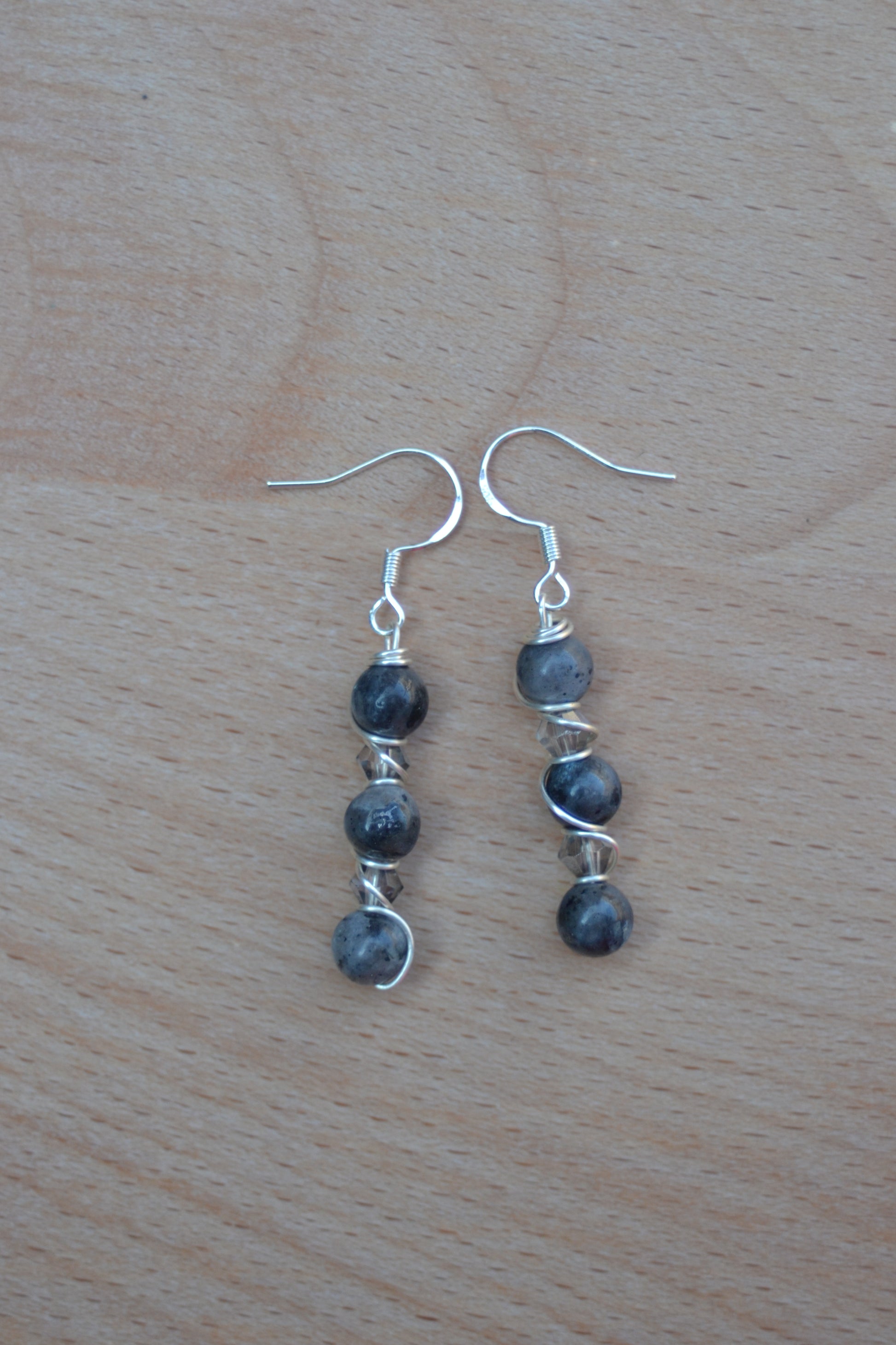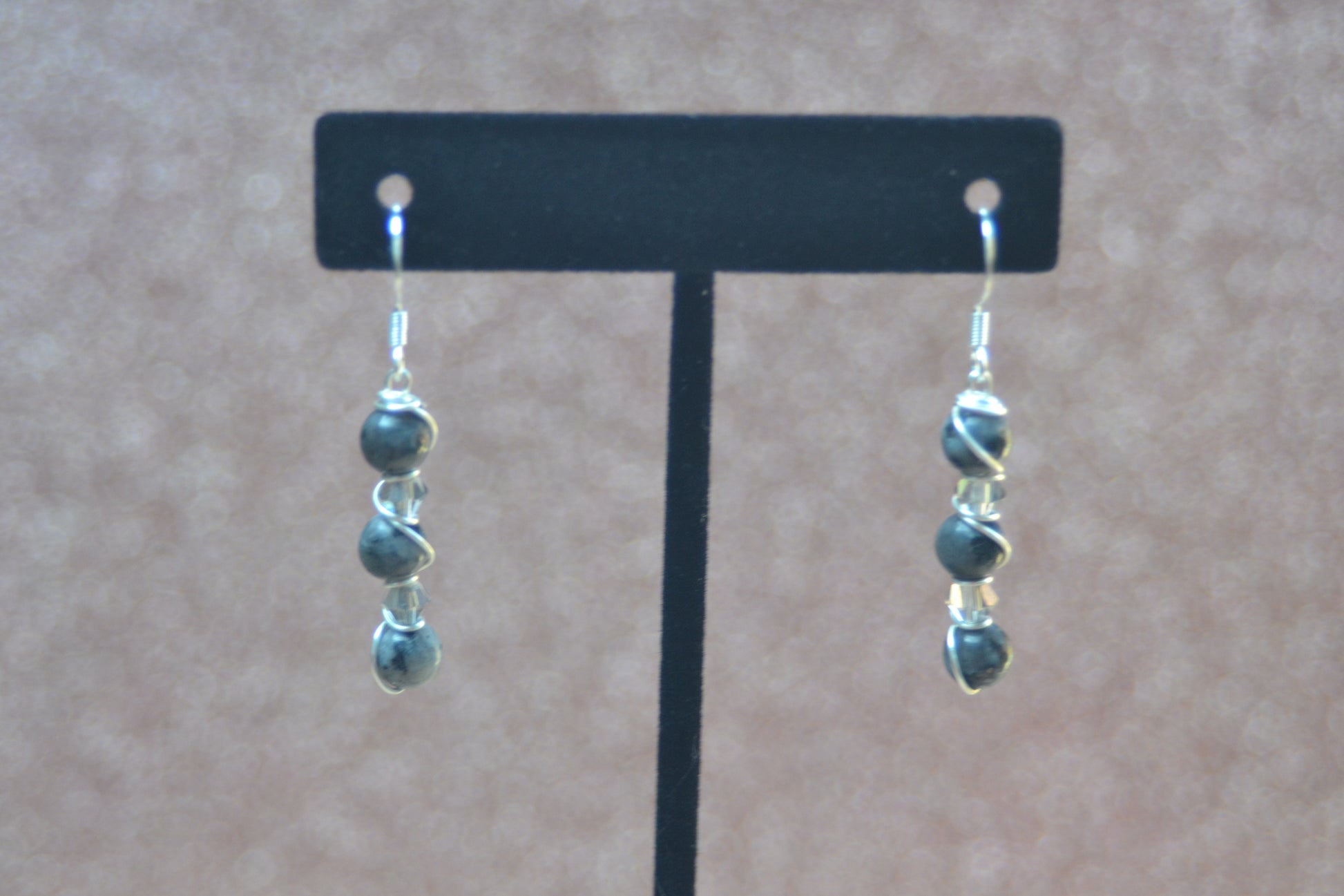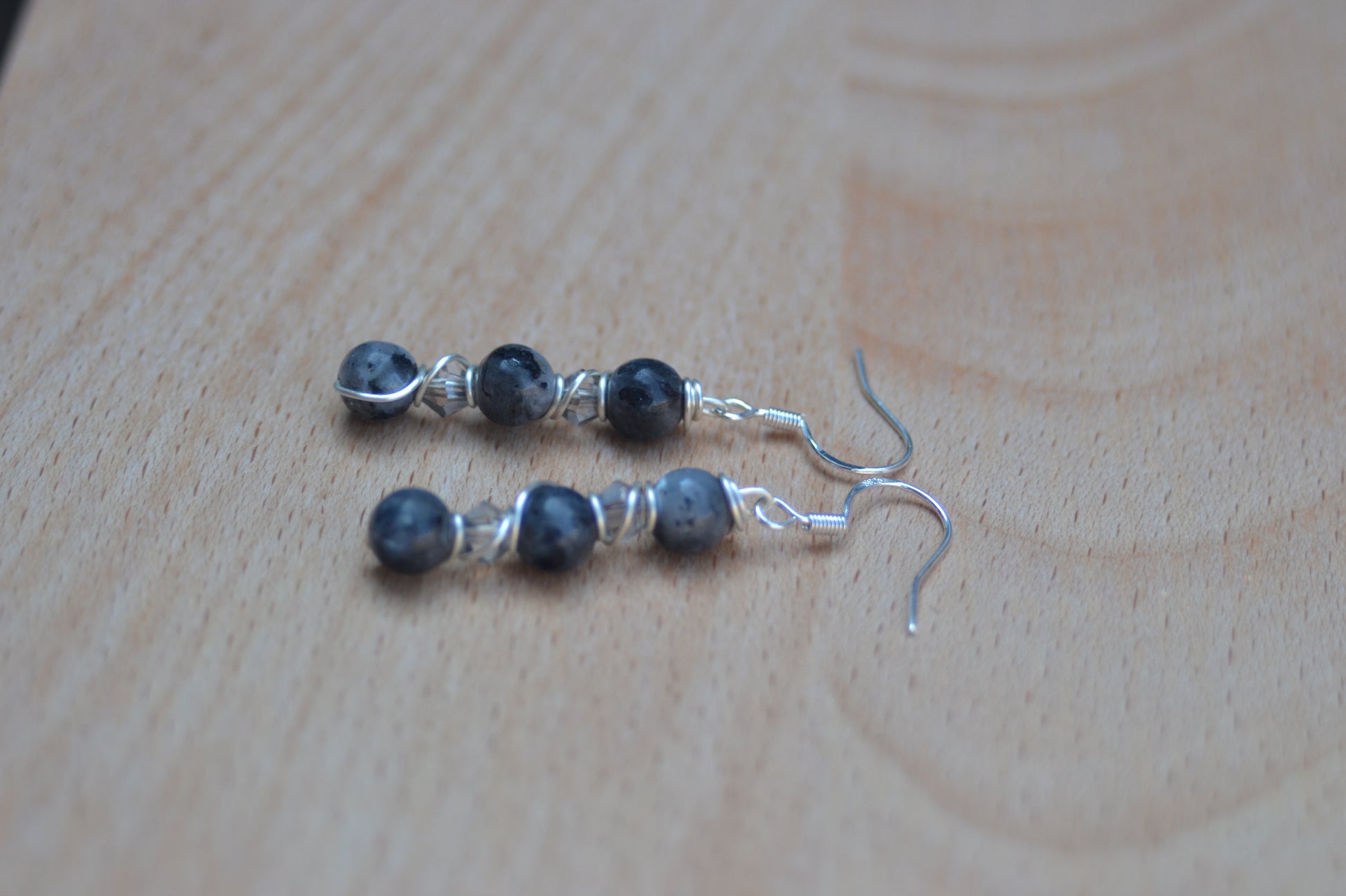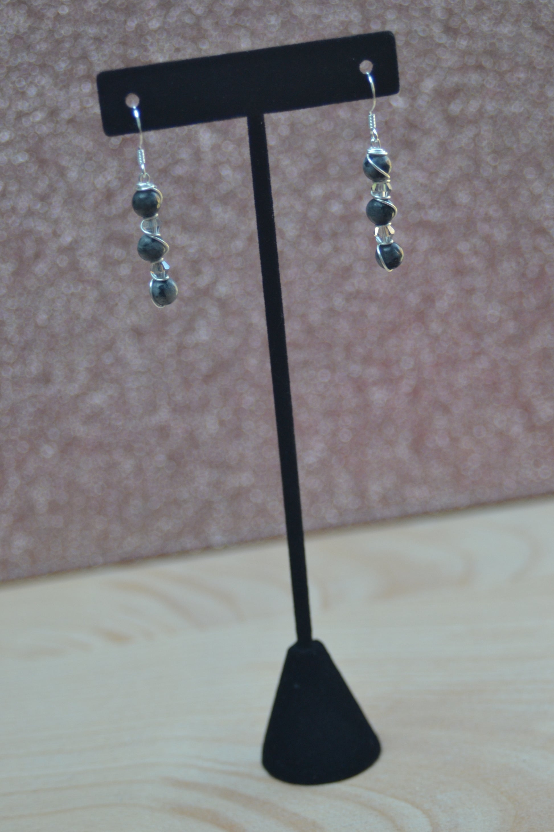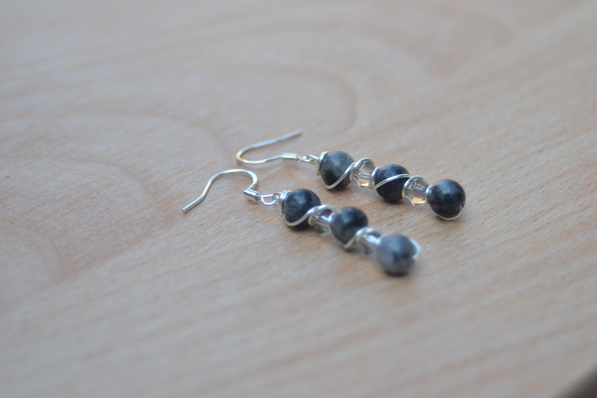 Elevate your style with these five-tier Grey Labradorite earrings, measuring 1.75 inches long. Each earring features three 6mm Labradorite beads separated by grey faceted crystal spacers, double wire wrapped in silver-plated copper, and finished with sterling silver hooks.