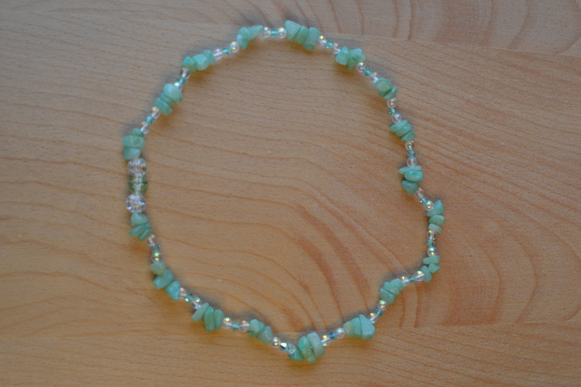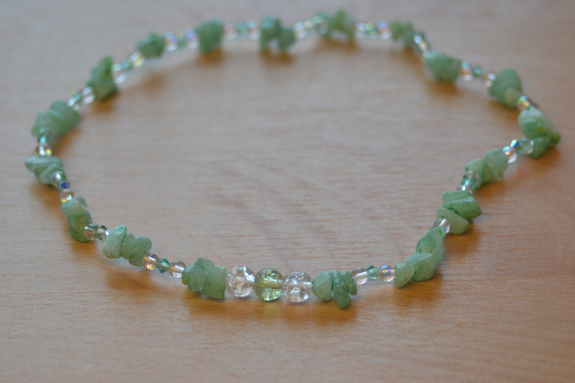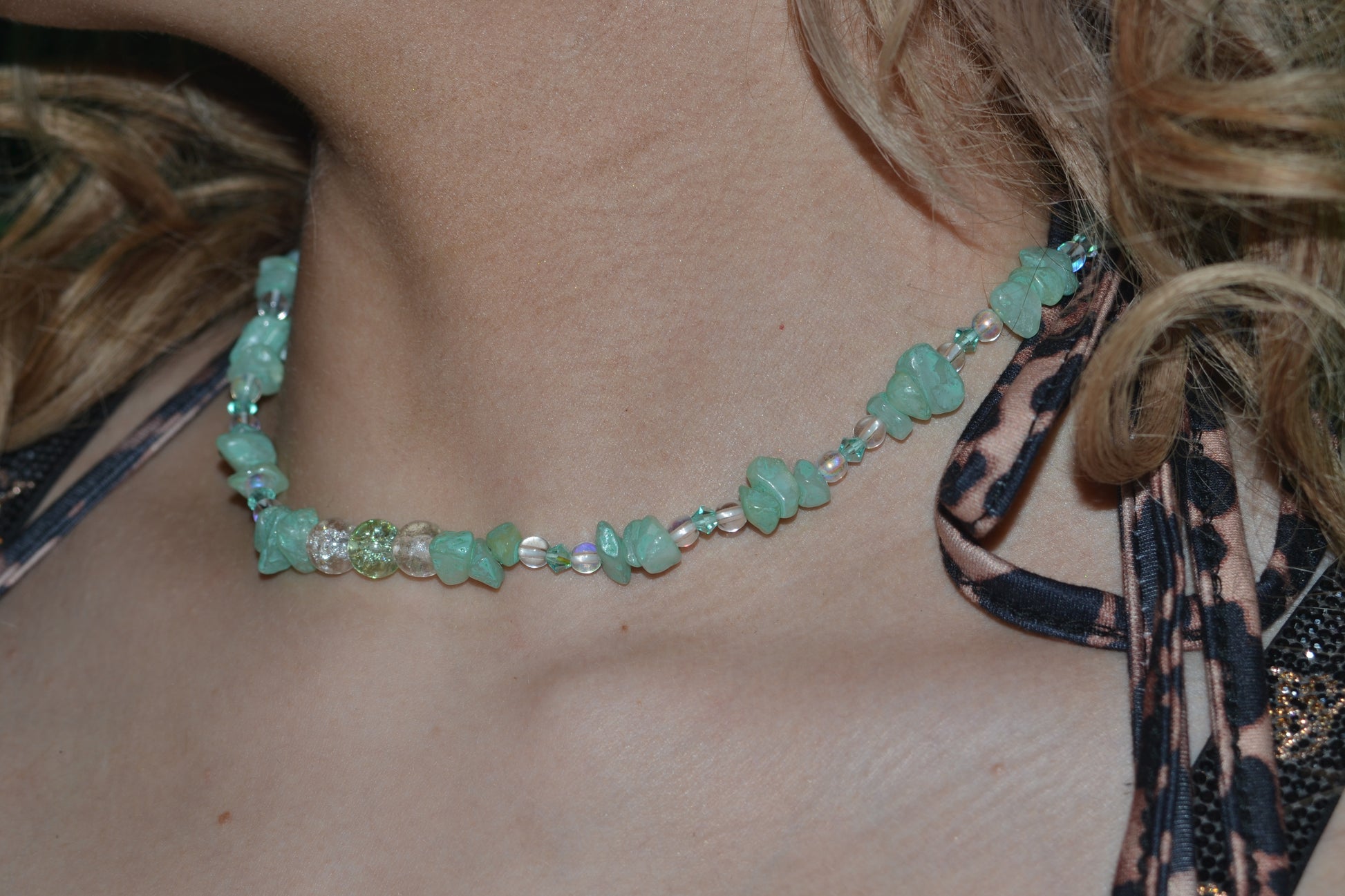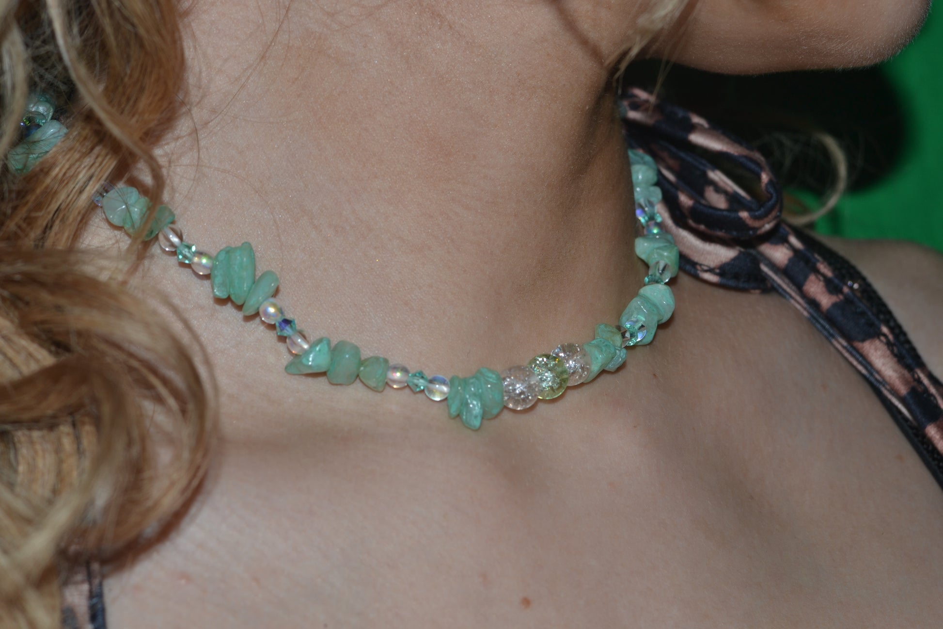 Made with real aventurine stones that have been hand-painted to explore new color and meaning, this 15-inch choker is a bold, artistic expression of change. The stones are accented with aura bead spacers and faceted crystals, catching the light like intention catching fire.