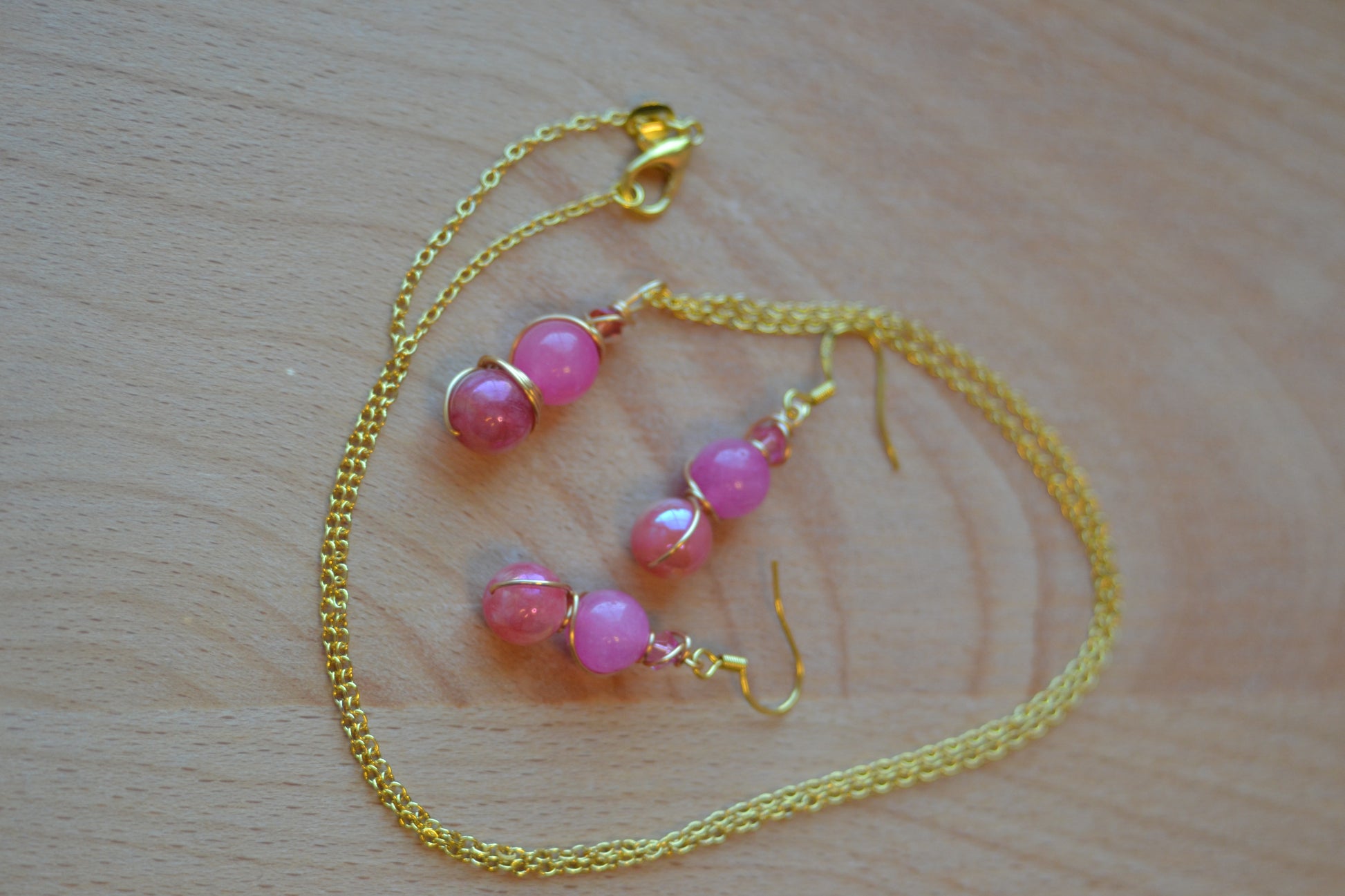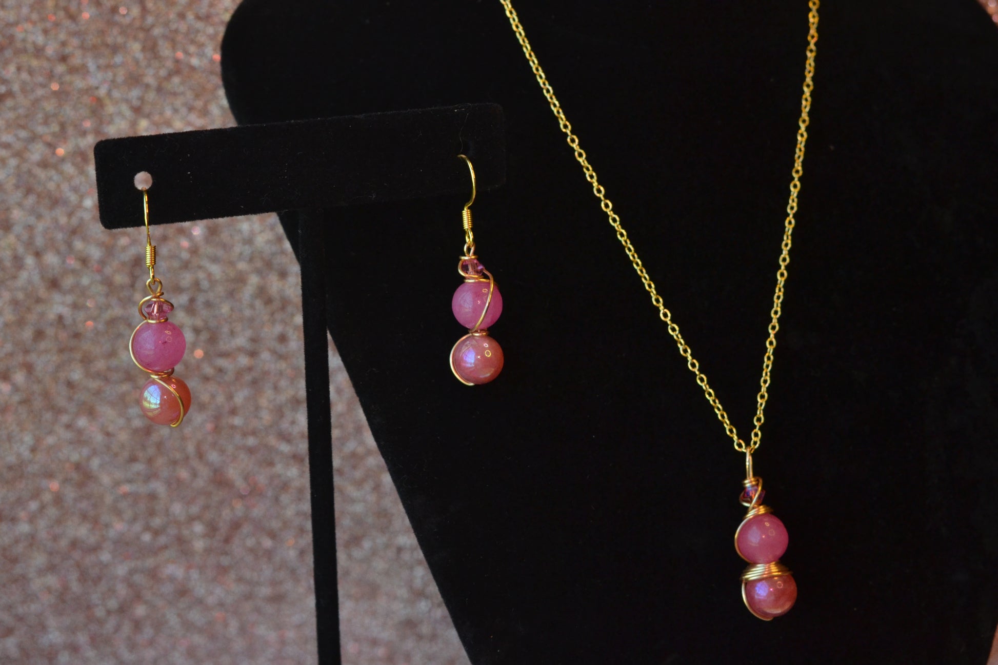 This luminous, feminine jewelry set features a 20-inch gold-plated 925 sterling silver chain with a 1-inch, 3-tiered pink jade pendant, wire-wrapped in gold-plated copper and topped with a soft pink faceted crystal. The matching 1.5-inch earrings are double wire-wrapped in the same gold tone and hang from gold-plated 925 sterling silver hooks for a cohesive, high-vibe look.