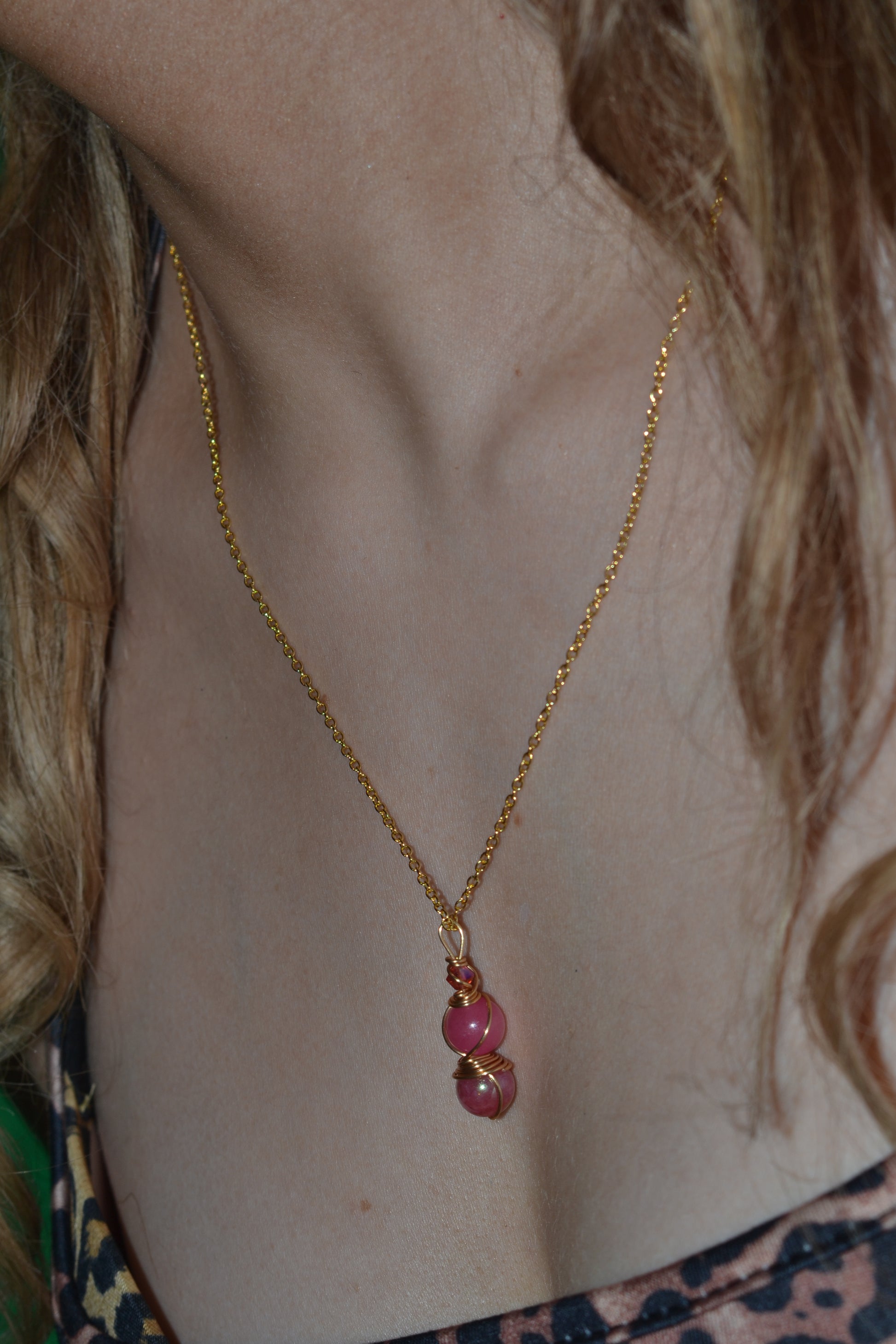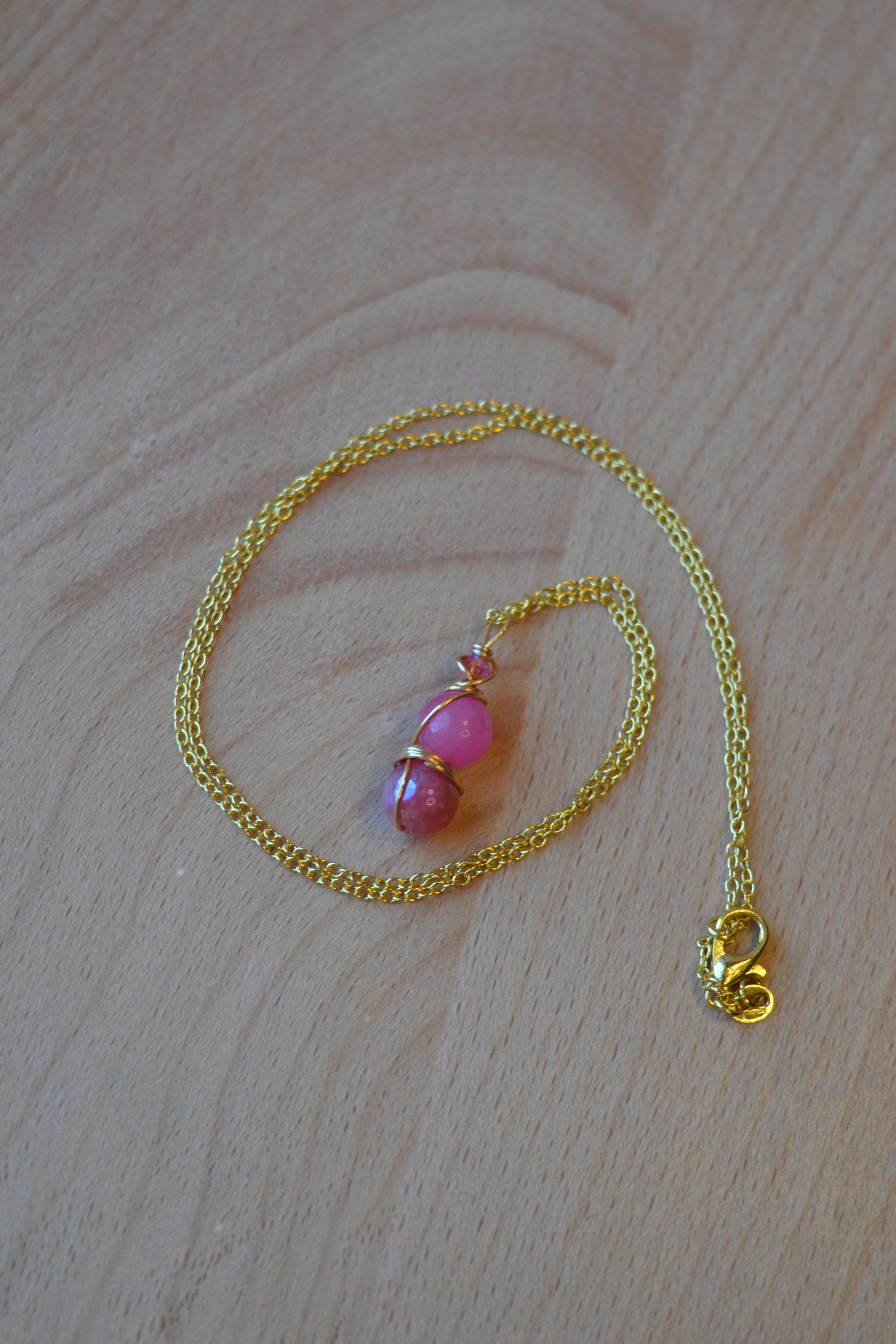 • Pendant: 1" pink jade, 3-tiered, topped with faceted pink crystal
