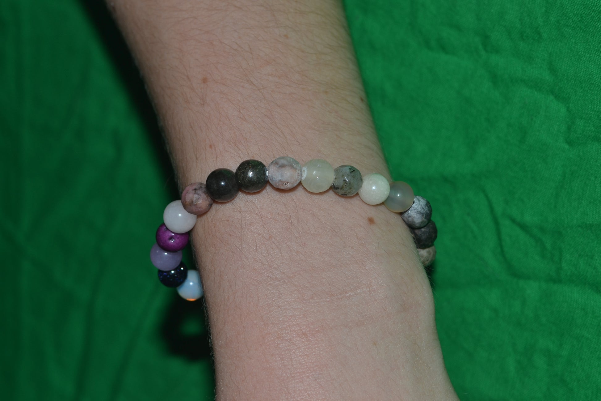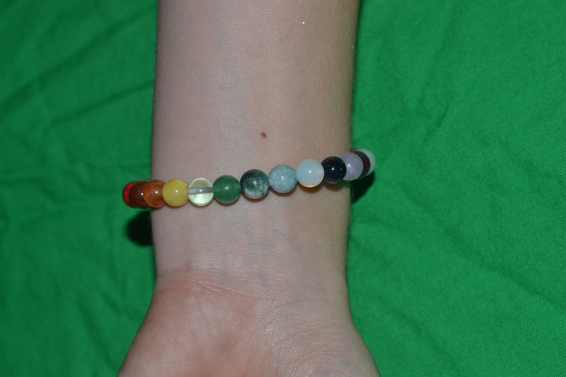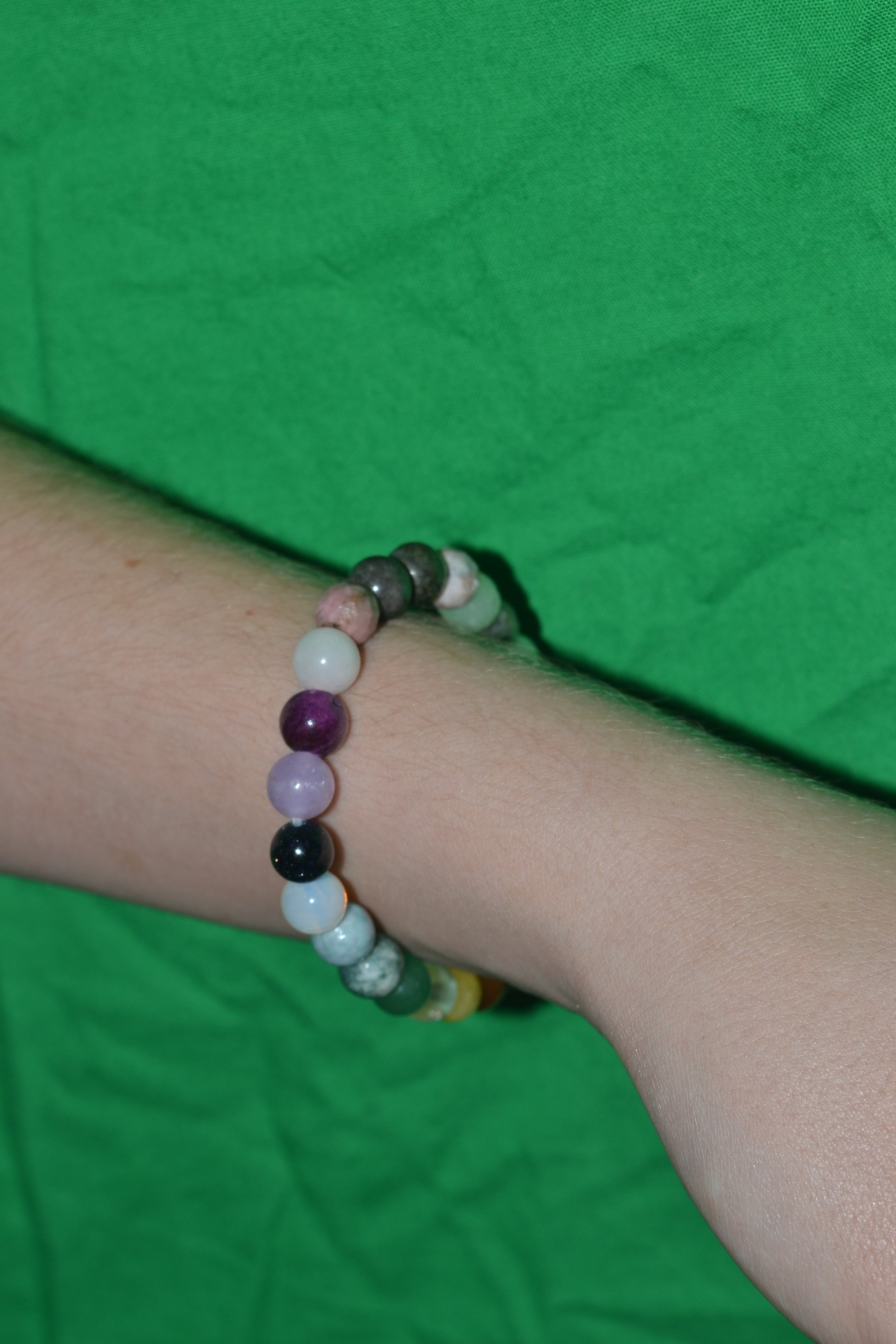 This handcrafted Rainbow Gemstone Bracelet is a radiant expression of wholeness, created with smooth 6mm natural stones arranged in an intuitive, energetically balanced order. Featuring over 15 unique crystals — including Jasper, Pyrite, Carnelian, Lepidolite, Amethyst, Opalite, Aquamarine, Fluorite, Moss Agate, Aventurine, Yellow Jade, Labradorite, Calcite, Obsidian, Moonstone, and Rose Quartz — this bracelet is a journey through grounding, joy, healing, intuition, and spiritual connection.