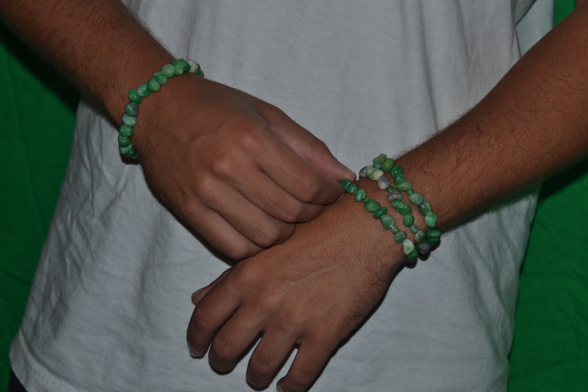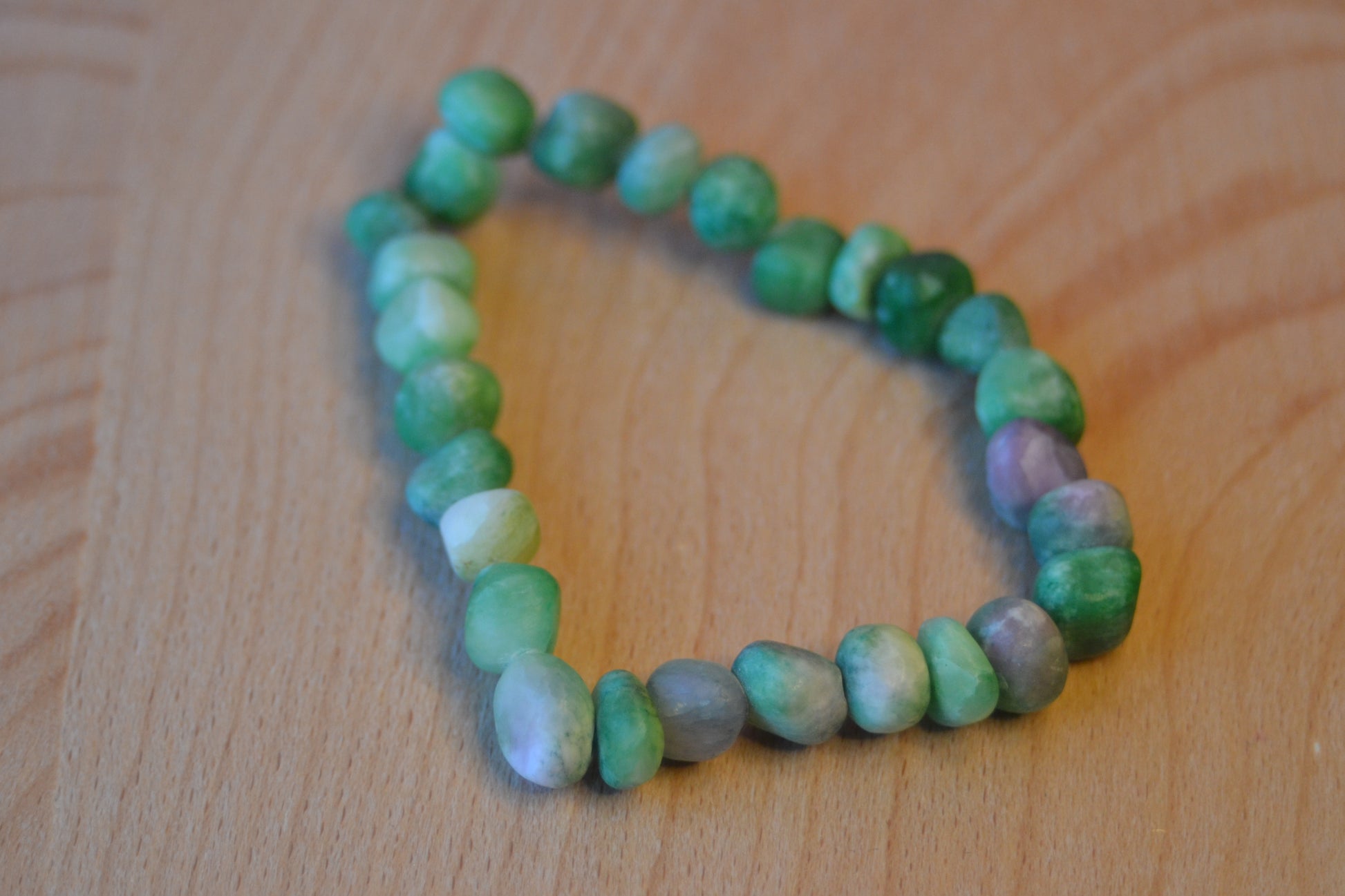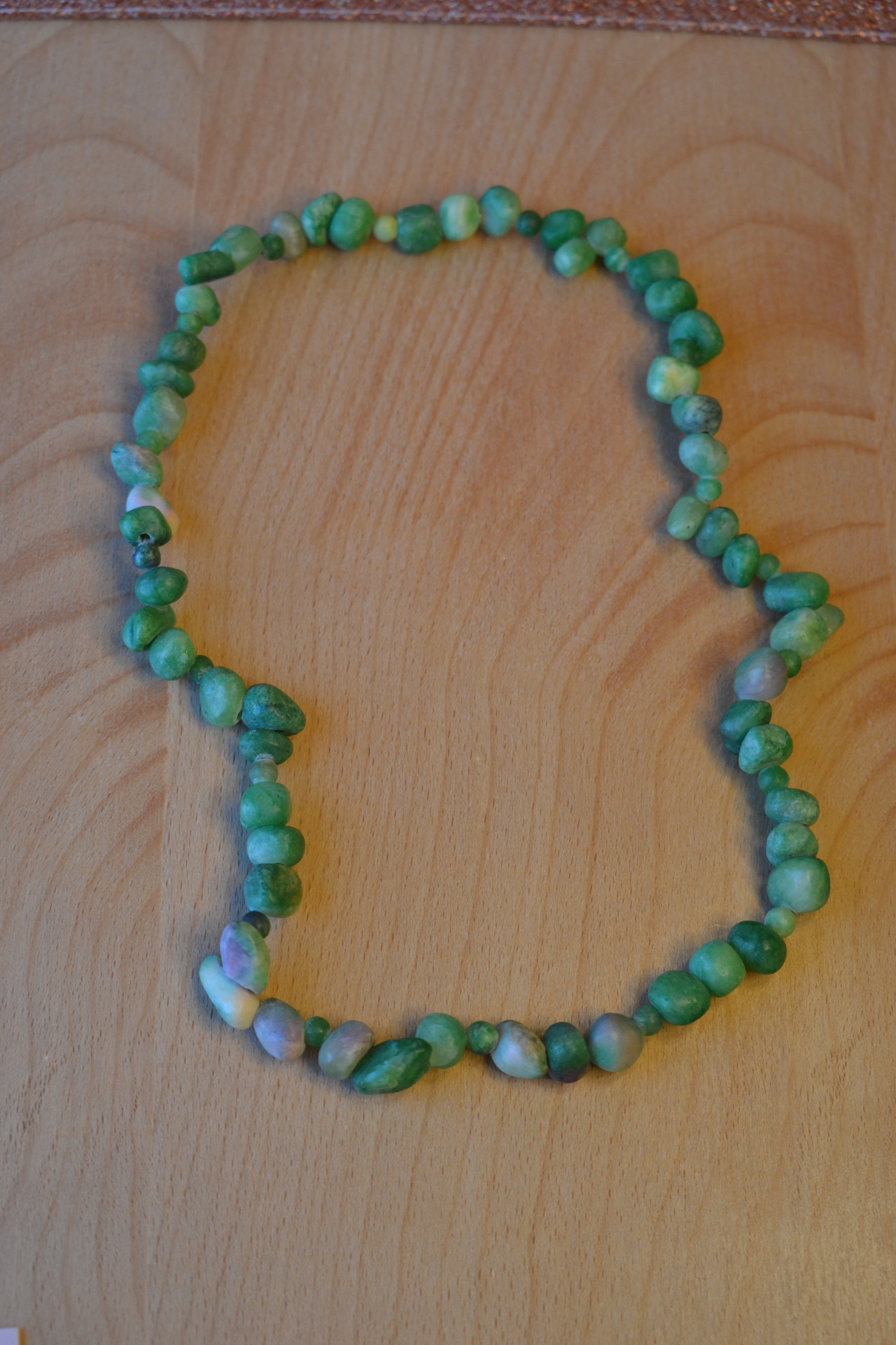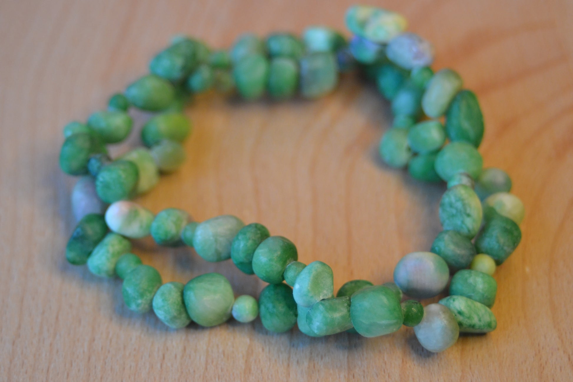 Materials: Large, rough jade chip beads (bright green with pink/yellow inclusions)