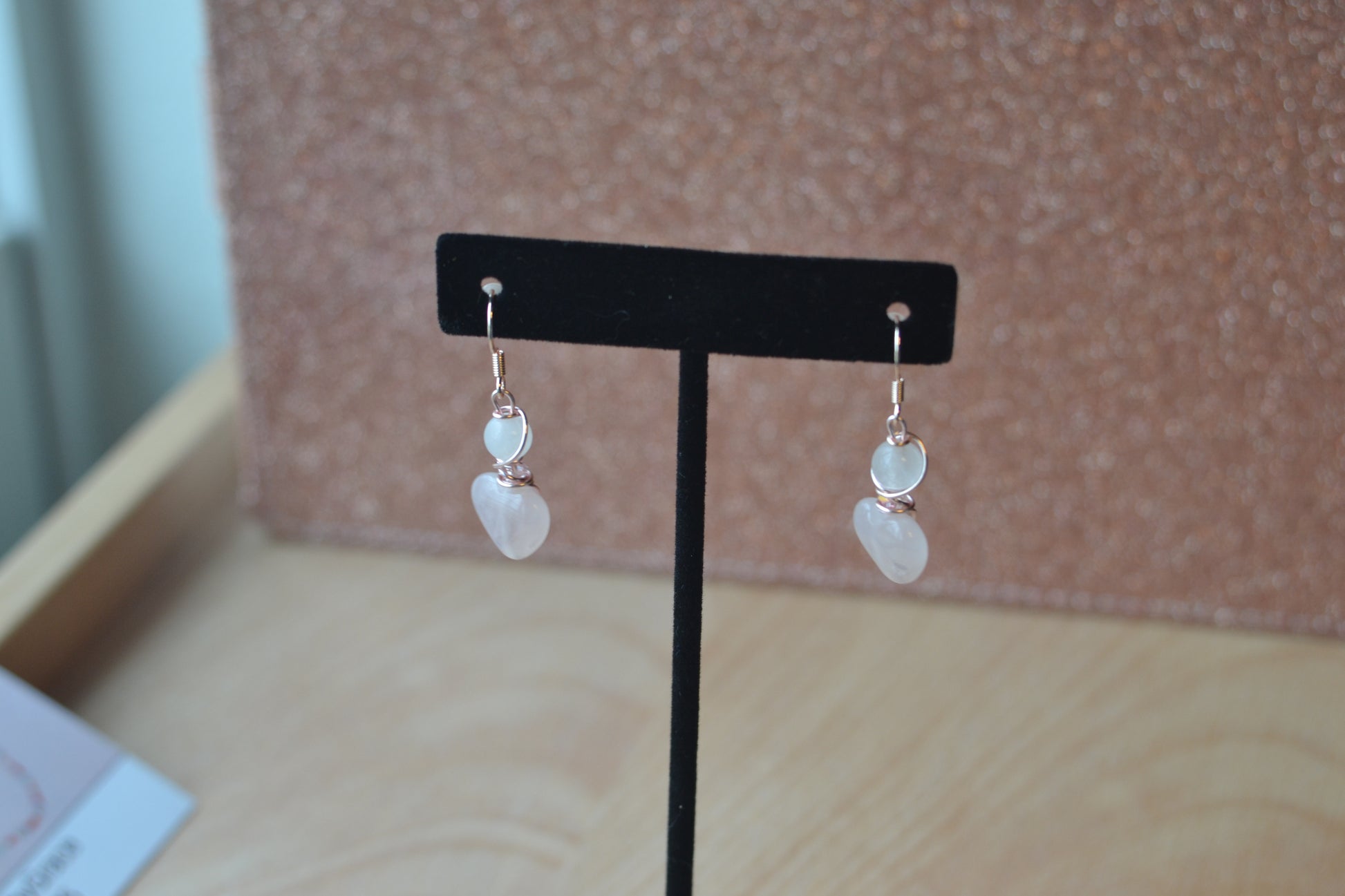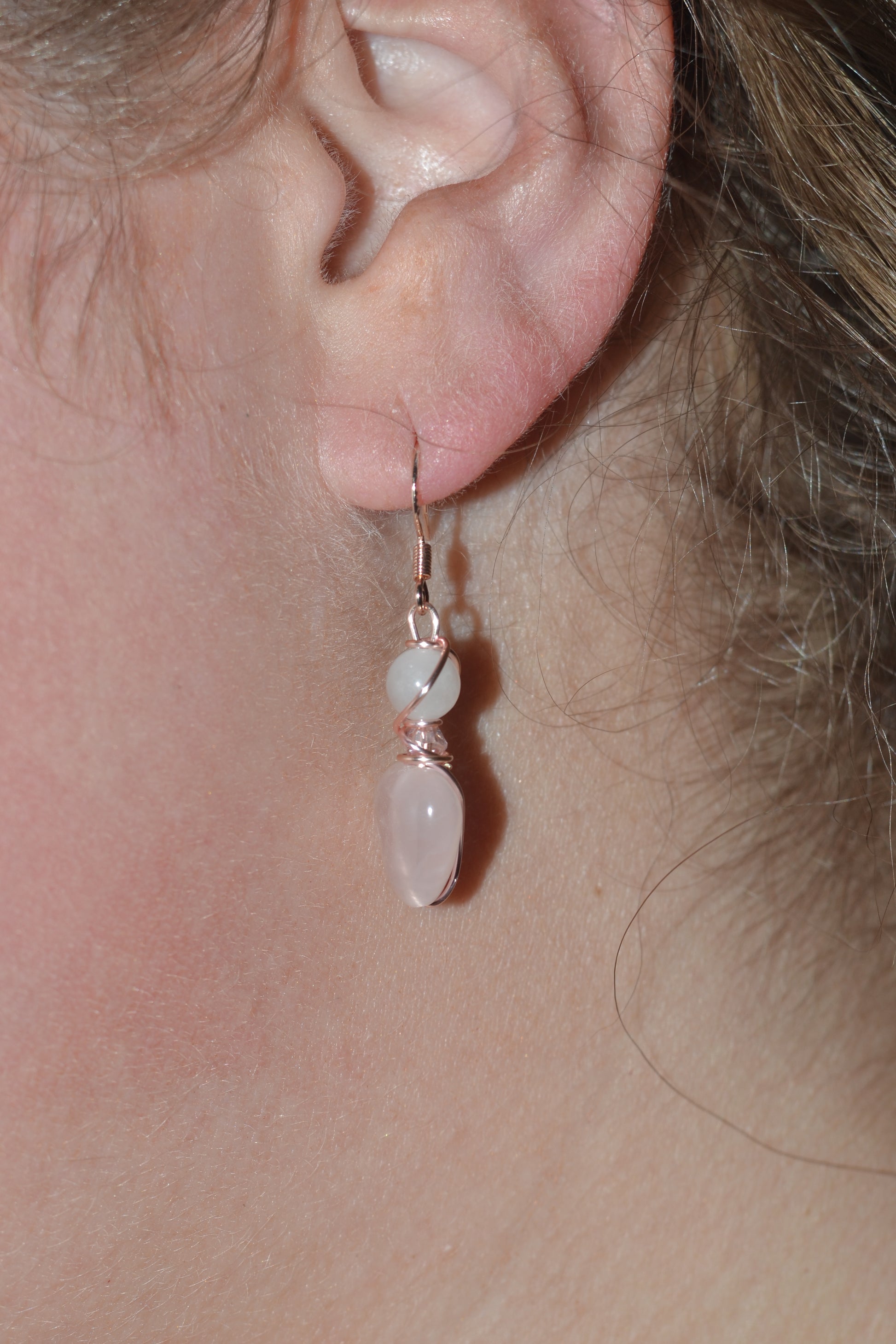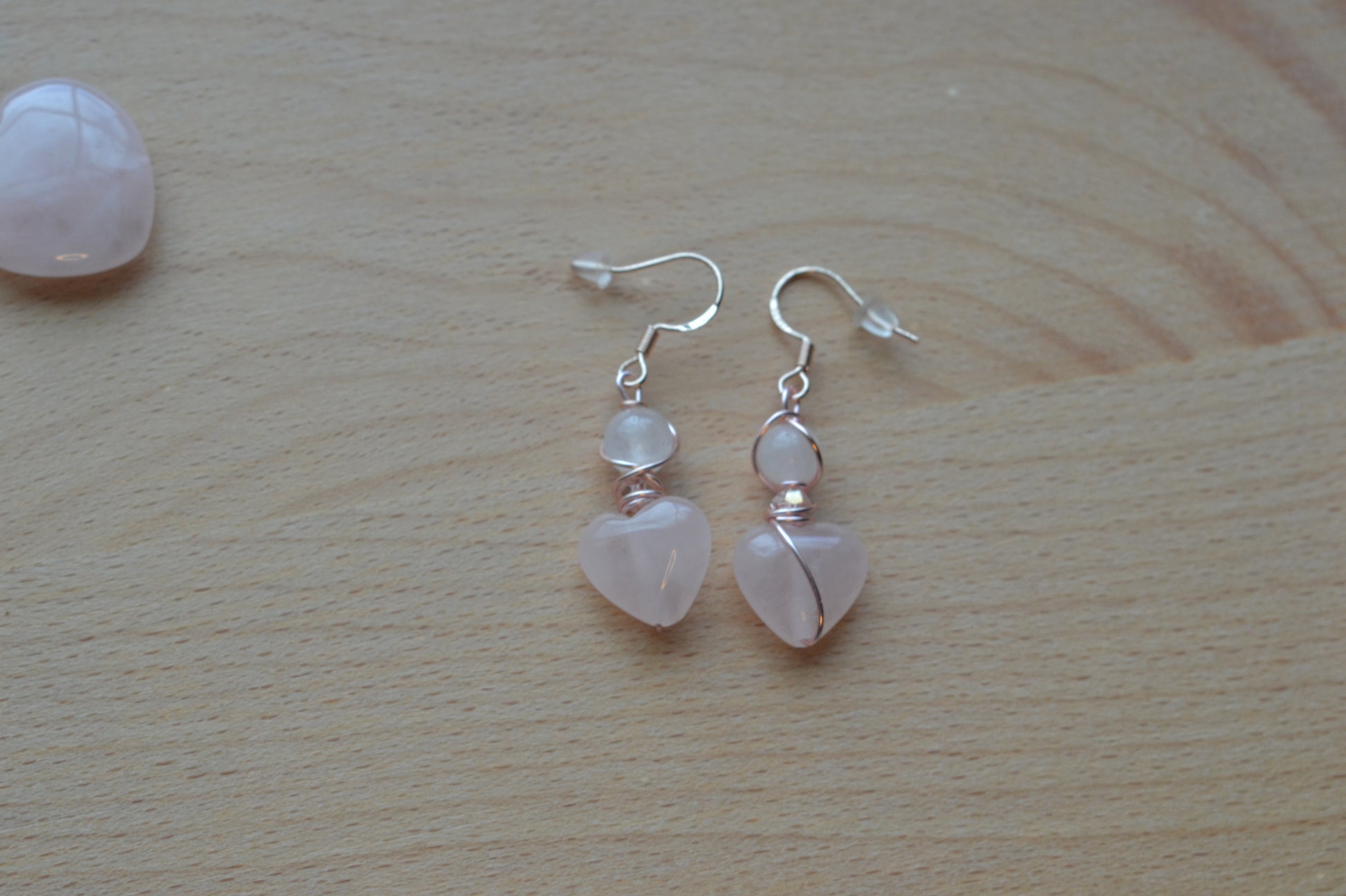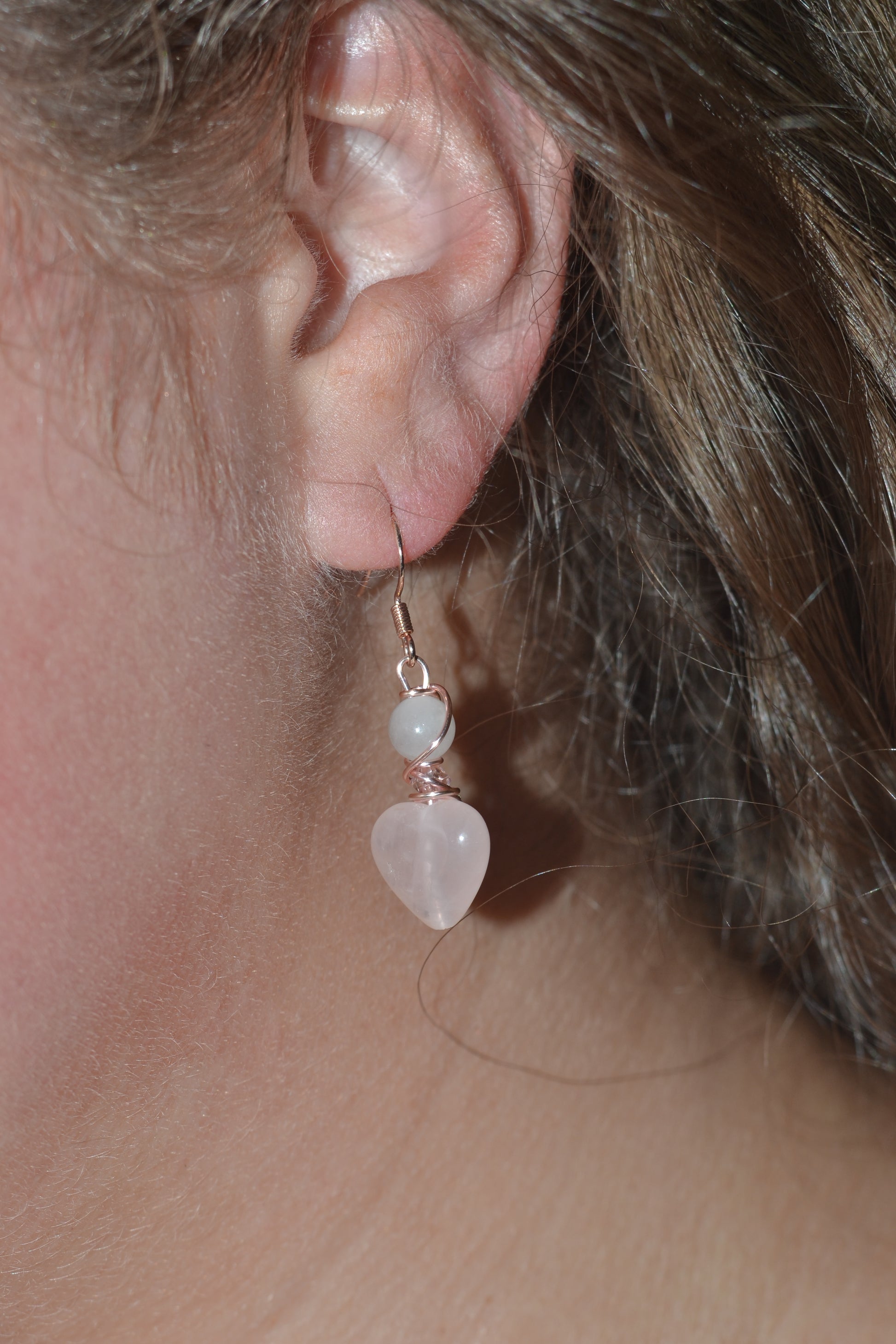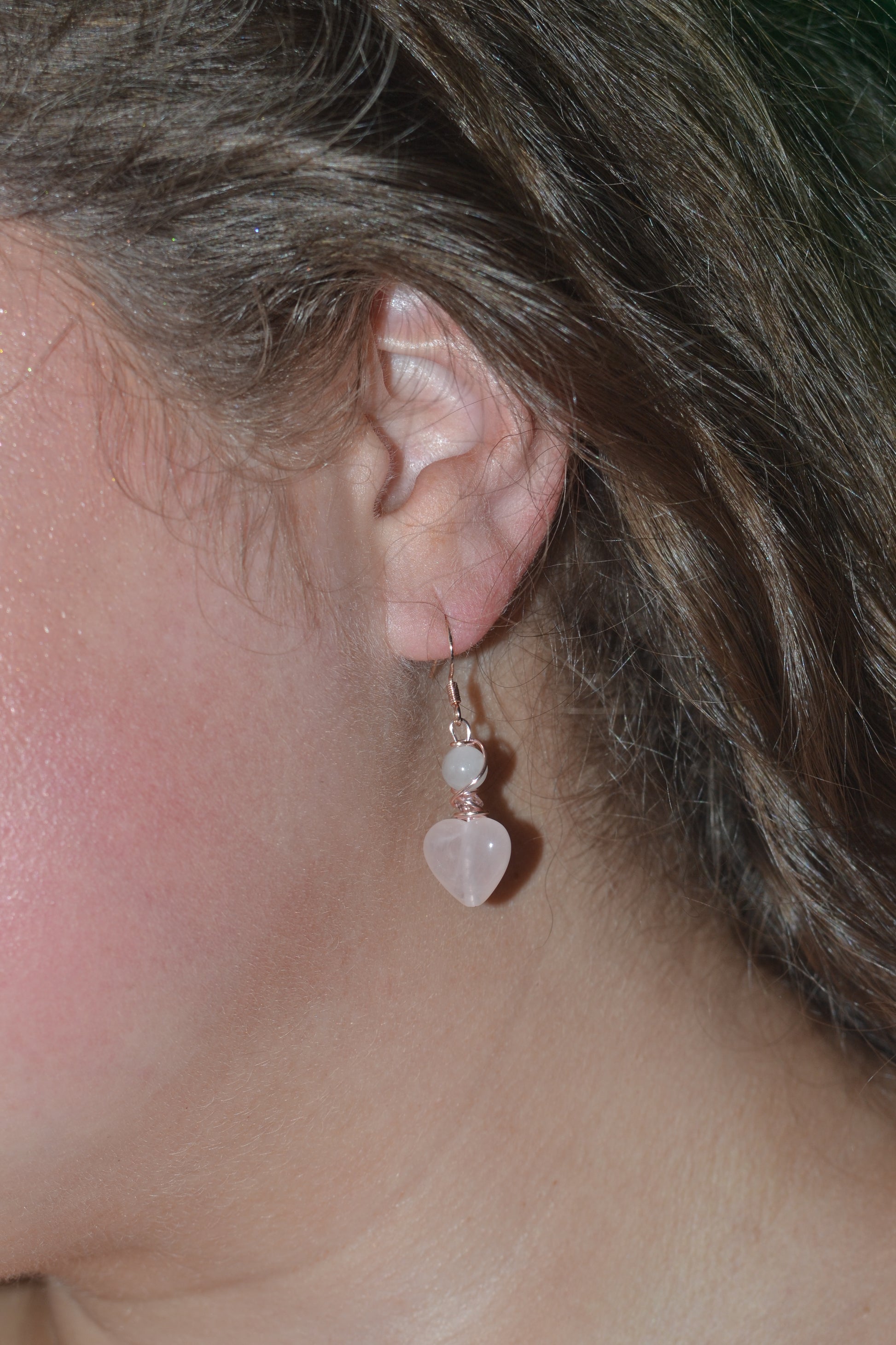 π Earrings β Rose gold-plated 925 sterling silver hooks hold delicate rose quartz heart pendants, each just over an inch long. These gentle hearts radiate tender energy, encouraging compassion and emotional healing.