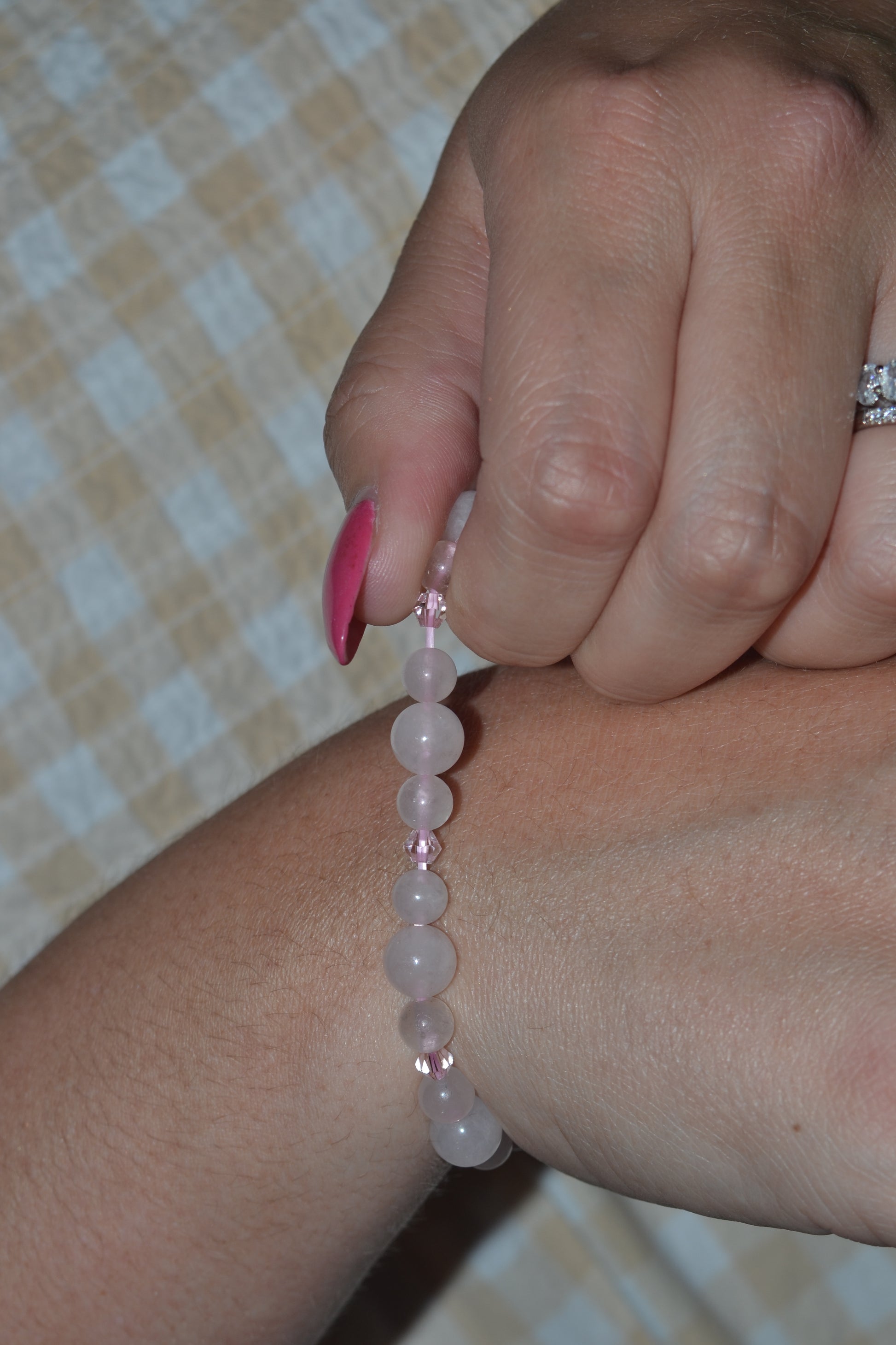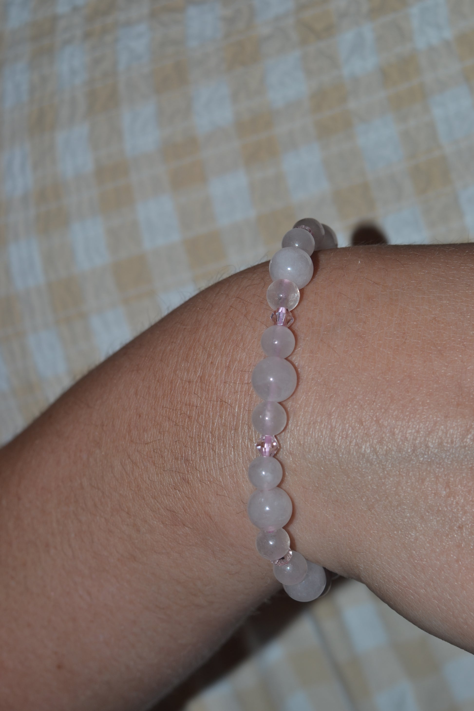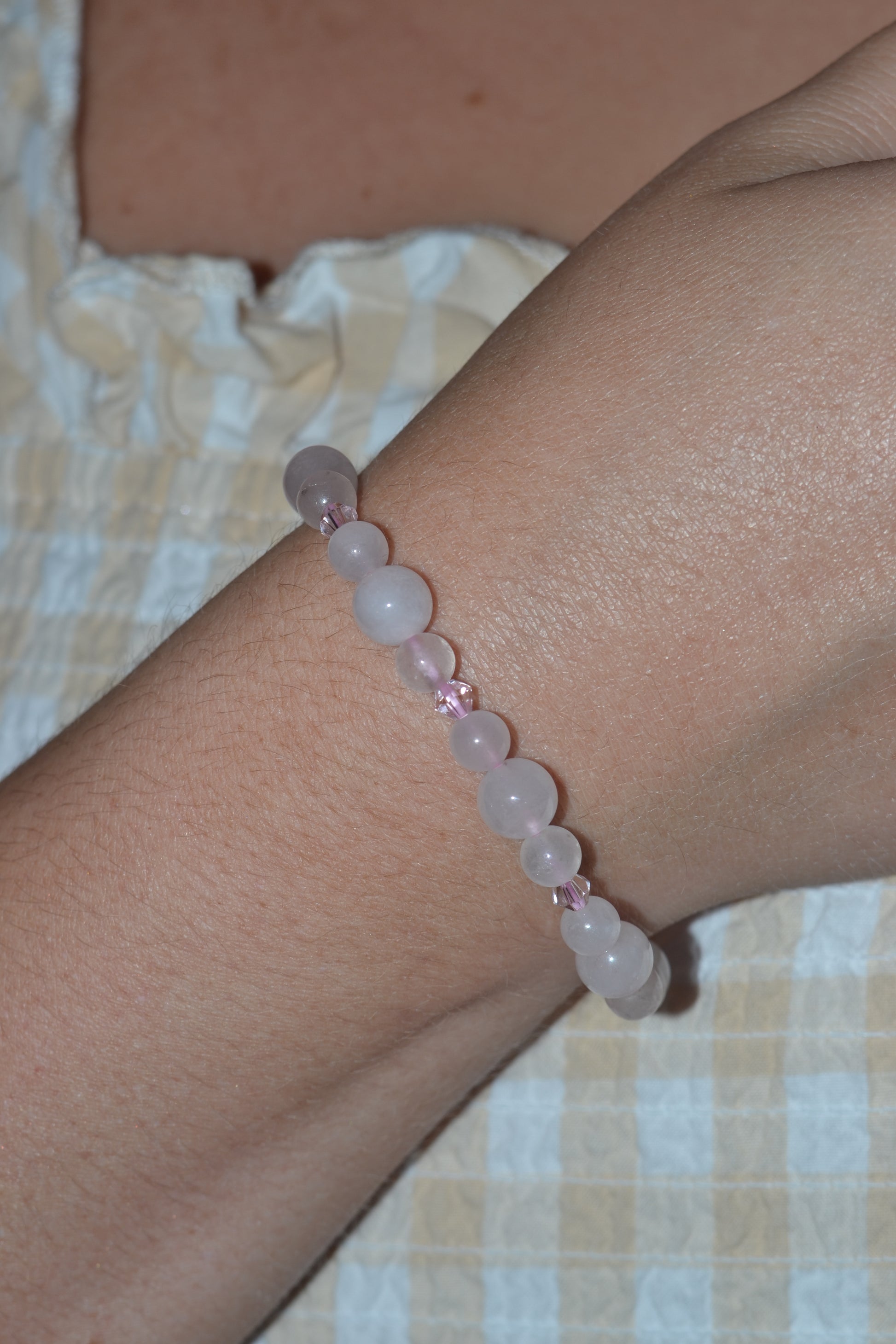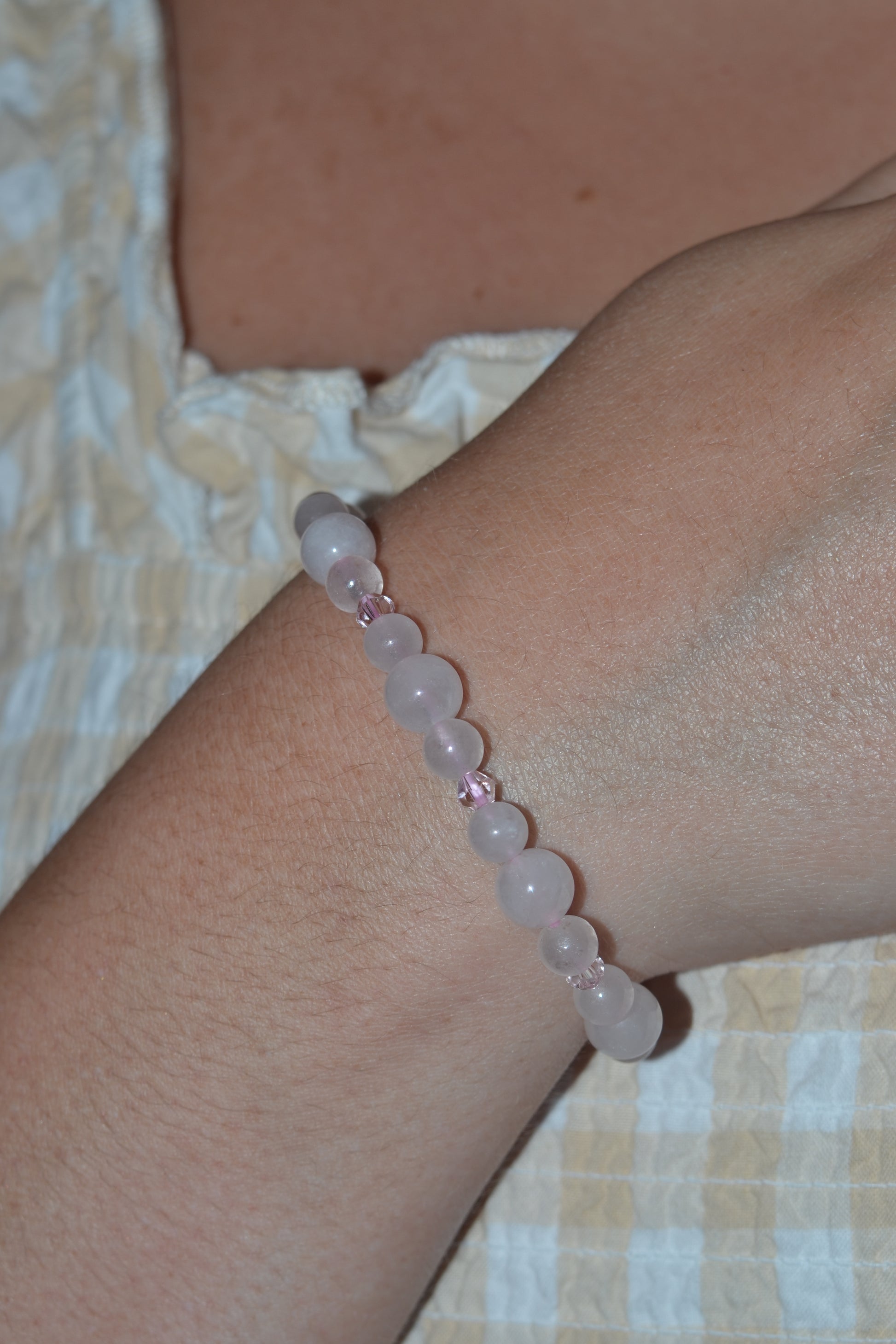 π Bracelet β A shimmering combination of 6mm and 4mm rose quartz beads, accented with luminous pink Swarovski crystal spacers. Strung on durable elastic, it offers both comfort and styleβperfect for everyday elegance or intentional ritual wear.