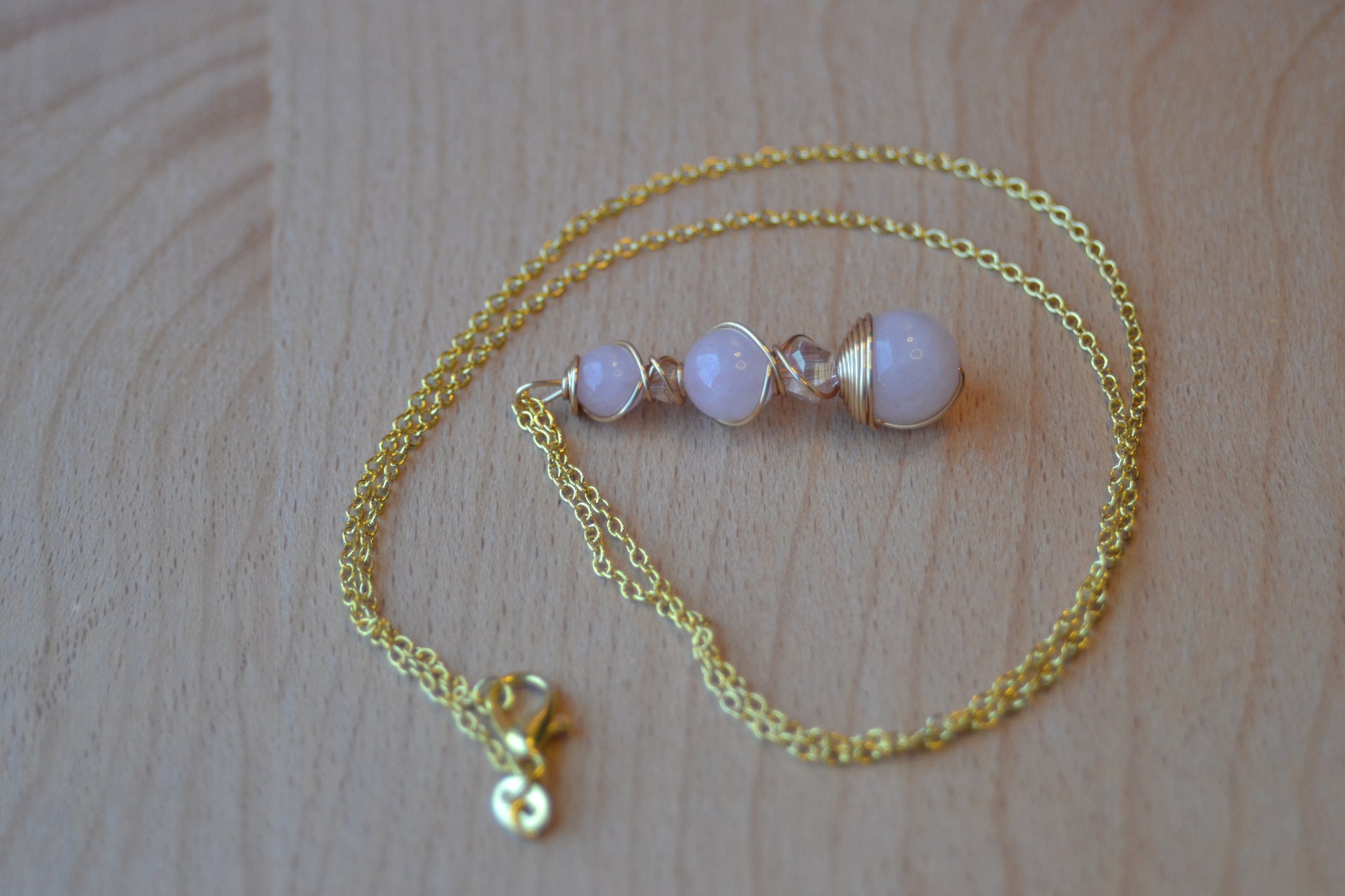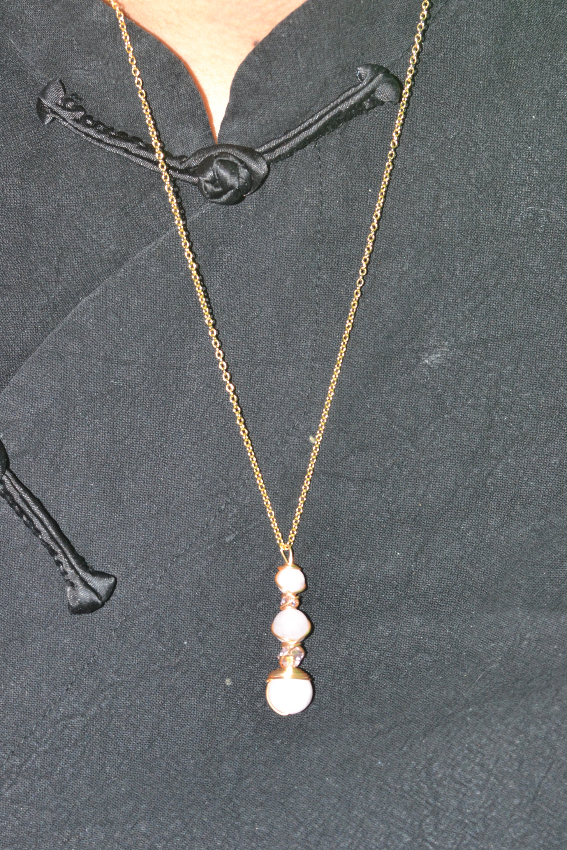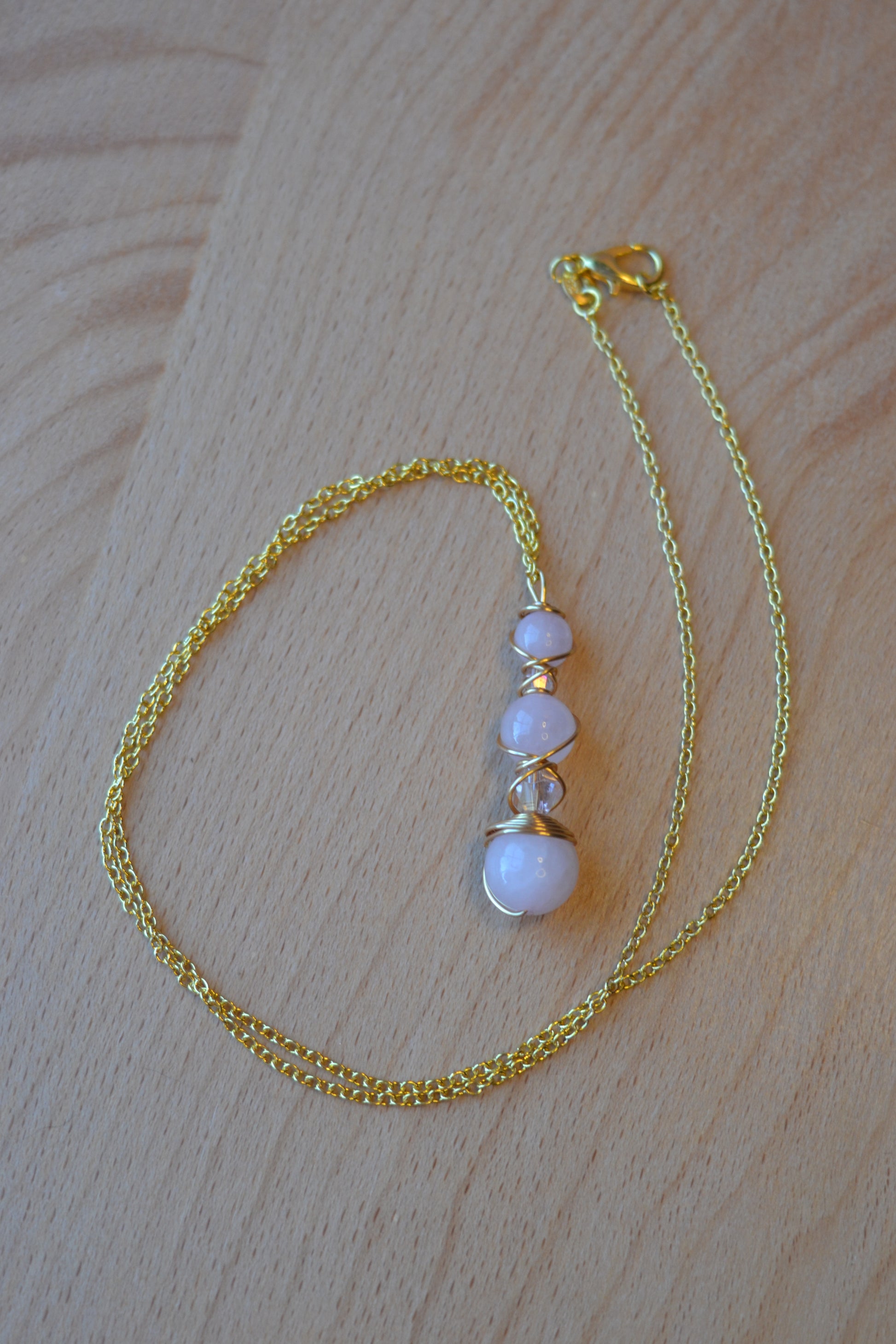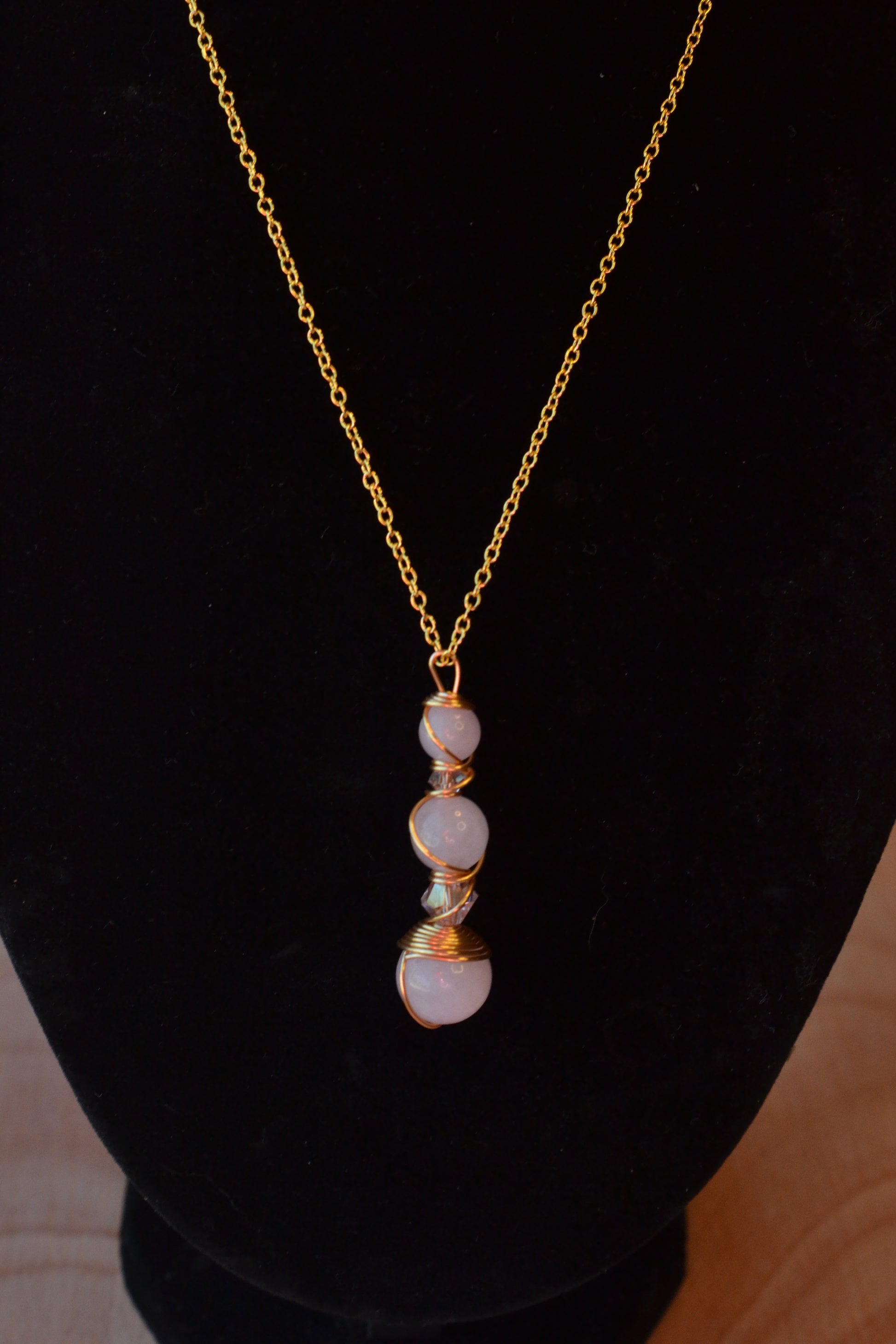 • 1.5" rose quartz pendant – 5-tiered, double wire-wrapped in gold-plated copper