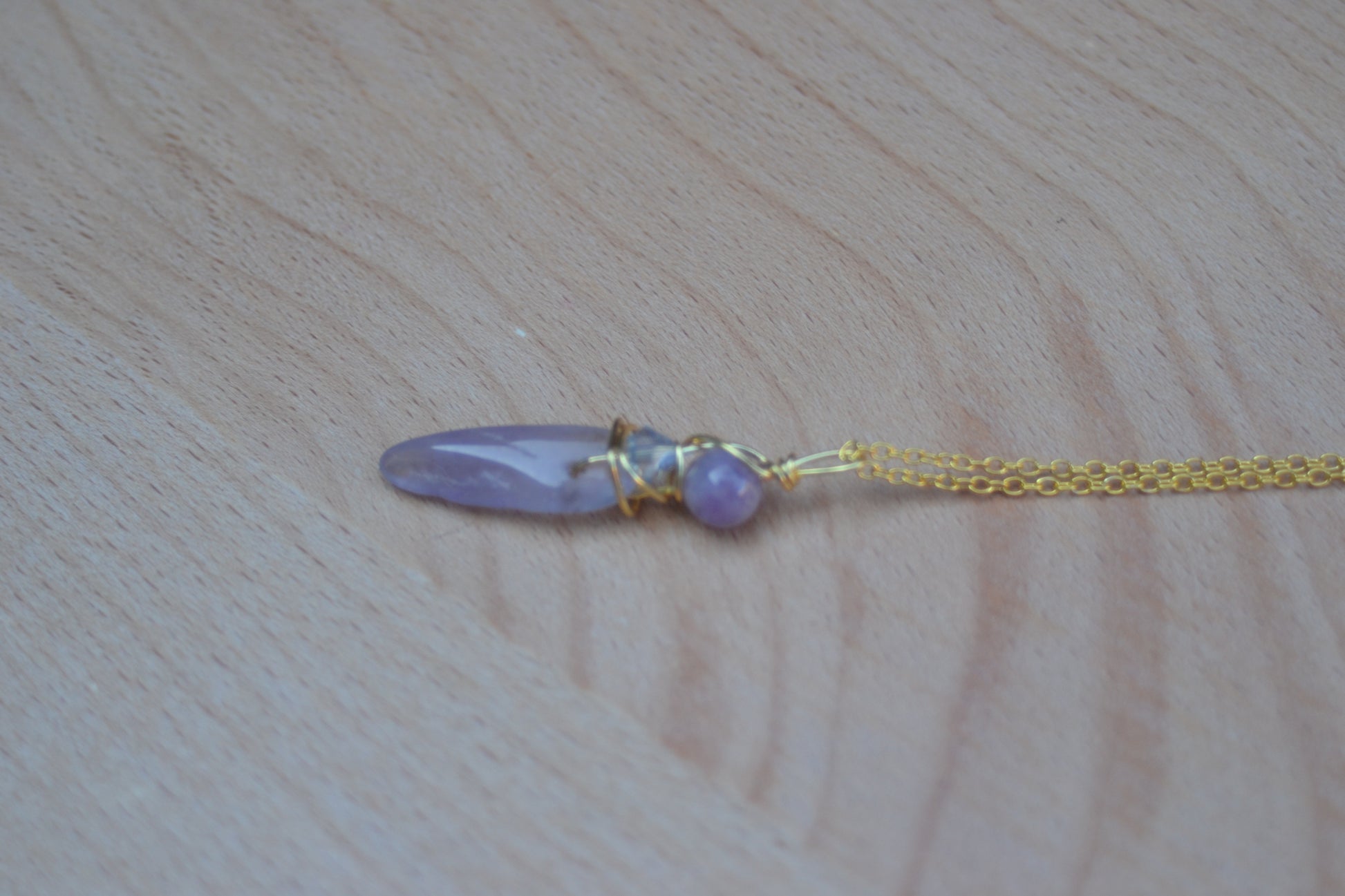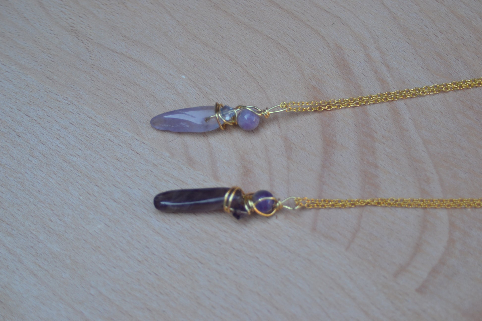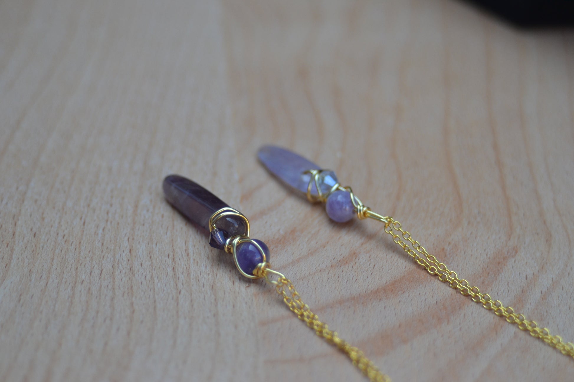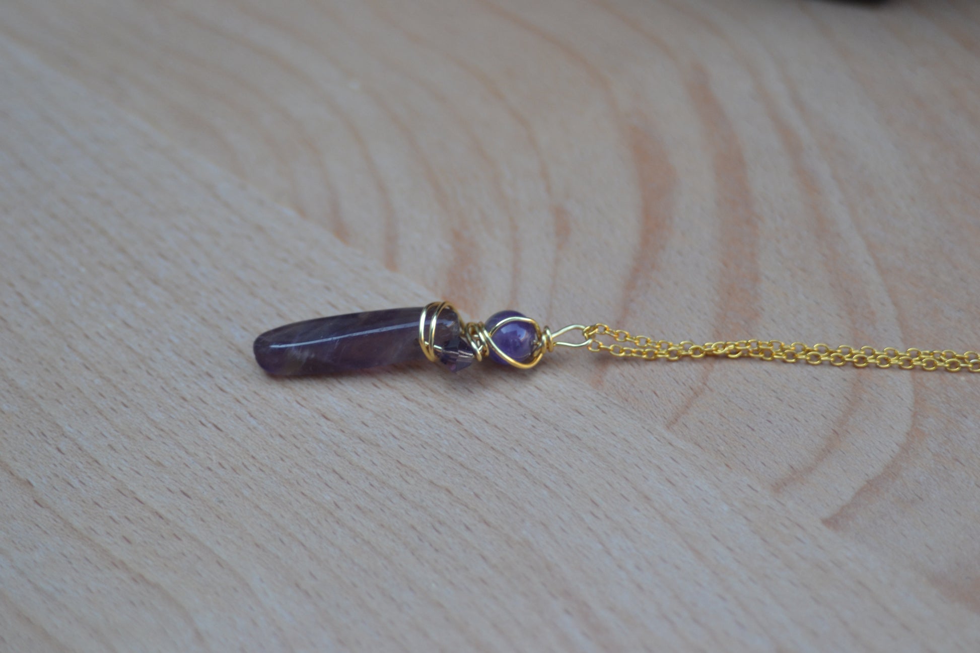Celebrate friendship and shared energy with these elegant Amethyst necklaces. Each necklace features a 20-inch gold-plated sterling silver chain and a 1.75-inch pendant, double wire wrapped in gold-plated copper with three tiers: a 6mm Amethyst bead, a sparkling faceted crystal, and a 1-inch long Amethyst point.