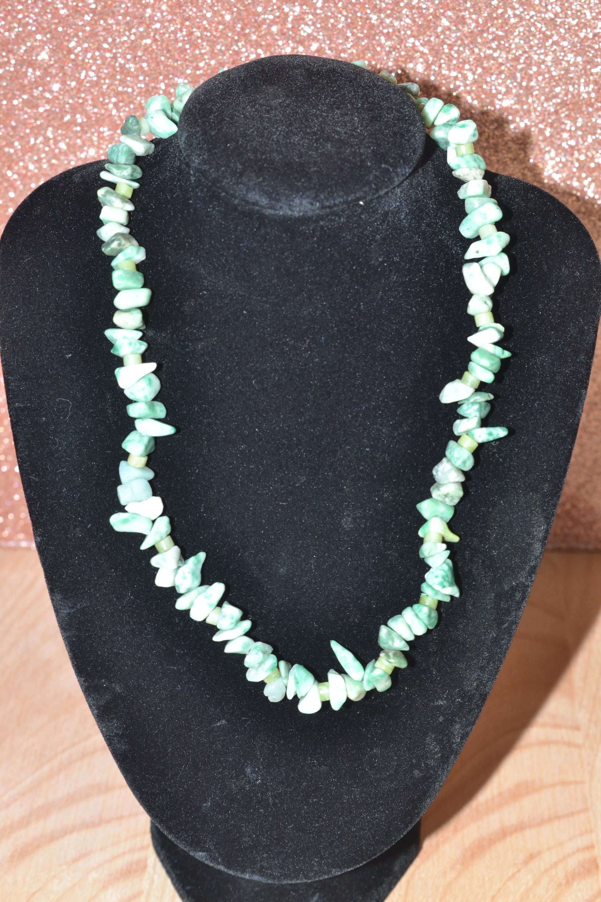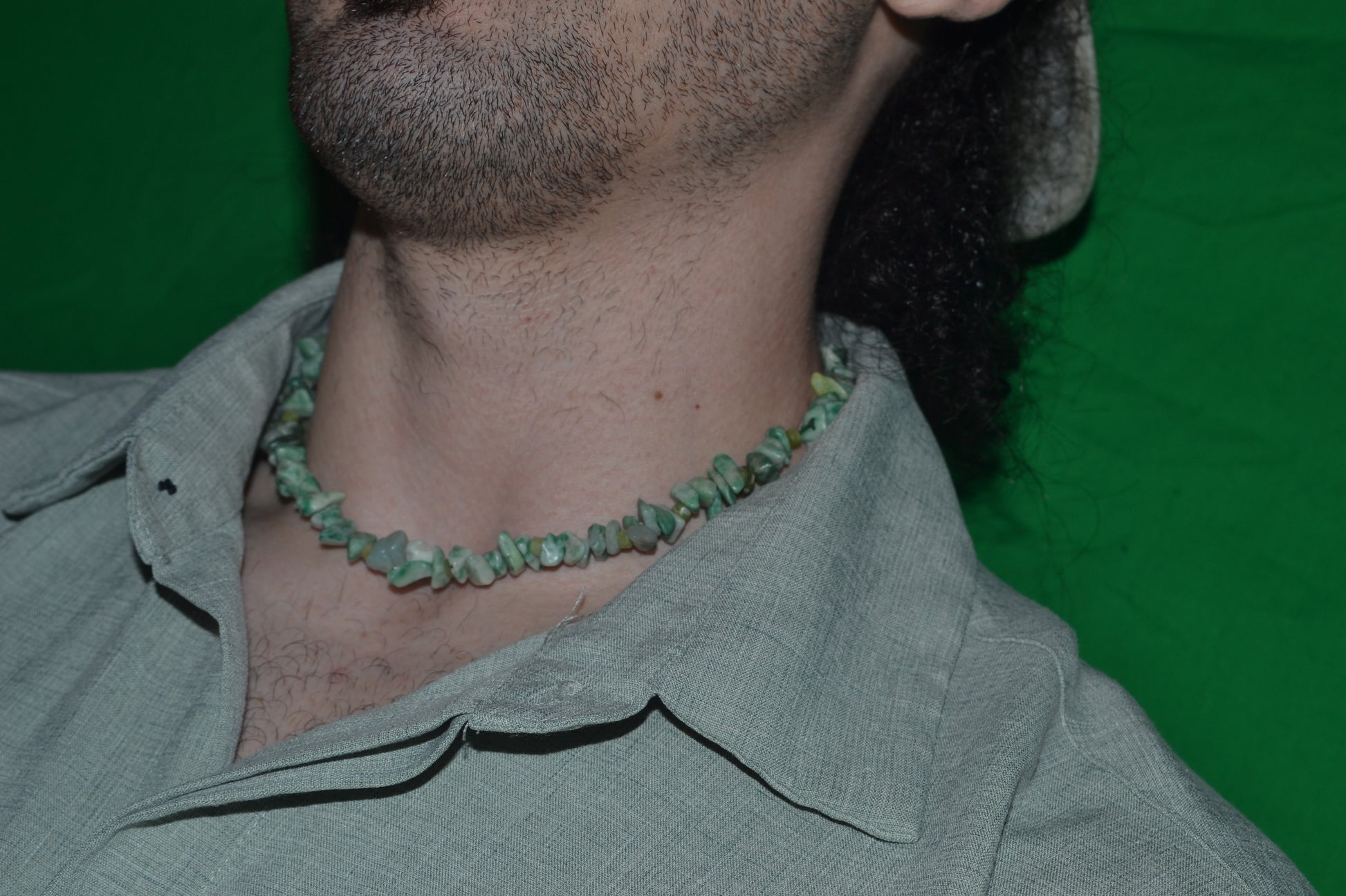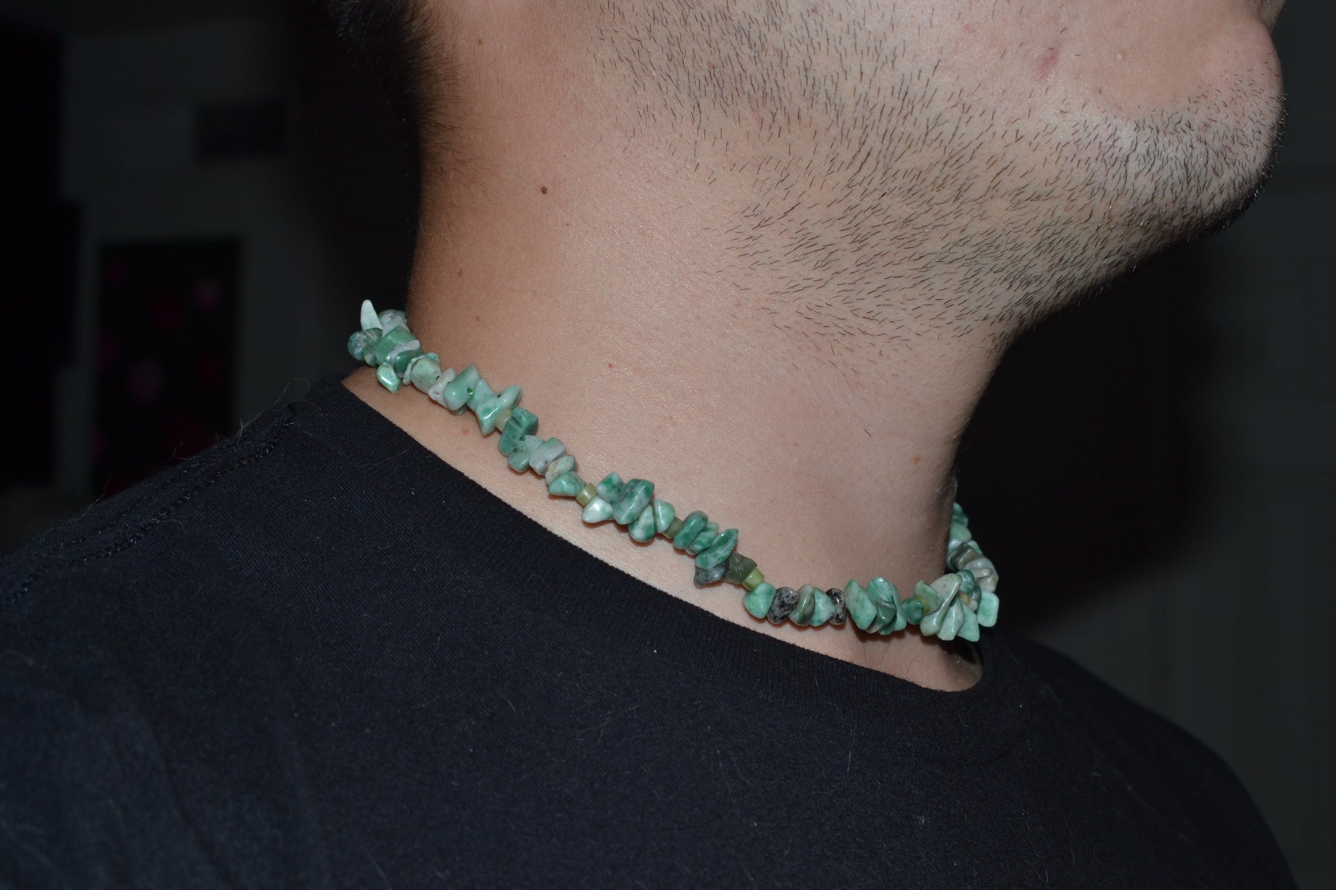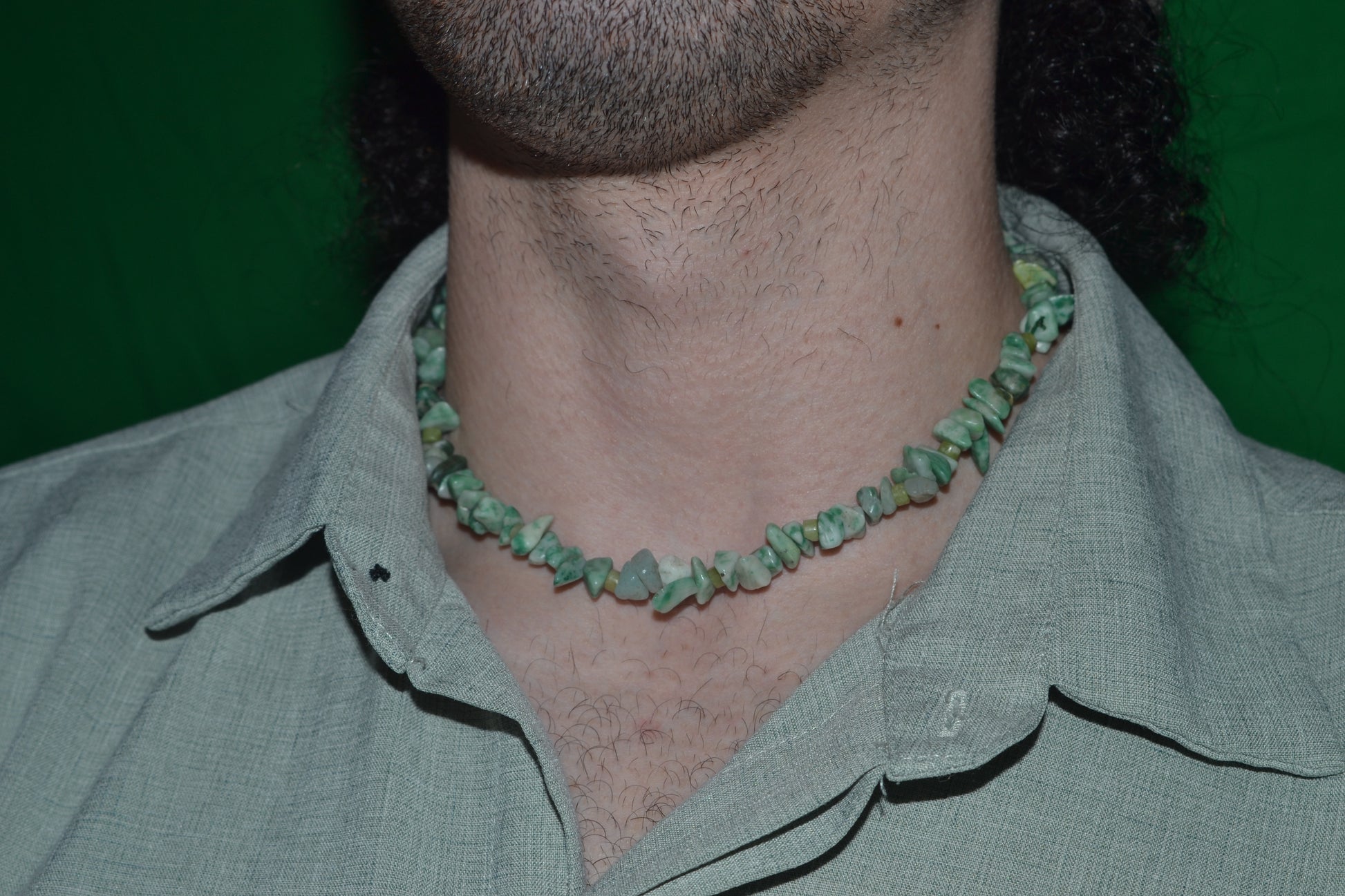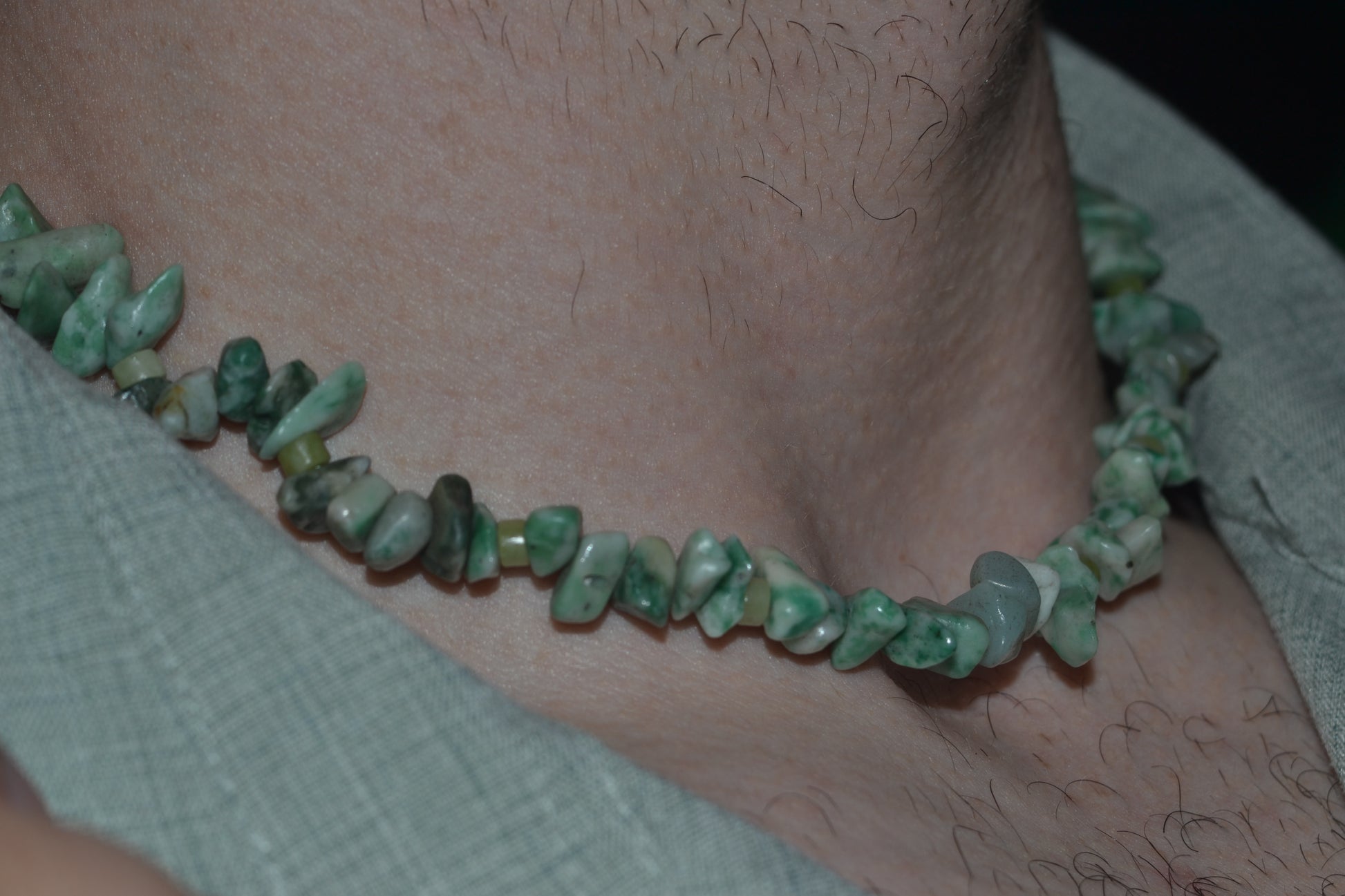 This 16-inch choker is handcrafted from spotted green jasper chip beads, accented with smooth jade spacers. Together, they create a masculine energy piece meant to ground, protect, and center the wearer.