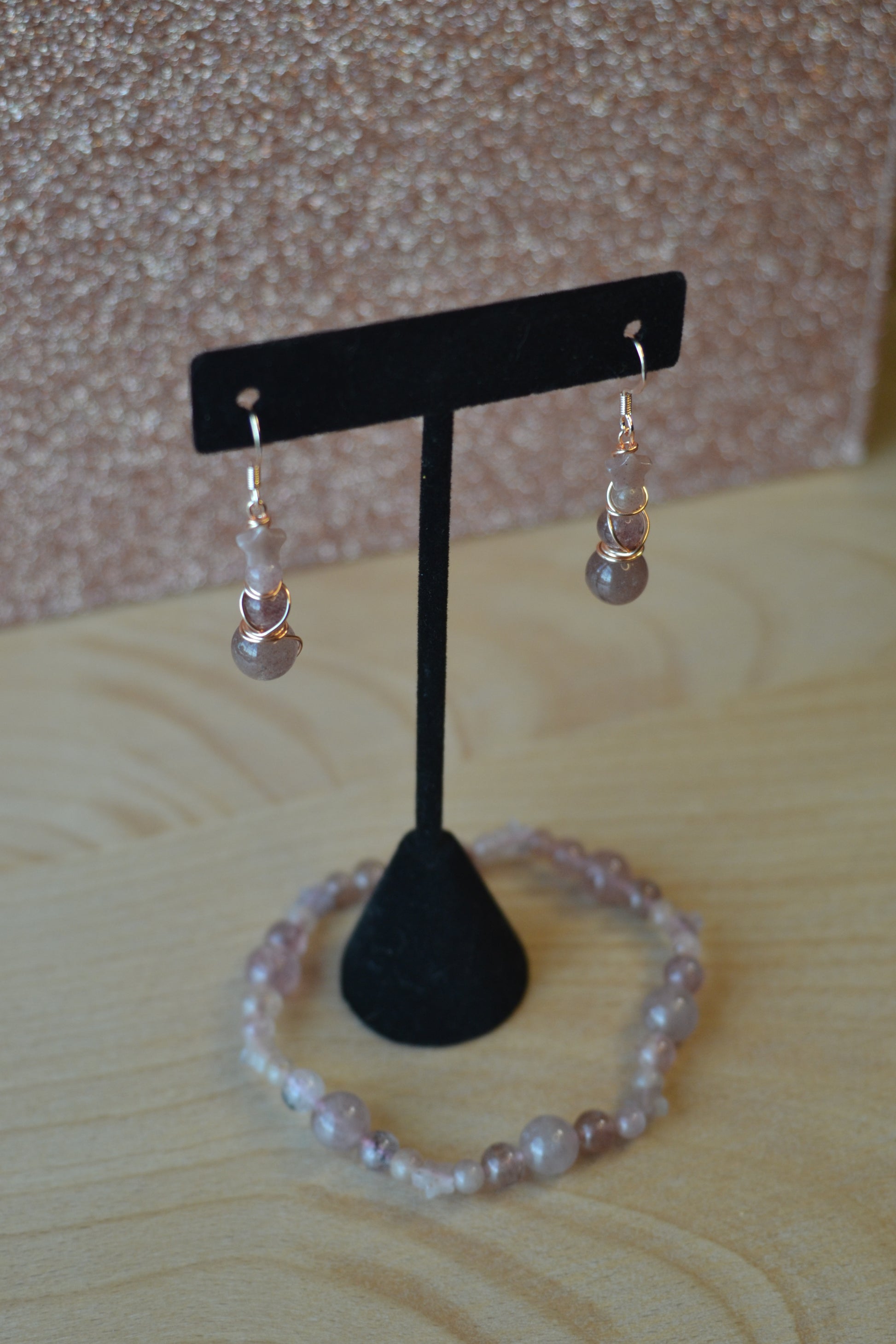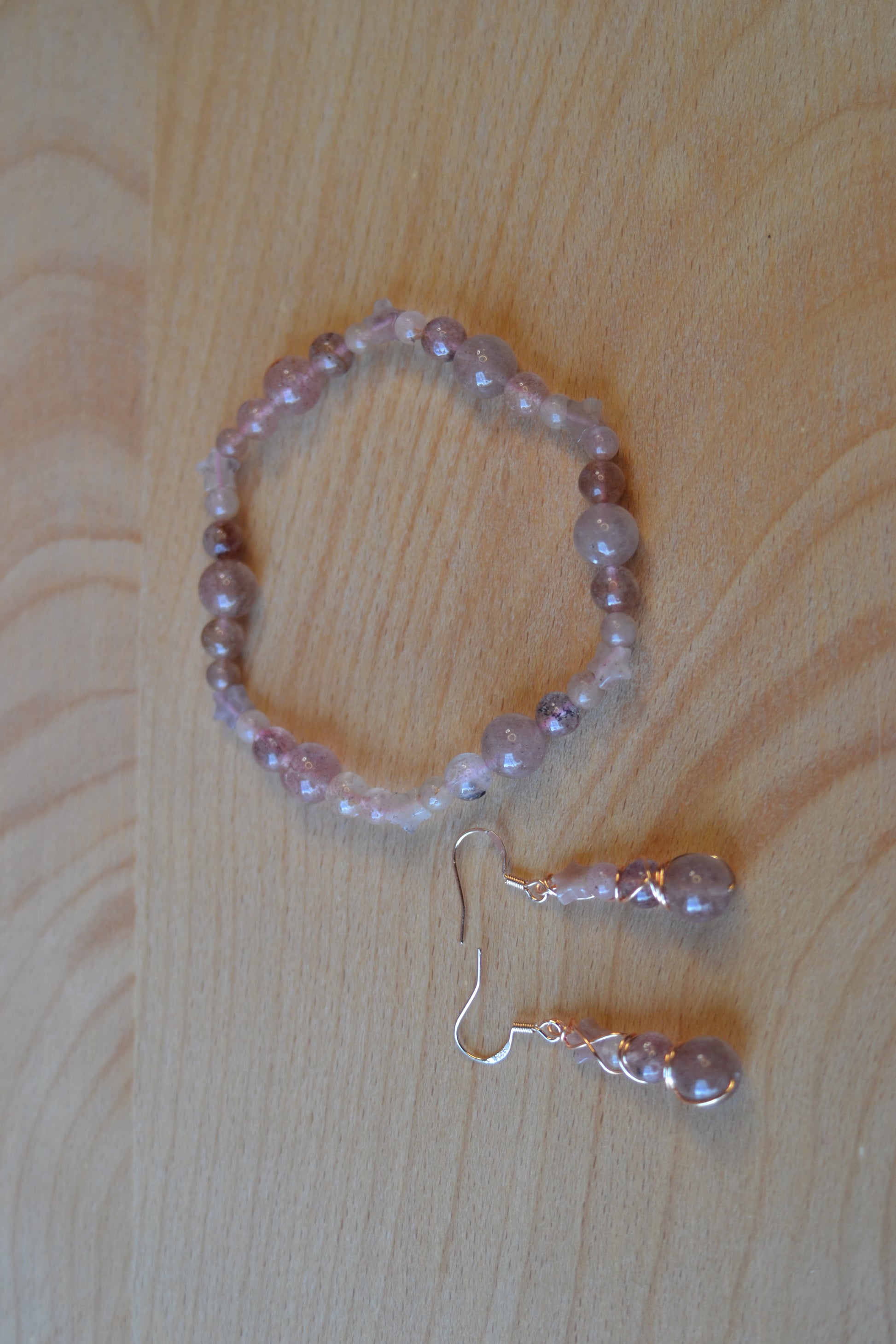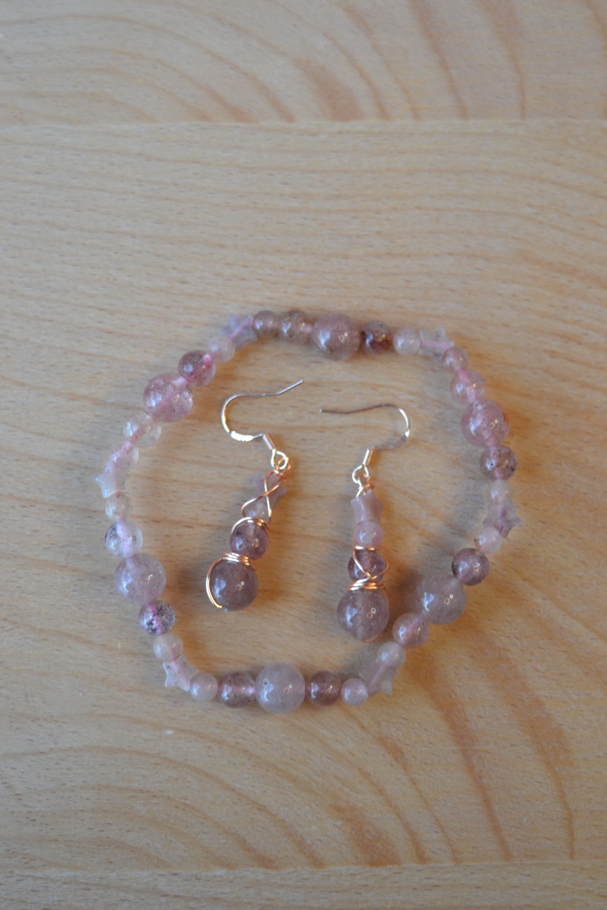 Embrace cosmic romance with this Strawberry Quartz bracelet and earring set. The bracelet is hand-strung on double pink elastic for strength and comfort, featuring a constellation of star-shaped Strawberry Quartz beads alongside polished 4mm, 6mm, and 8mm stones. Completing the set, the earrings cascade in a four-tier design, double wire wrapped in rose gold-plated copper with sterling silver rose gold hooks. A radiant star bead crowns each earring, flowing into a trio of Strawberry Quartz gems that shimmer with warmth and love.