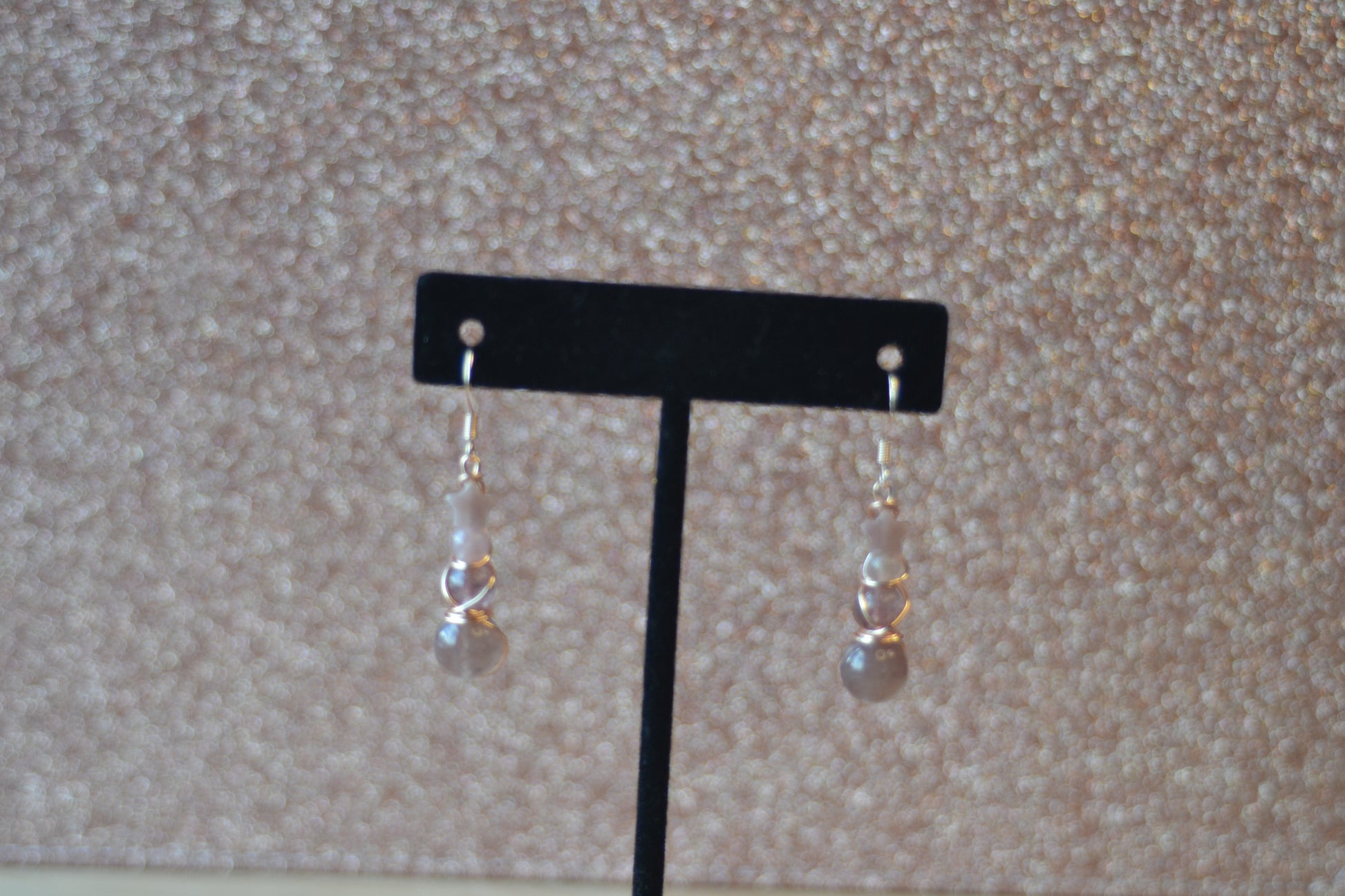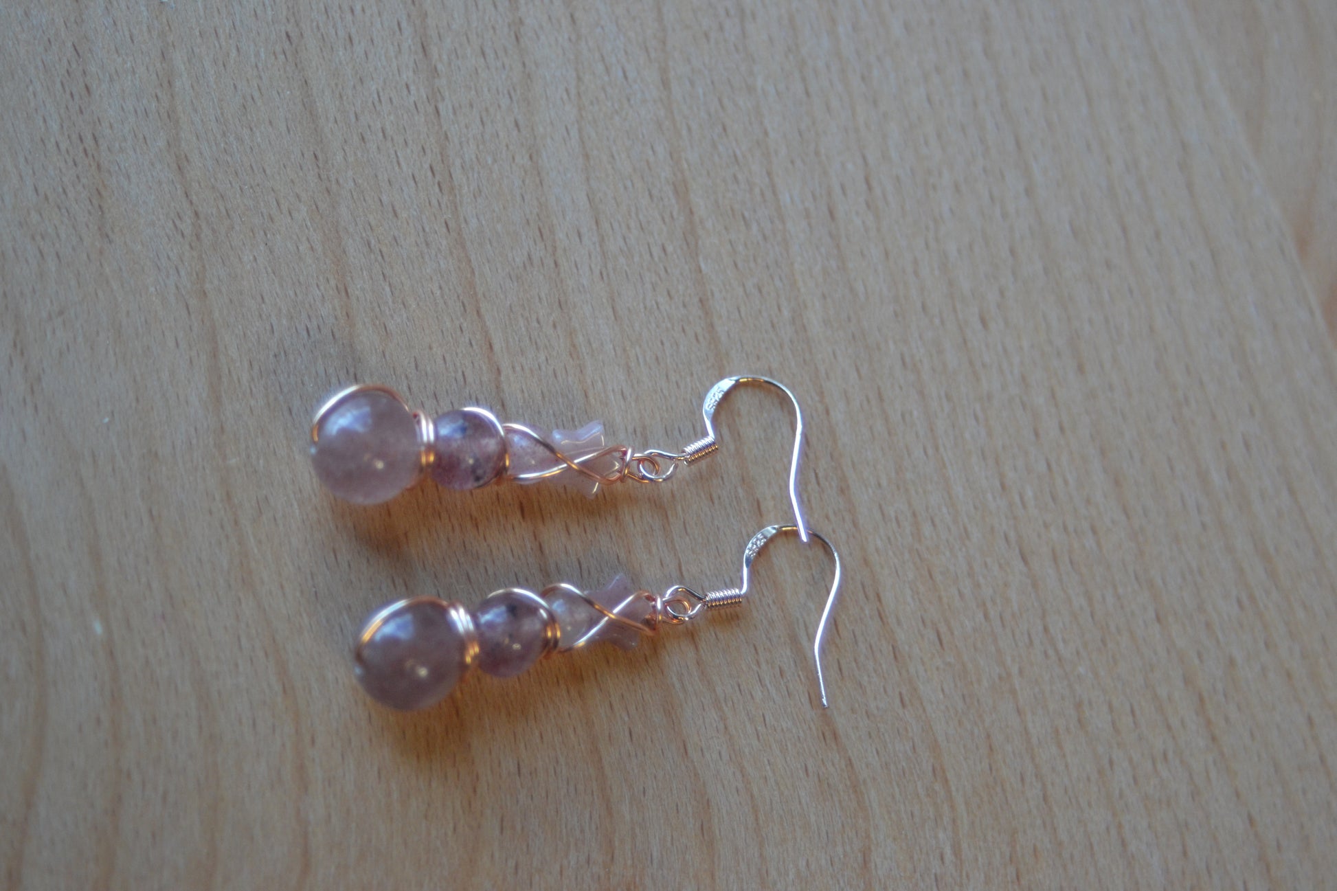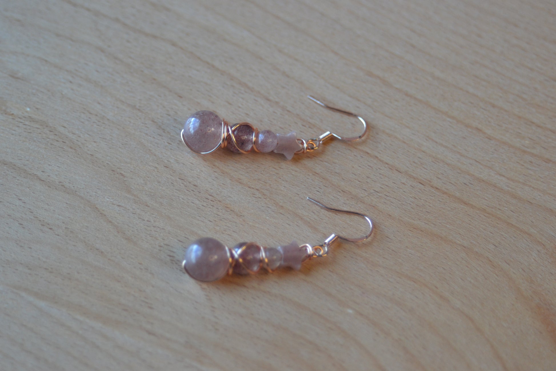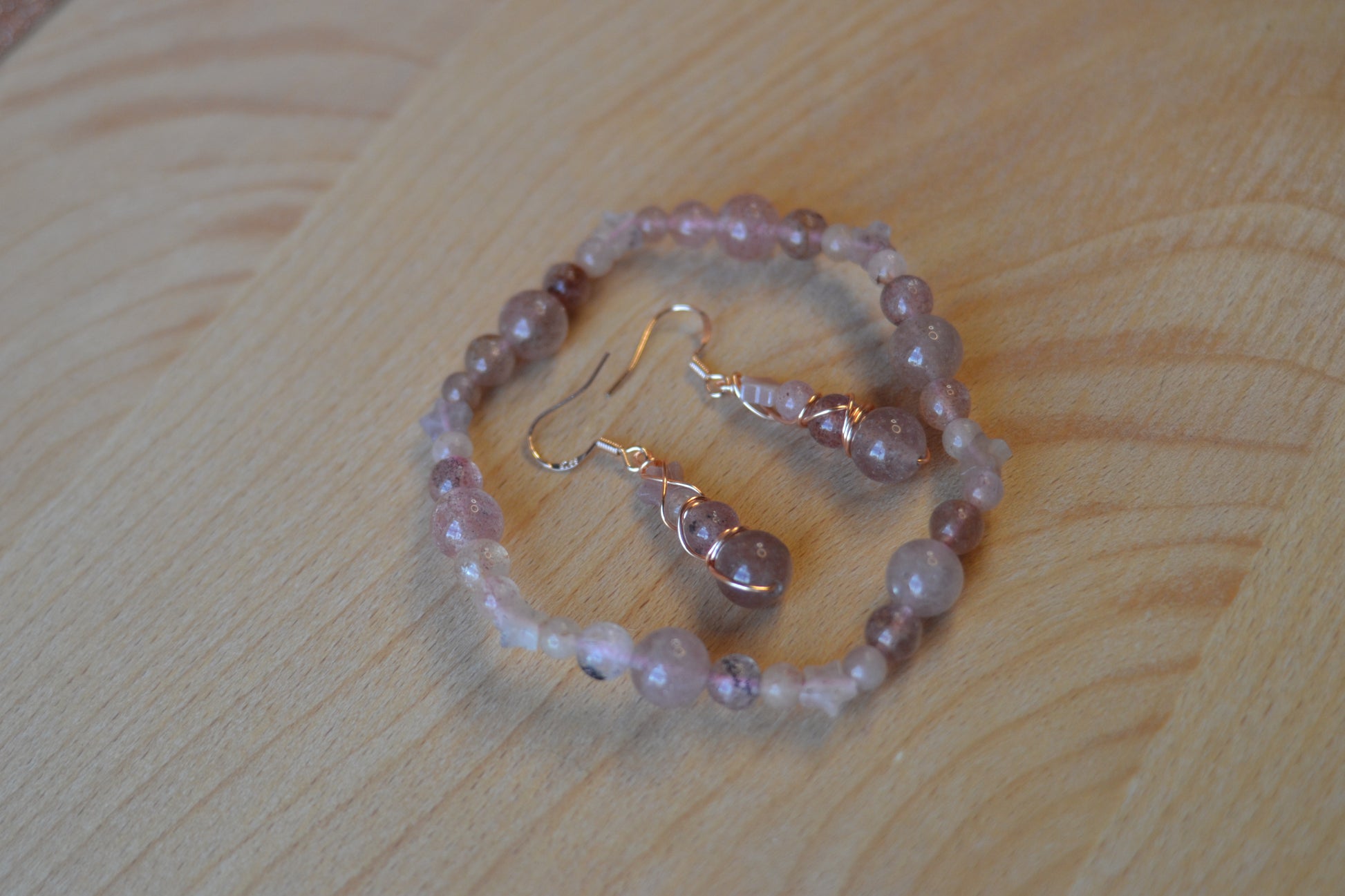 Embrace cosmic romance with this Strawberry Quartz bracelet and earring set. The bracelet is hand-strung on double pink elastic for strength and comfort, featuring a constellation of star-shaped Strawberry Quartz beads alongside polished 4mm, 6mm, and 8mm stones. Completing the set, the earrings cascade in a four-tier design, double wire wrapped in rose gold-plated copper with sterling silver rose gold hooks. A radiant star bead crowns each earring, flowing into a trio of Strawberry Quartz gems that shimmer with warmth and love.