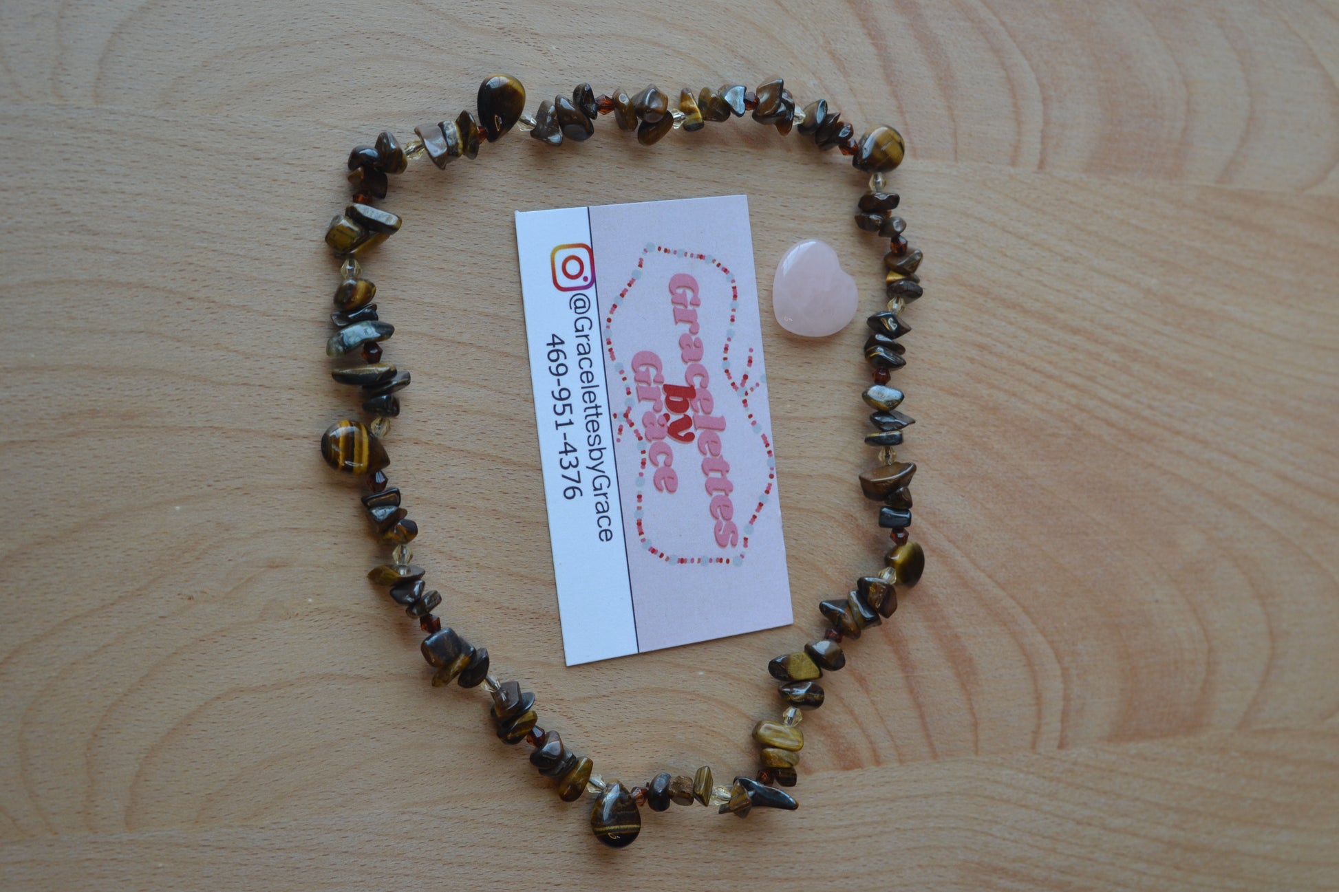 Harness the grounding power and confidence-boosting energy of Tiger’s Eye with this beautifully crafted 16-inch choker necklace paired with matching teardrop earrings. The choker features natural Tiger’s Eye chip beads combined with unique, eye-catching 6mm half-inch long teardrop-shaped beads that add elegant texture and dimension.