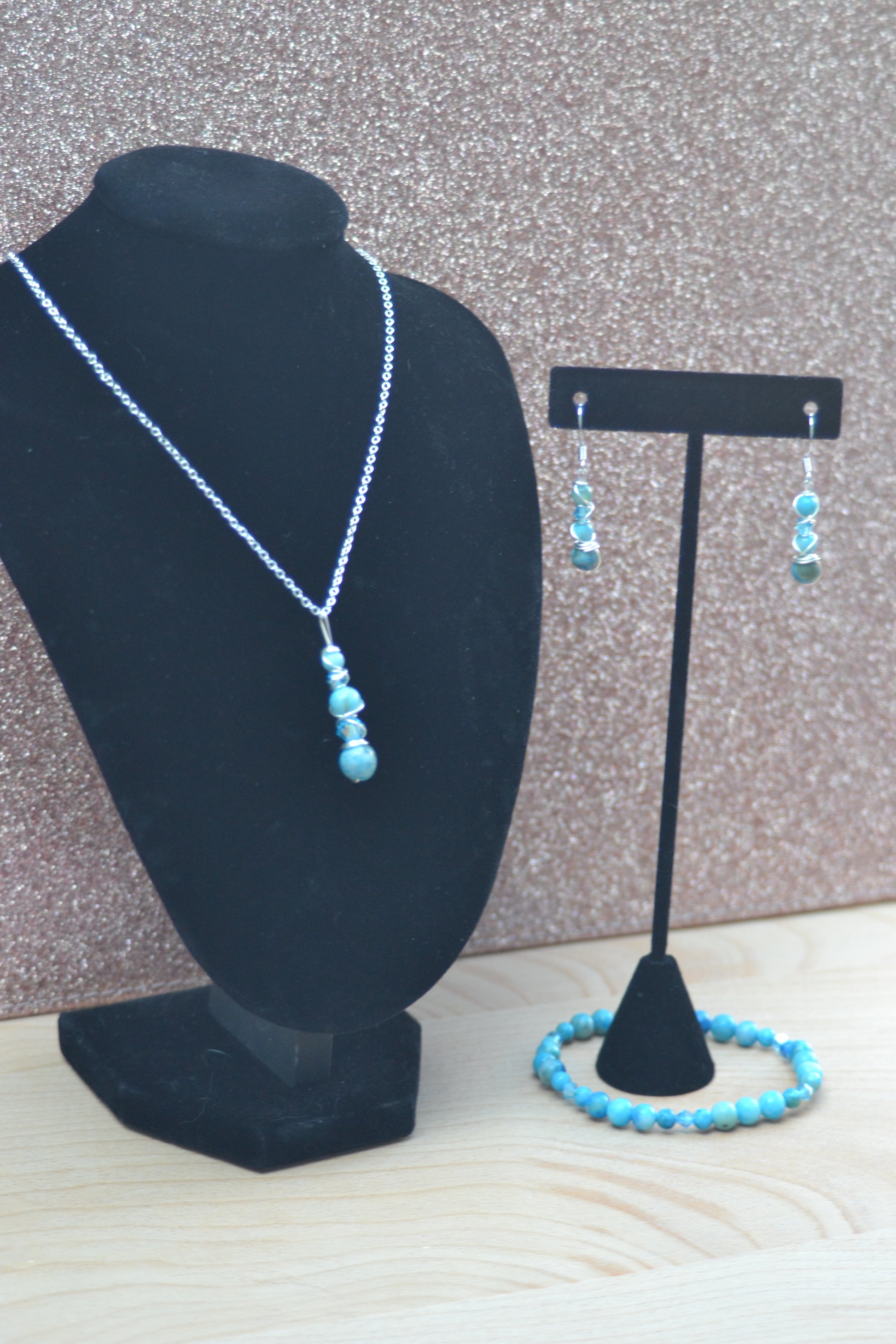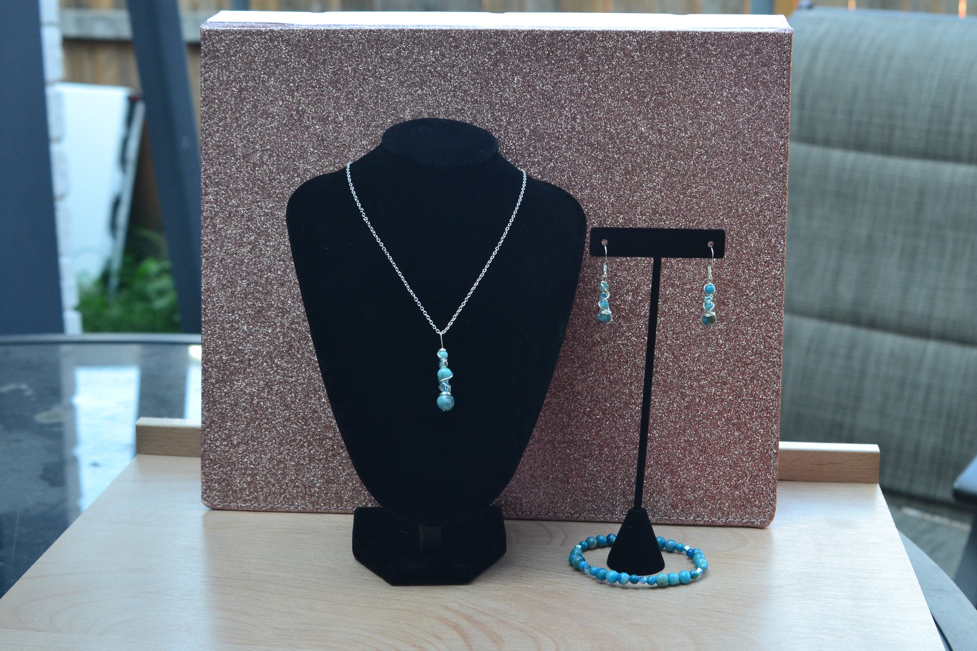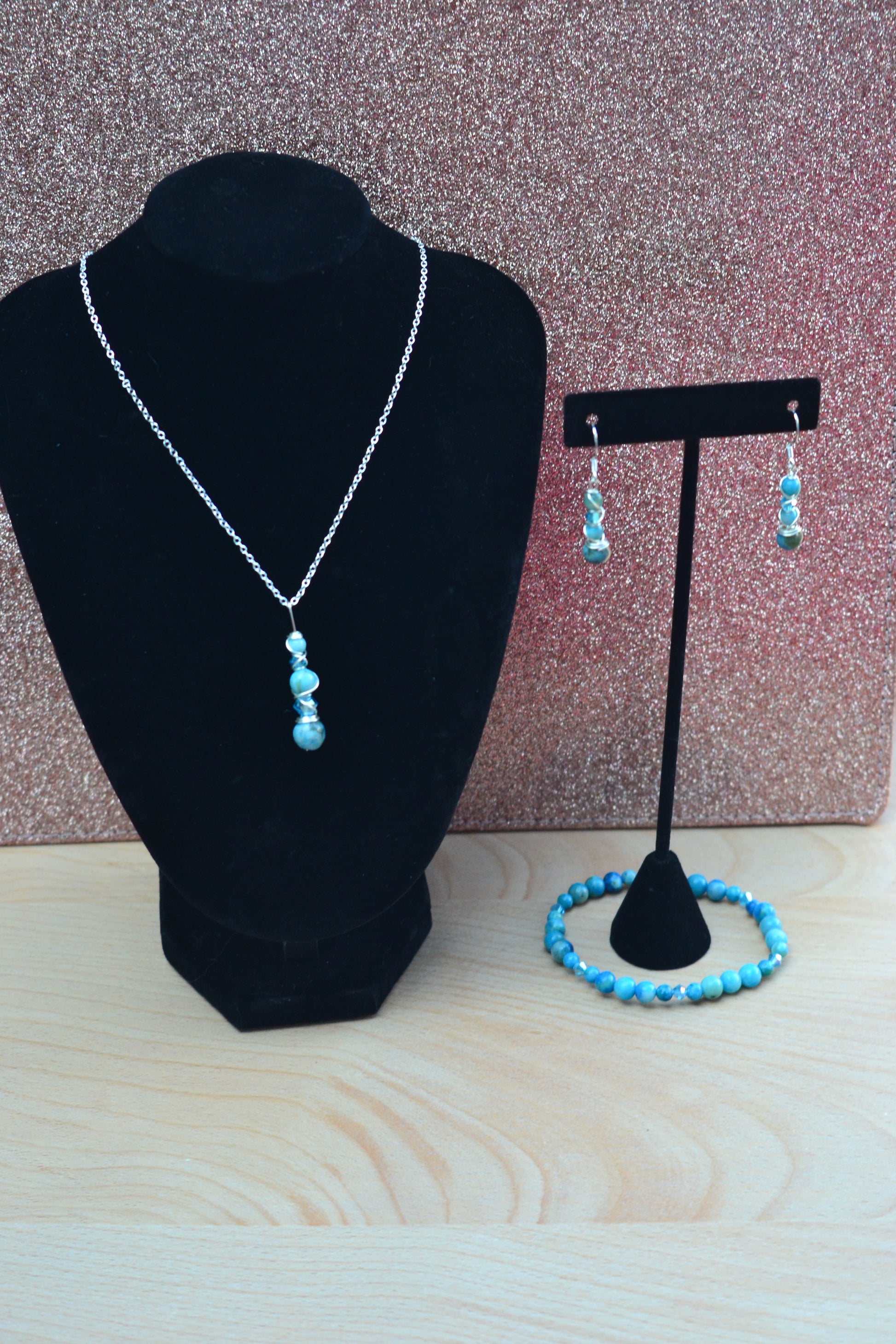 Embrace calm and elegance with this Smithsonite jewelry set. The bracelet features 6mm and 4mm Smithsonite beads accented with teal faceted crystal spacers, strung on durable elastic for comfortable everyday wear. The 20-inch sterling silver necklace showcases a five-tier pendant, double wire wrapped with silver-plated copper, creating a cascading focal point of soothing blue stones. Complementing the set, the earrings flow in four graceful tiers, double wire wrapped with silver-plated copper and finished with 925 sterling silver hooks.