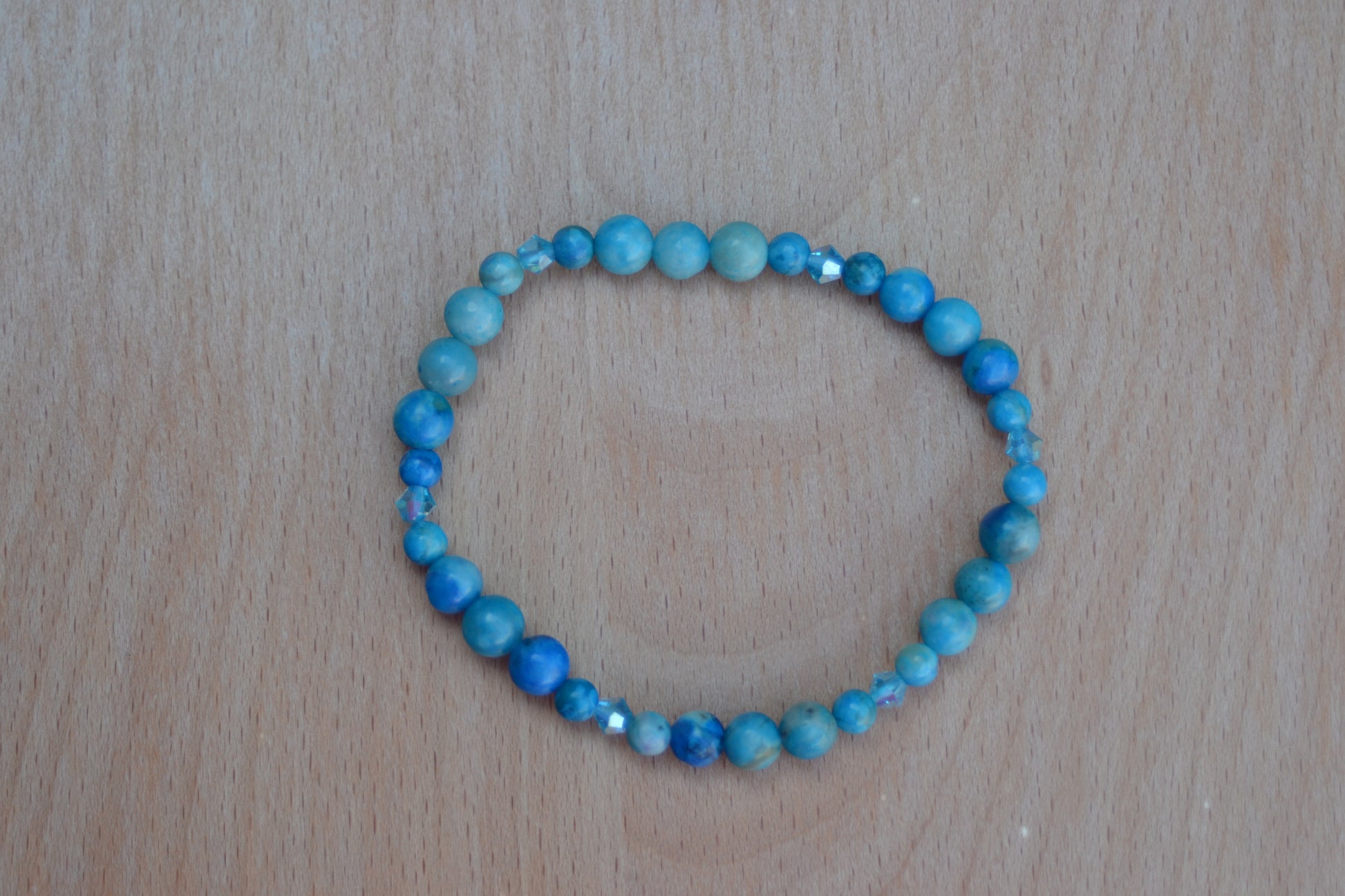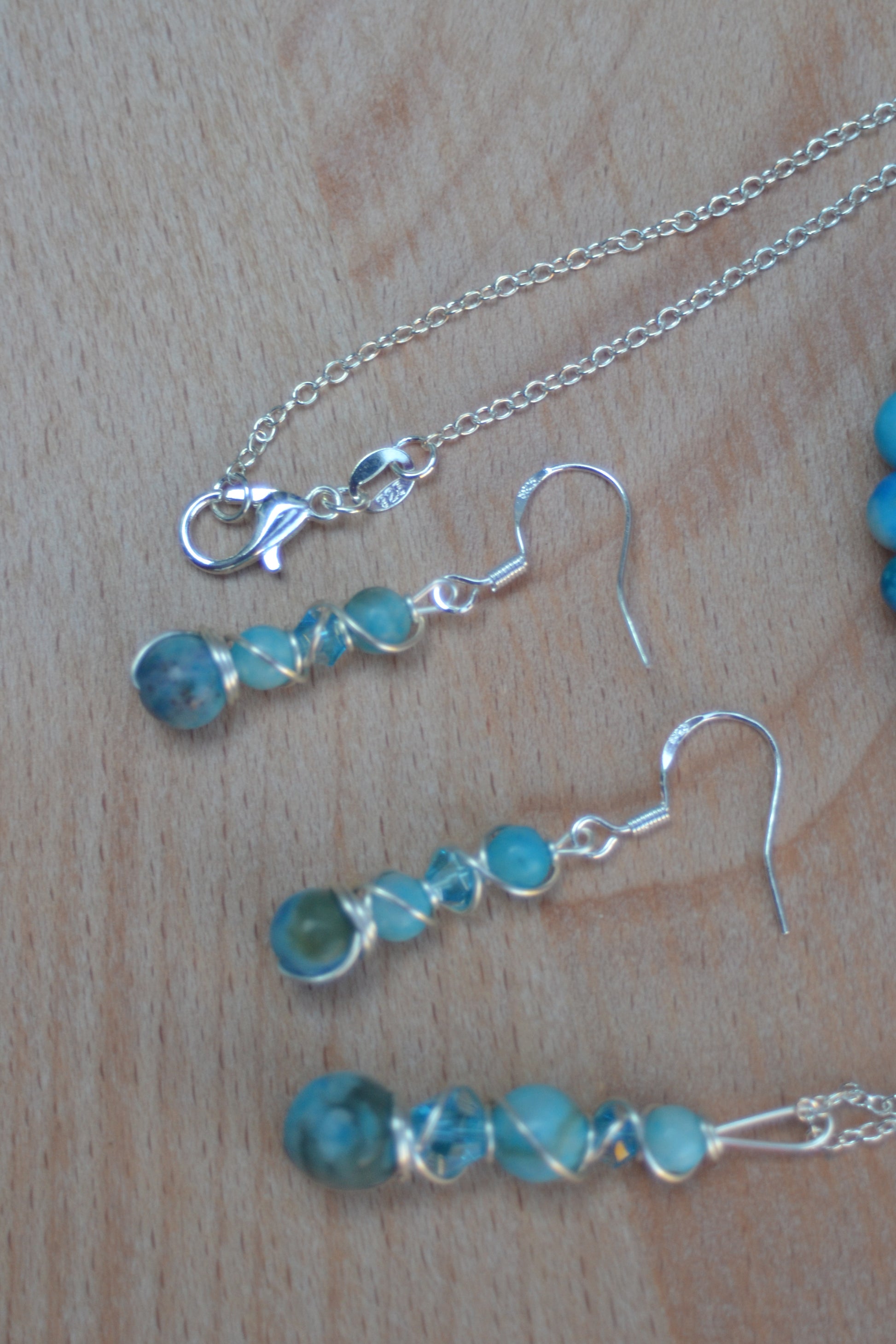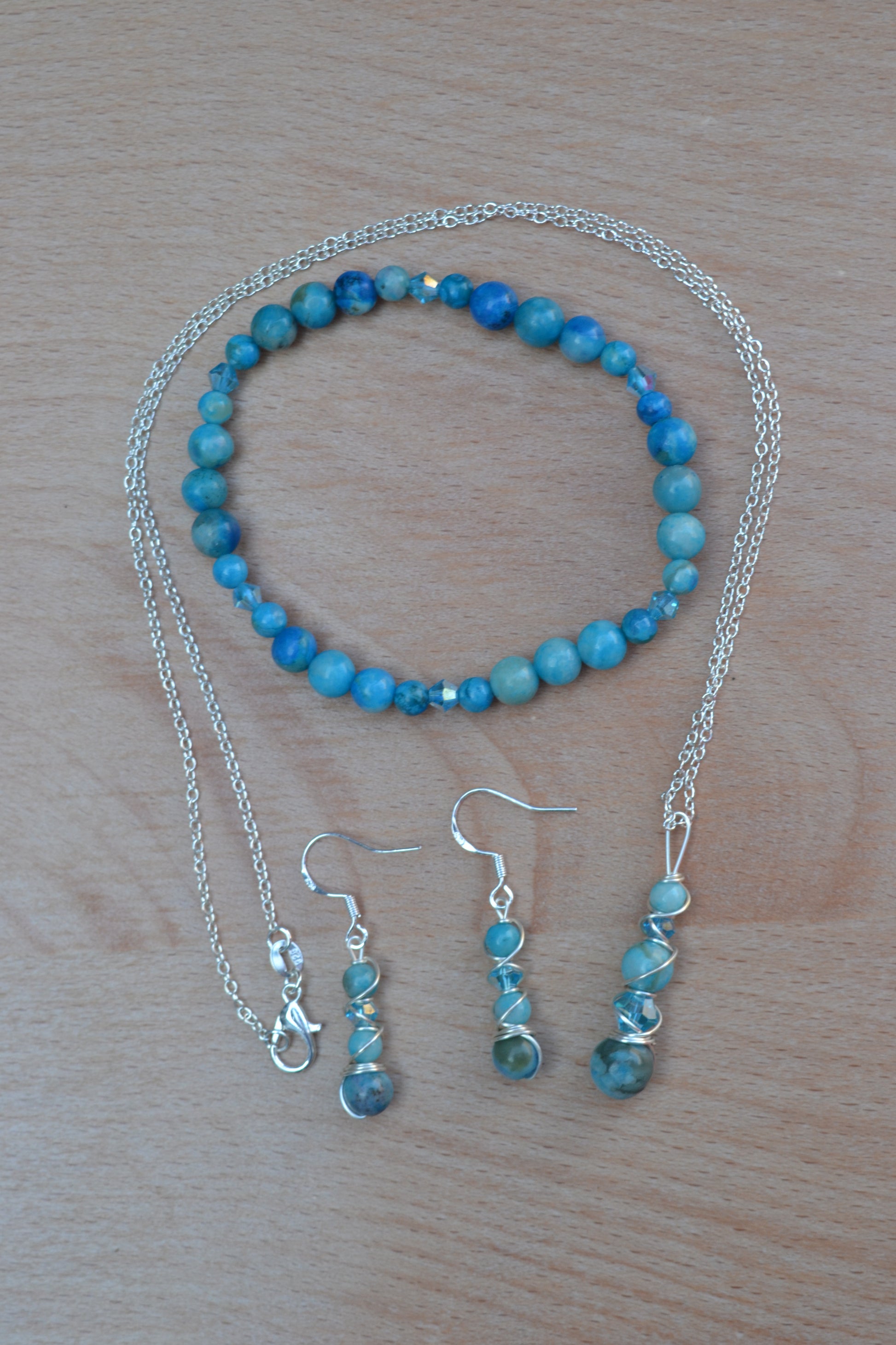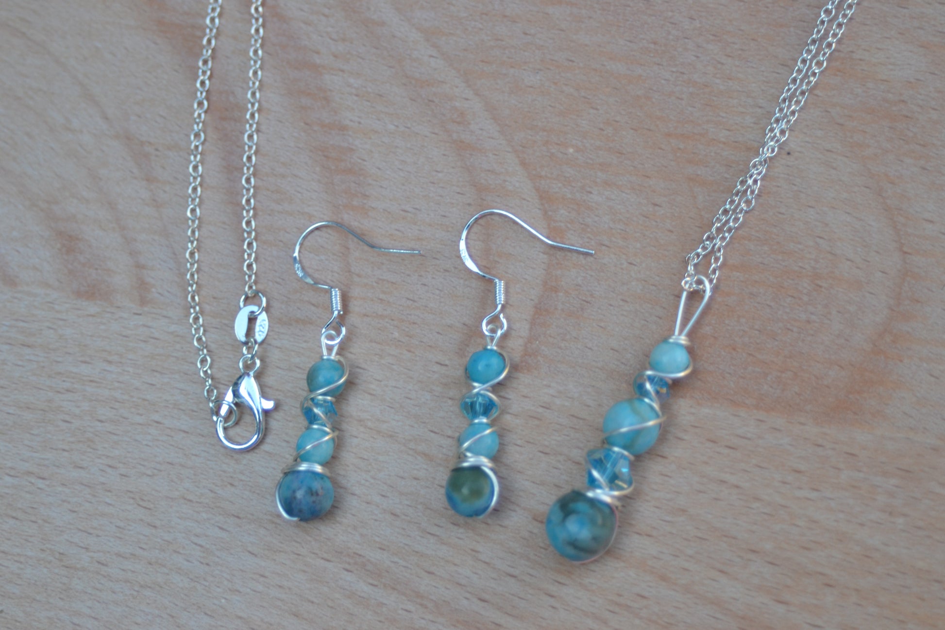 Embrace calm and elegance with this Smithsonite jewelry set. The bracelet features 6mm and 4mm Smithsonite beads accented with teal faceted crystal spacers, strung on durable elastic for comfortable everyday wear. The 20-inch sterling silver necklace showcases a five-tier pendant, double wire wrapped with silver-plated copper, creating a cascading focal point of soothing blue stones. Complementing the set, the earrings flow in four graceful tiers, double wire wrapped with silver-plated copper and finished with 925 sterling silver hooks.