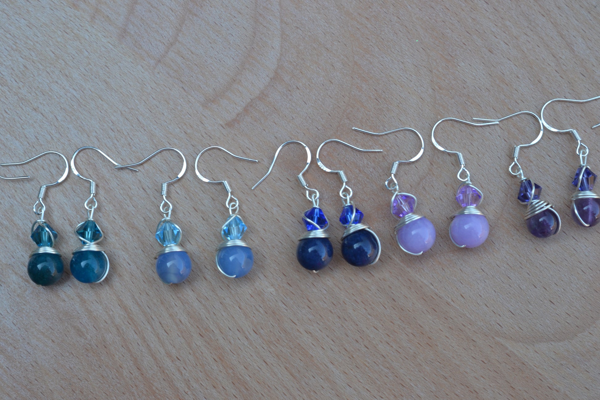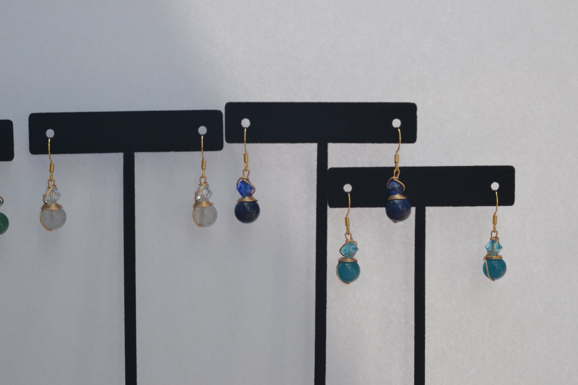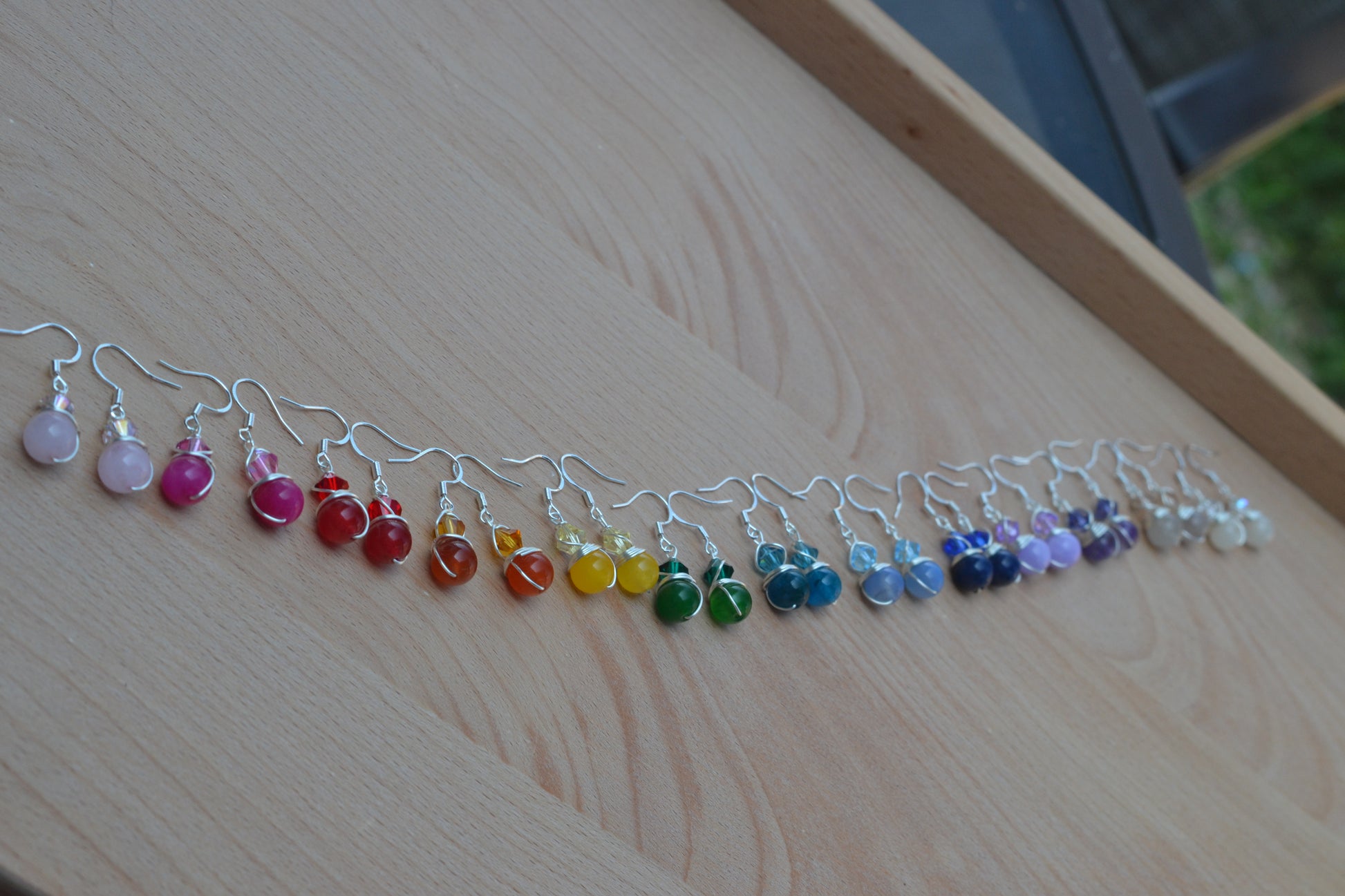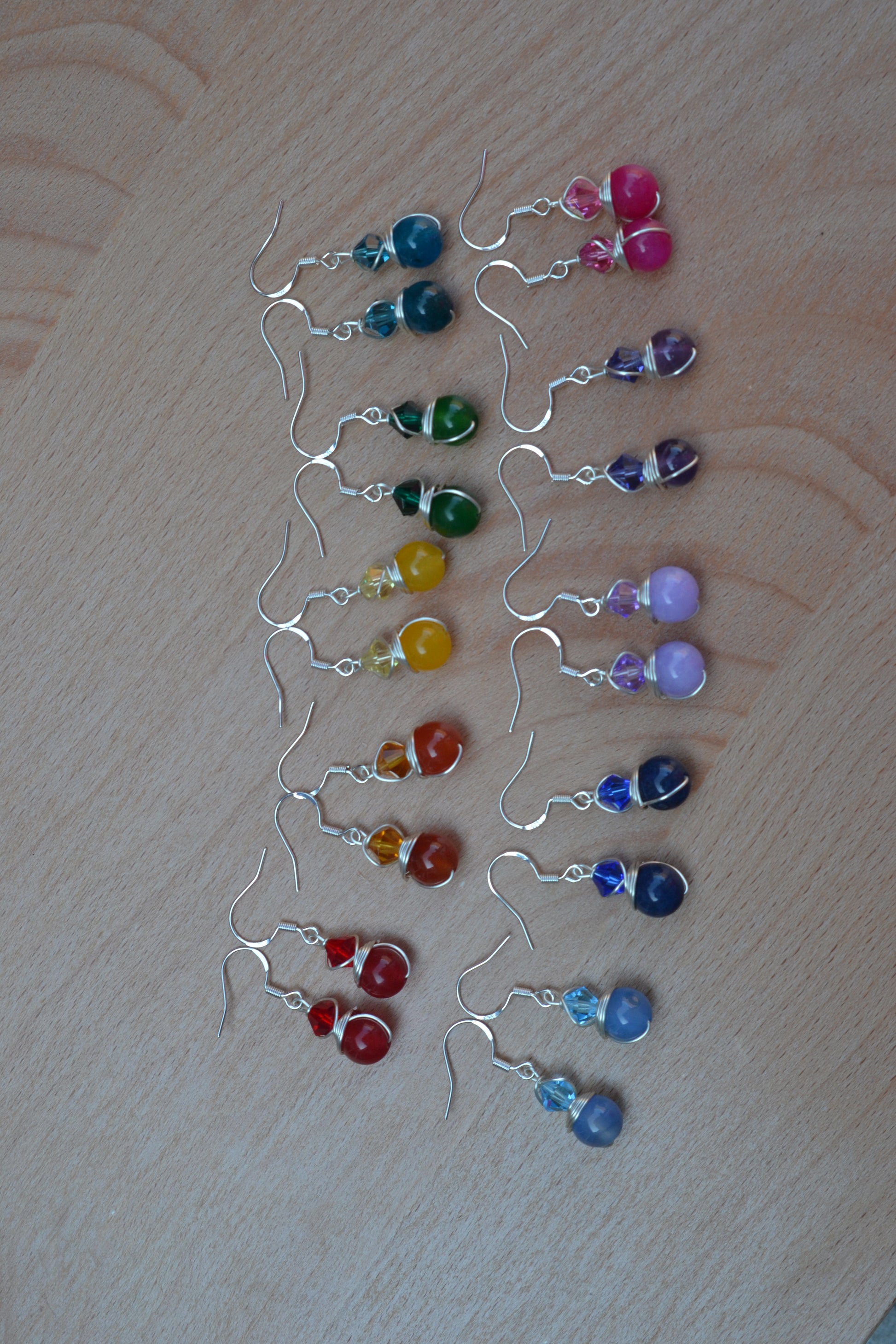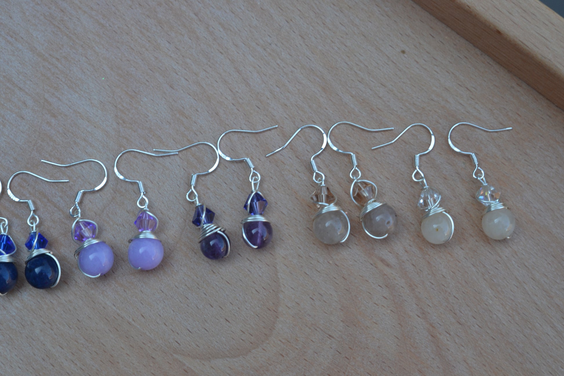 Thirteen pairs, one timeless design — each uniquely brought to life with vibrant crystals. The Spectrum Collection captures the full arc of color and energy, from grounding smoky quartz to radiant moonstone. Every pair features 8mm natural stones, wire-wrapped in silver-plated copper with sterling silver hooks, finished with a faceted crystal accent for extra shimmer. Whether you wear your birthstone, your favorite color, or choose by energy, these earrings are designed to bring balance, beauty, and intention to your everyday look.