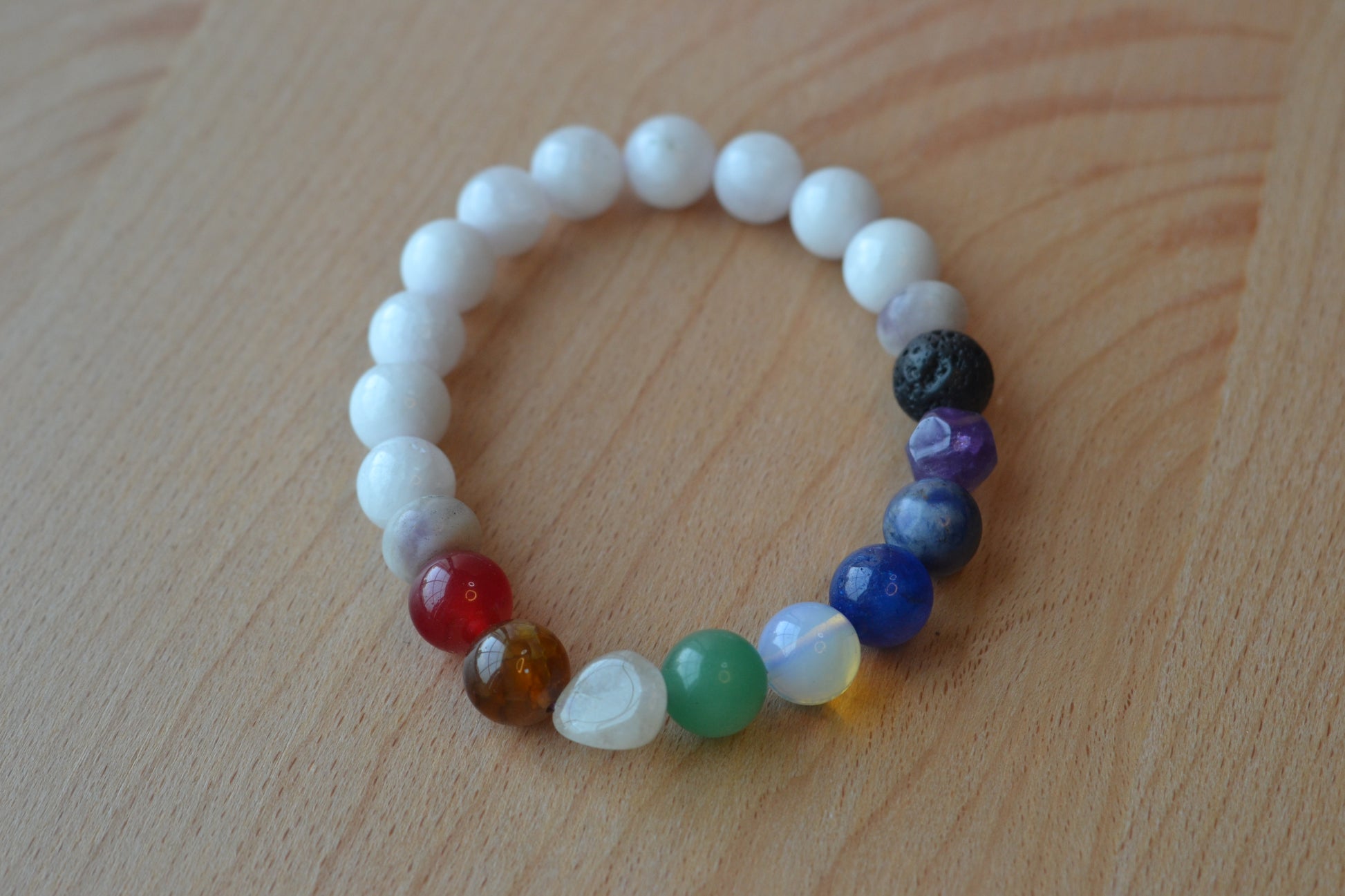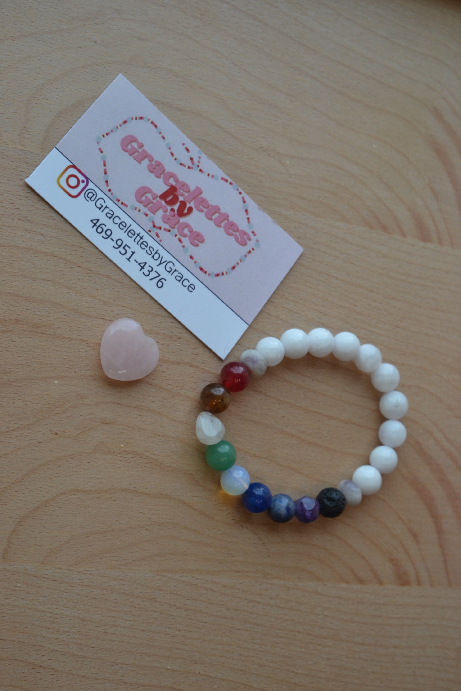 This handcrafted Rainbow Energy Bracelet is designed to amplify clarity, alignment, and spiritual strength. Featuring luminous 8mm White Quartz beads, this bracelet holds space for light and intention. At its core is a radiant rainbow crystal sequence framed by two Rondelle-cut Super 7 stones — one of the most spiritually potent stones on Earth.
