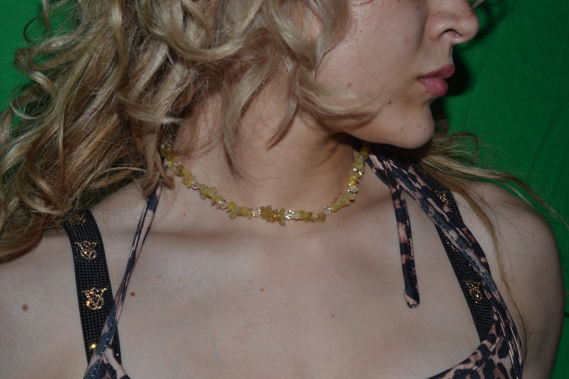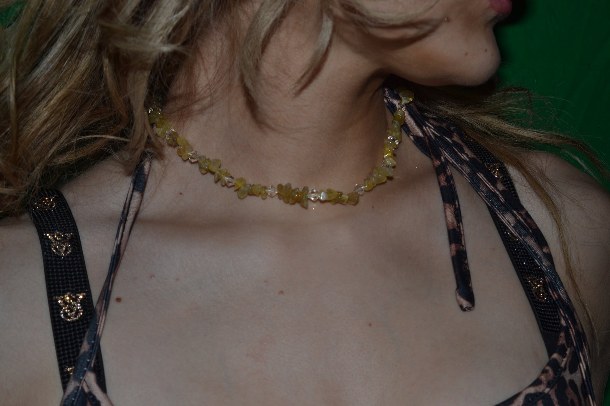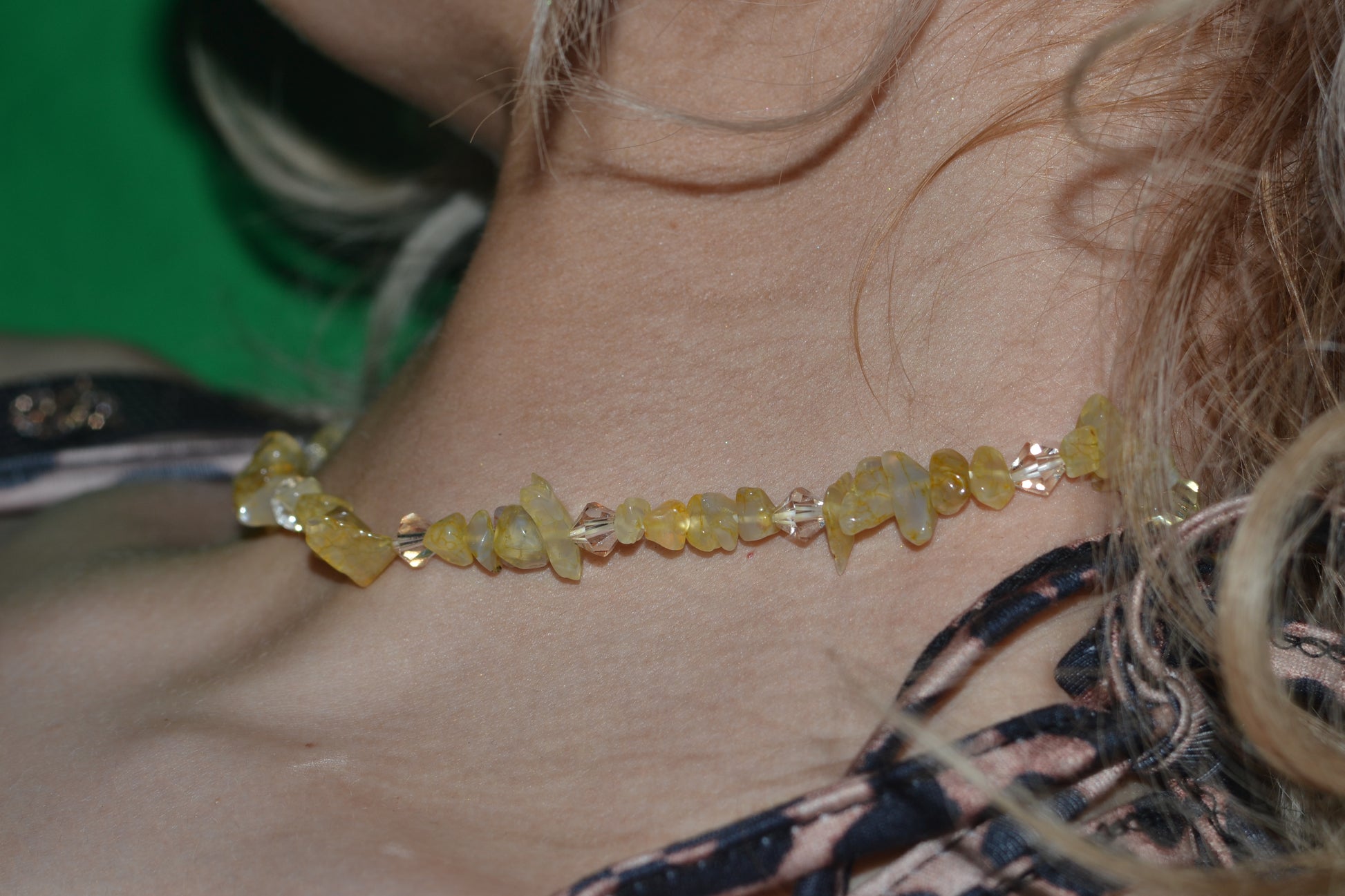 At 14 inches, it sits high on the neck for a true choker fit — glowing with natural yellow agate and sparkling crystal spacers that catch the light with every move.