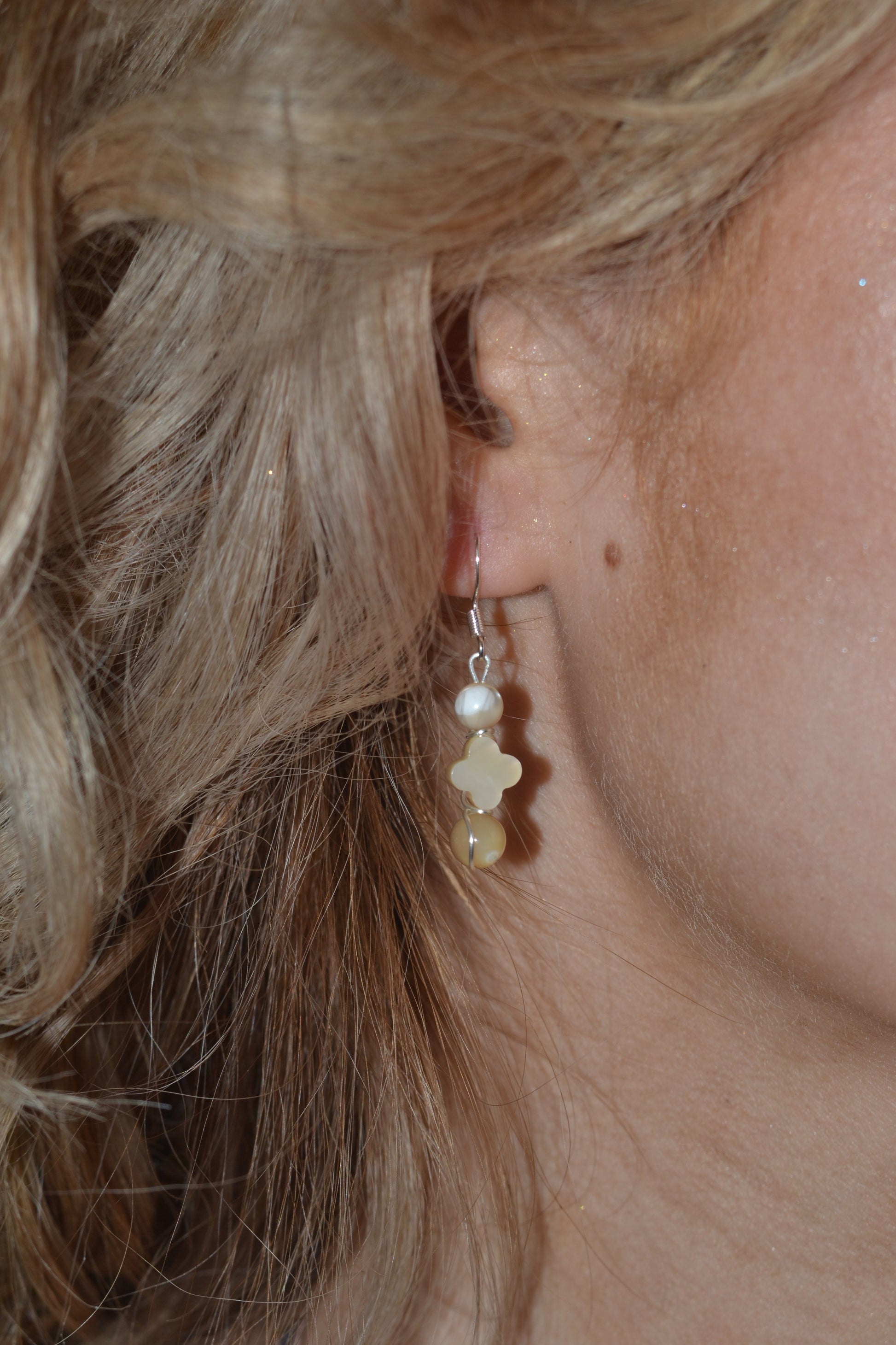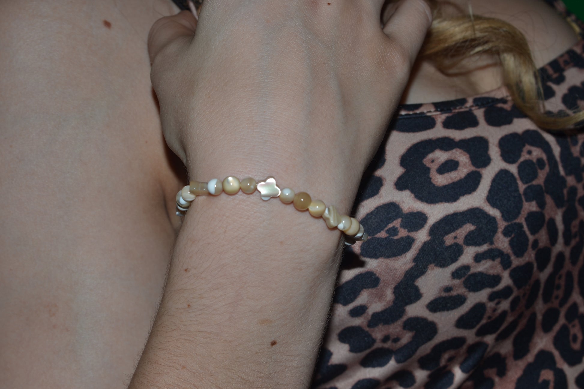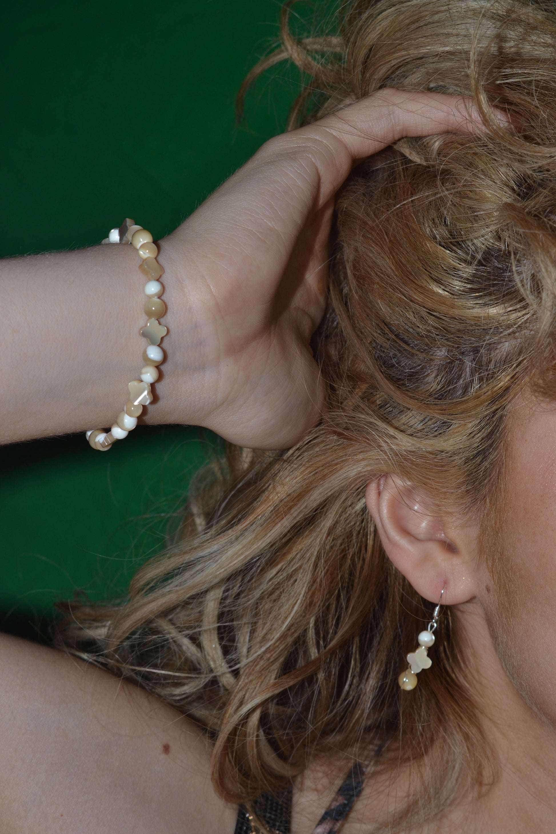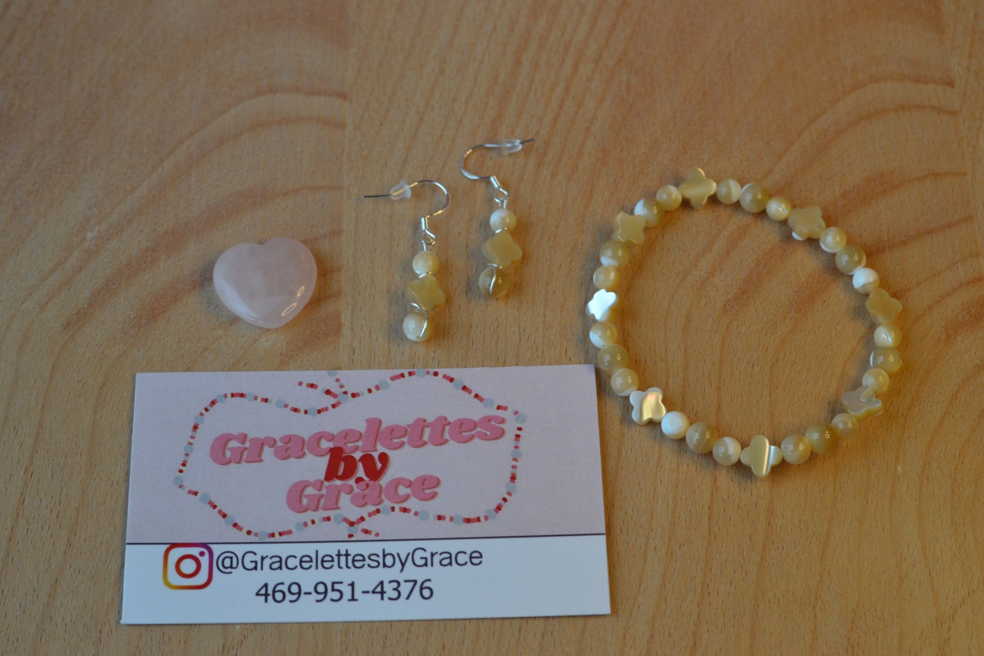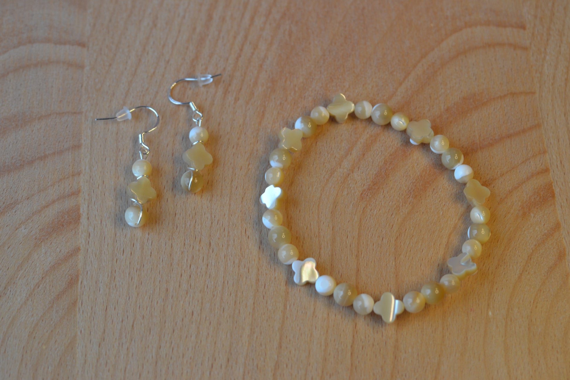 ✨ Featuring 4mm and 2mm yellow mother of pearl beads, both the bracelet and earrings shimmer like sunshine through silk. 4-leaf clover mother of pearl spacers add a layer of protective magic and charm.